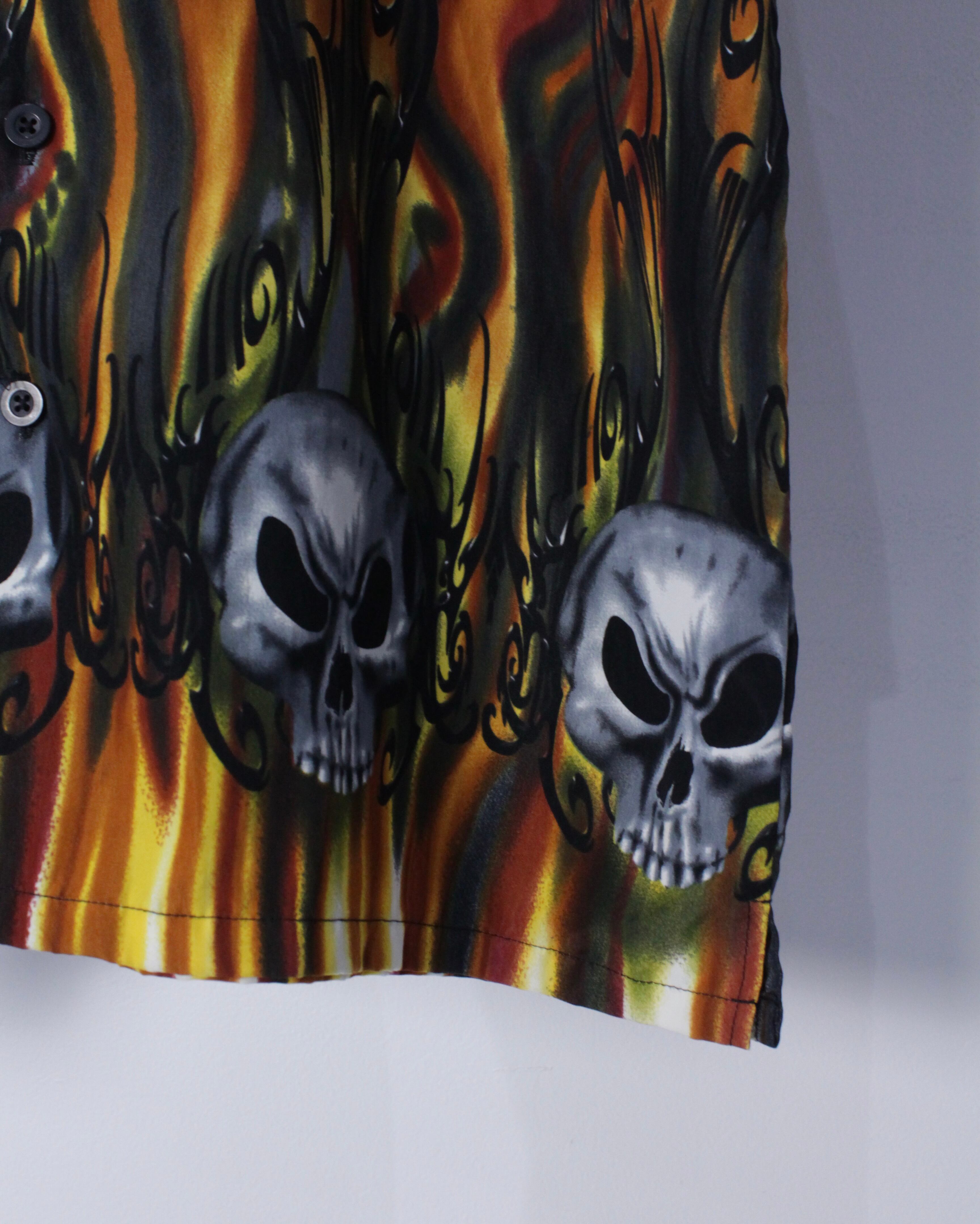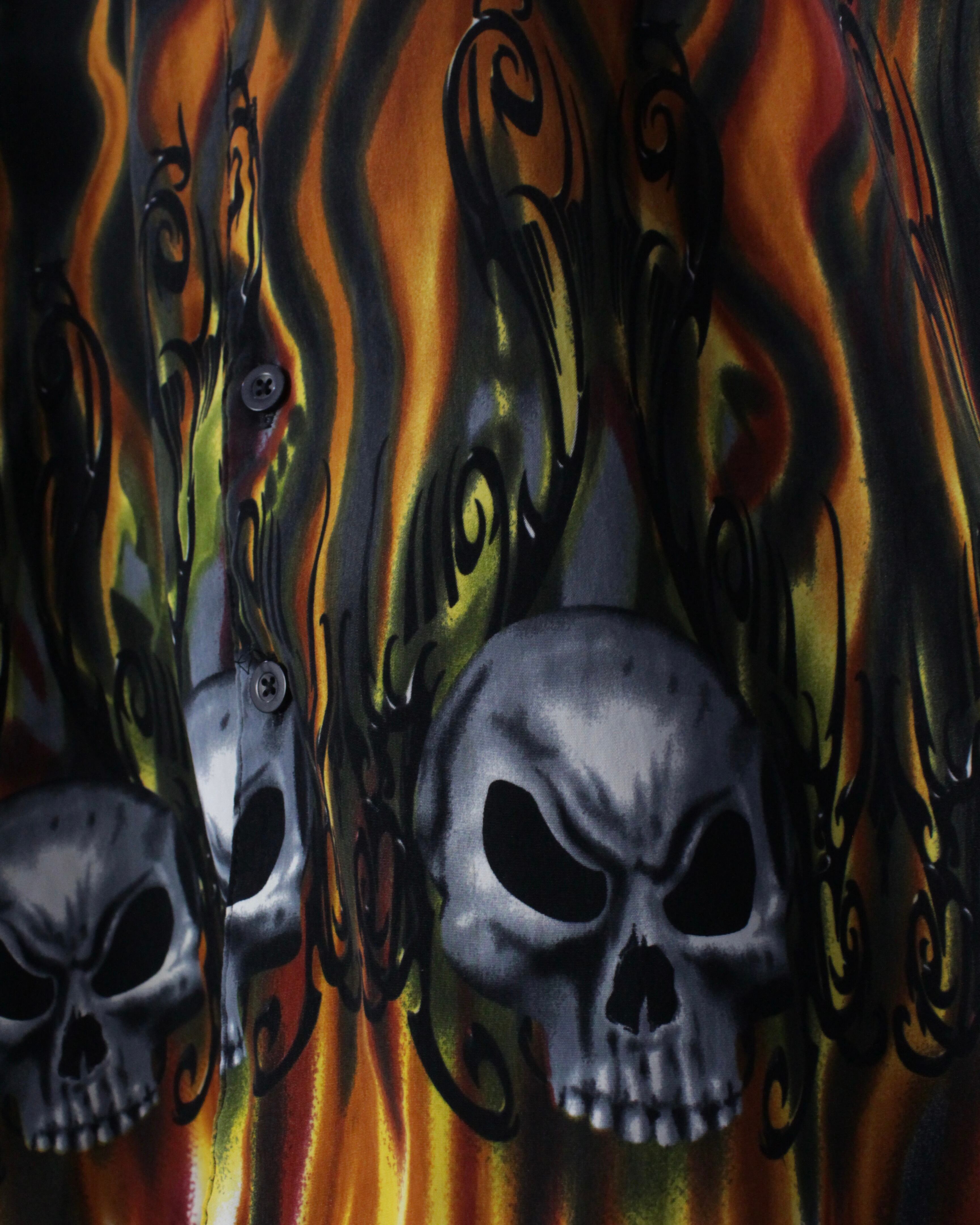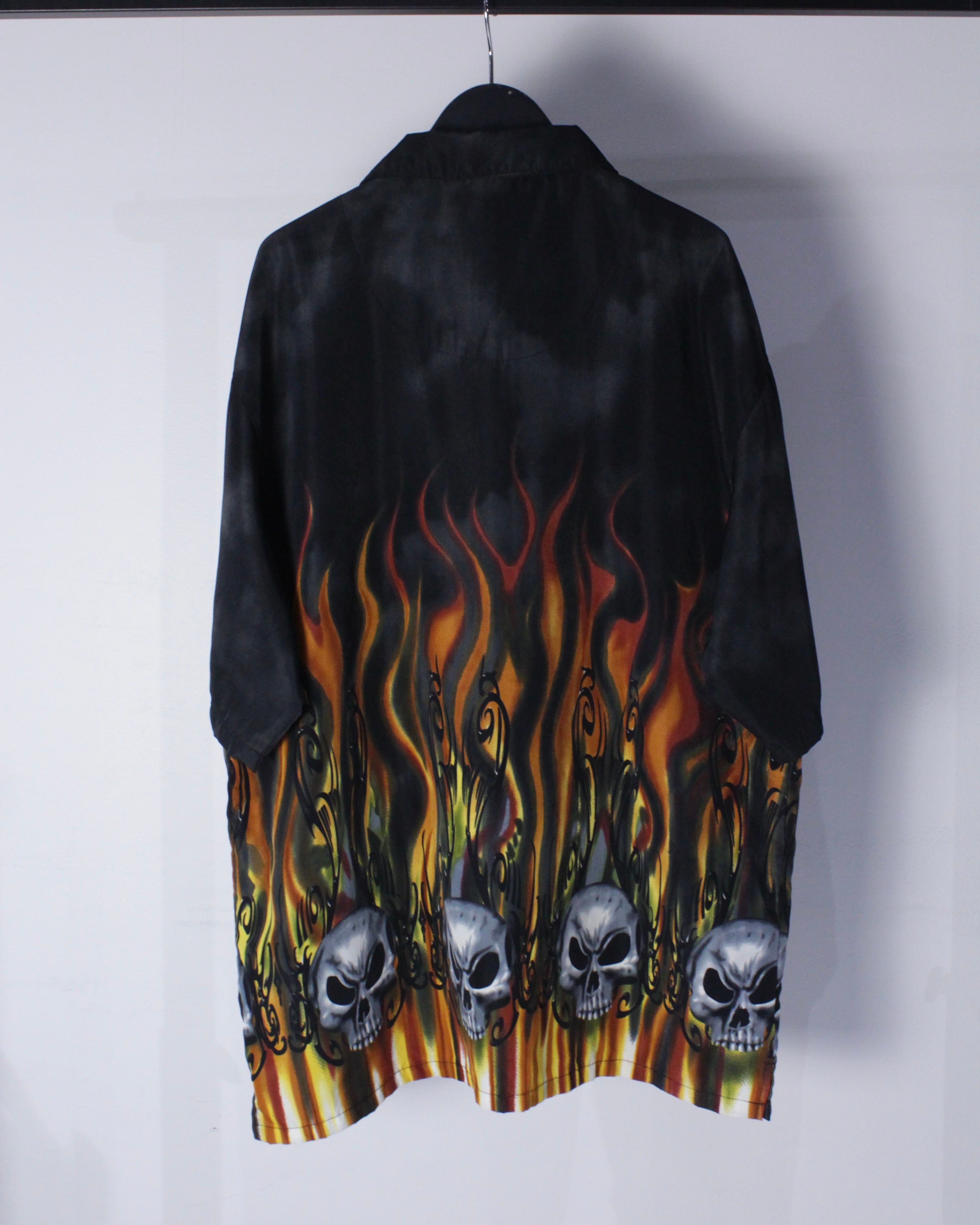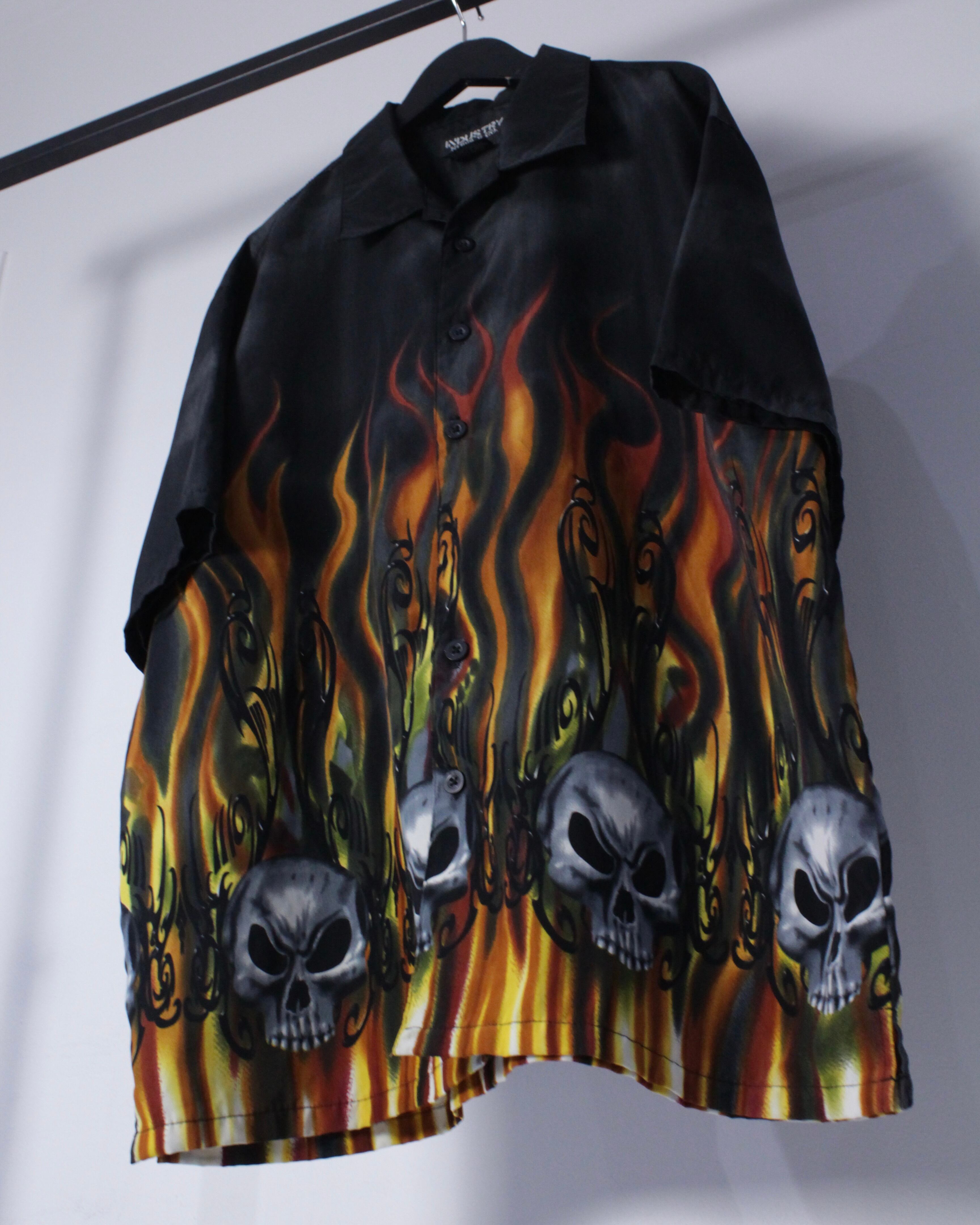 ブラックのボディをベースに、ファイヤーパターン×スカルを載せた、抜群の存在感を放つ半袖オープンカラーシャツ。