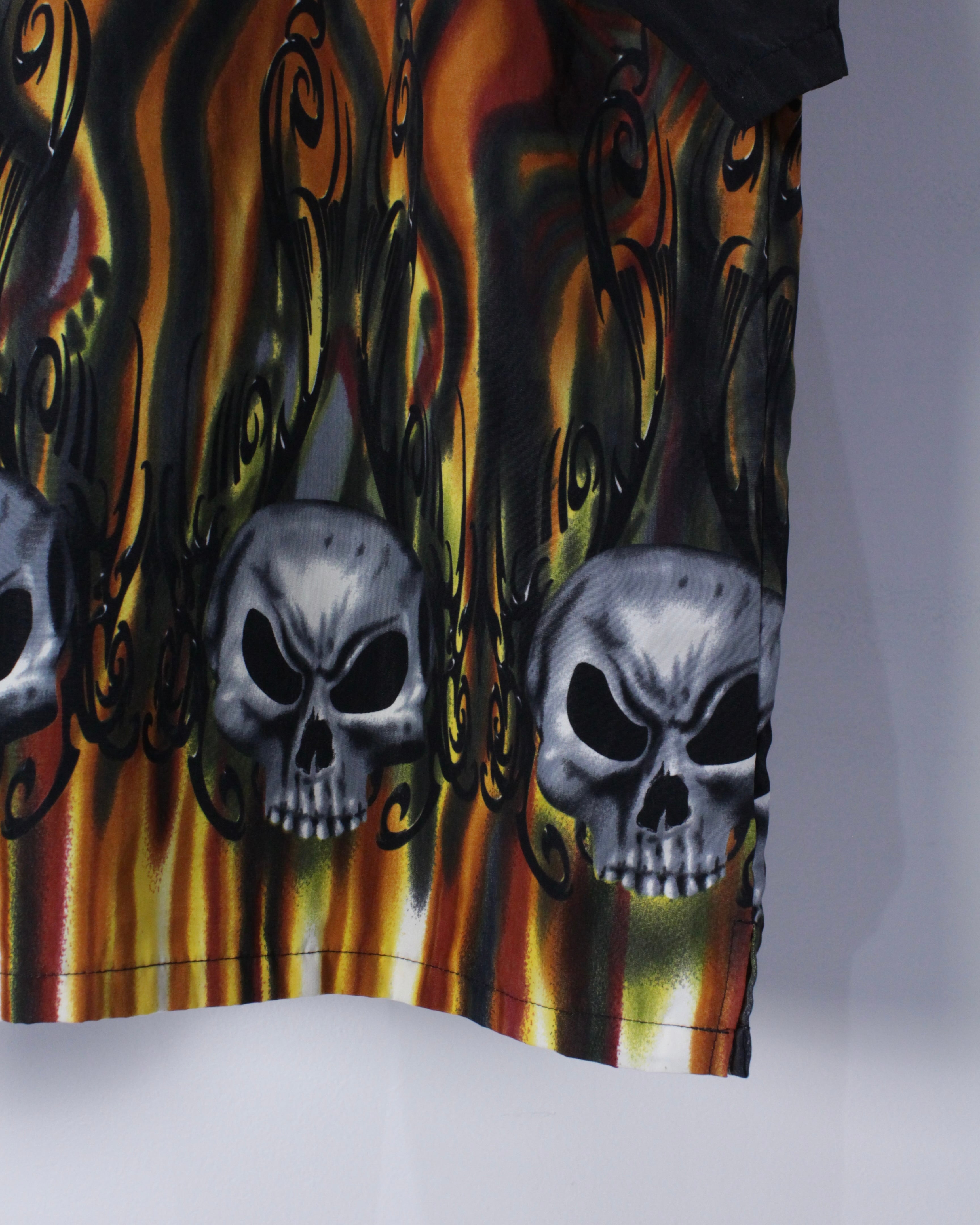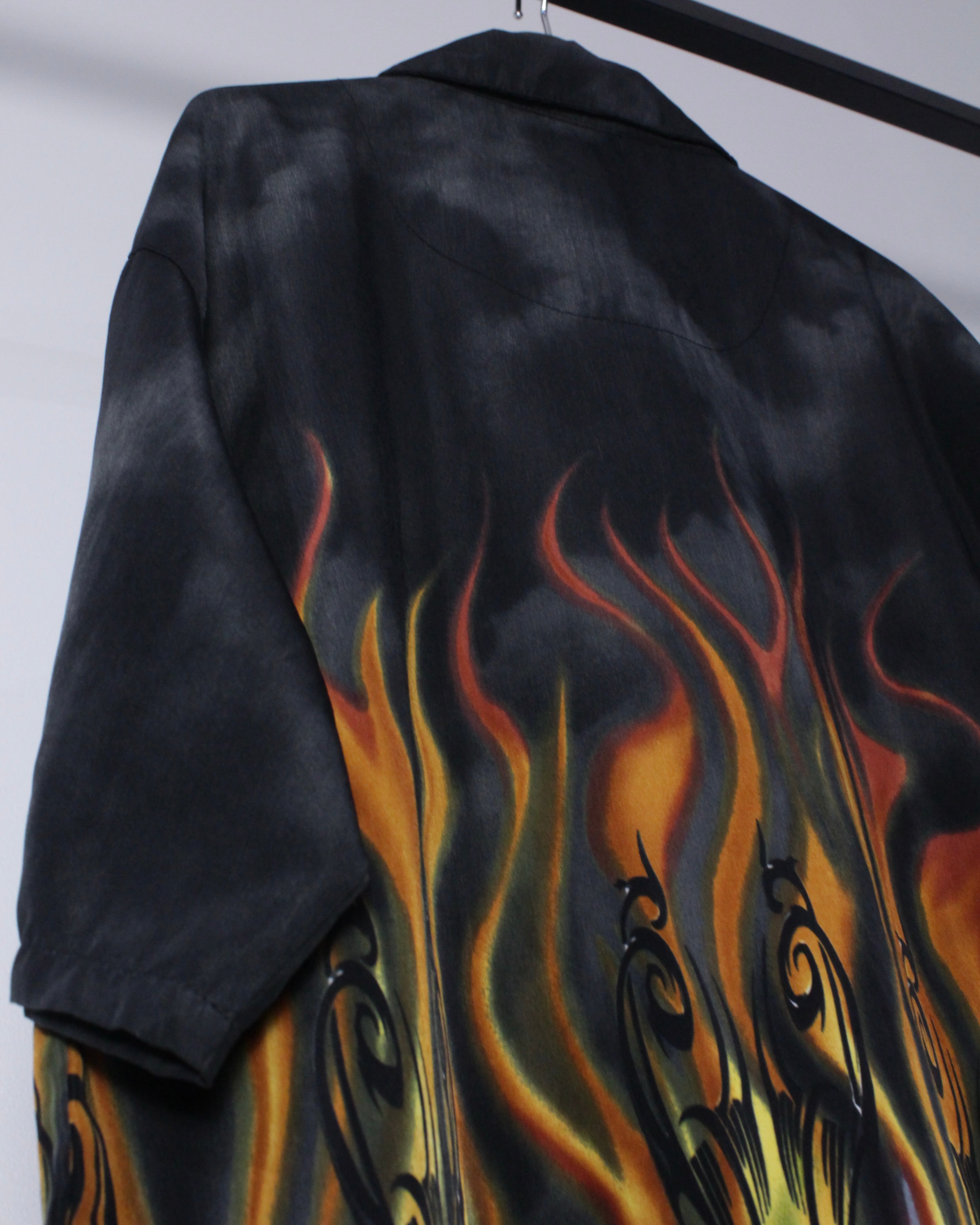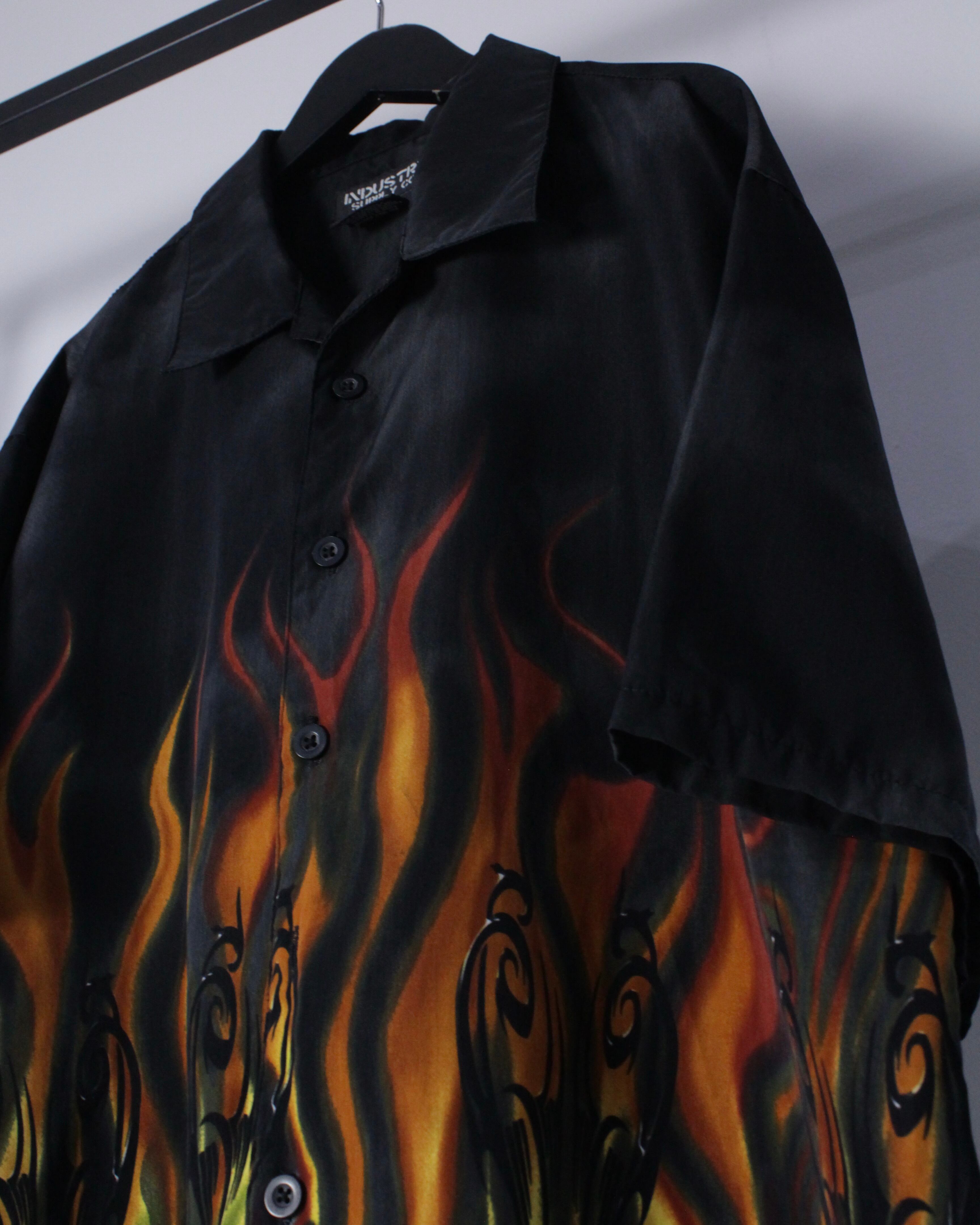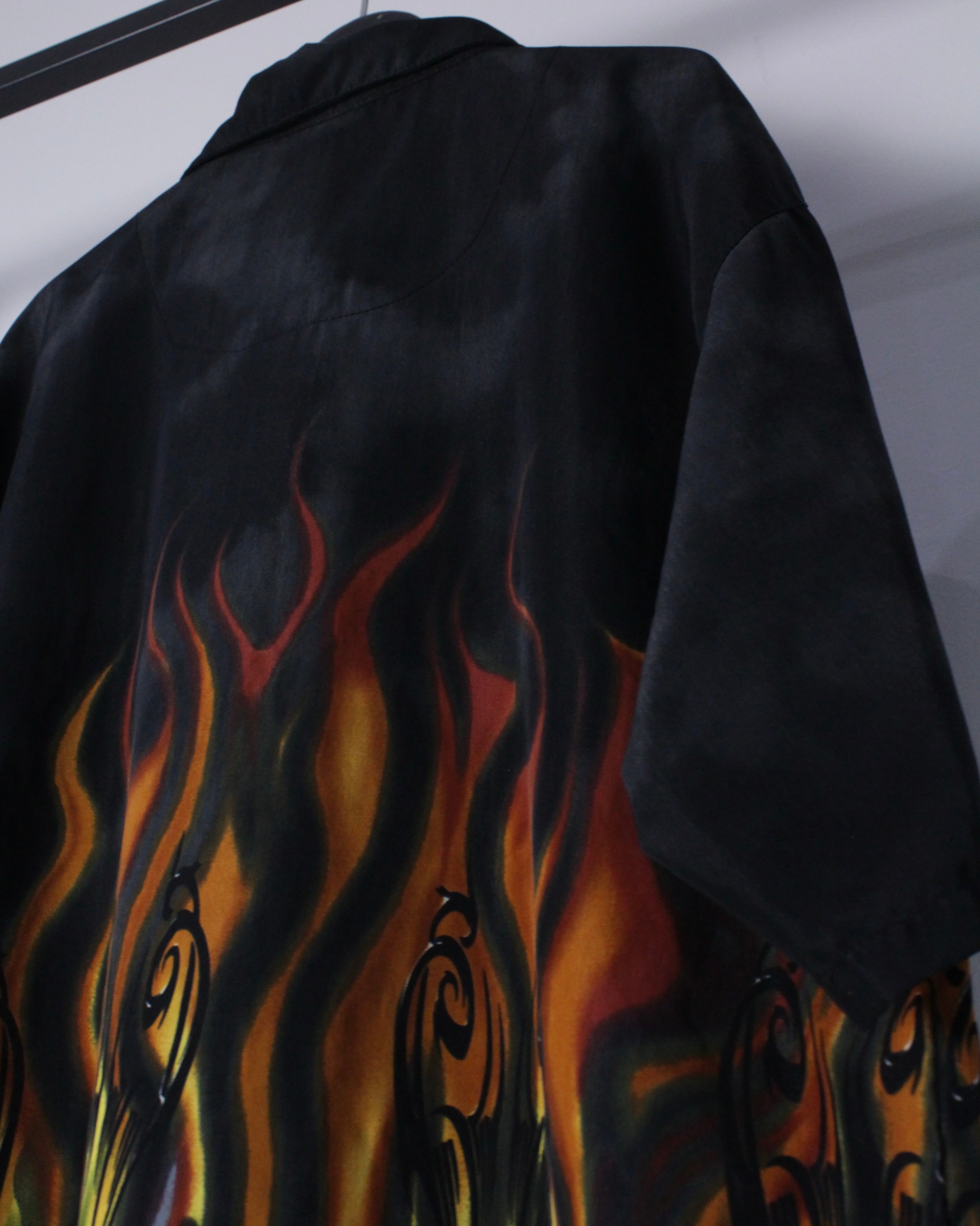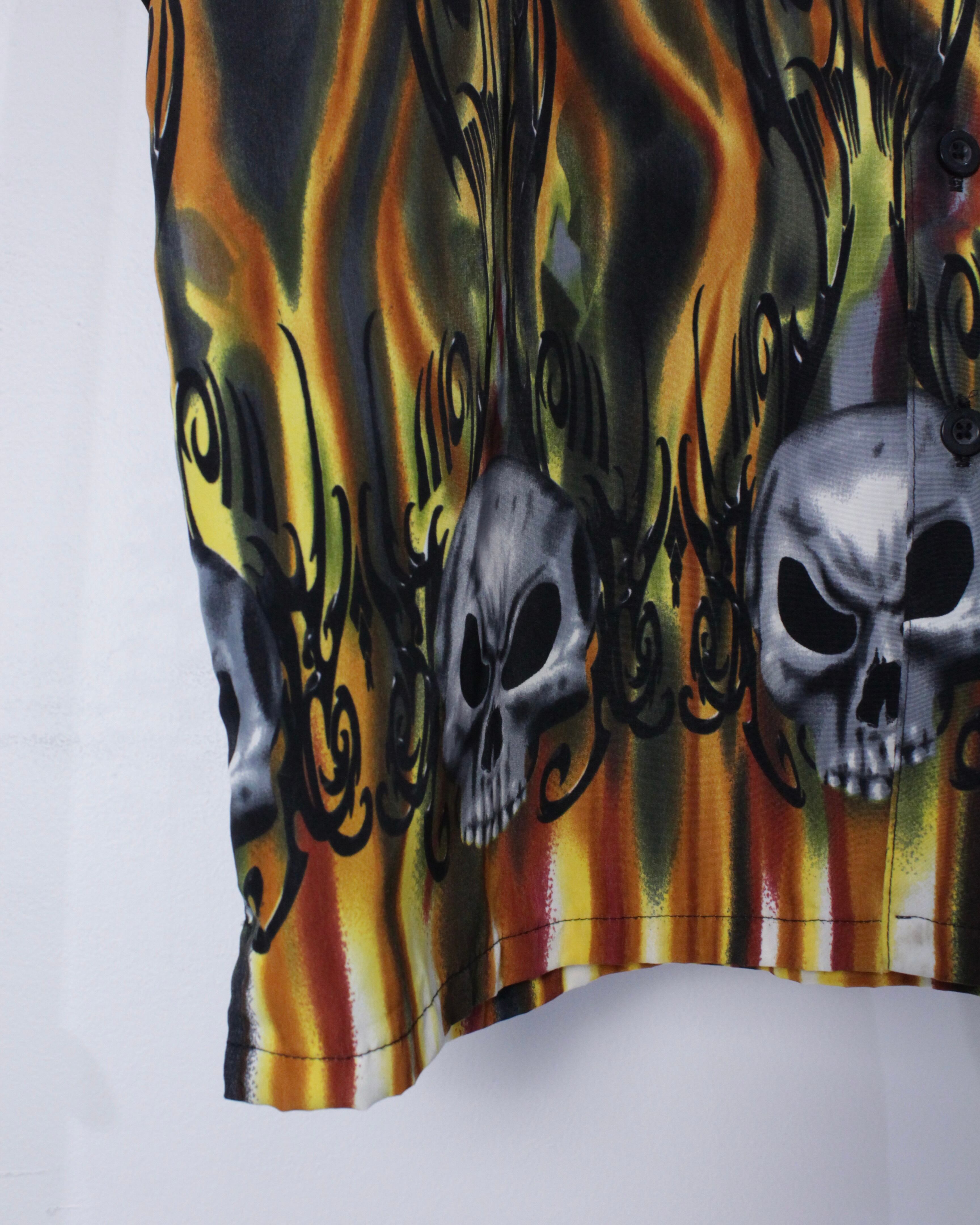 ブラックのボディをベースに、ファイヤーパターン×スカルを載せた、抜群の存在感を放つ半袖オープンカラーシャツ。