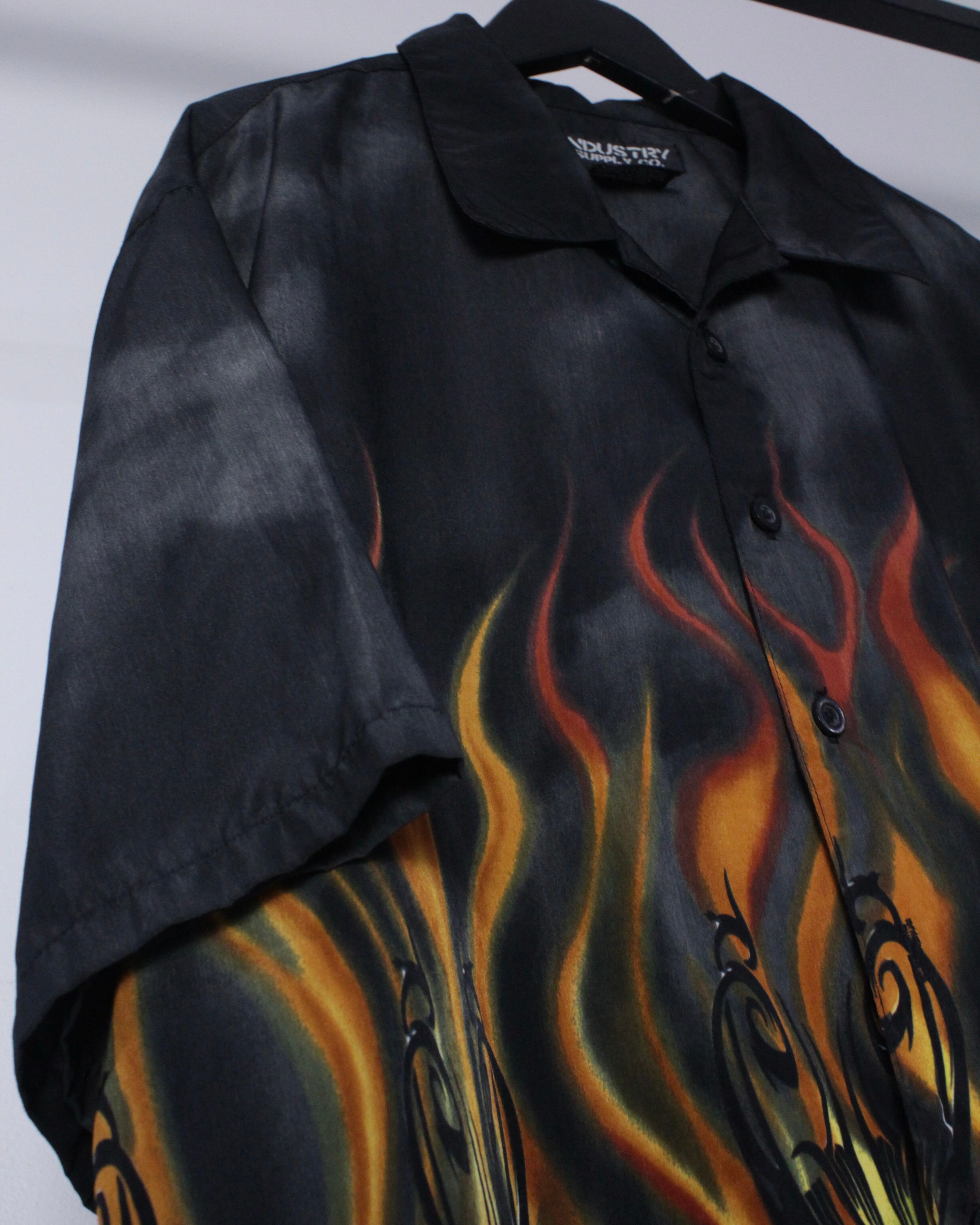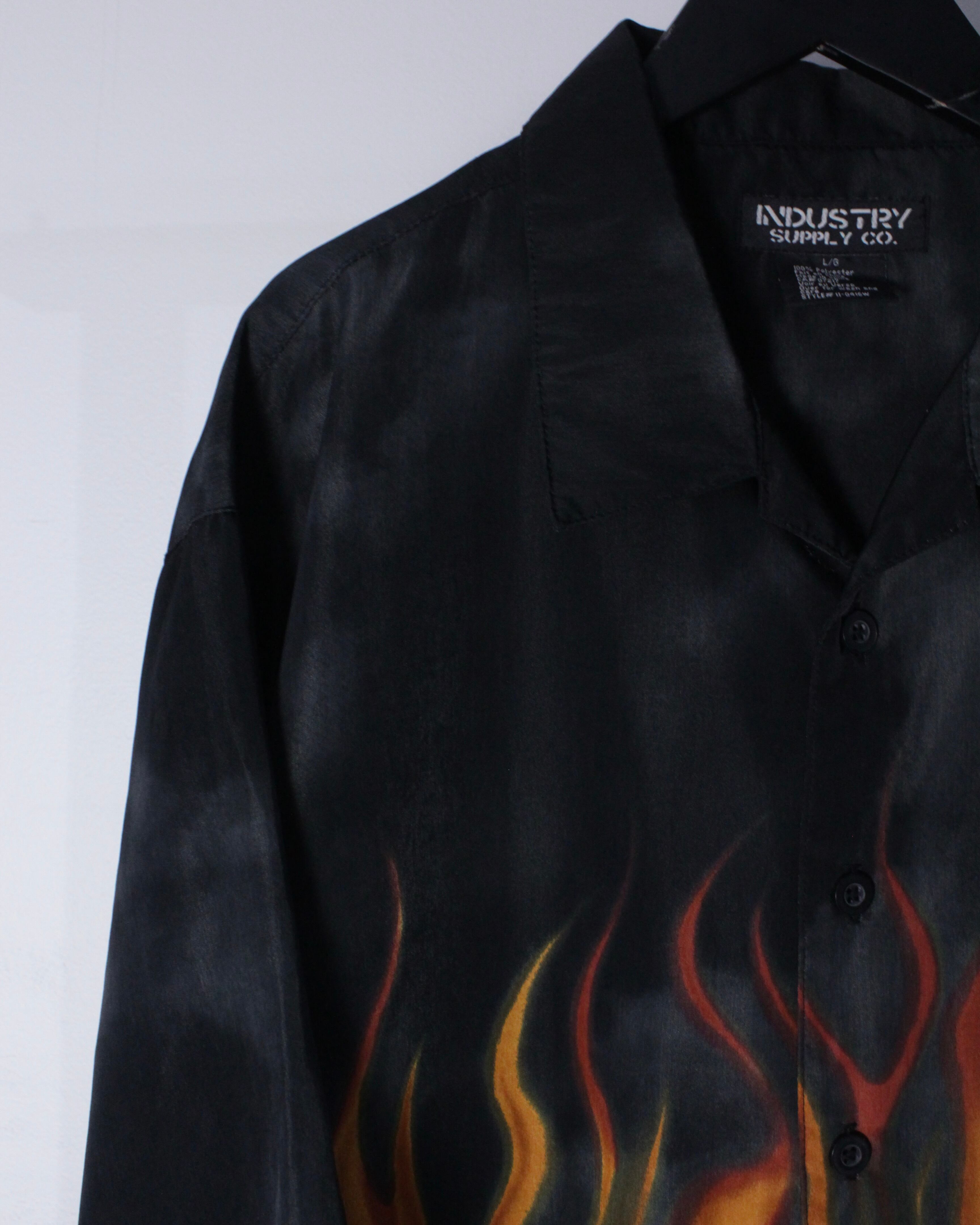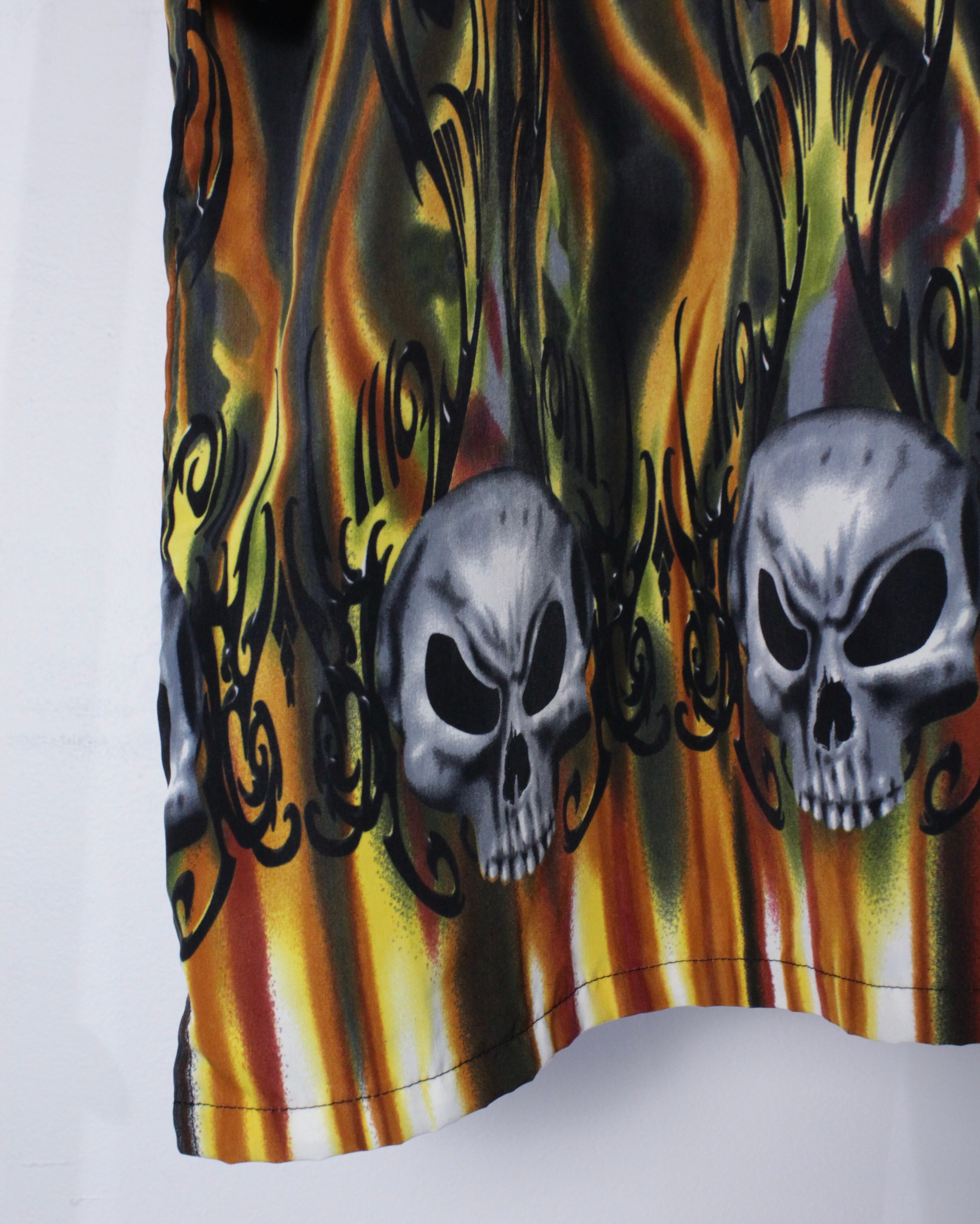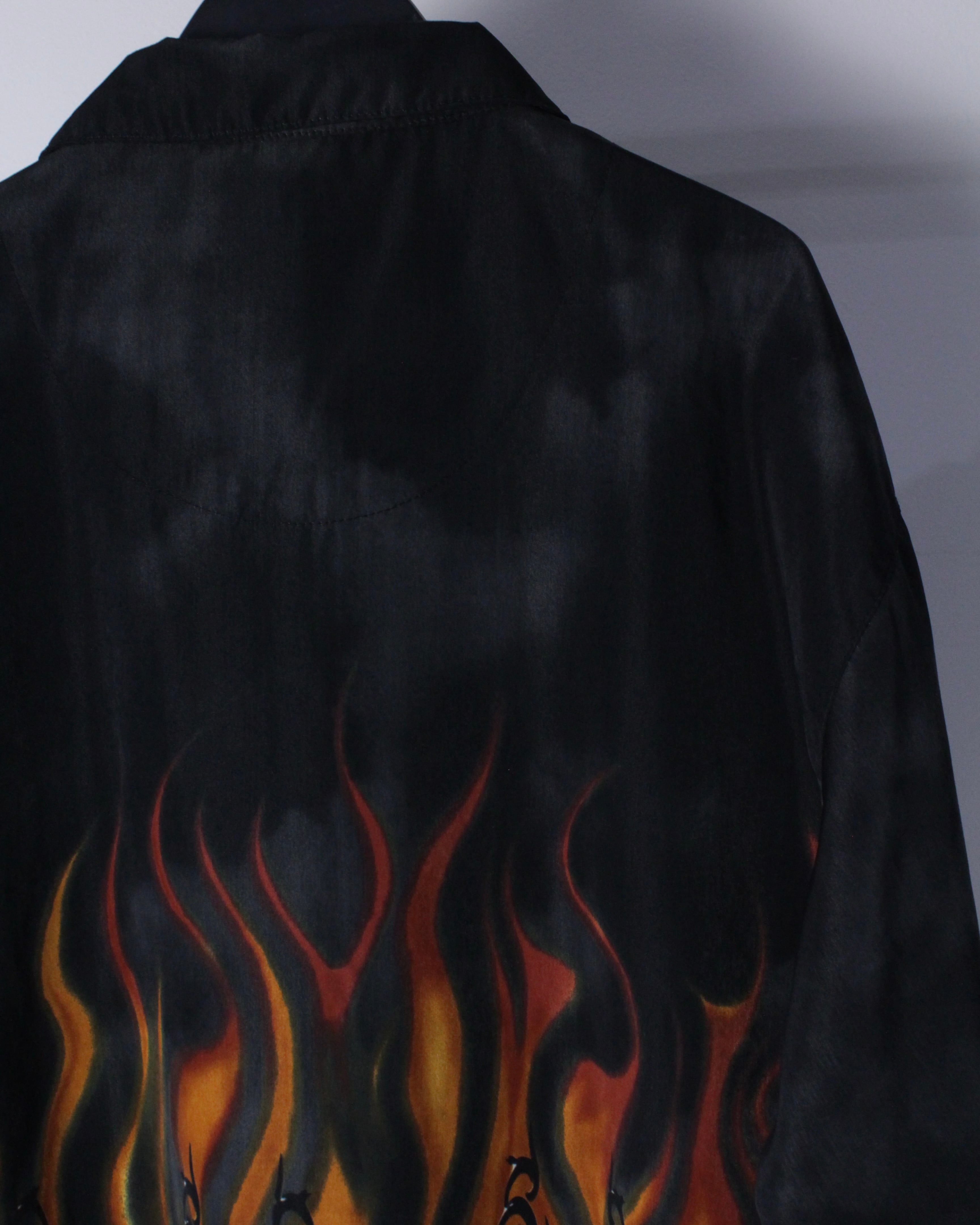 ブラックのボディをベースに、ファイヤーパターン×スカルを載せた、抜群の存在感を放つ半袖オープンカラーシャツ。
