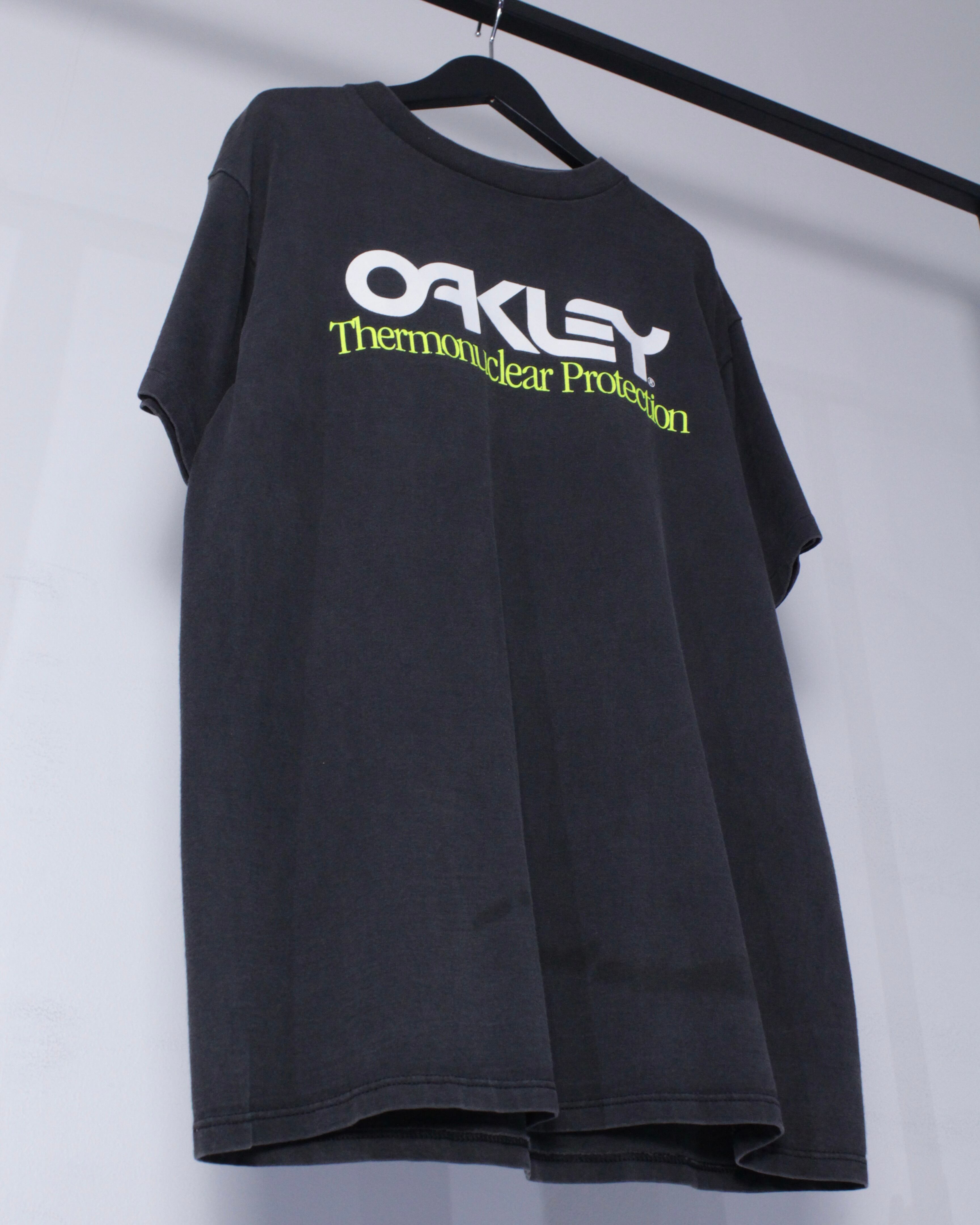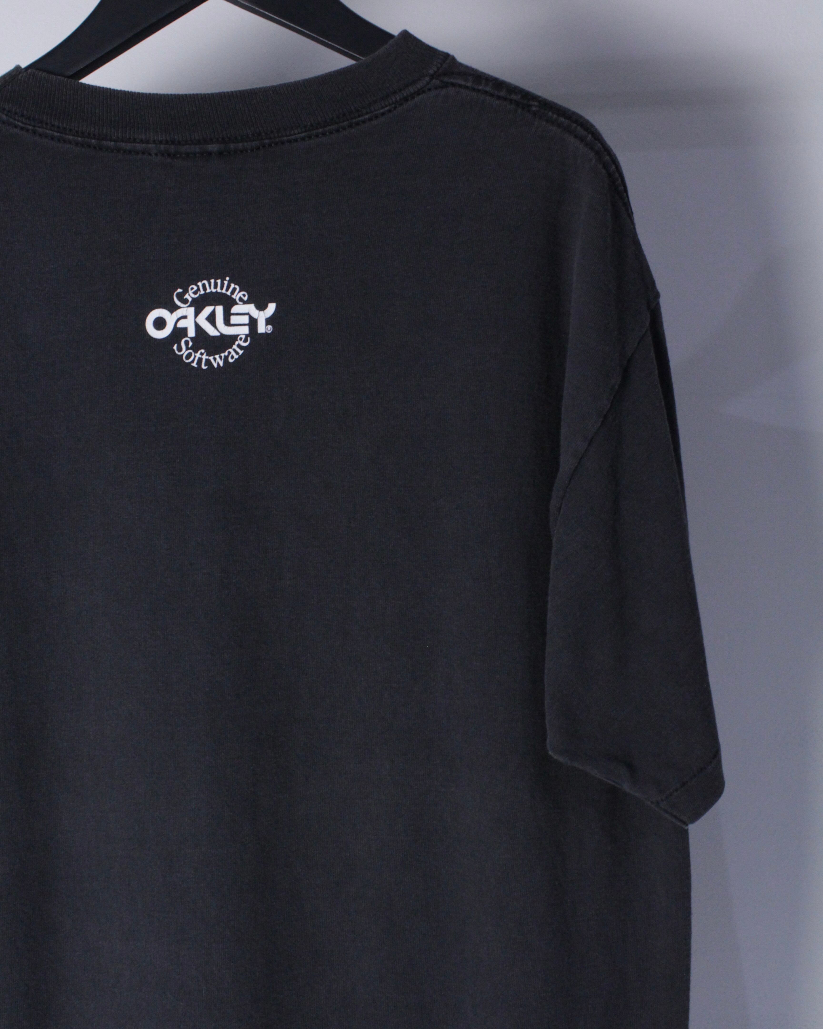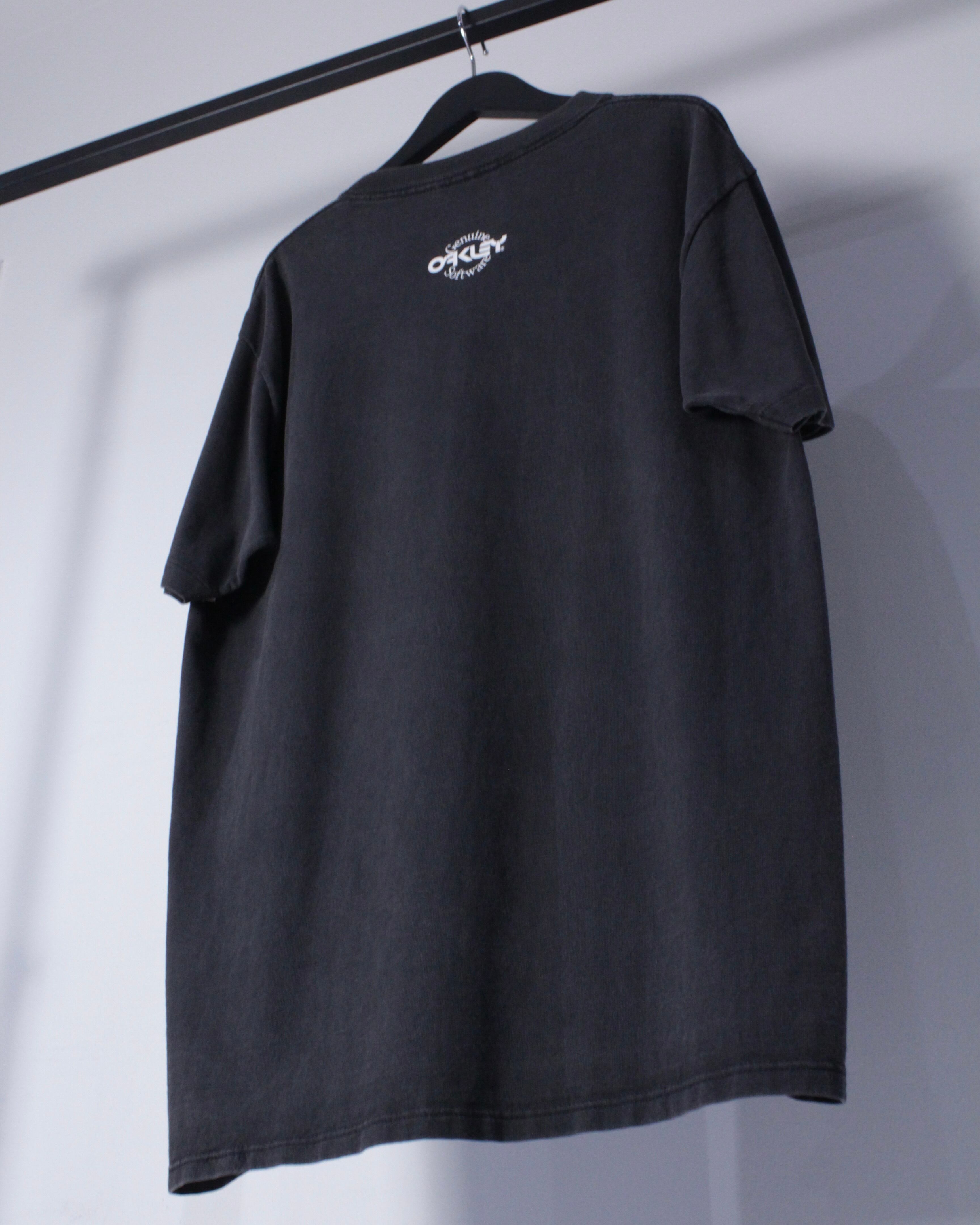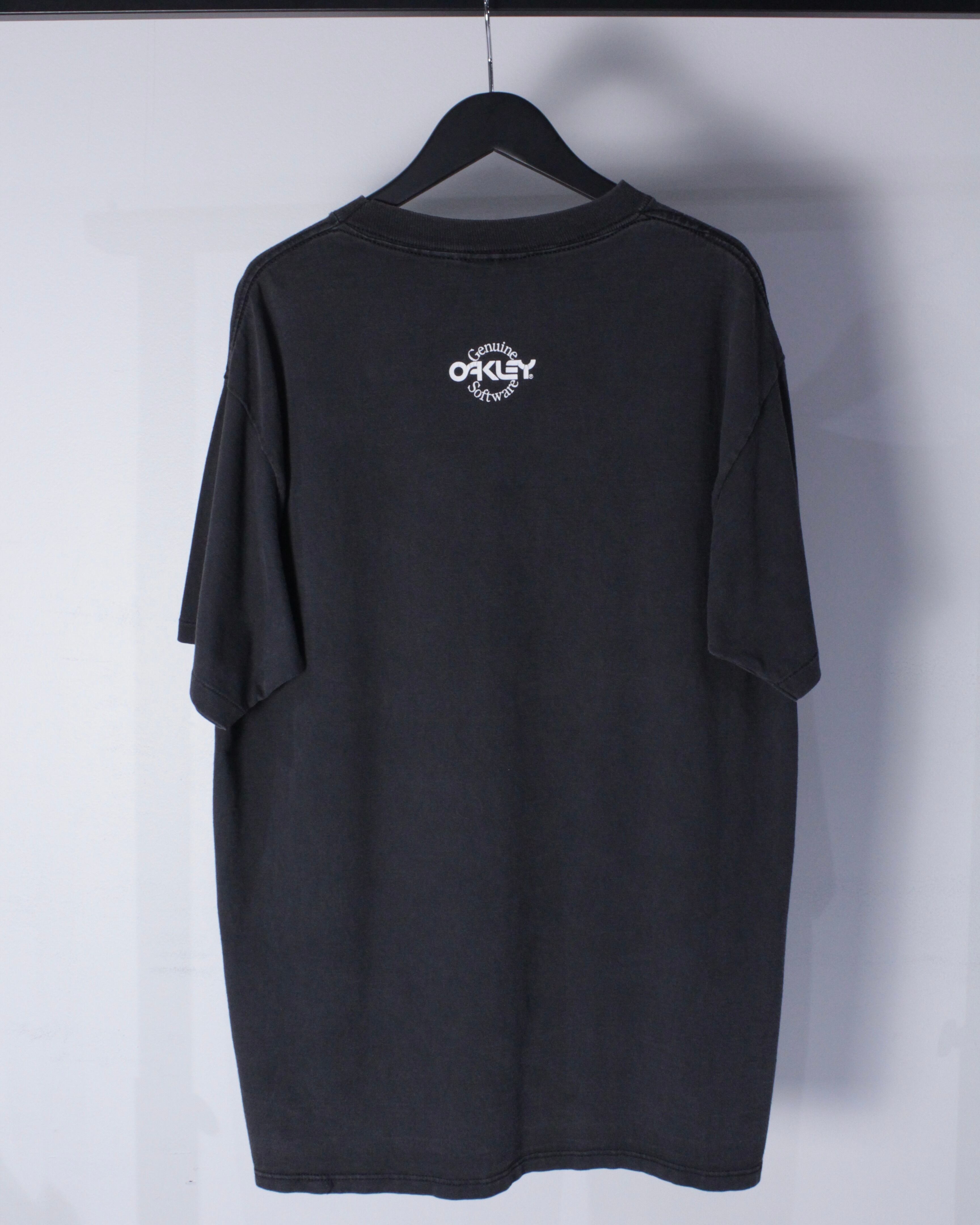フェードの効いた墨黒ボディのフロントにブランドロゴを載せた90's"OAKLEY"のTシャツ。