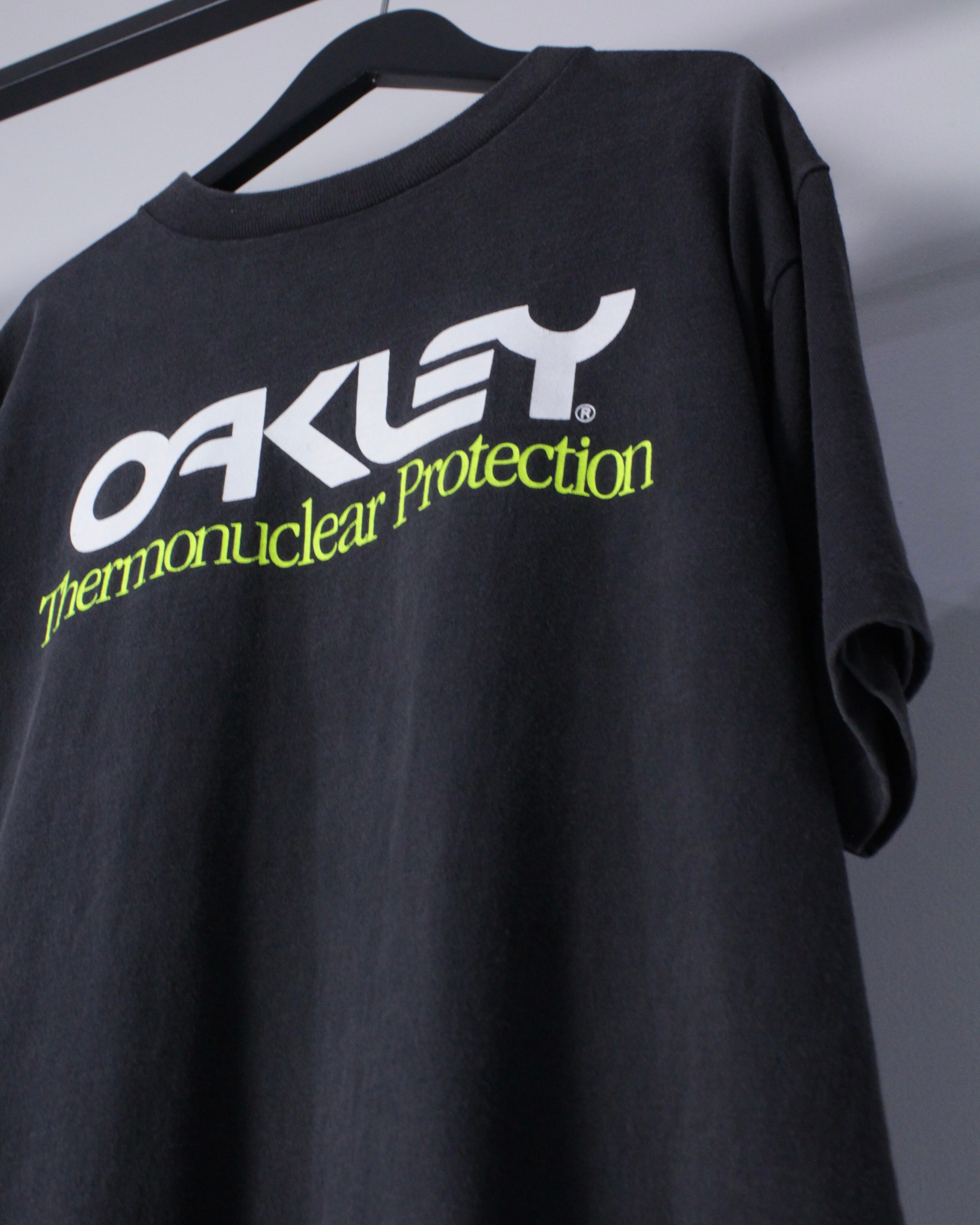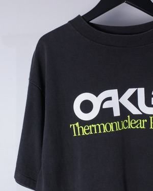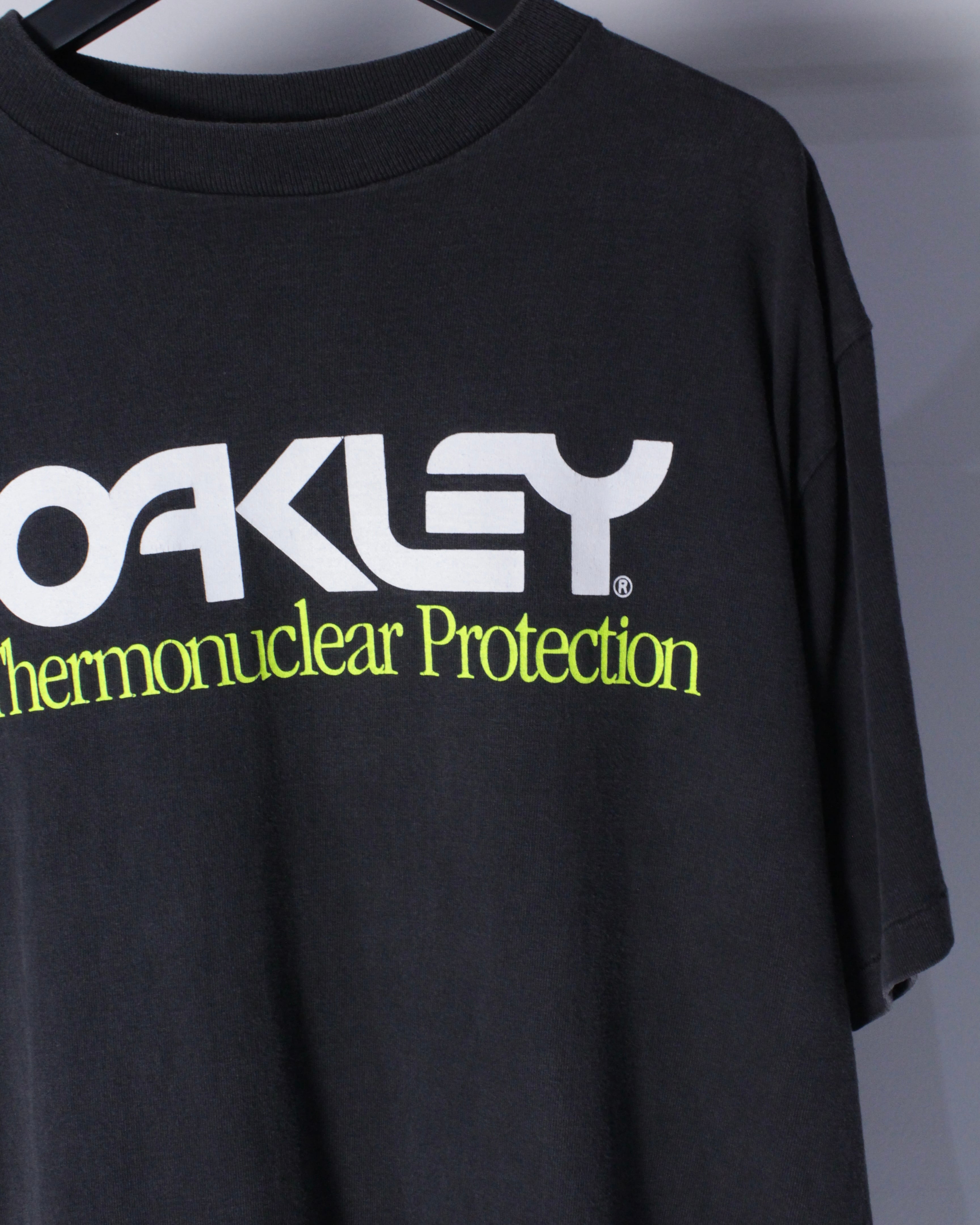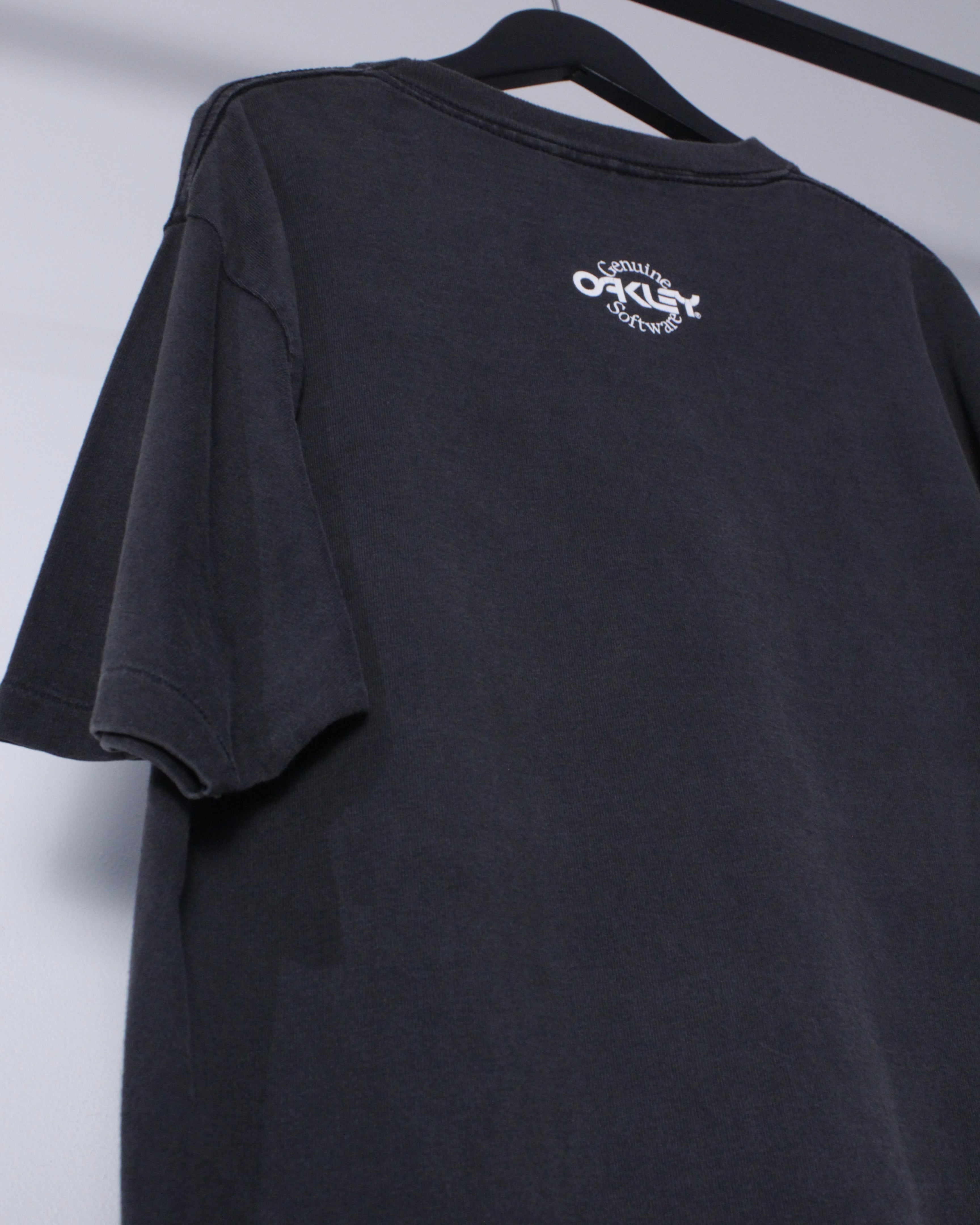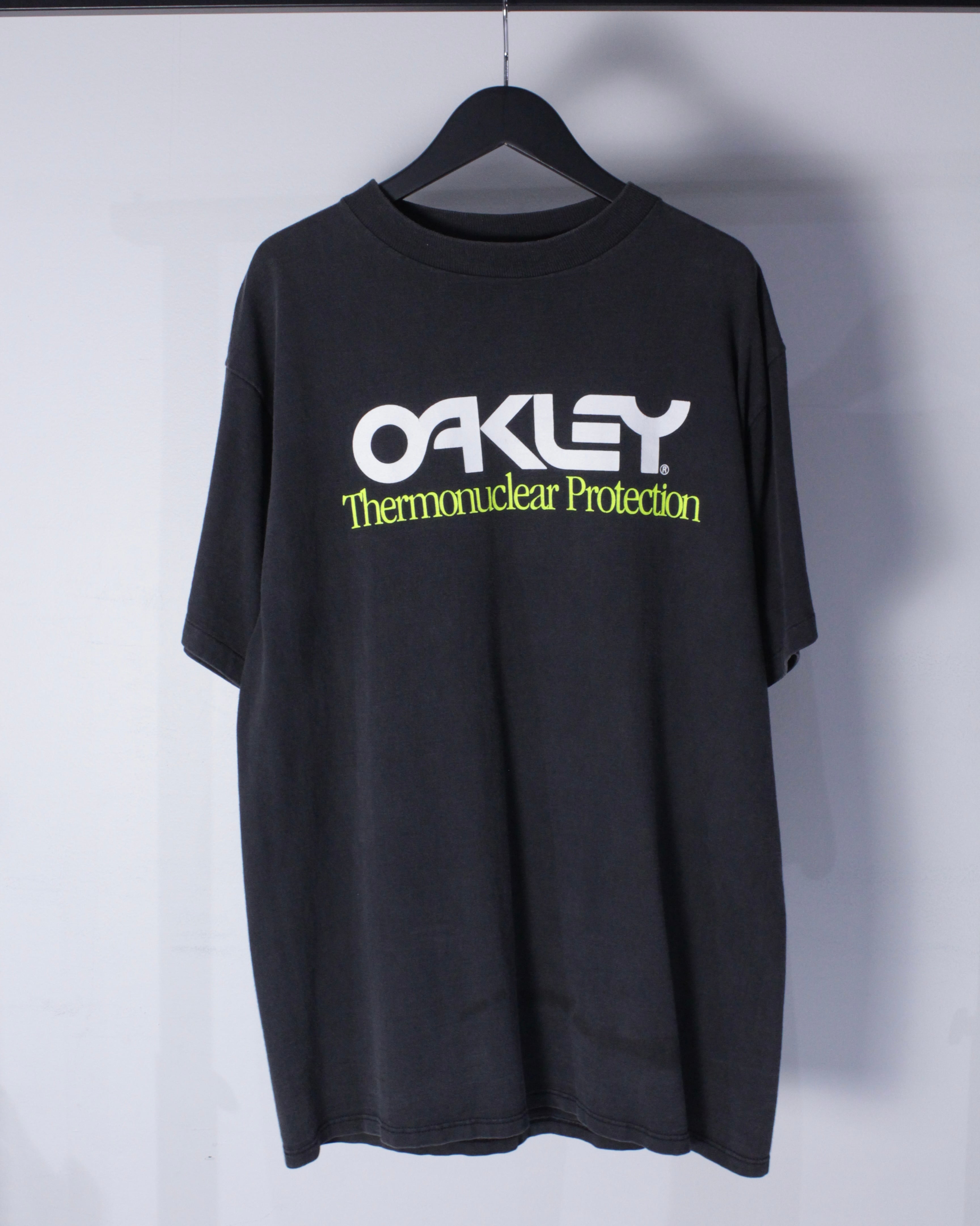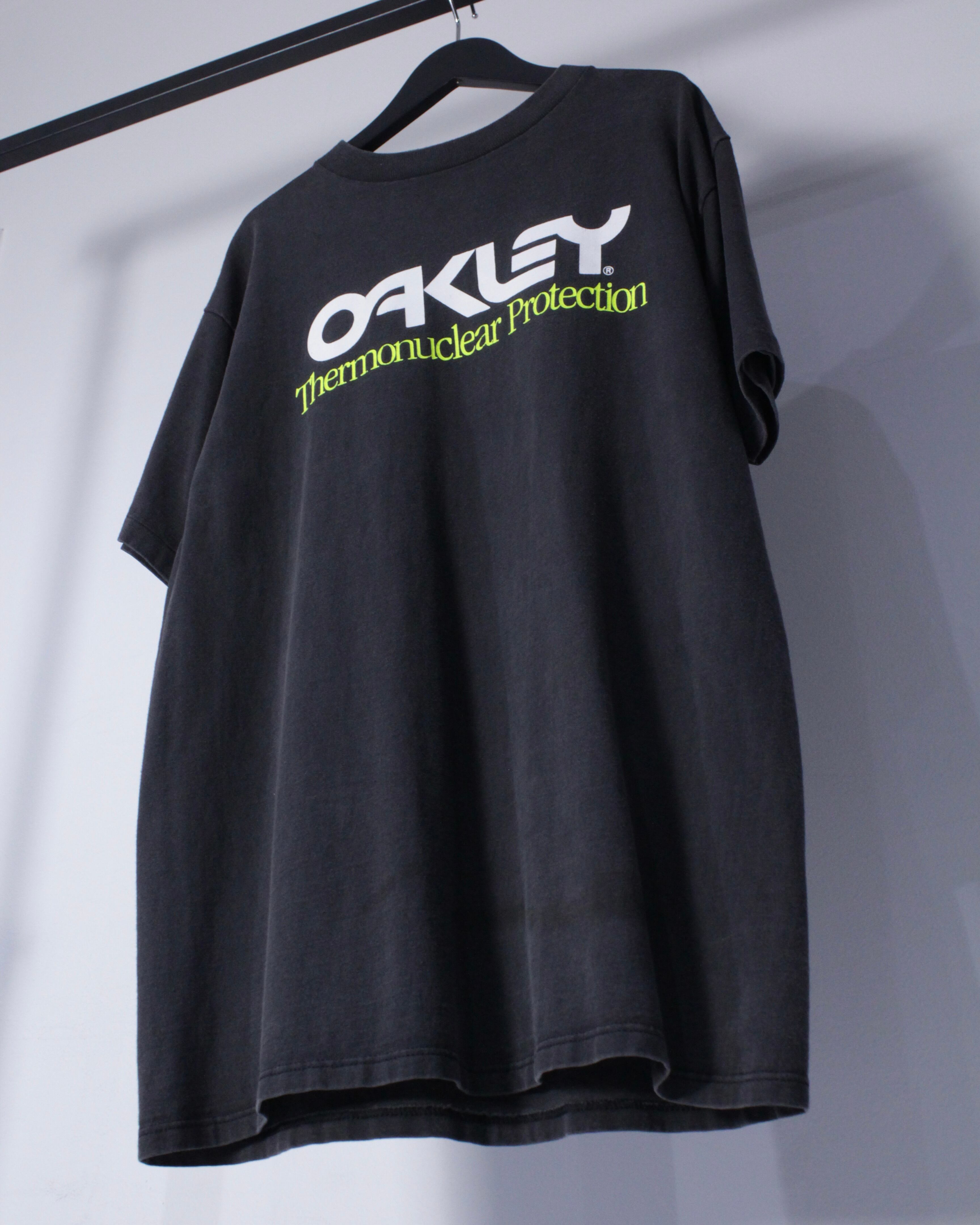 フェードの効いた墨黒ボディのフロントにブランドロゴを載せた90's"OAKLEY"のTシャツ。