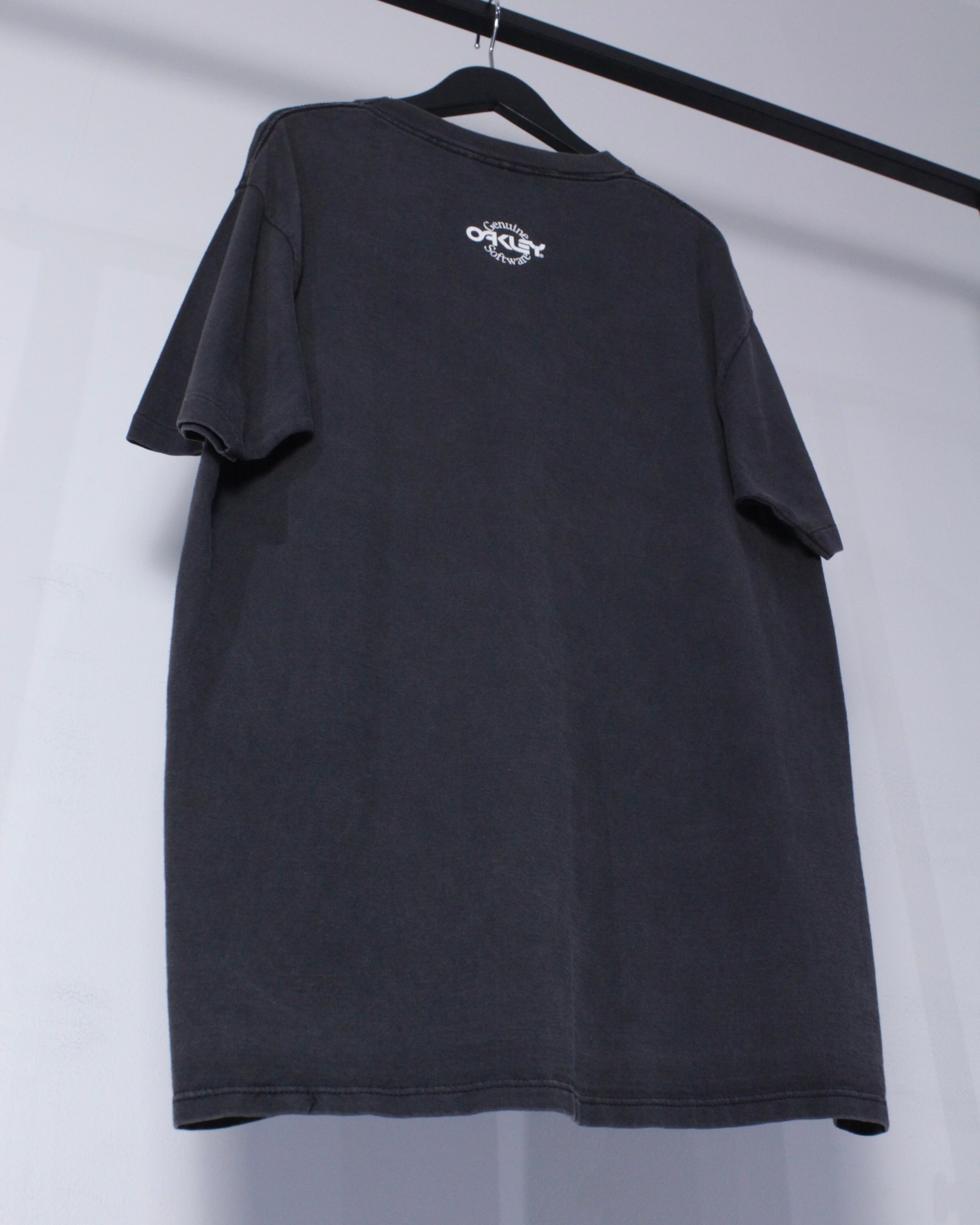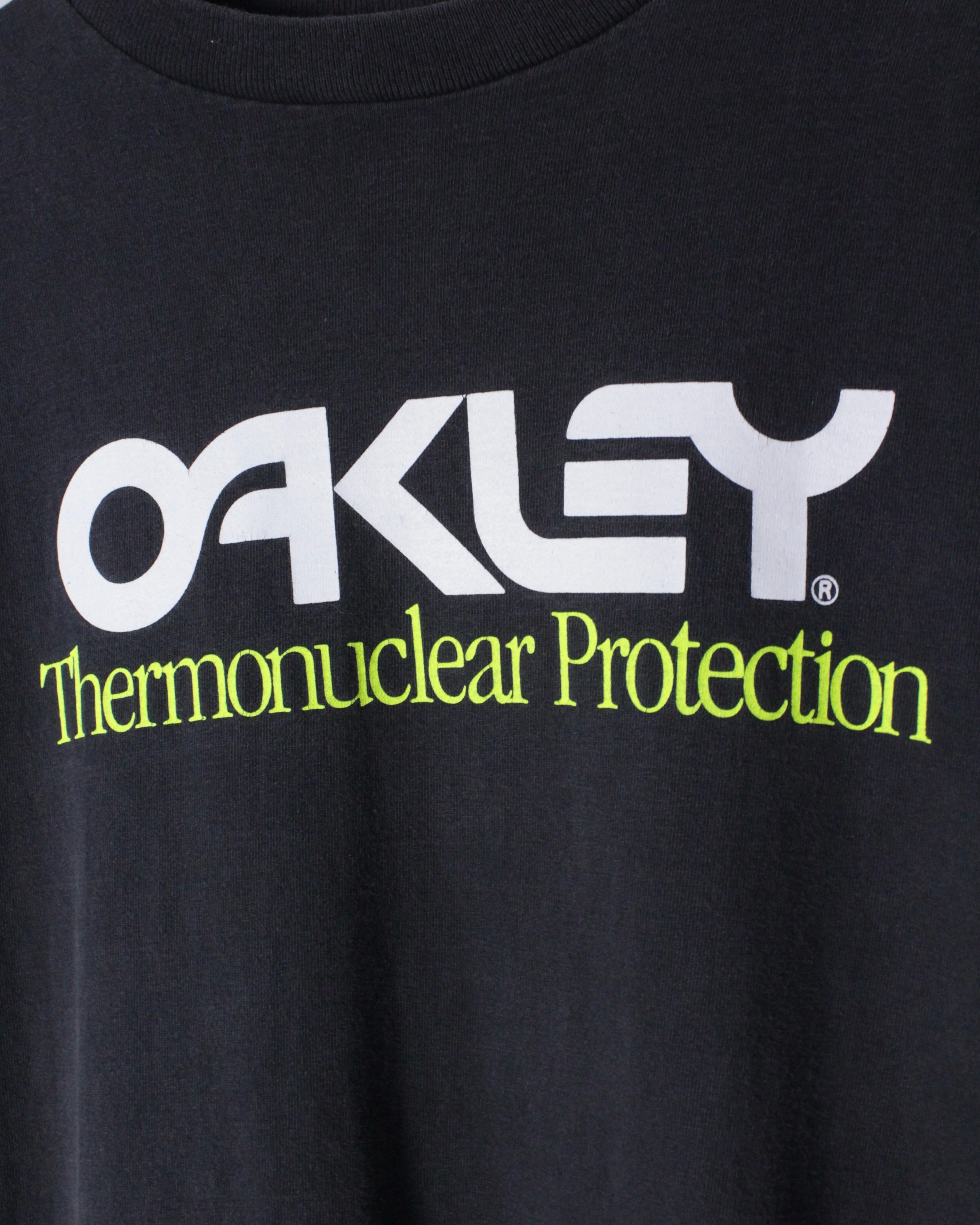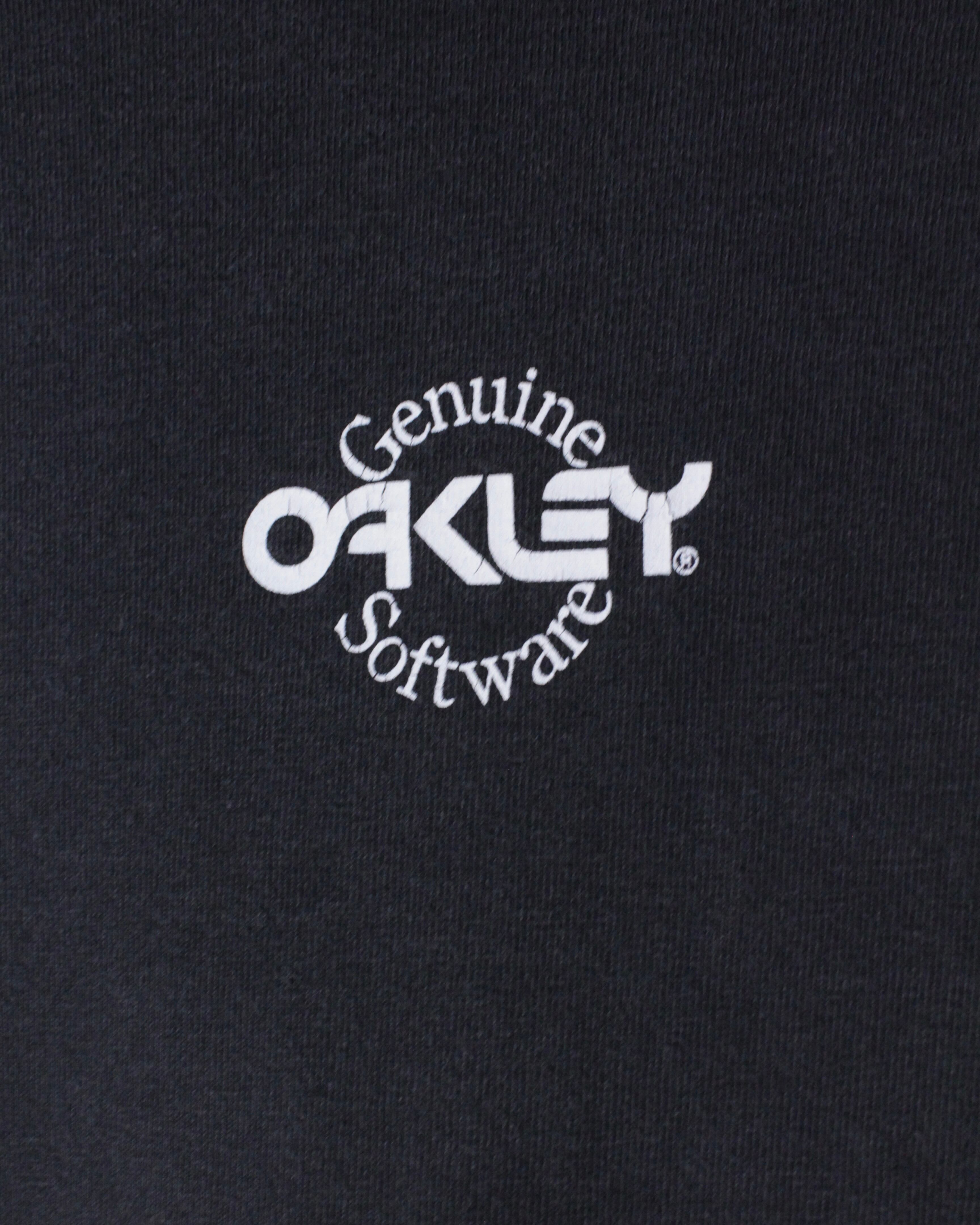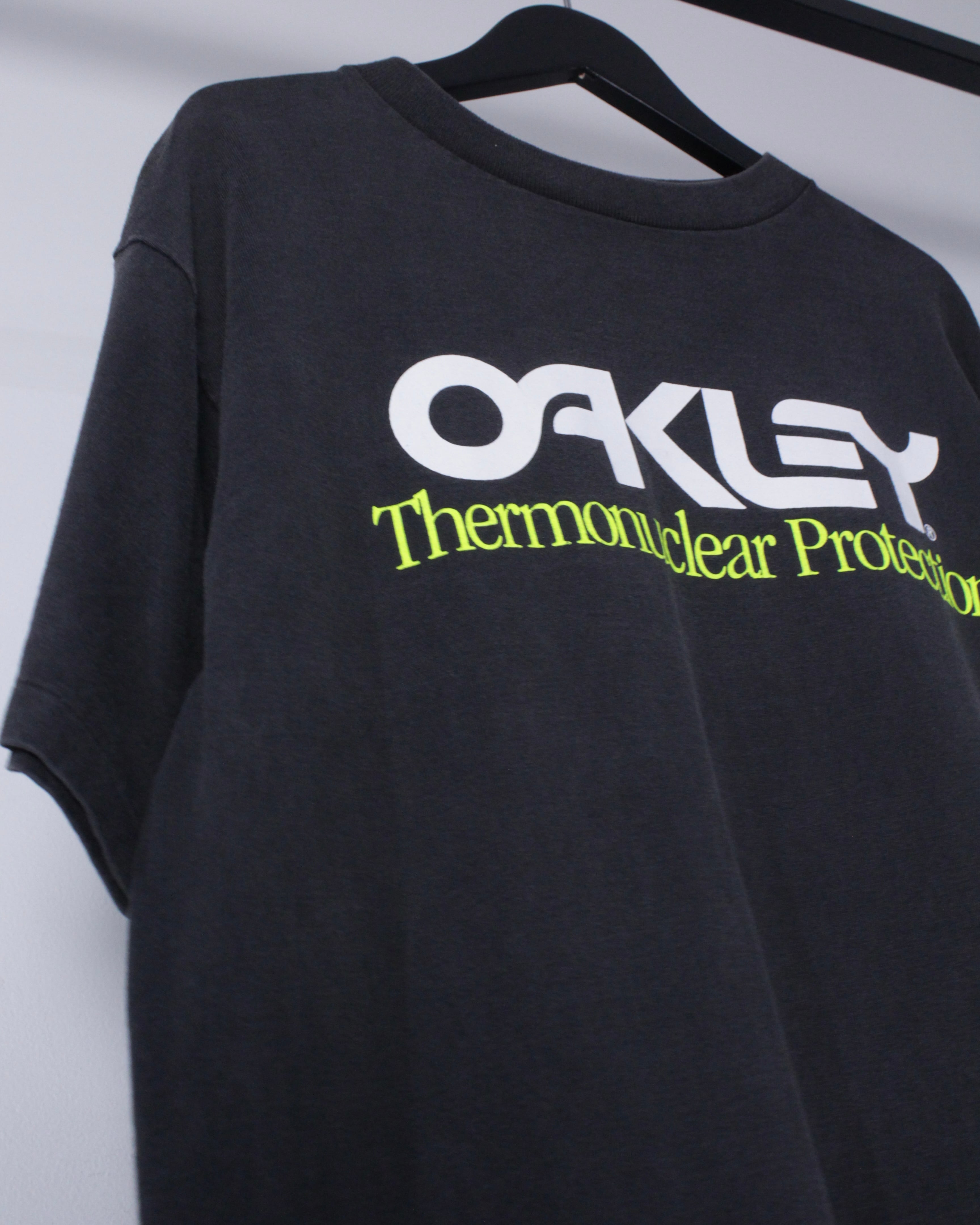 フェードの効いた墨黒ボディのフロントにブランドロゴを載せた90's"OAKLEY"のTシャツ。