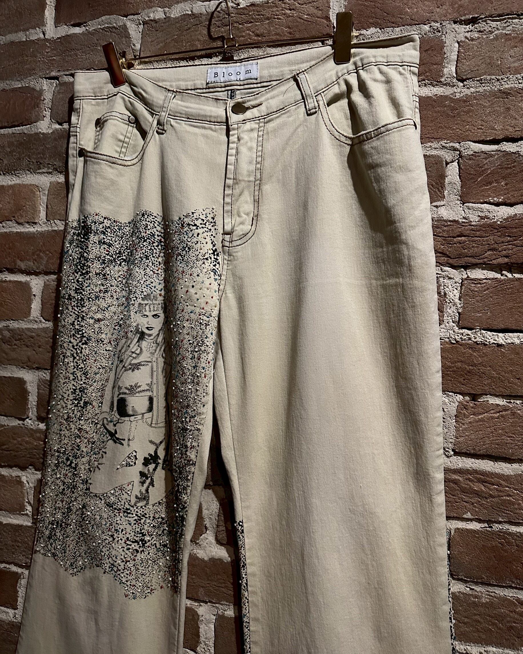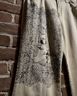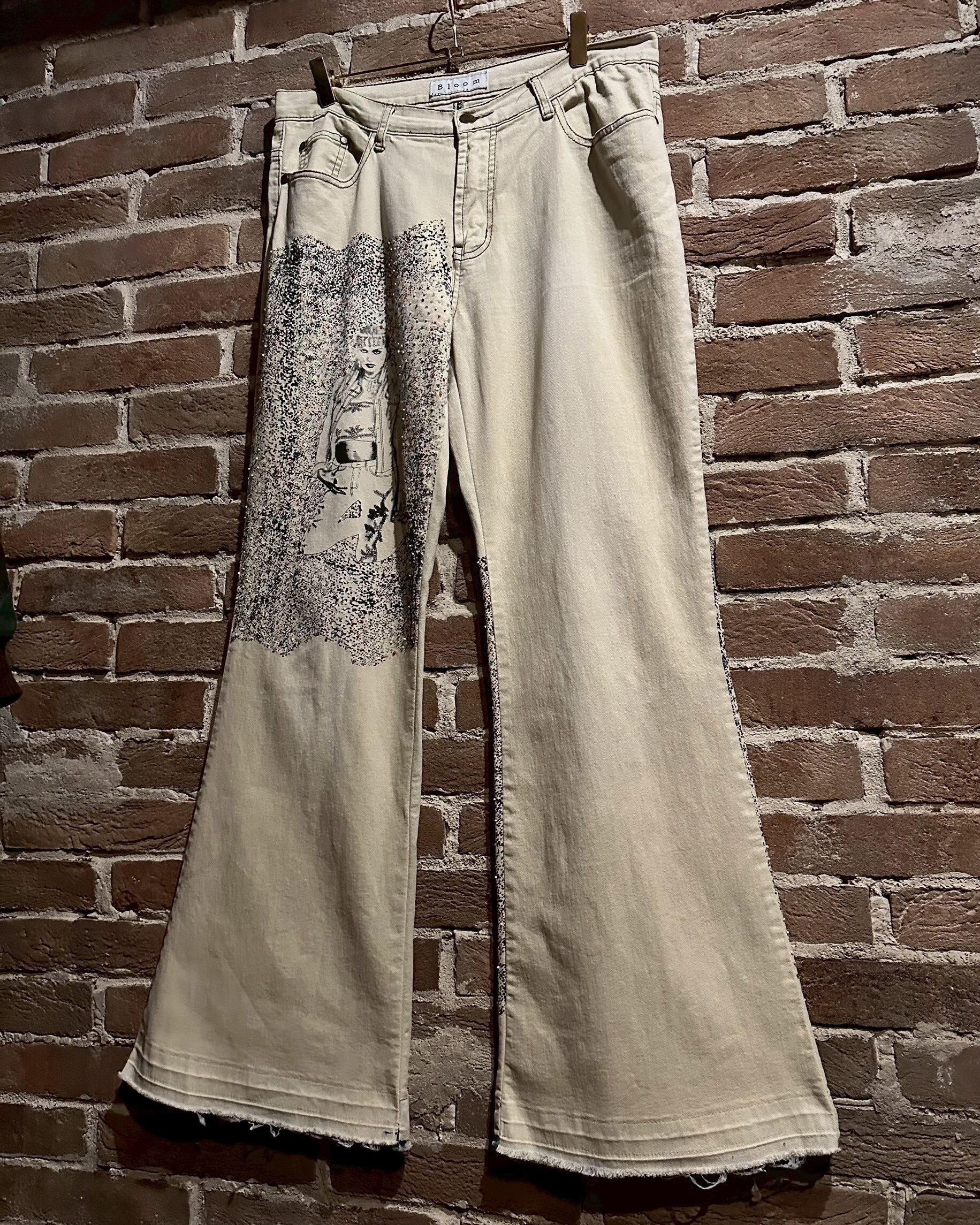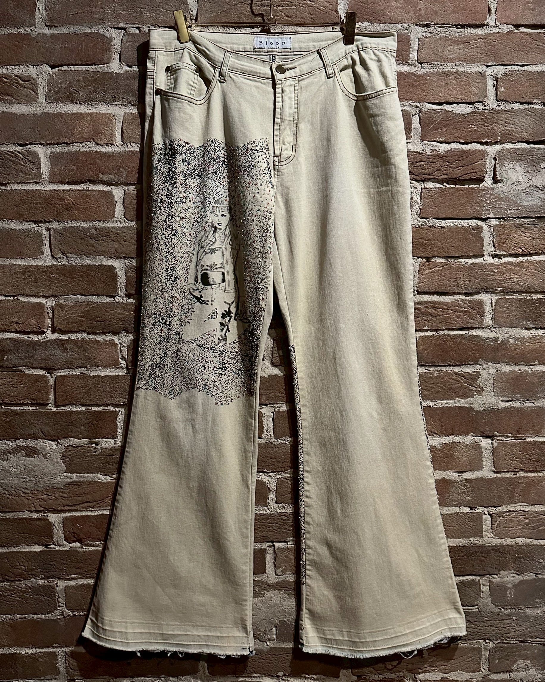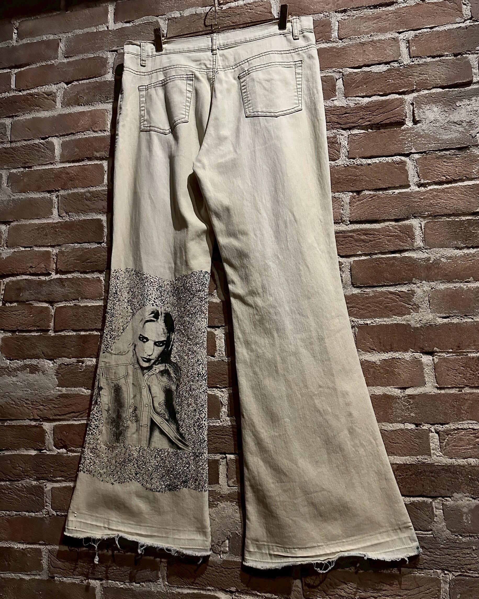 オフホワイトのデニムのボディに、アーティスティックな雰囲気を漂わせる女性のデザインをボディの前後プリントしたフレアデニムパンツ。