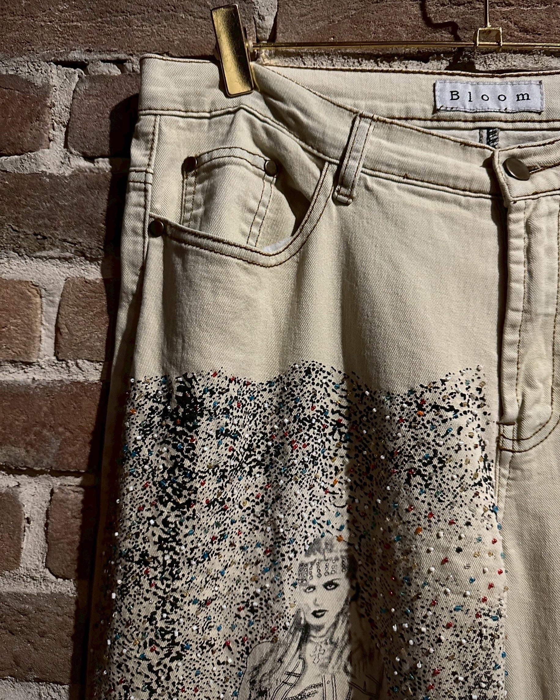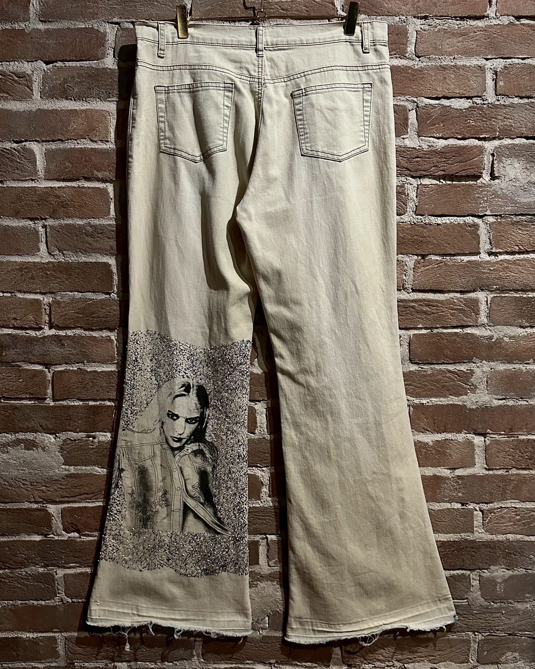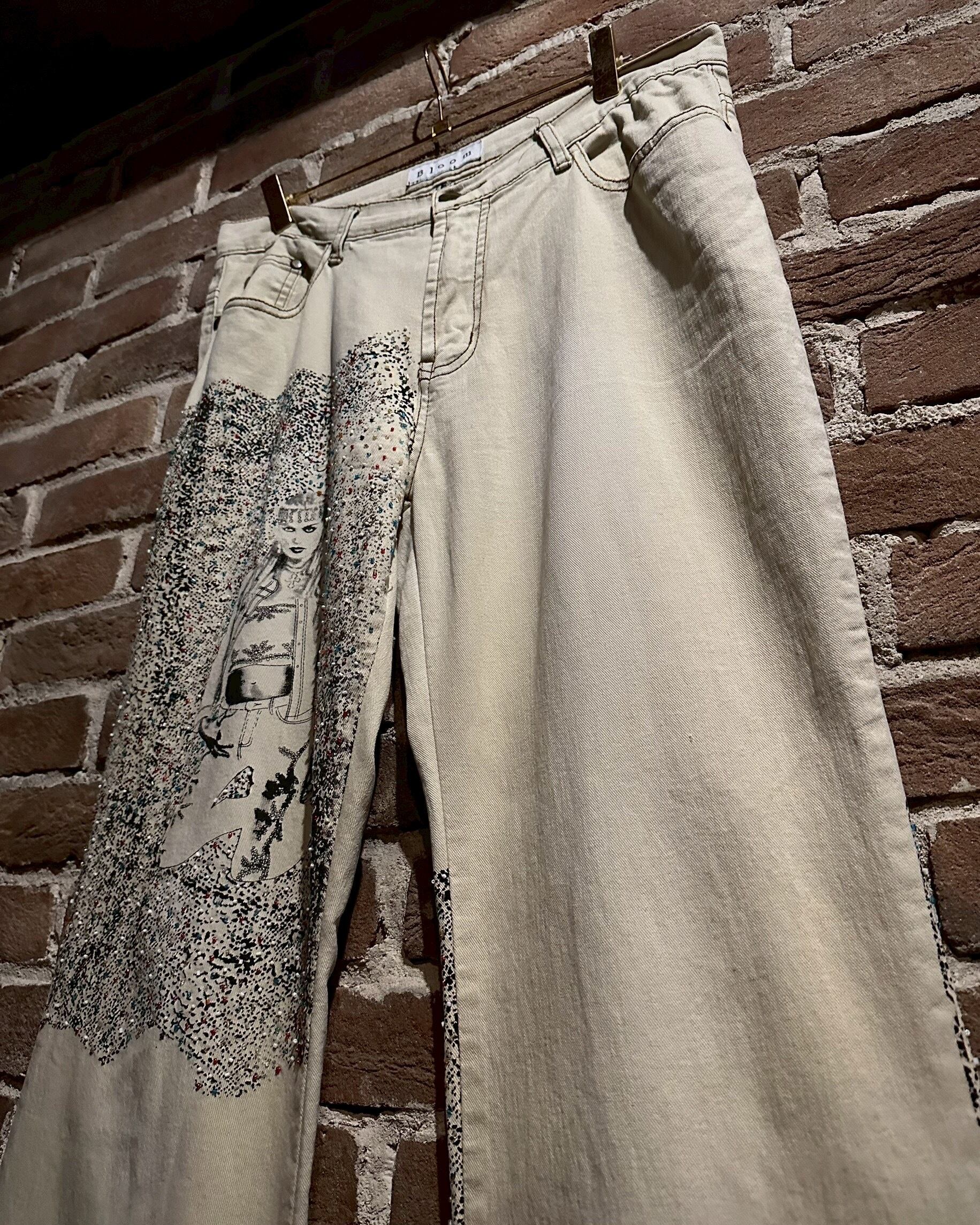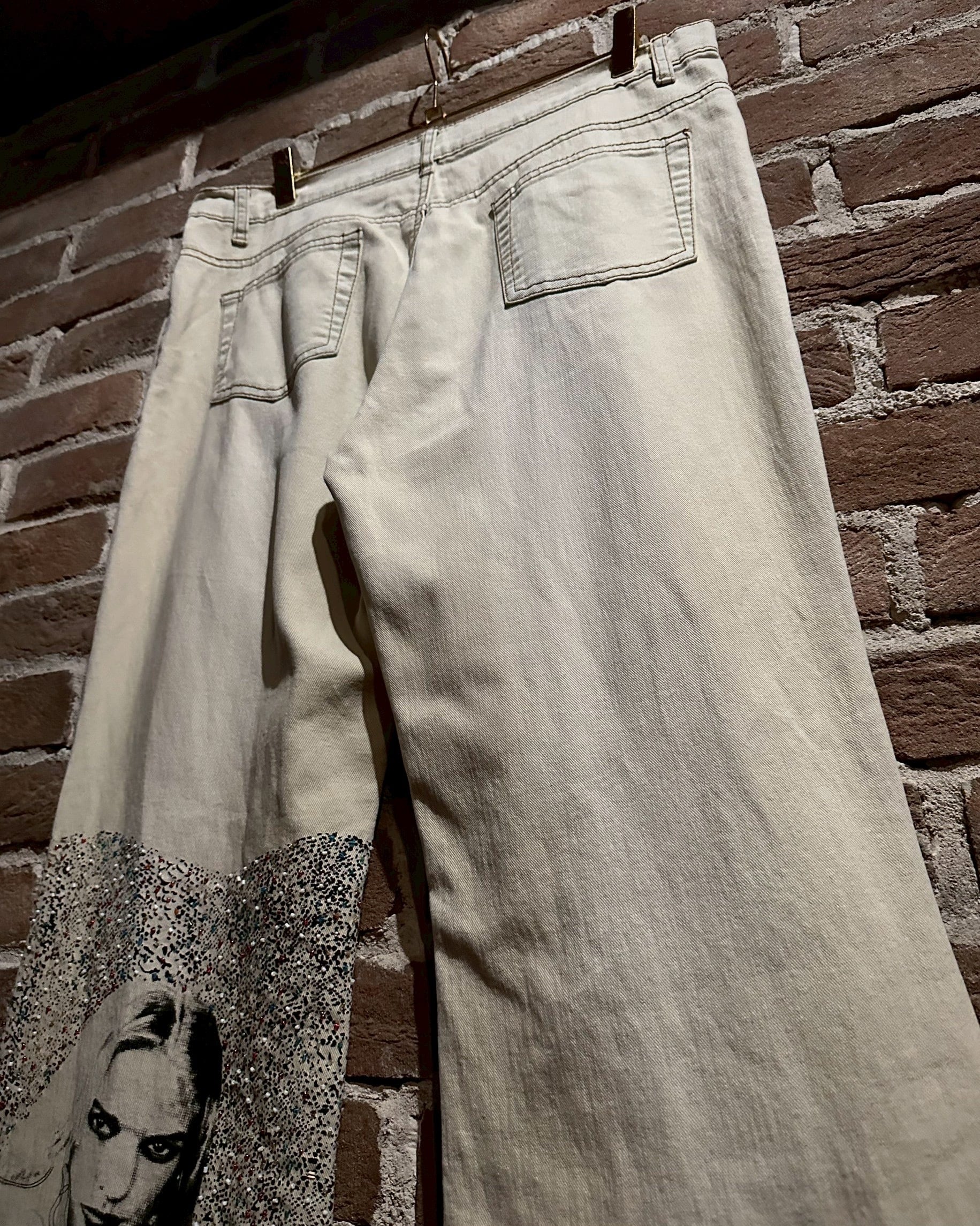 オフホワイトのデニムのボディに、アーティスティックな雰囲気を漂わせる女性のデザインをボディの前後プリントしたフレアデニムパンツ。