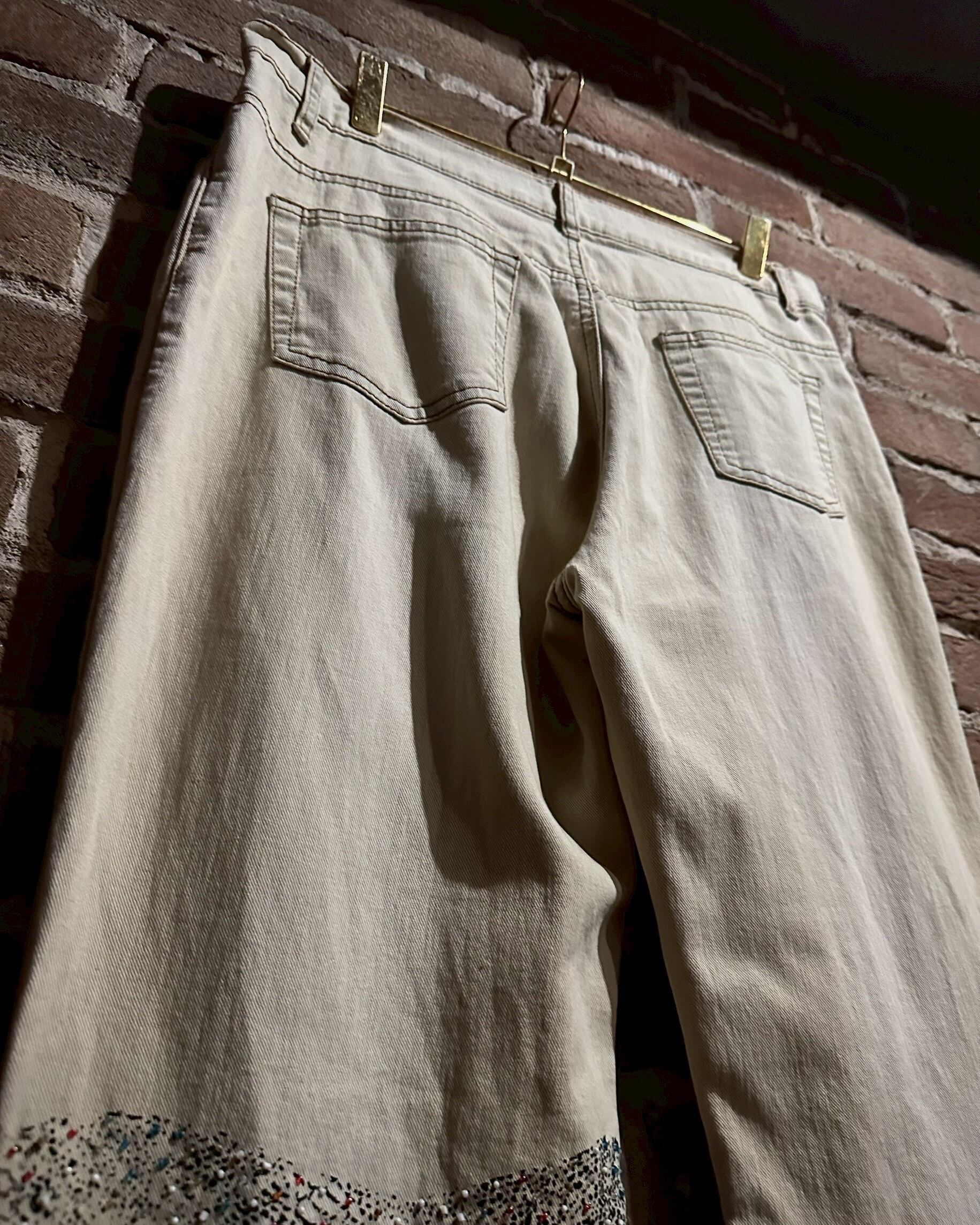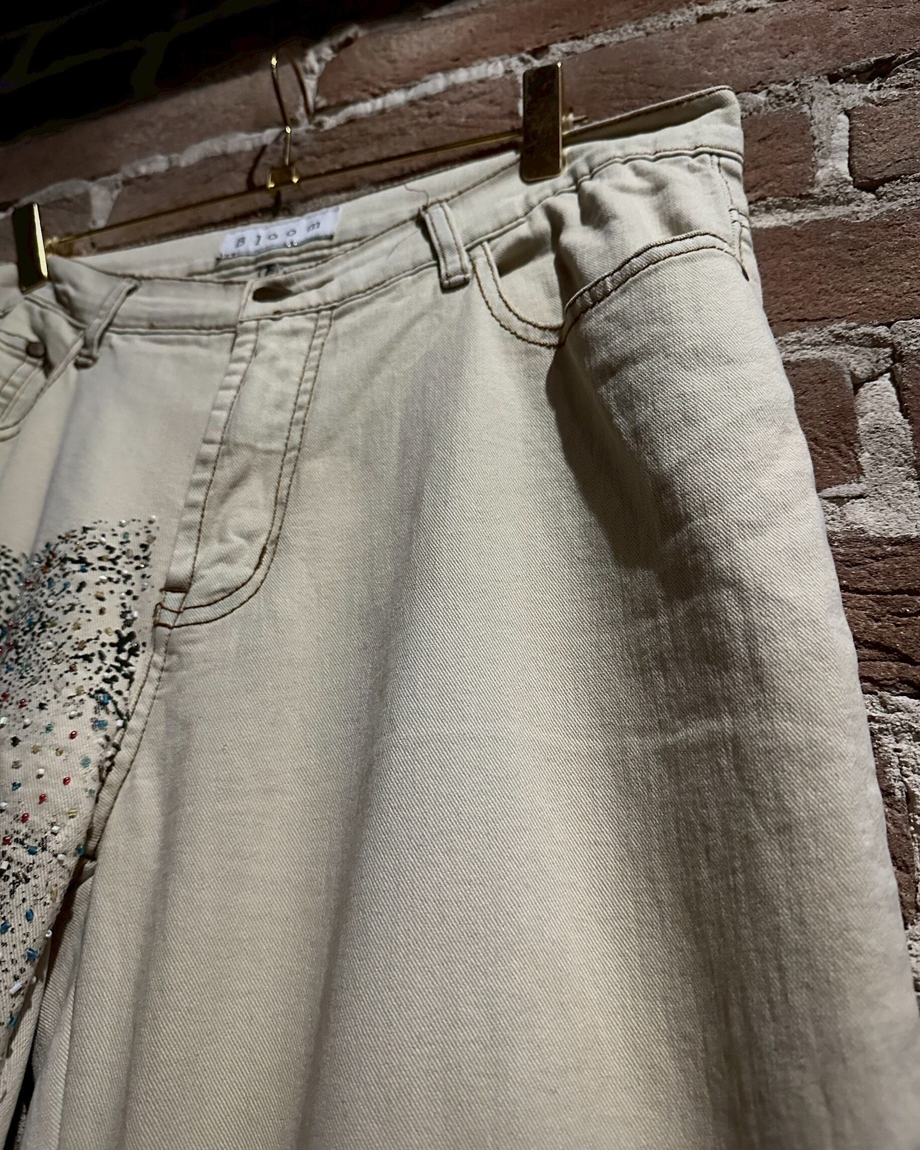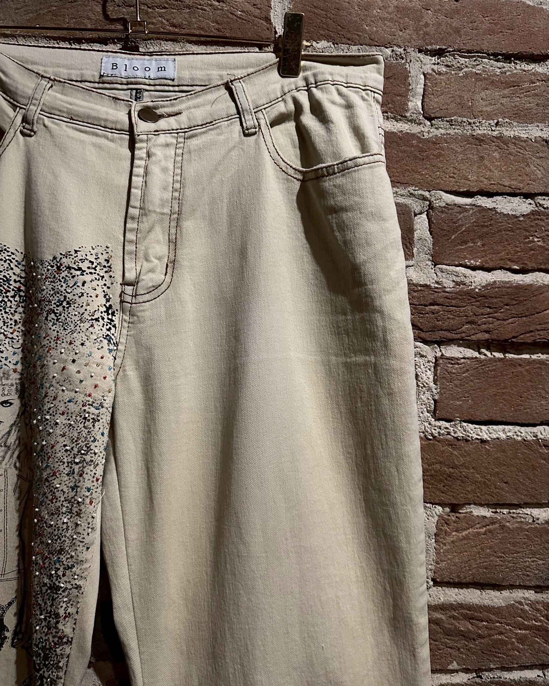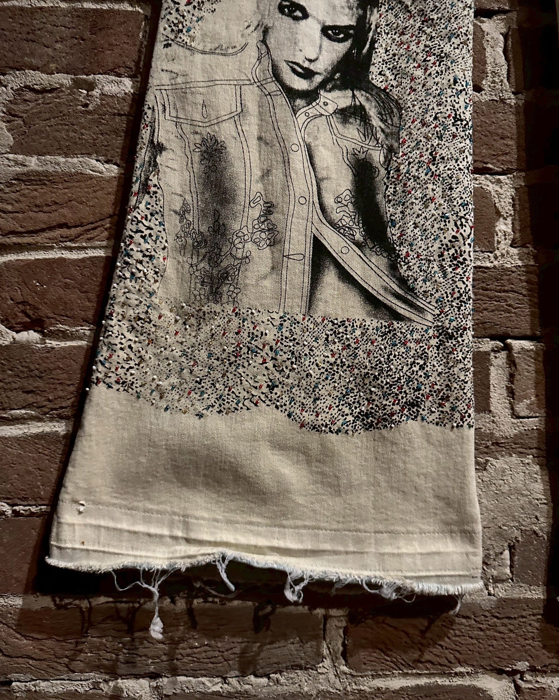 オフホワイトのデニムのボディに、アーティスティックな雰囲気を漂わせる女性のデザインをボディの前後プリントしたフレアデニムパンツ。