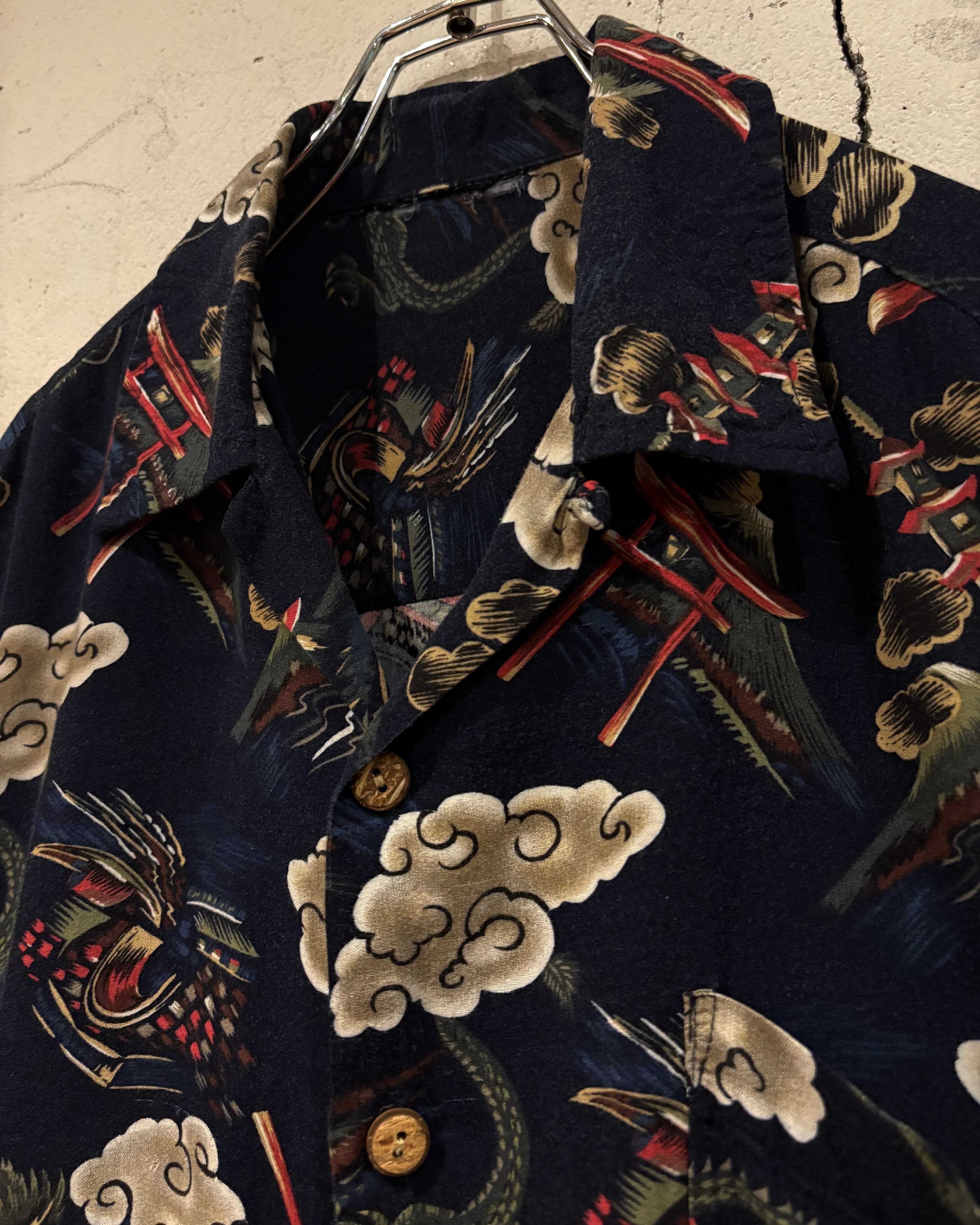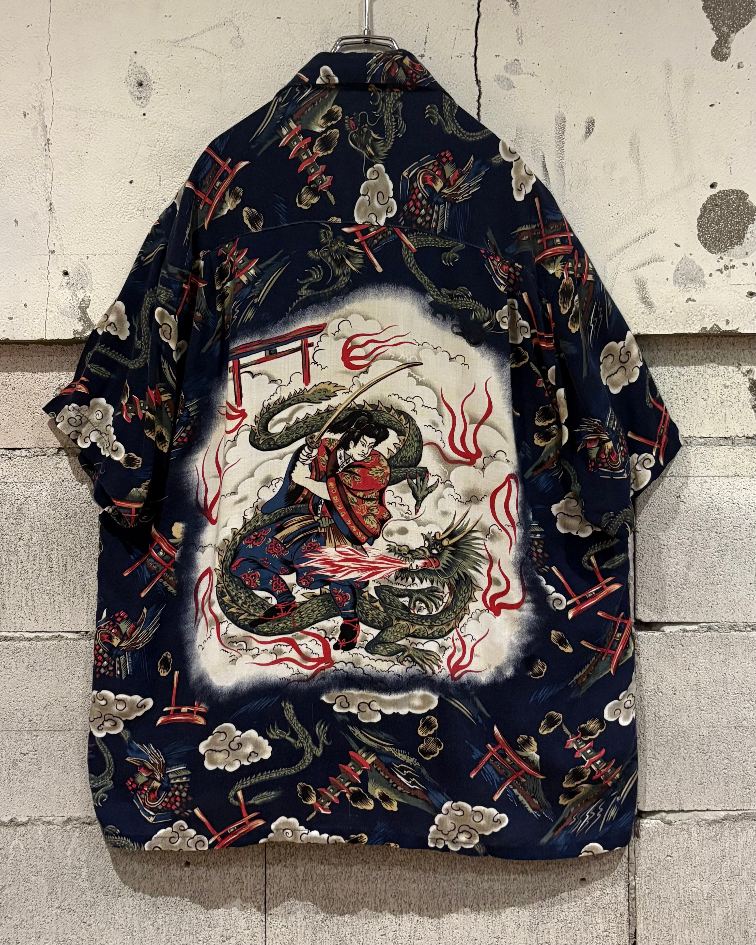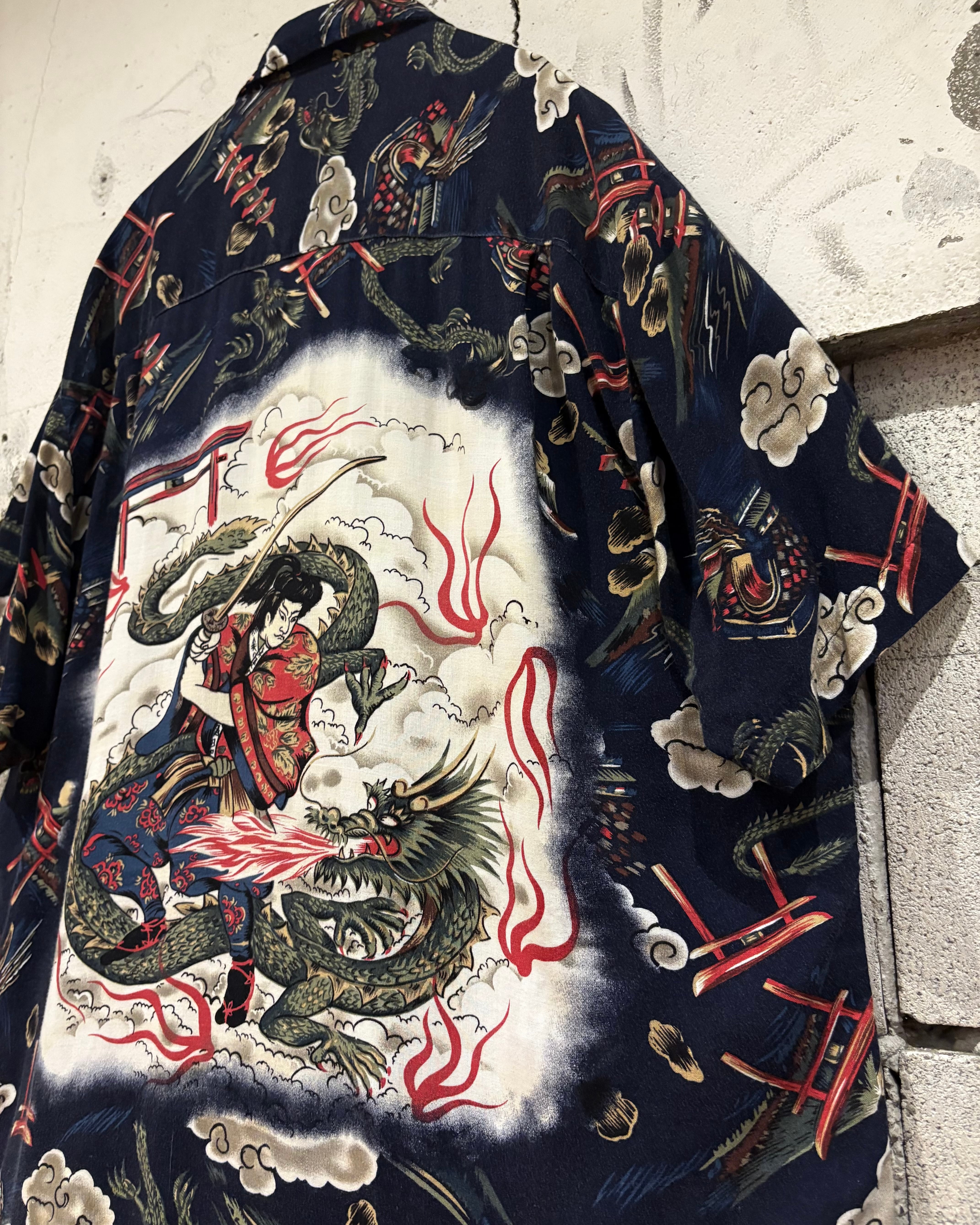龍に鳥居、背面には龍と戦う剣士のデザイン。東洋的なデザインをオープンカラーシャツに落とし込むことで街に馴染む、デザインバランスが素晴らしい1着かと。