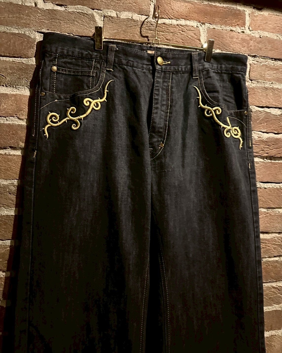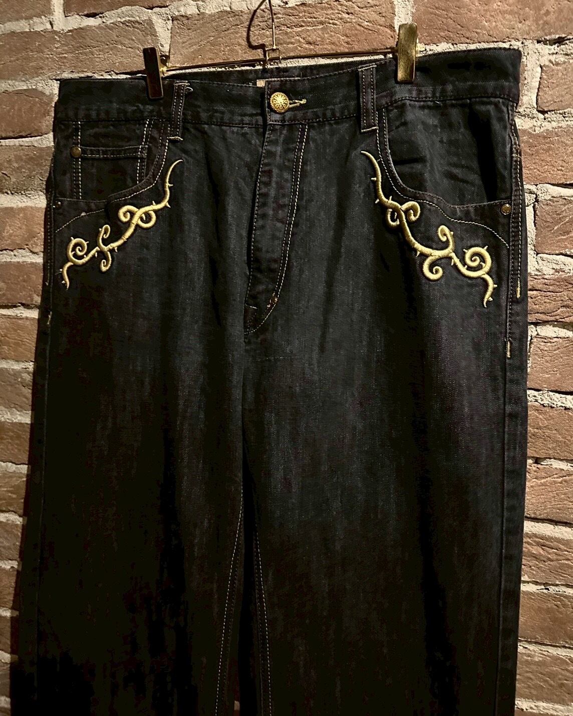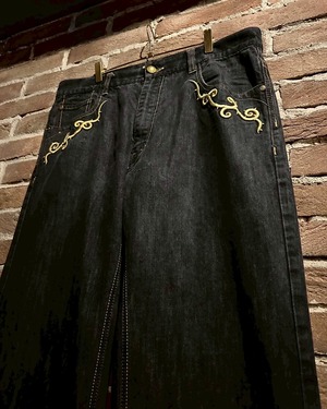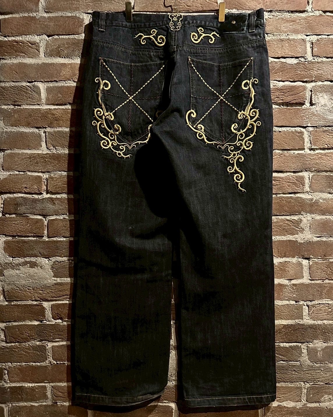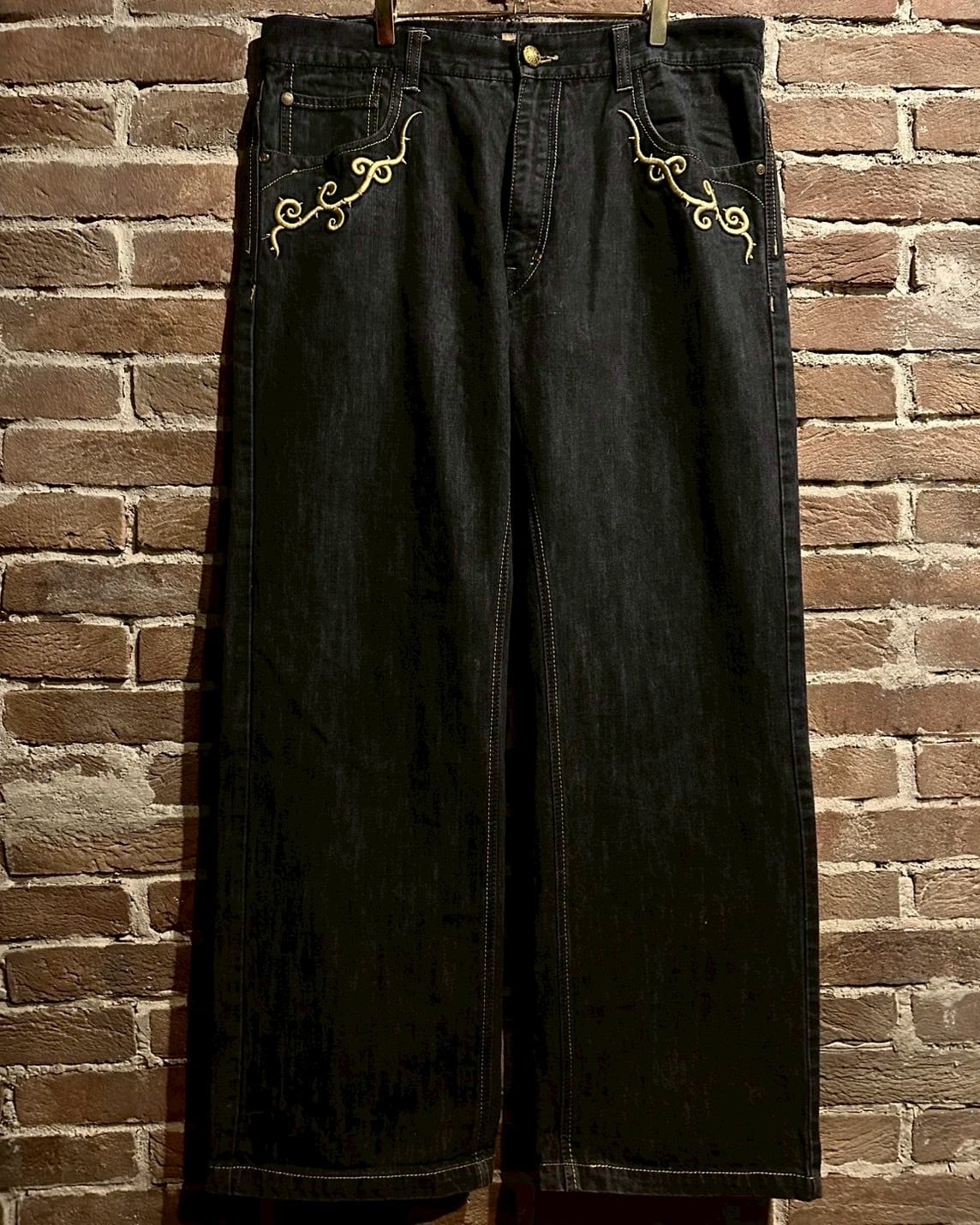 古着業界で稀少性が高まったブラックデニムのボディに、ボタニカル風の美しい刺繍を刻んだバギーパンツ。