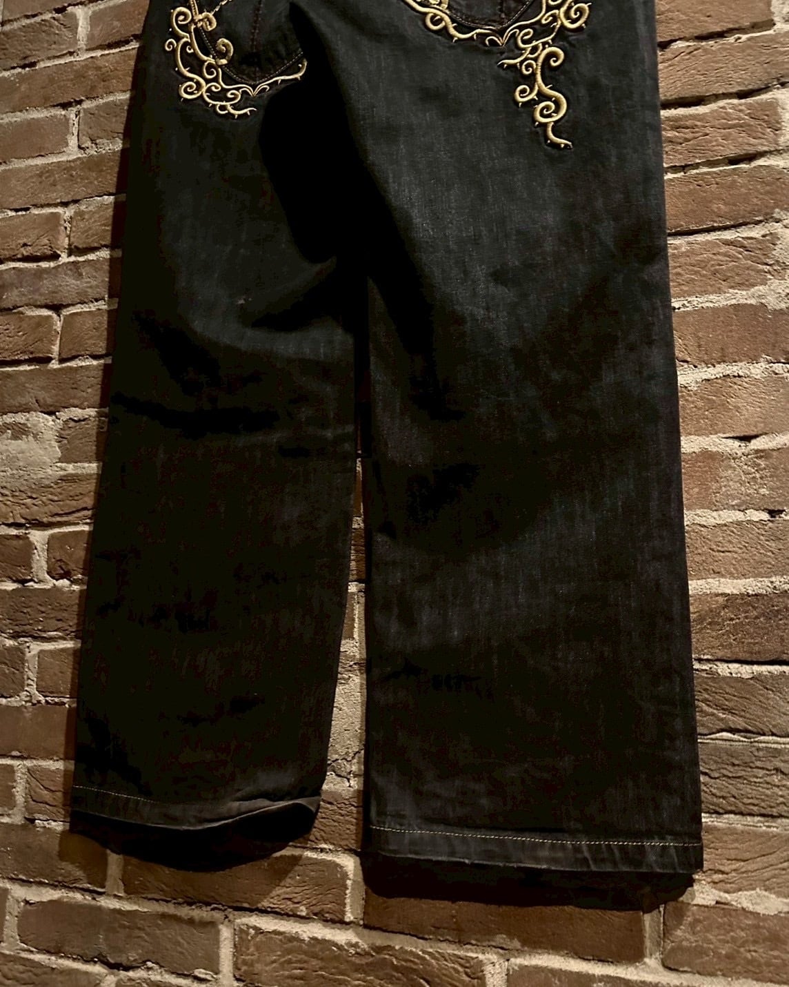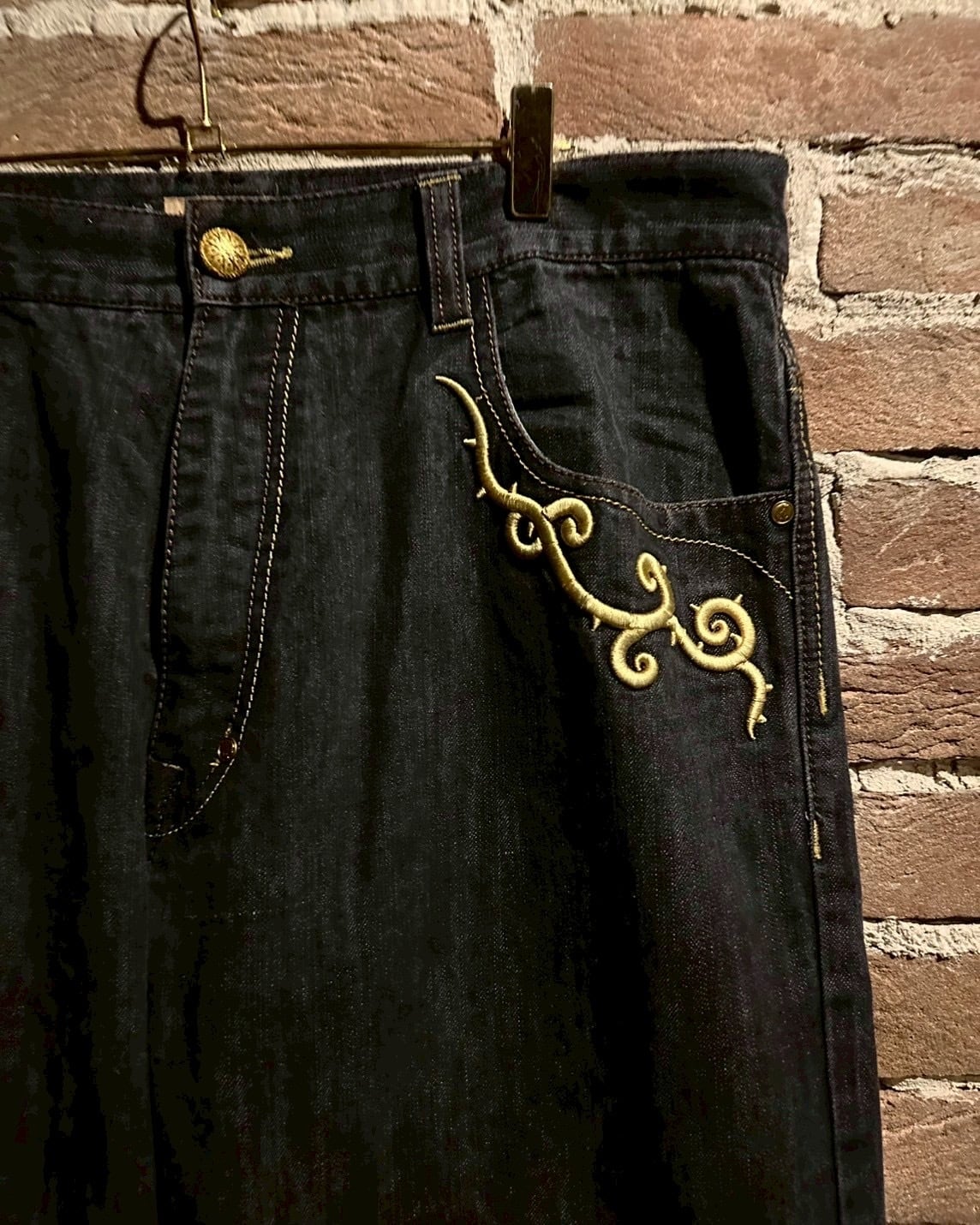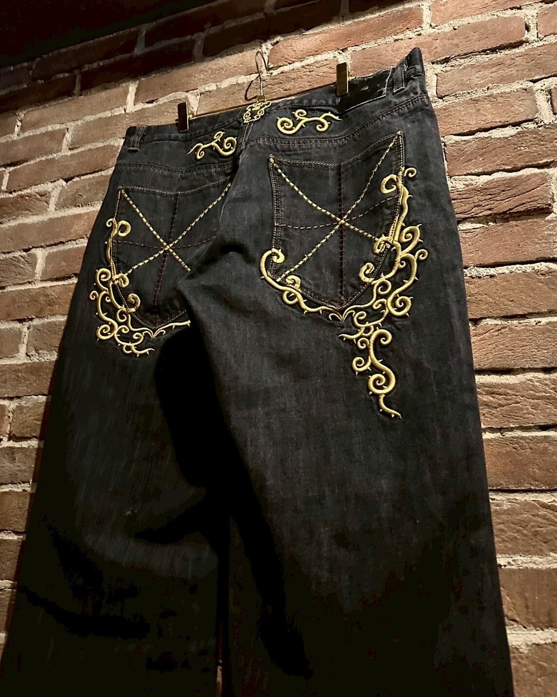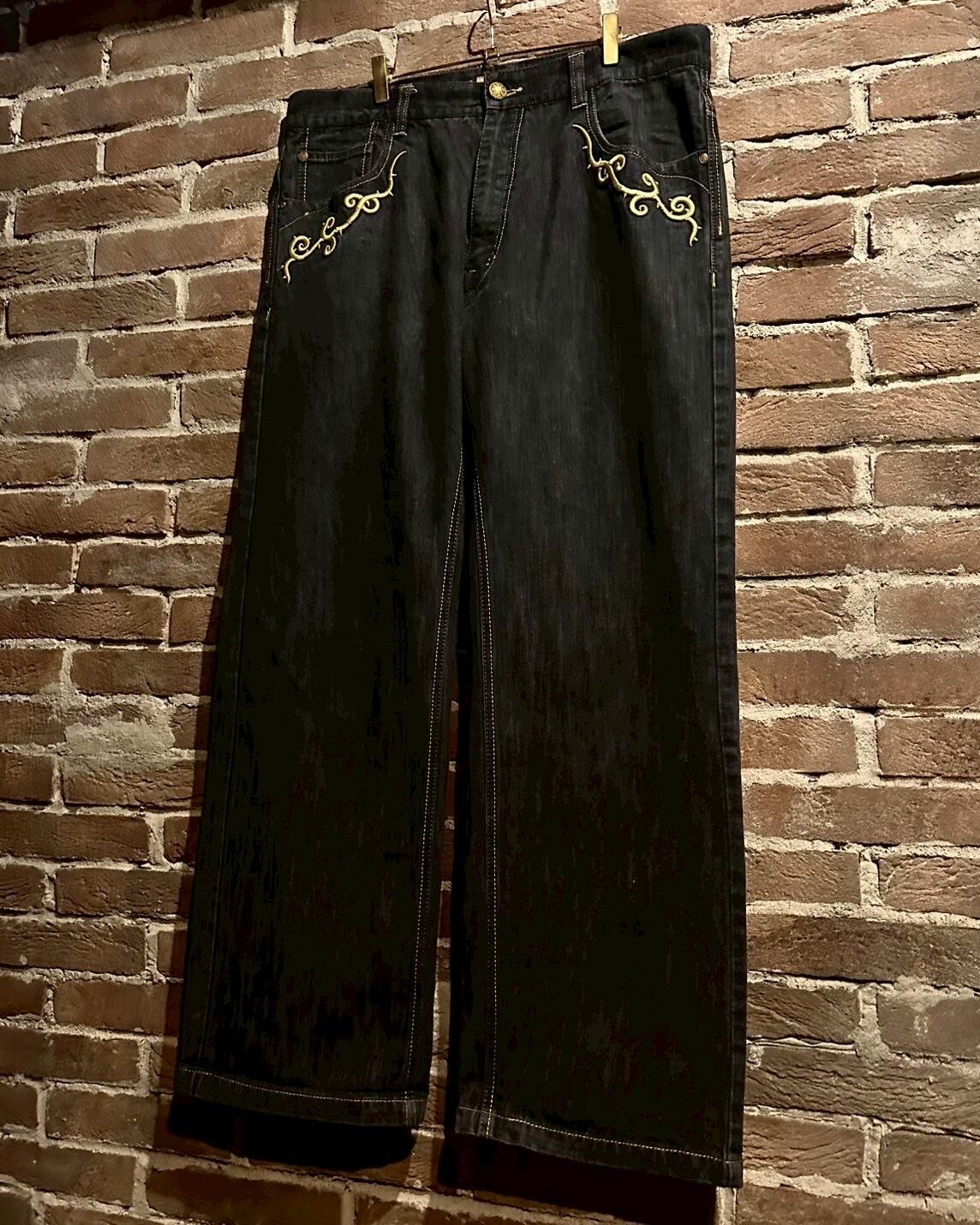 古着業界で稀少性が高まったブラックデニムのボディに、ボタニカル風の美しい刺繍を刻んだバギーパンツ。