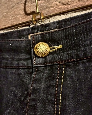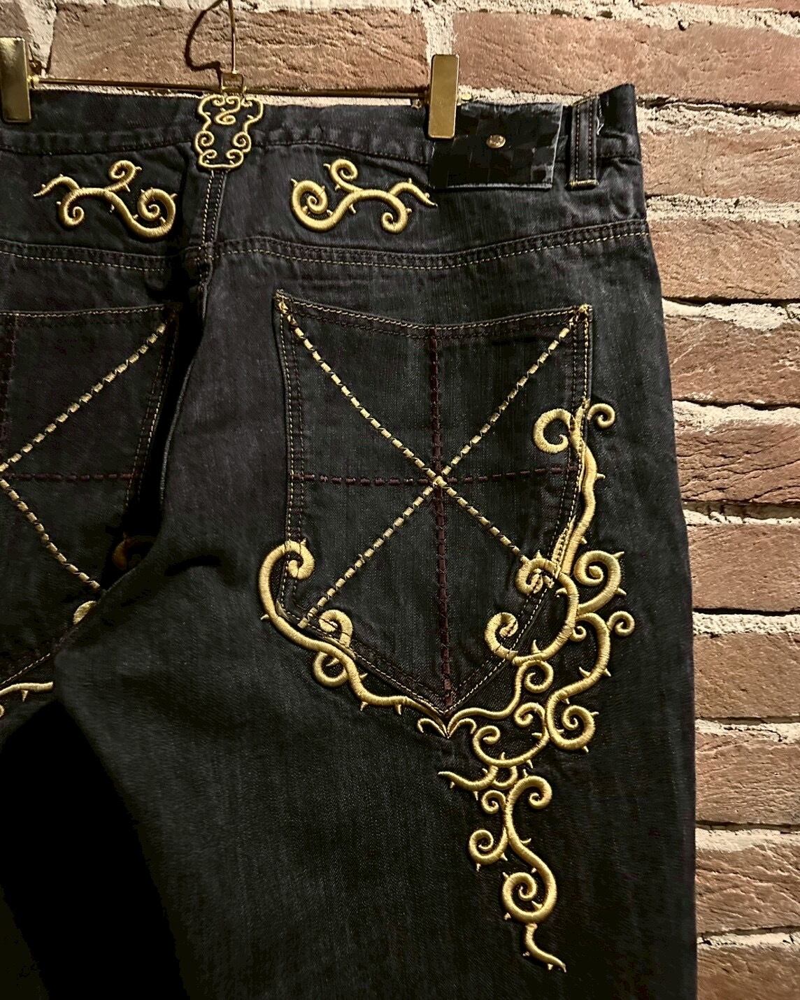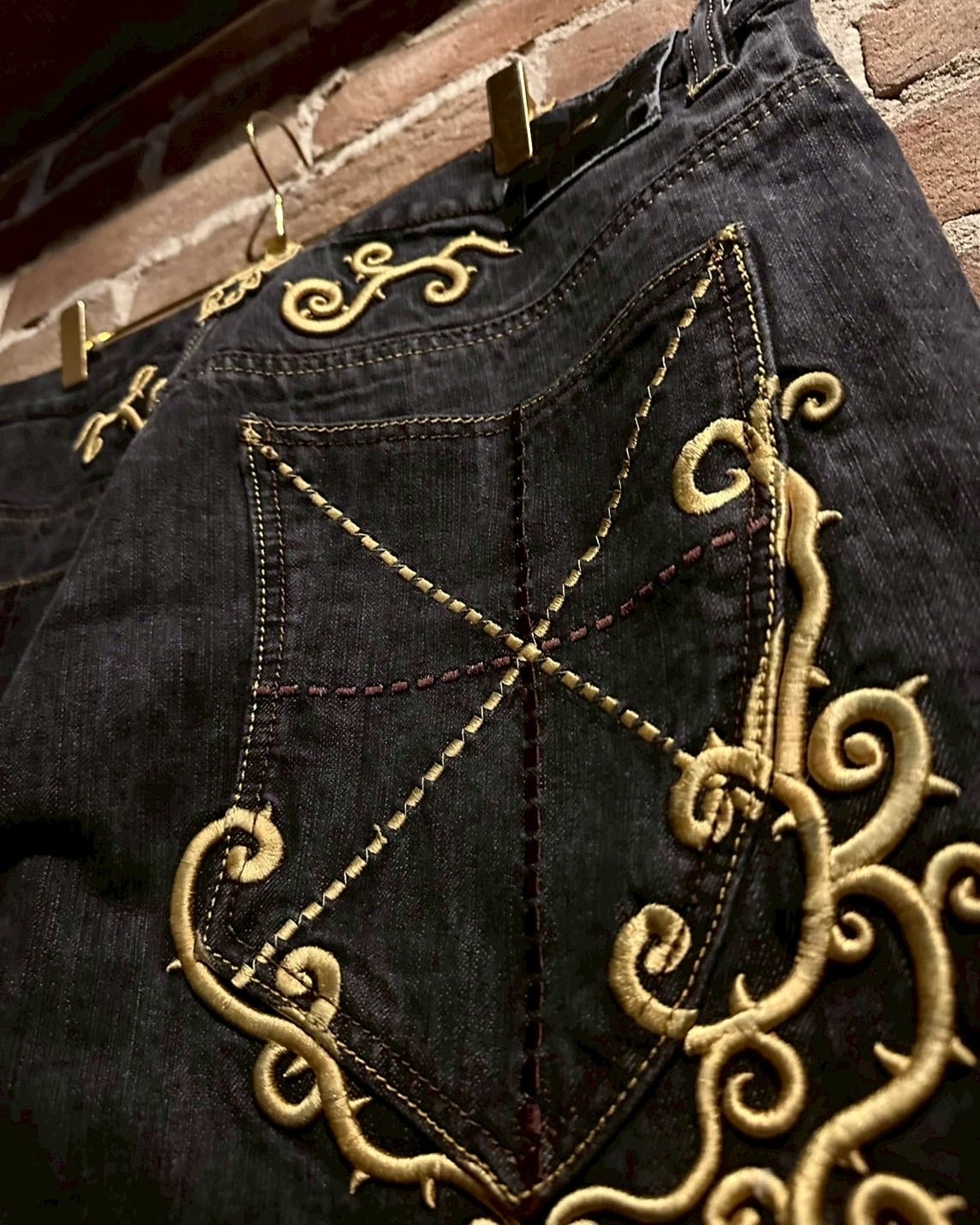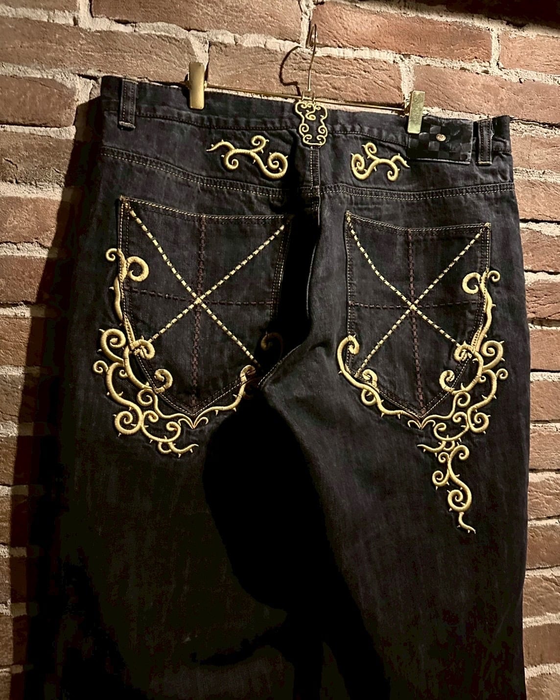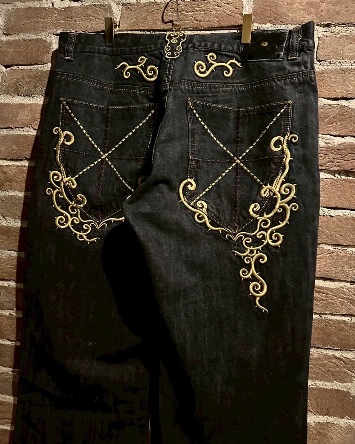 古着業界で稀少性が高まったブラックデニムのボディに、ボタニカル風の美しい刺繍を刻んだバギーパンツ。
