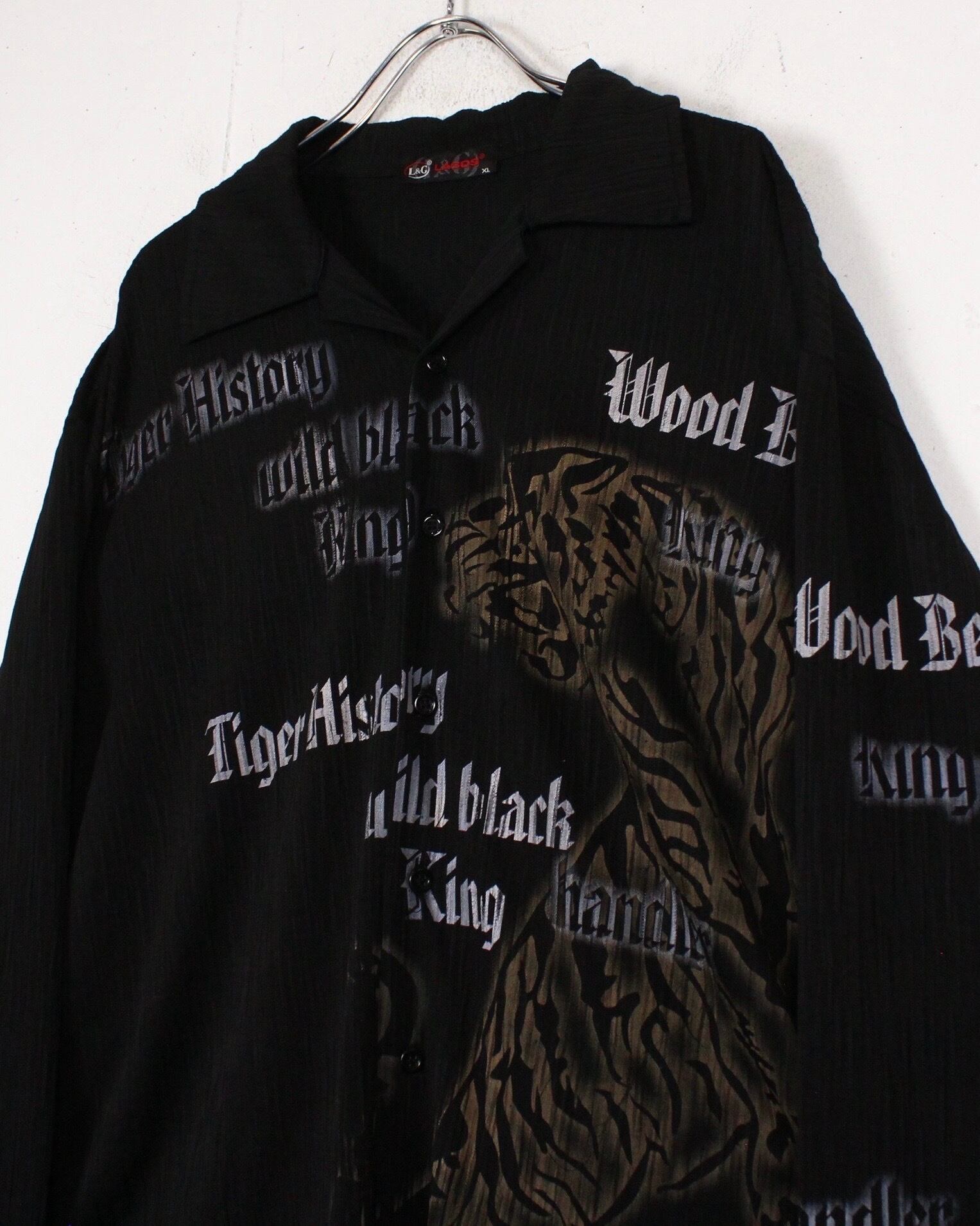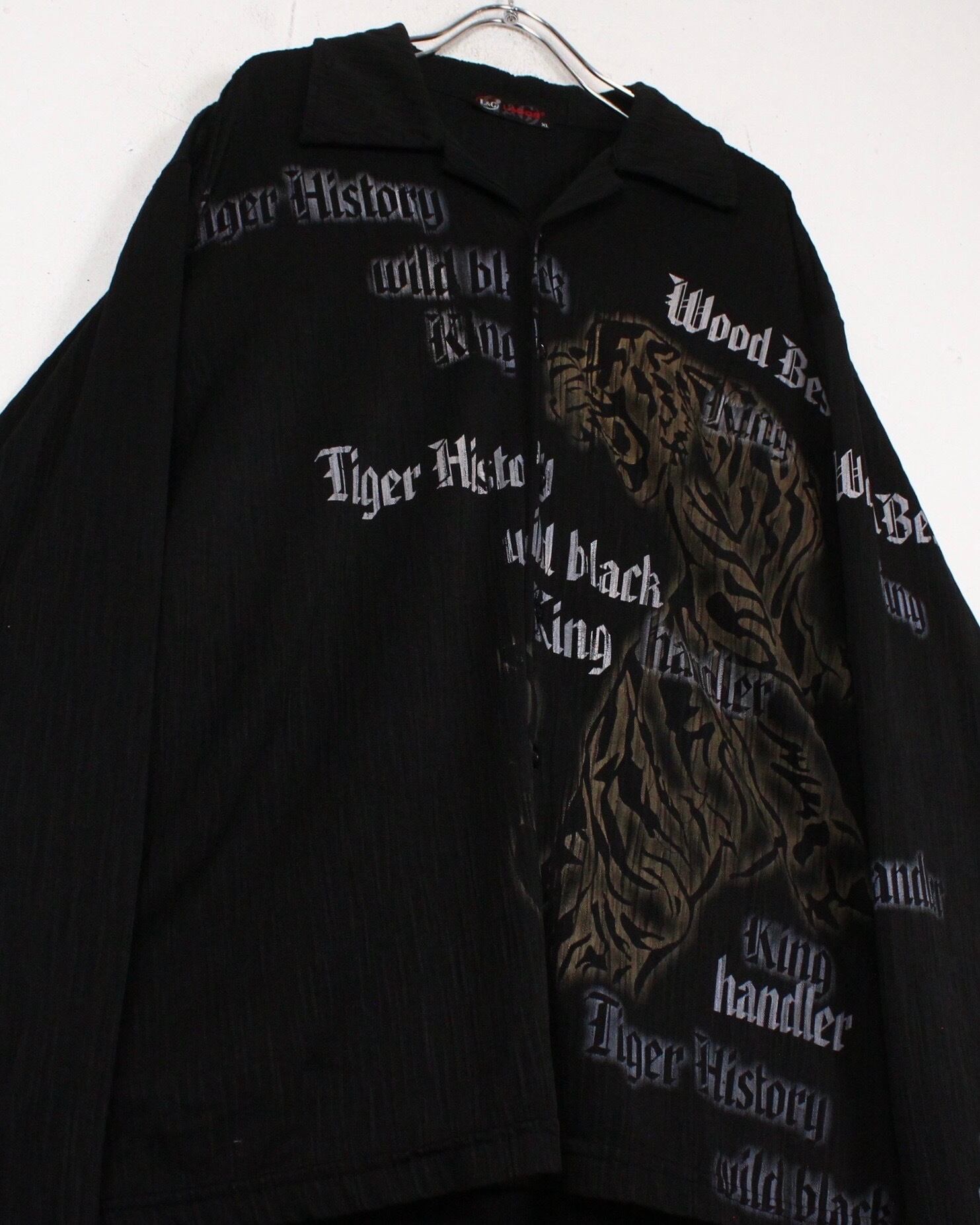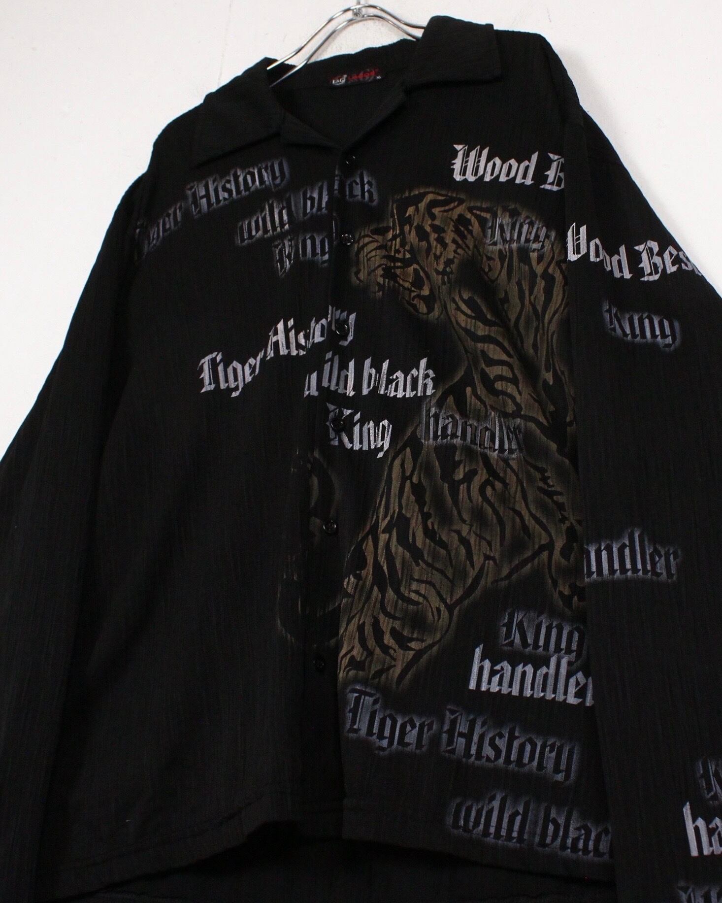 伸縮性のある軽やかな素材を用いたボディに、フロントに大ぶりで迫力のある虎をデザインした長袖オープンカラーシャツ。