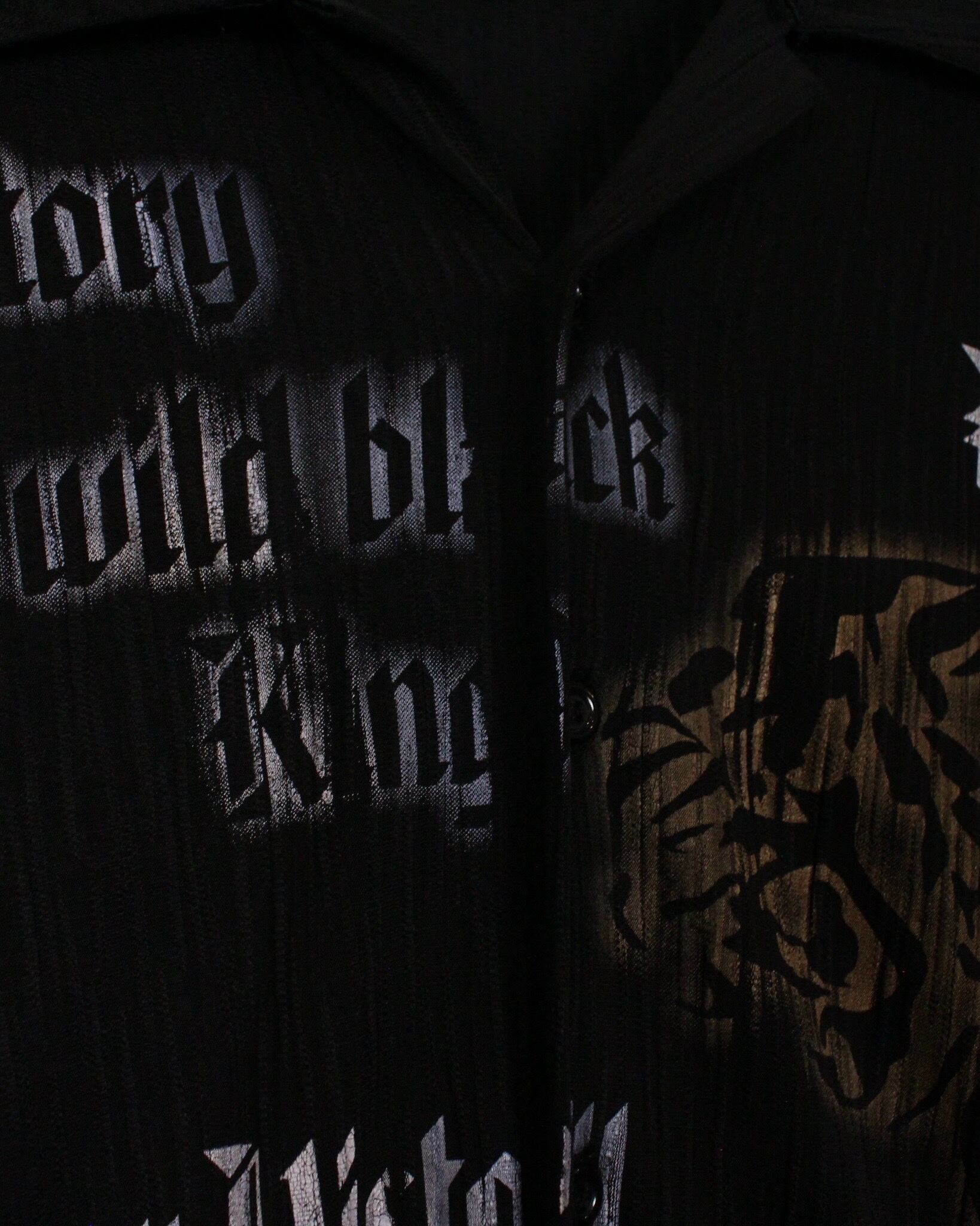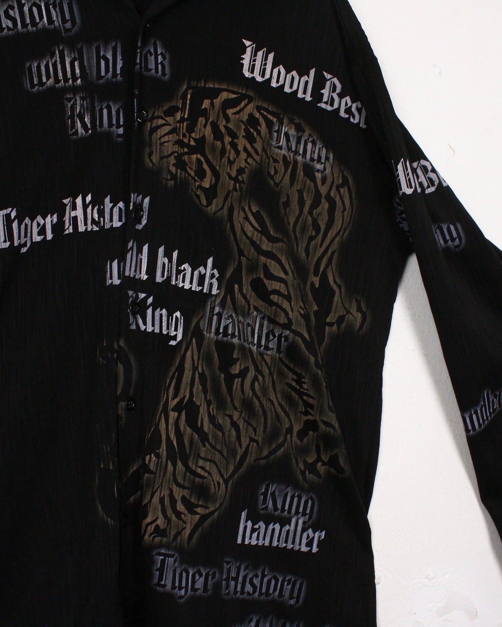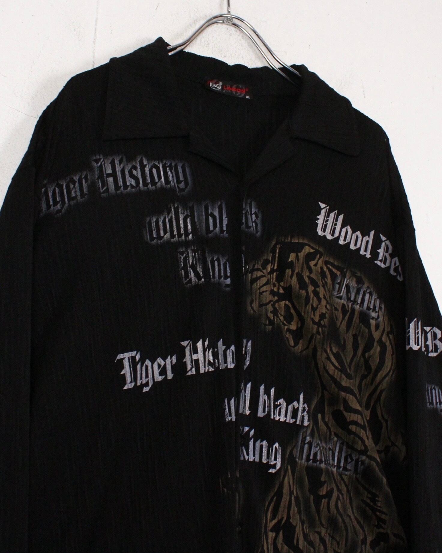 伸縮性のある軽やかな素材を用いたボディに、フロントに大ぶりで迫力のある虎をデザインした長袖オープンカラーシャツ。