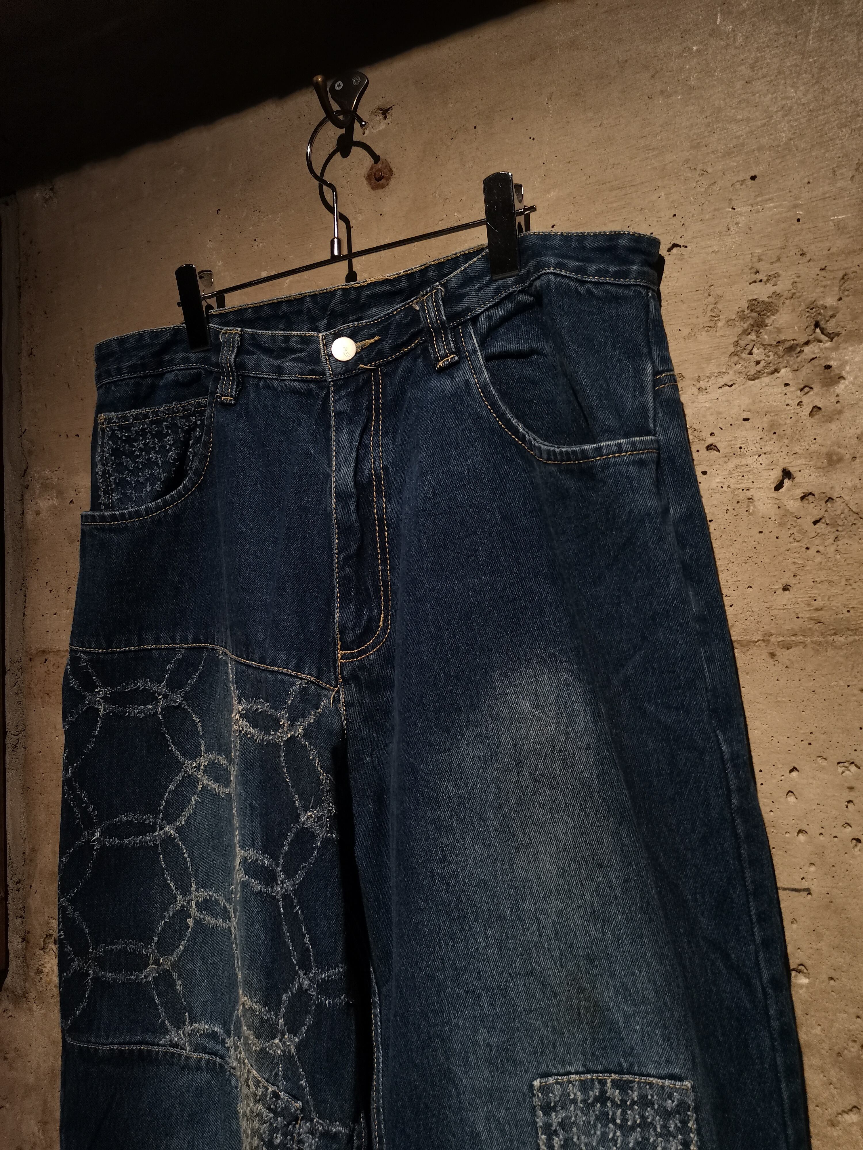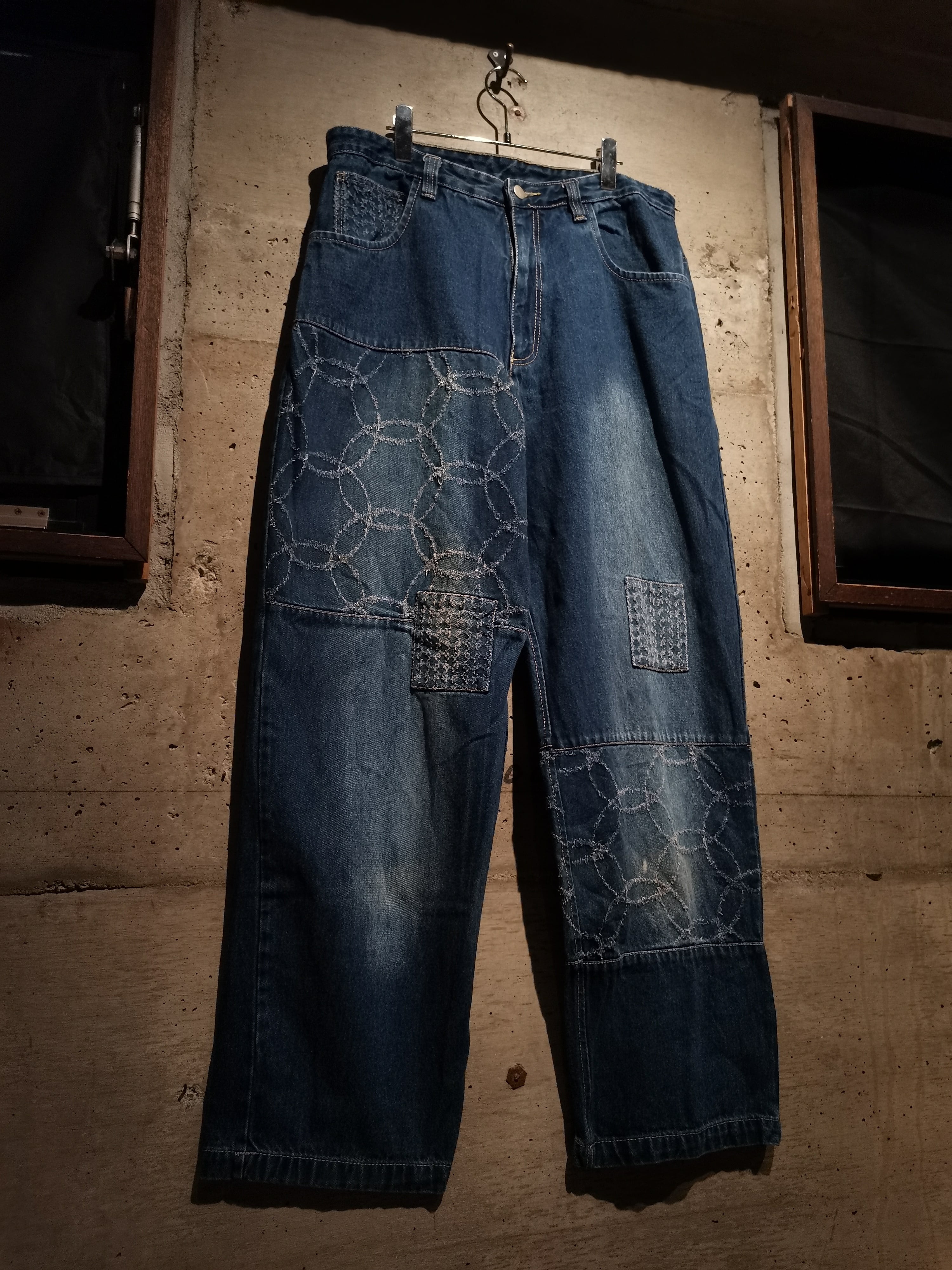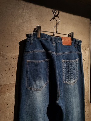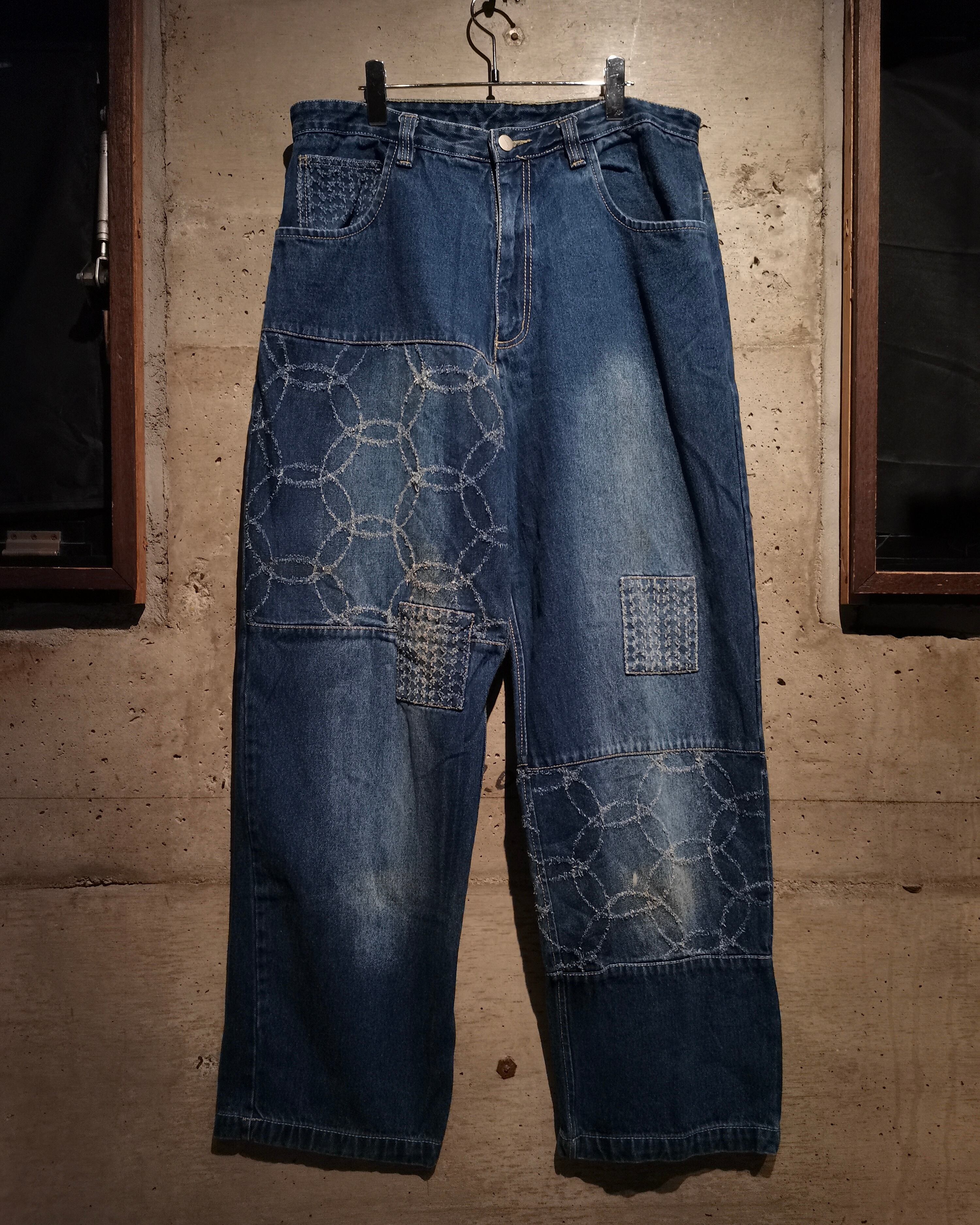 フロントにはパッチワーク風のデザイン、そしてコインポケット、左バックポケットにも上記同様にデザインが施された、立体感のあるルックスがストリートにバッチリハマってくれます。