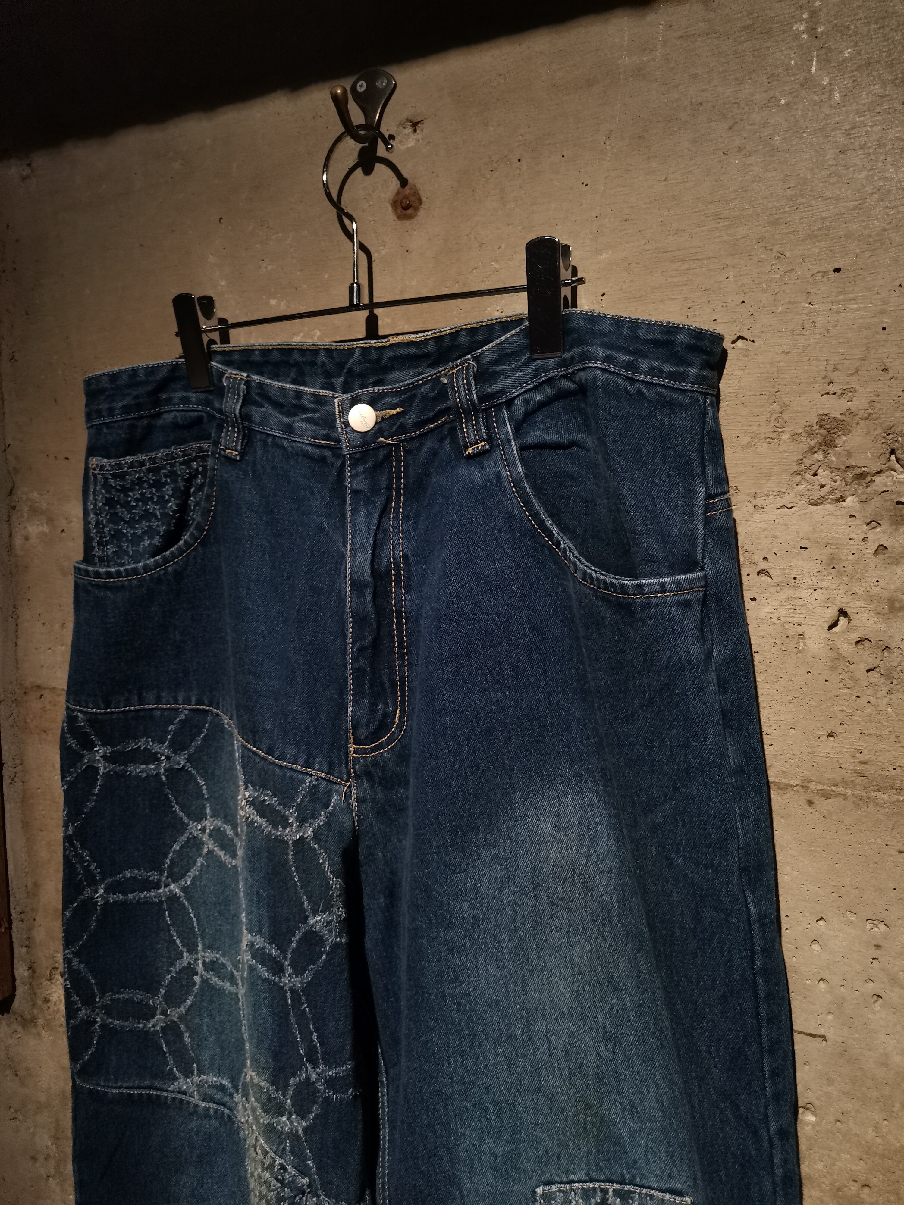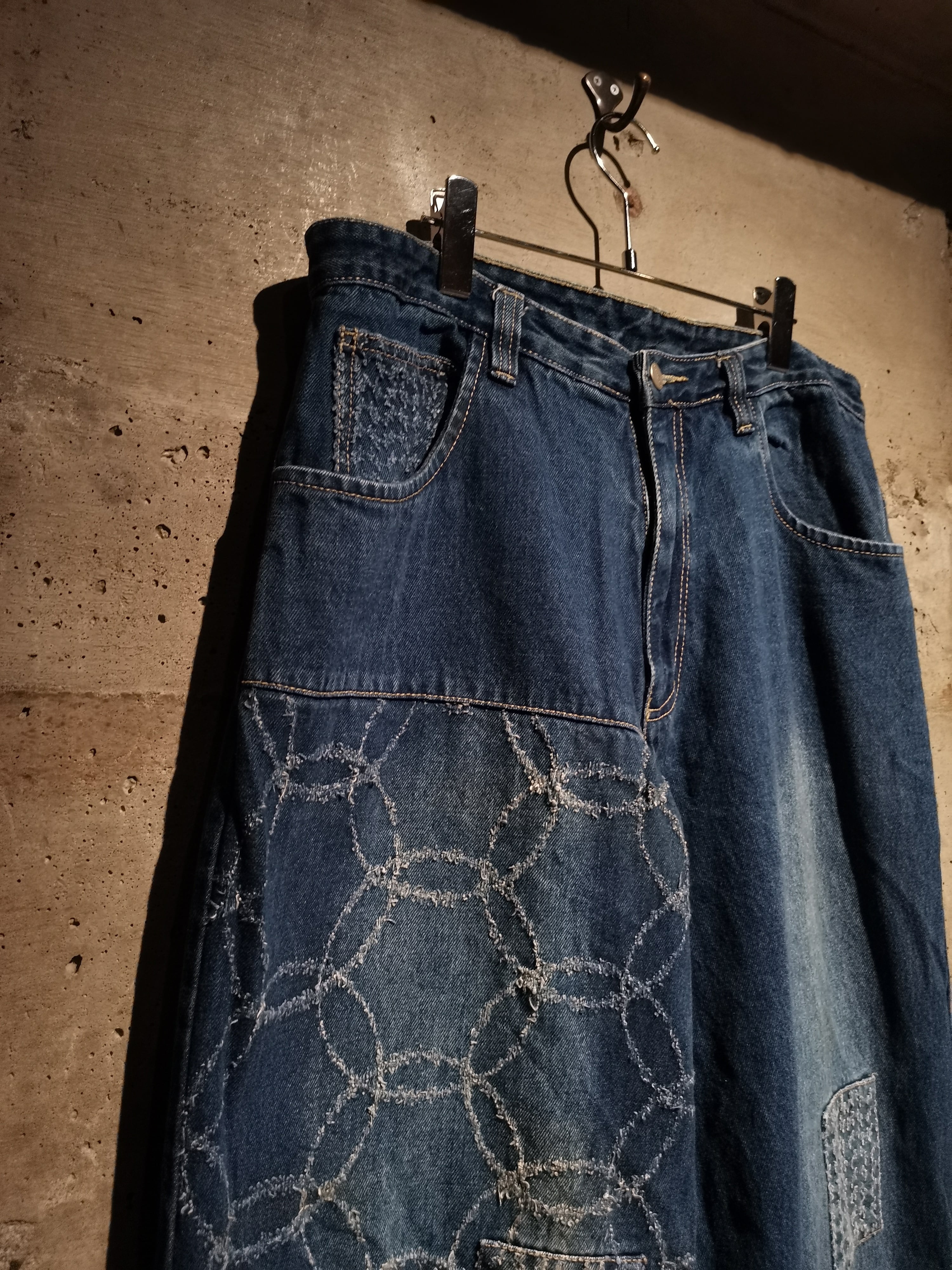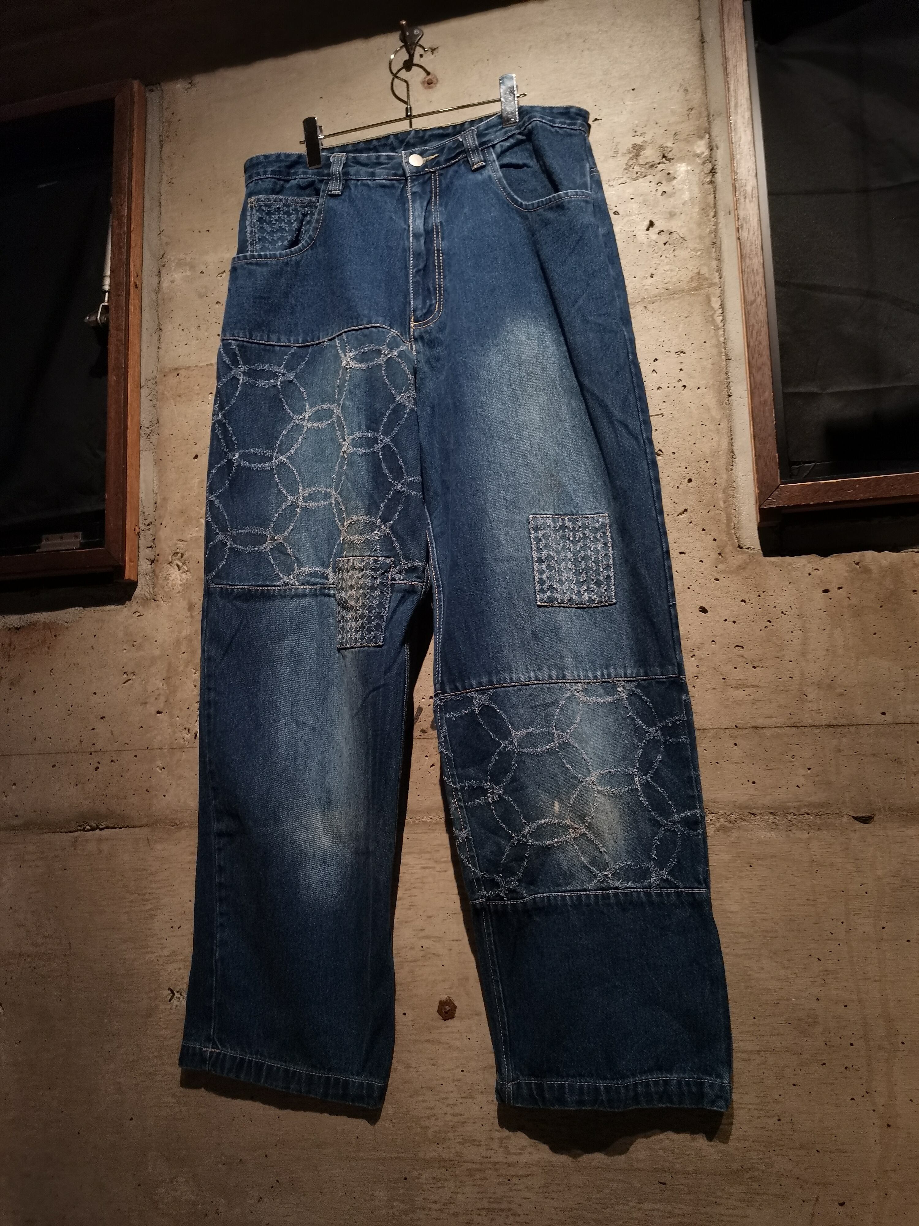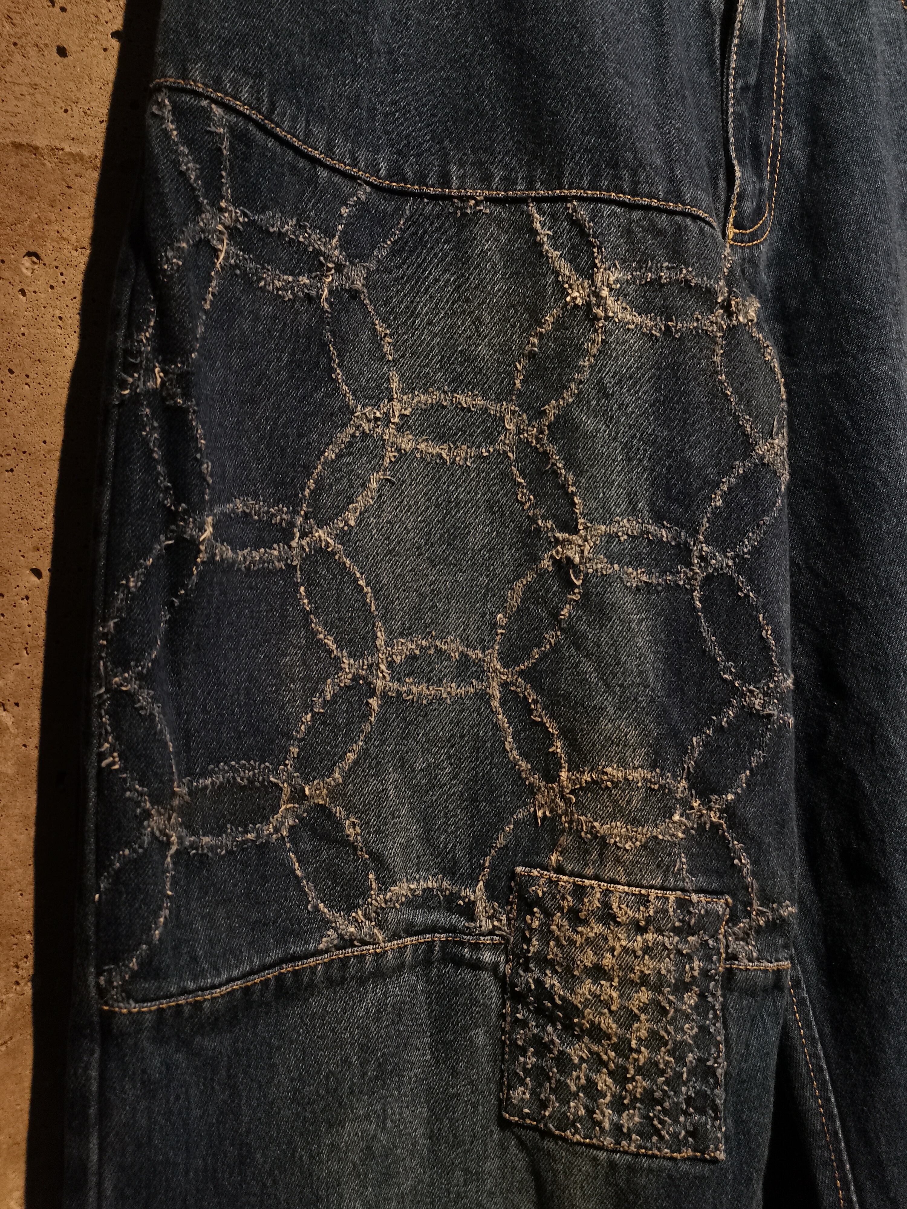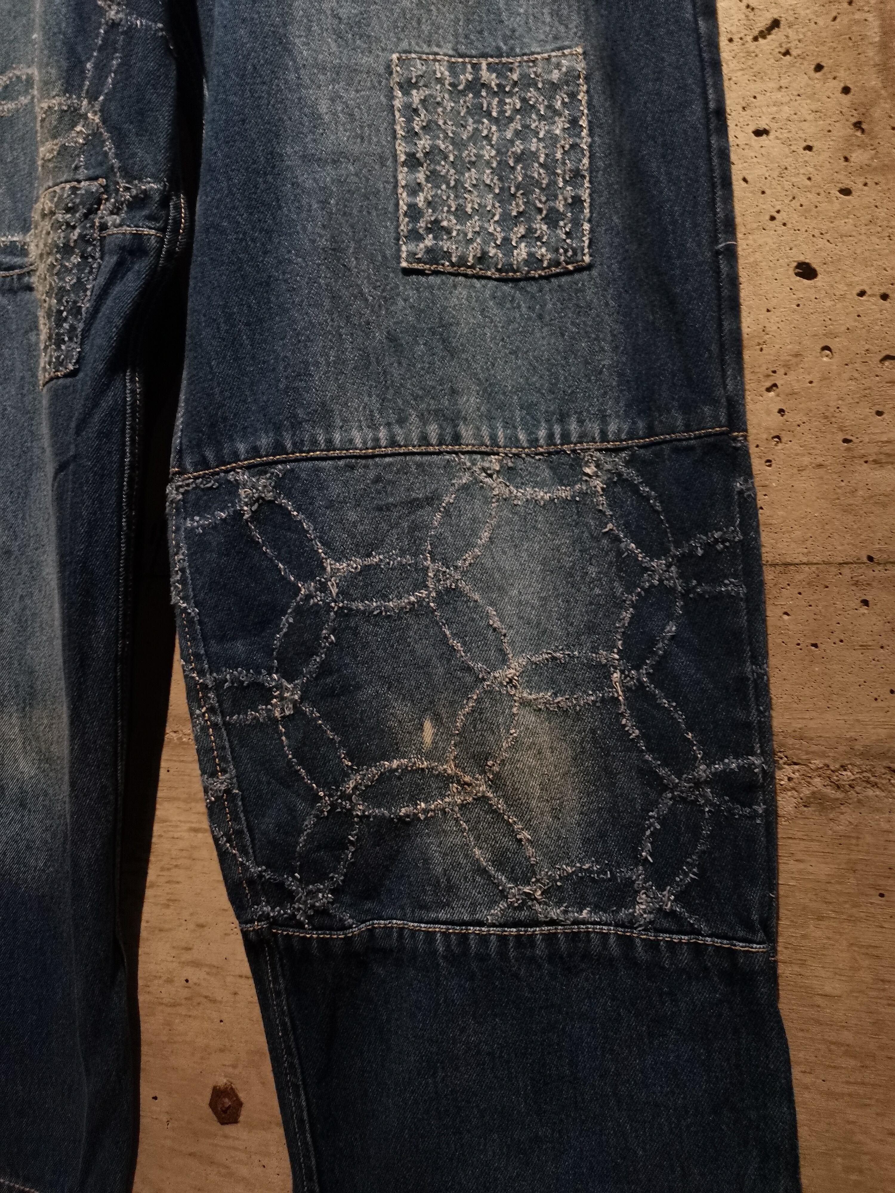 フェード感の良いインディゴブルーのボディに生地を切り替え、ダメージによって円状のデザインを施した1着。