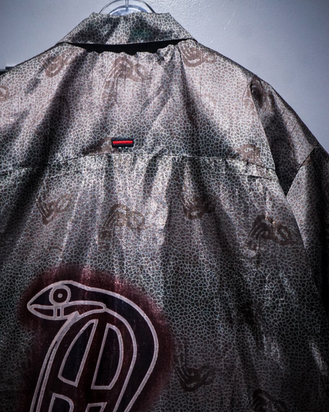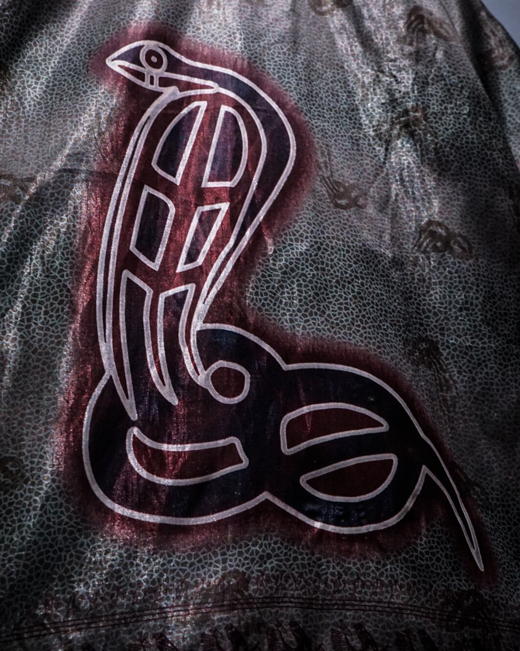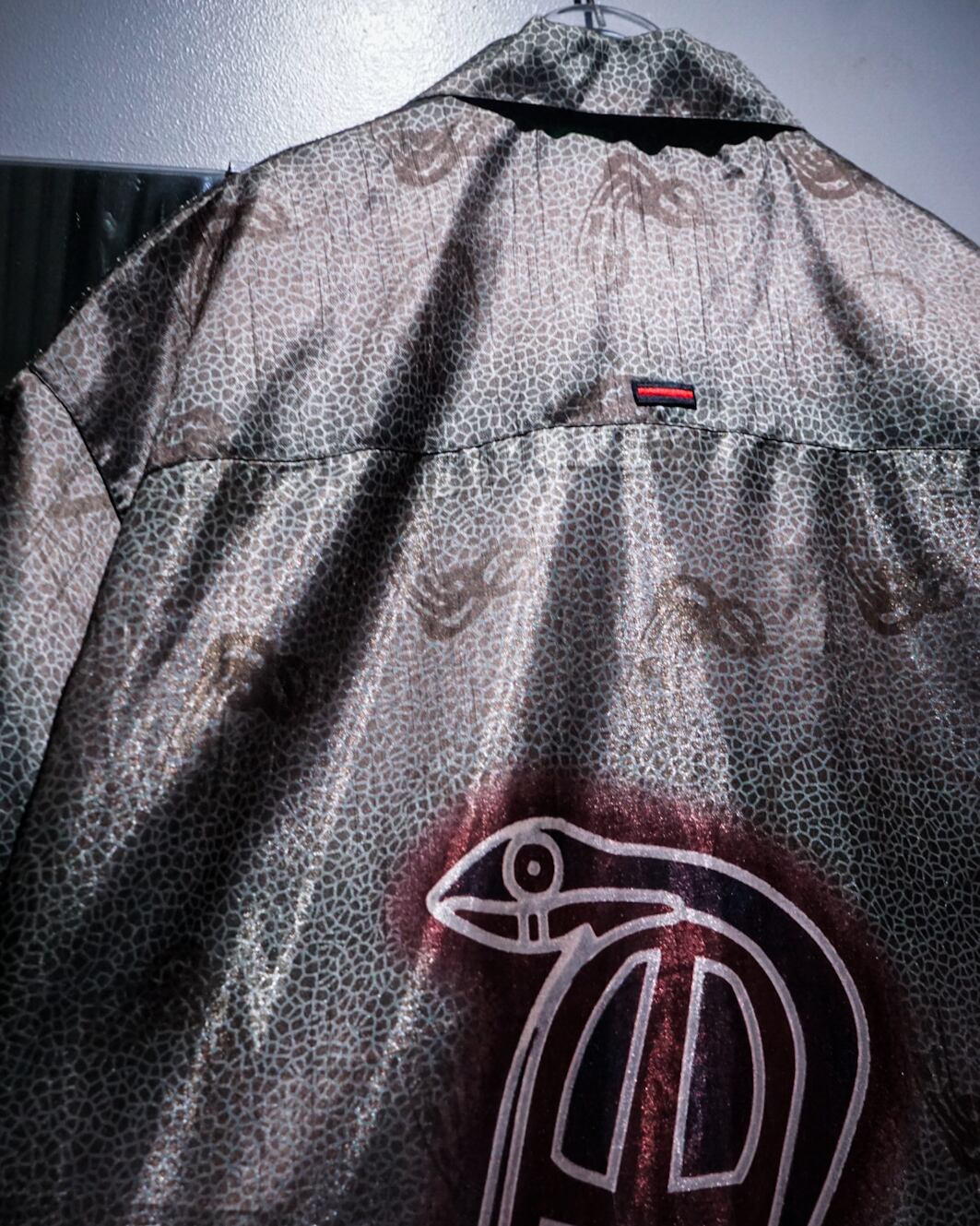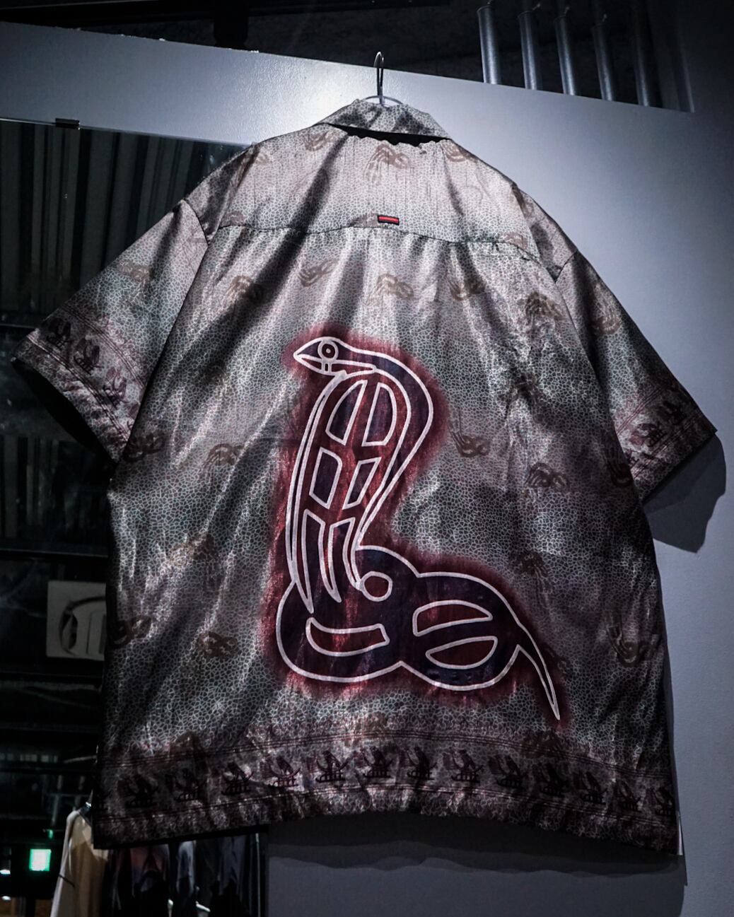ハリのある滑らかなボディに、グラデーションがかったパイソン風の柄模様、コブラのデザインを載せた半袖オープンカラーシャツ。