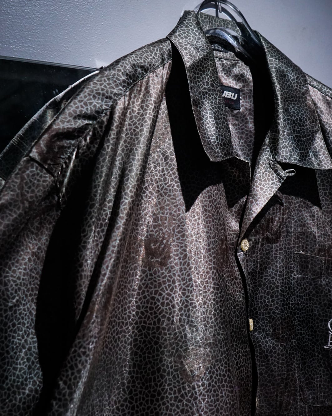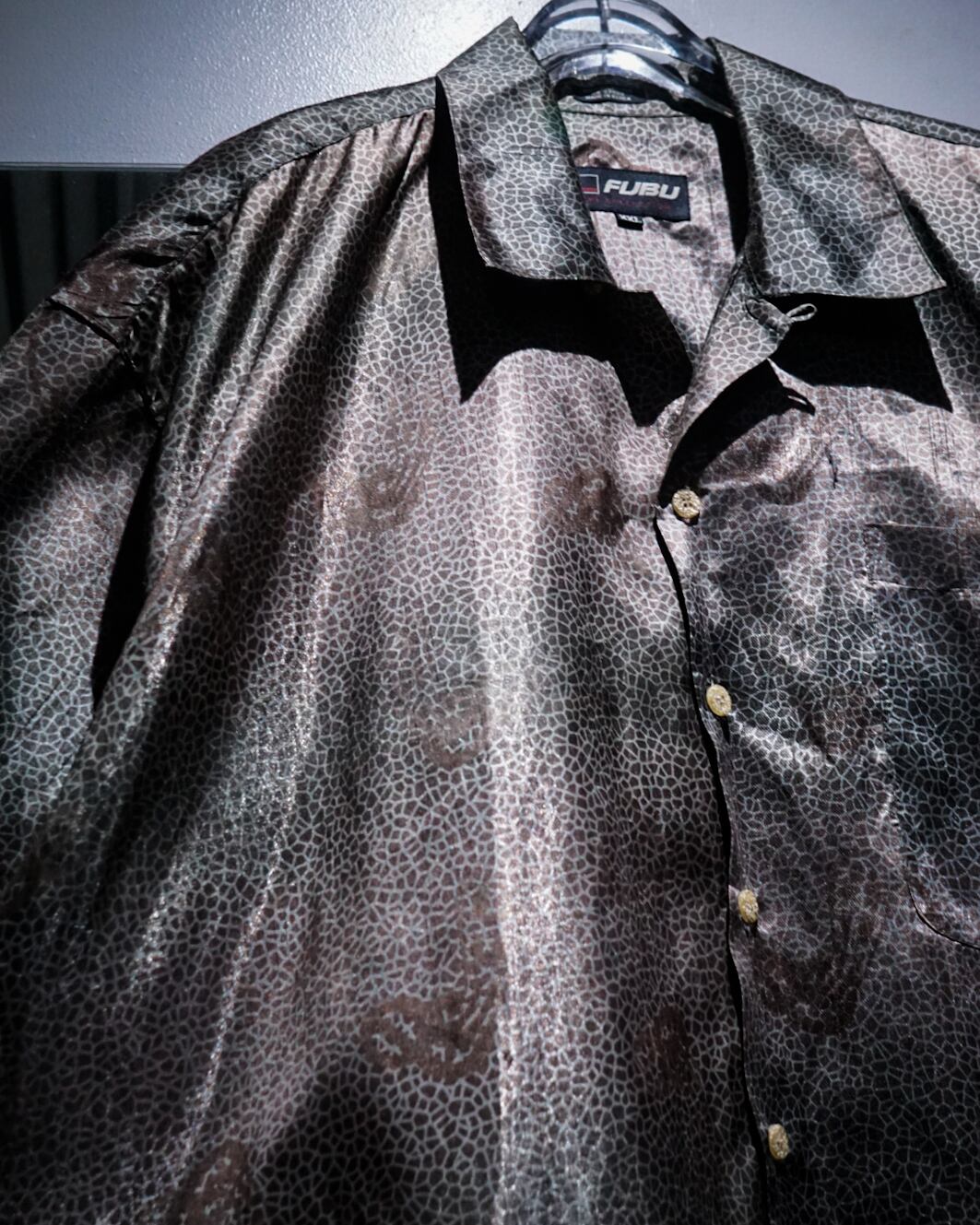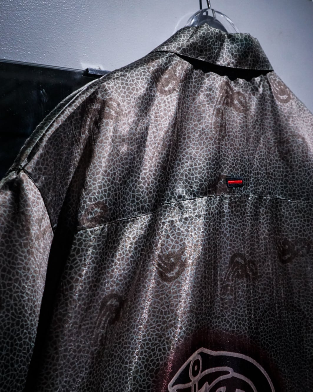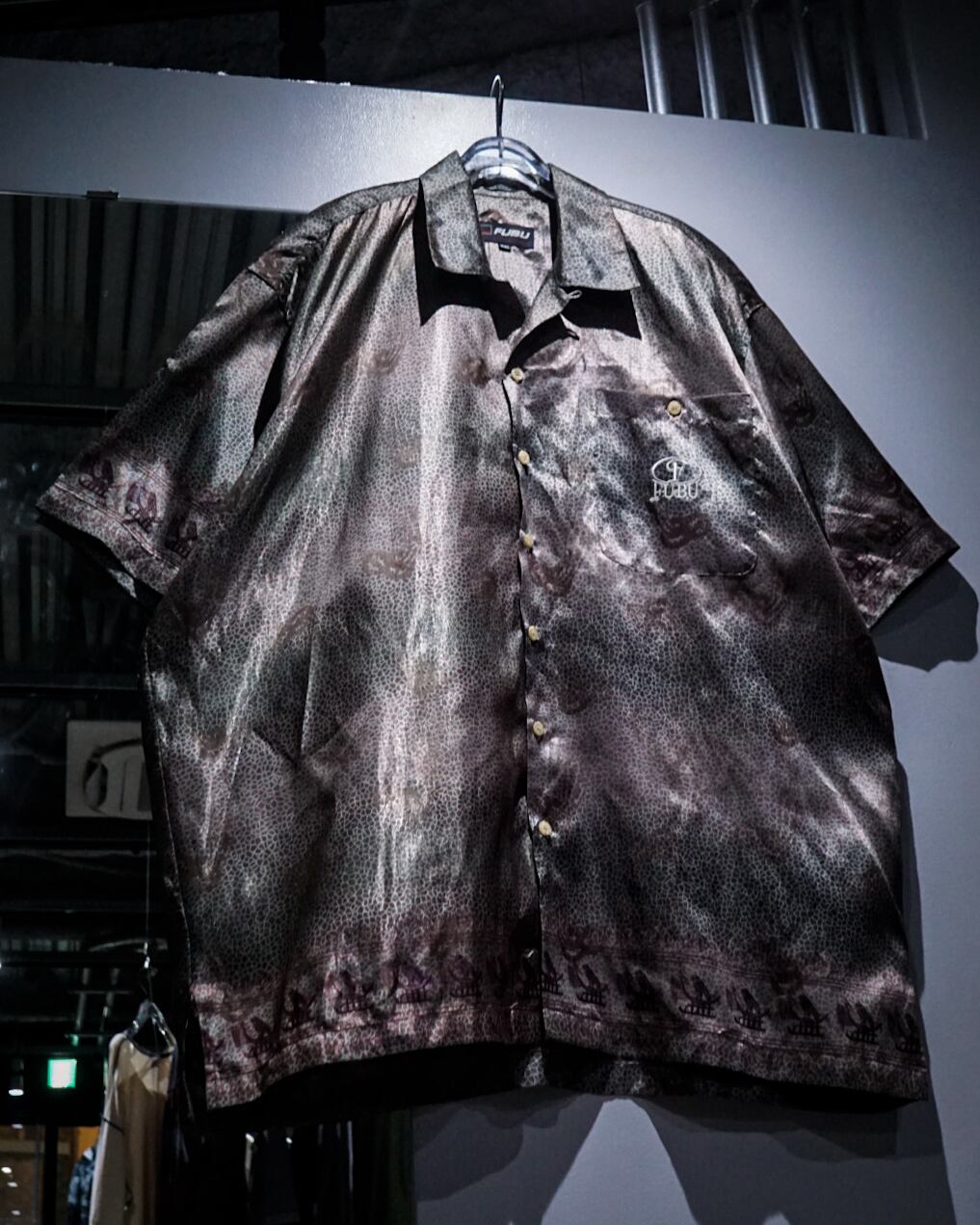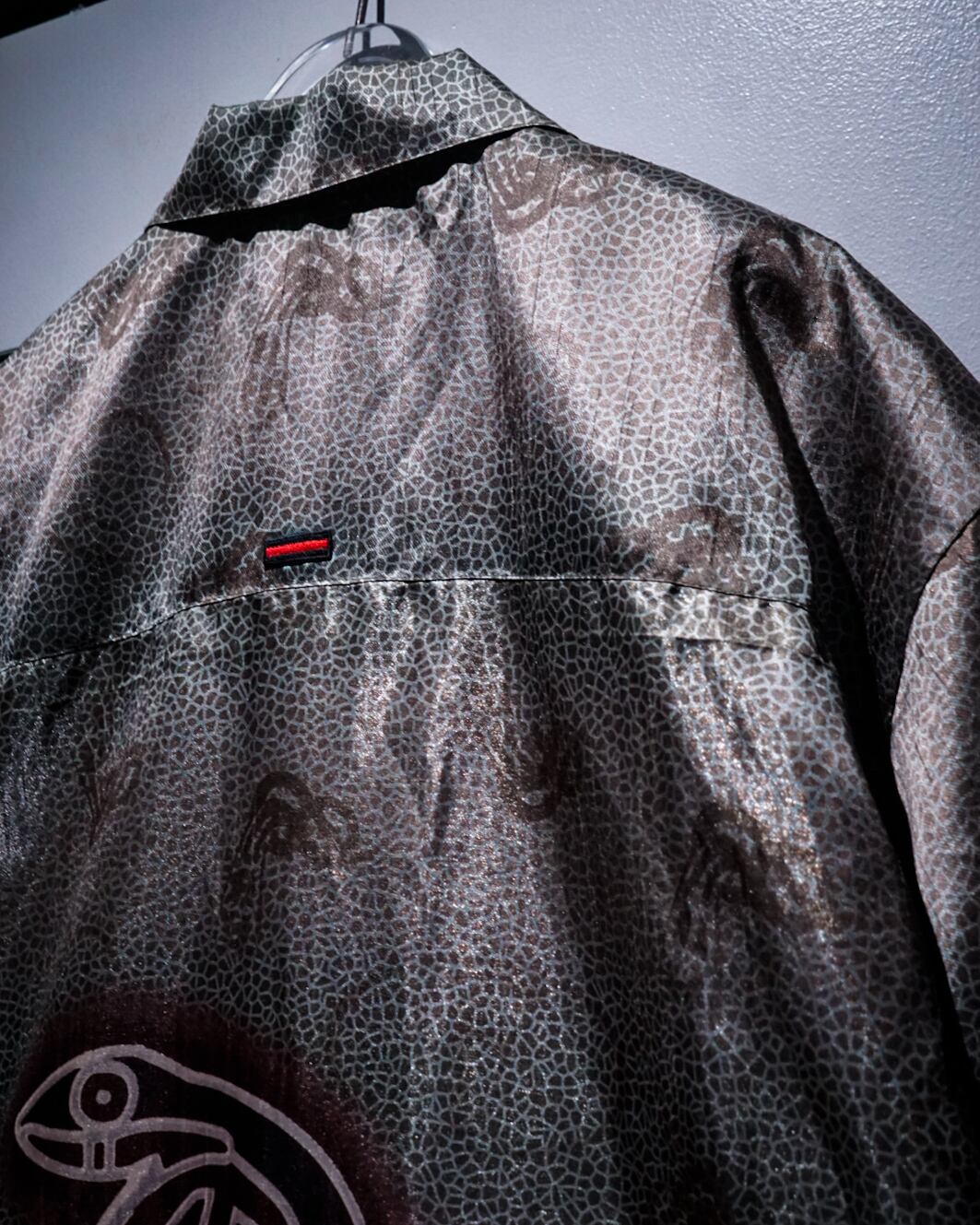 ハリのある滑らかなボディに、グラデーションがかったパイソン風の柄模様、コブラのデザインを載せた半袖オープンカラーシャツ。