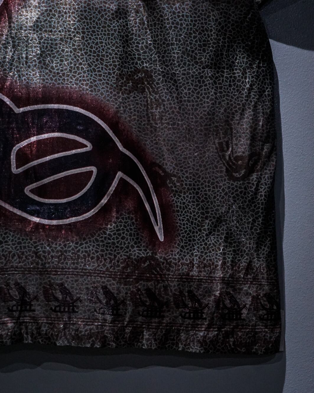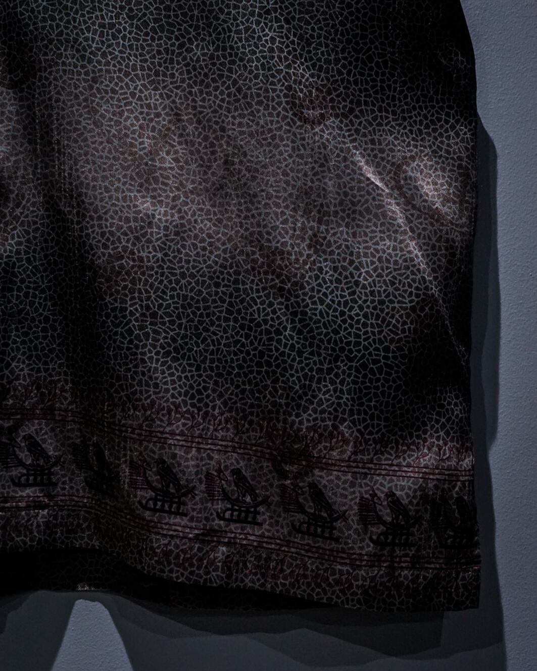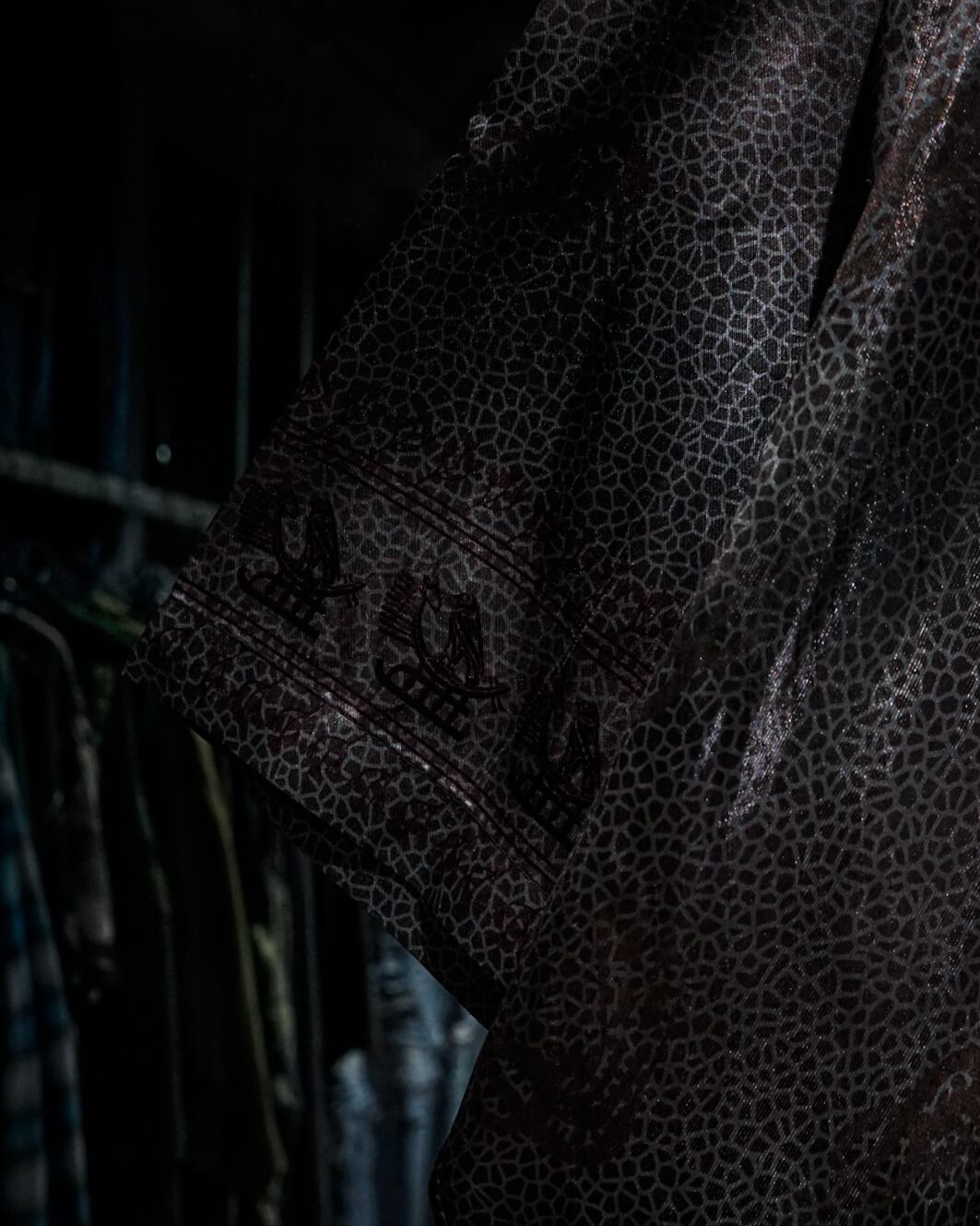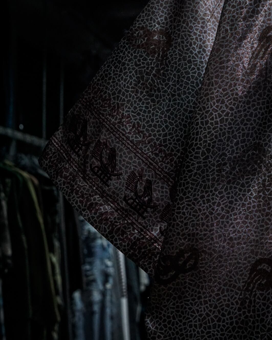 ハリのある滑らかなボディに、グラデーションがかったパイソン風の柄模様、コブラのデザインを載せた半袖オープンカラーシャツ。