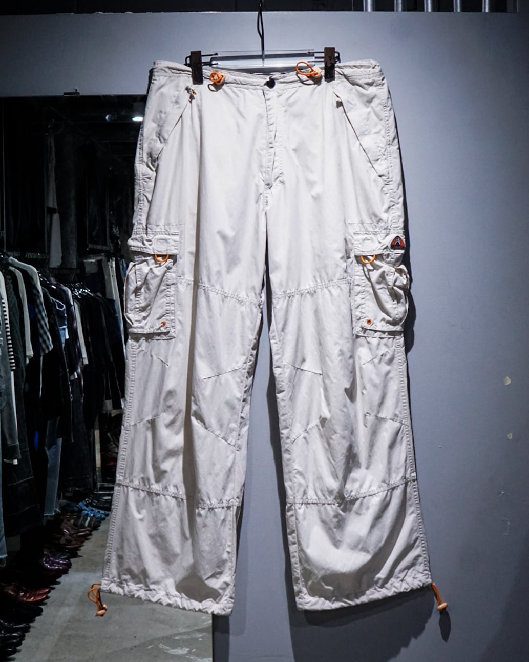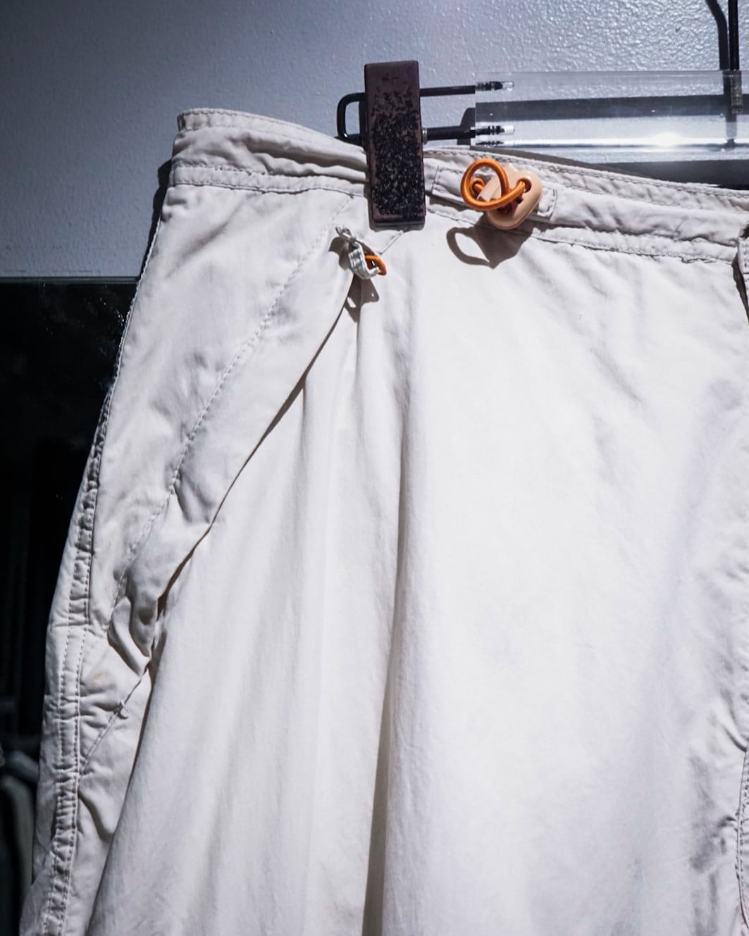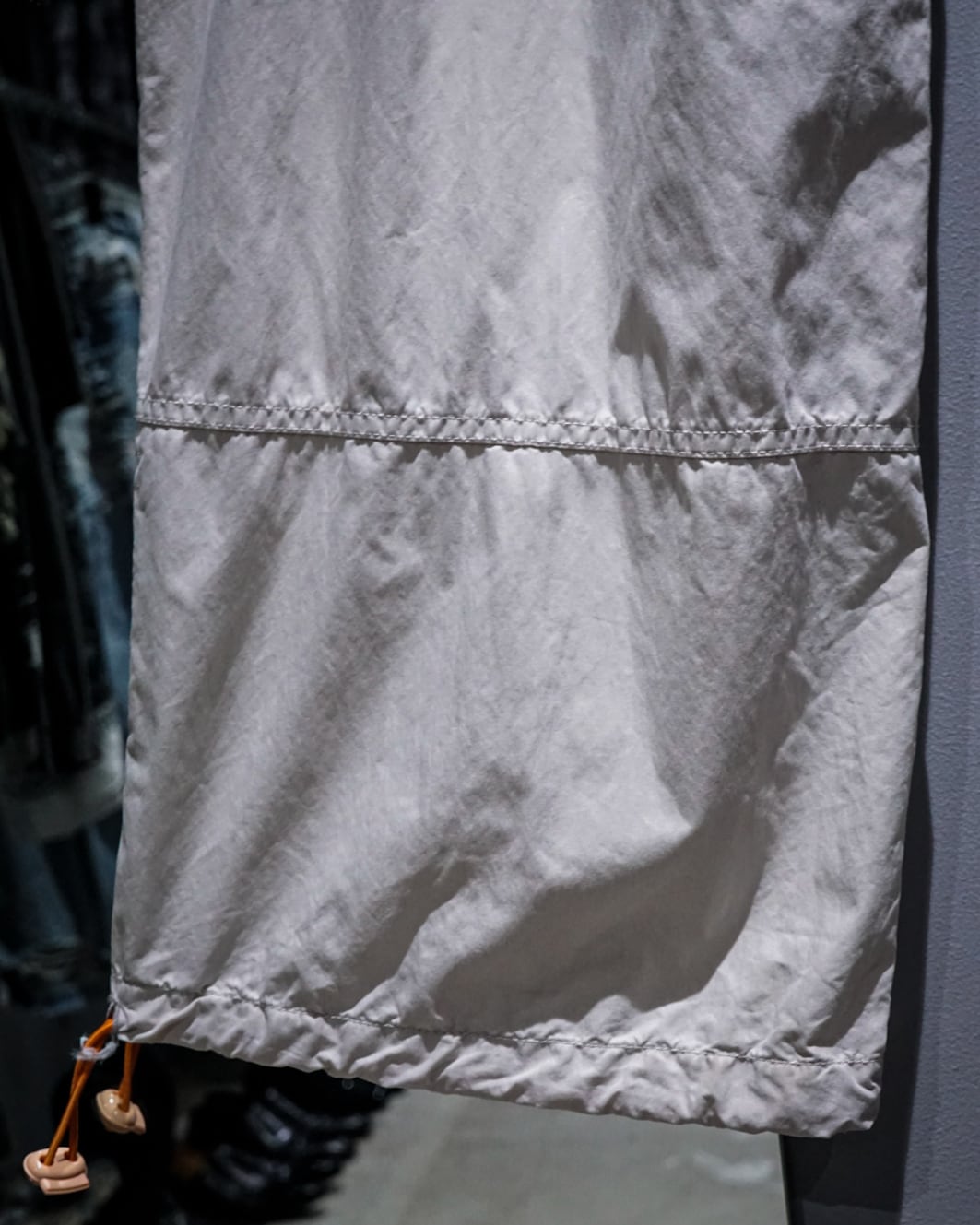 カーゴパンツでは稀少な、裾にかけて下に綺麗にストンと落ちるストレートシルエットで、カルチャーも感じられ、様々なスタイルにハマる汎用性も魅力的。ありそうで意外と見つからないんですよね、、、付属しているドローコードでウエストをギュッと絞って生まれるシルエットがめちゃくちゃ良いんです。