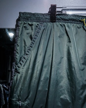 ハリのあるナイロンを用いたボディに、ボディサイドにリフレクターのラインを載せたナイロンパンツ。