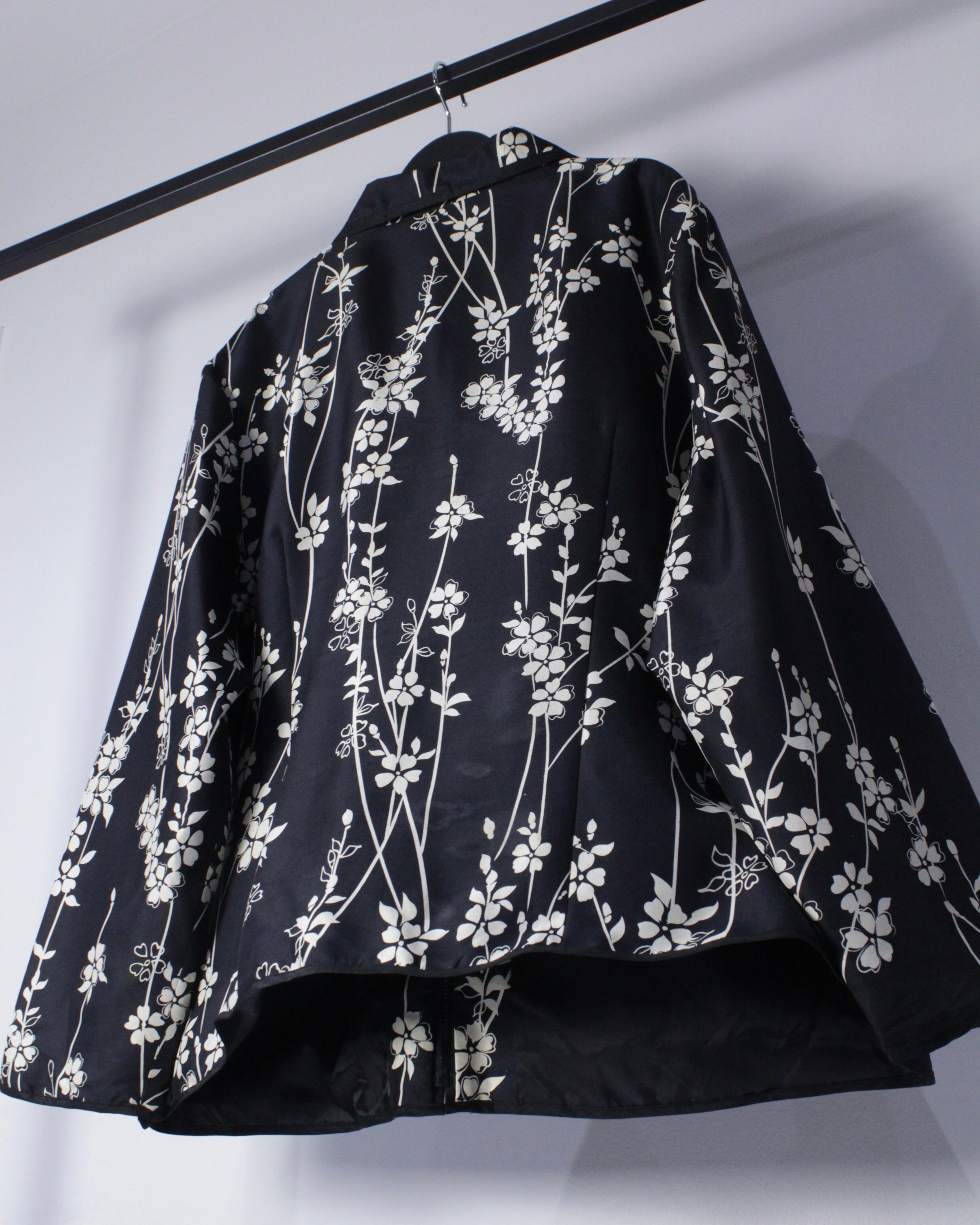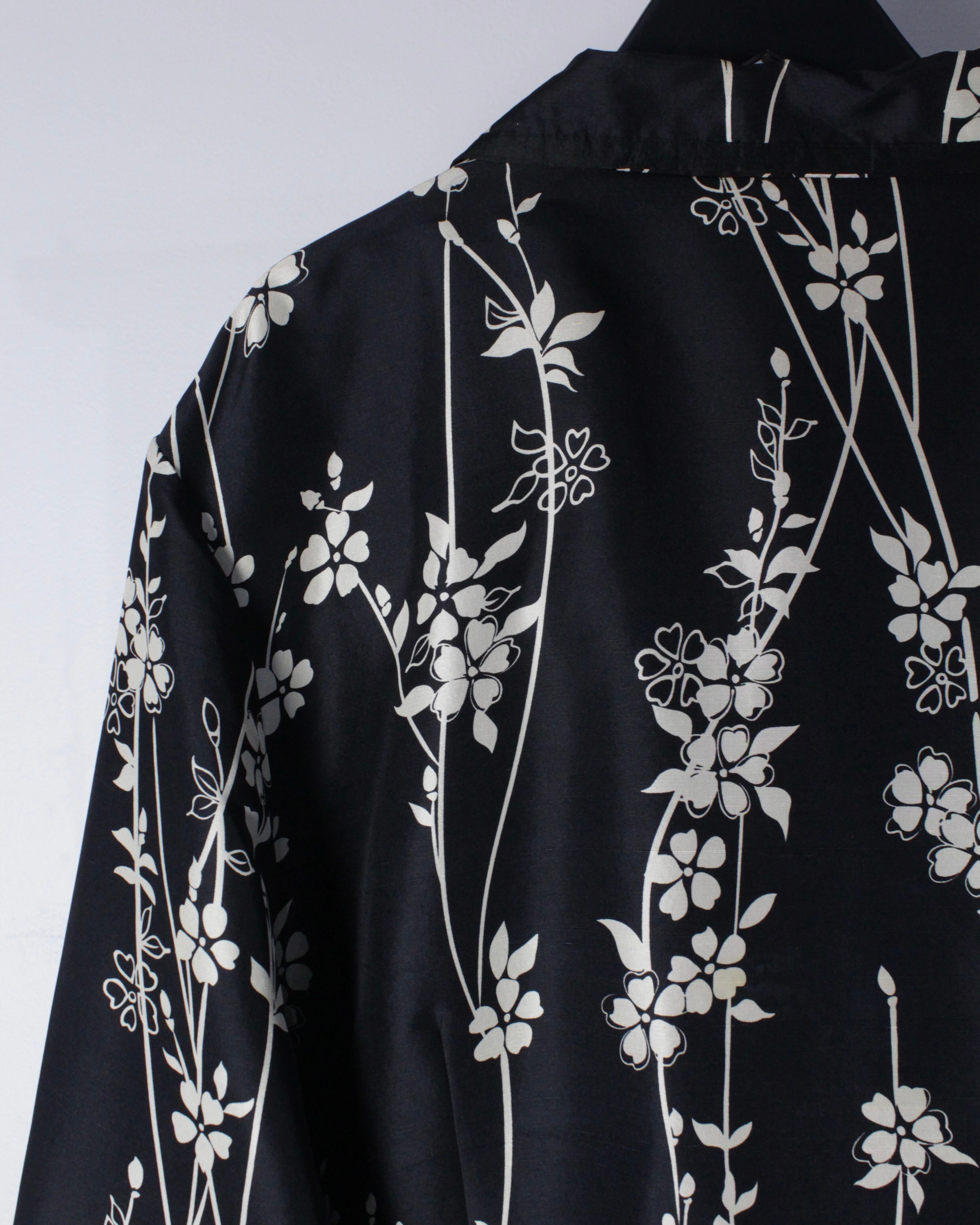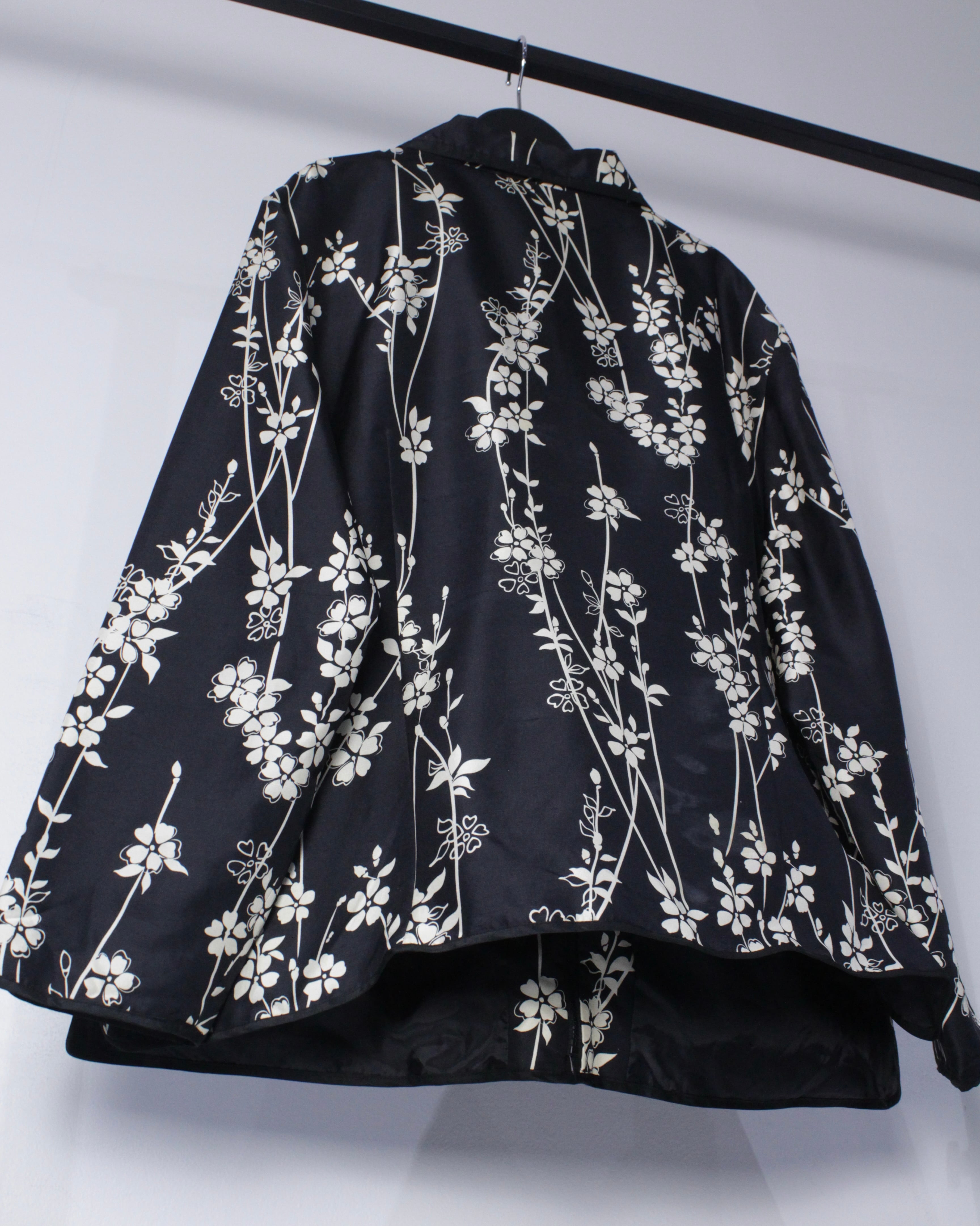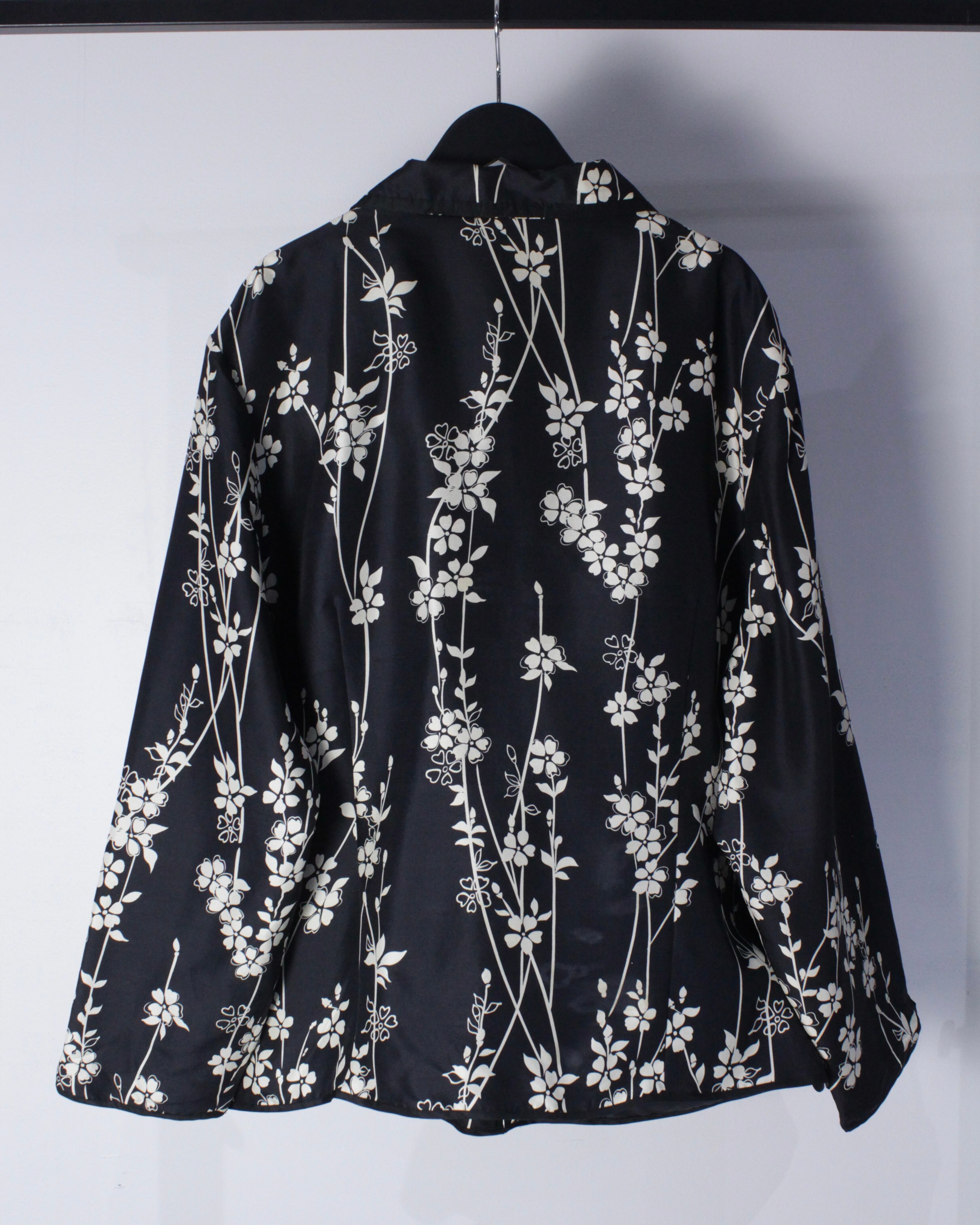 ブラックのボディをベースに、美しい花柄を載せたシルクジャケット。