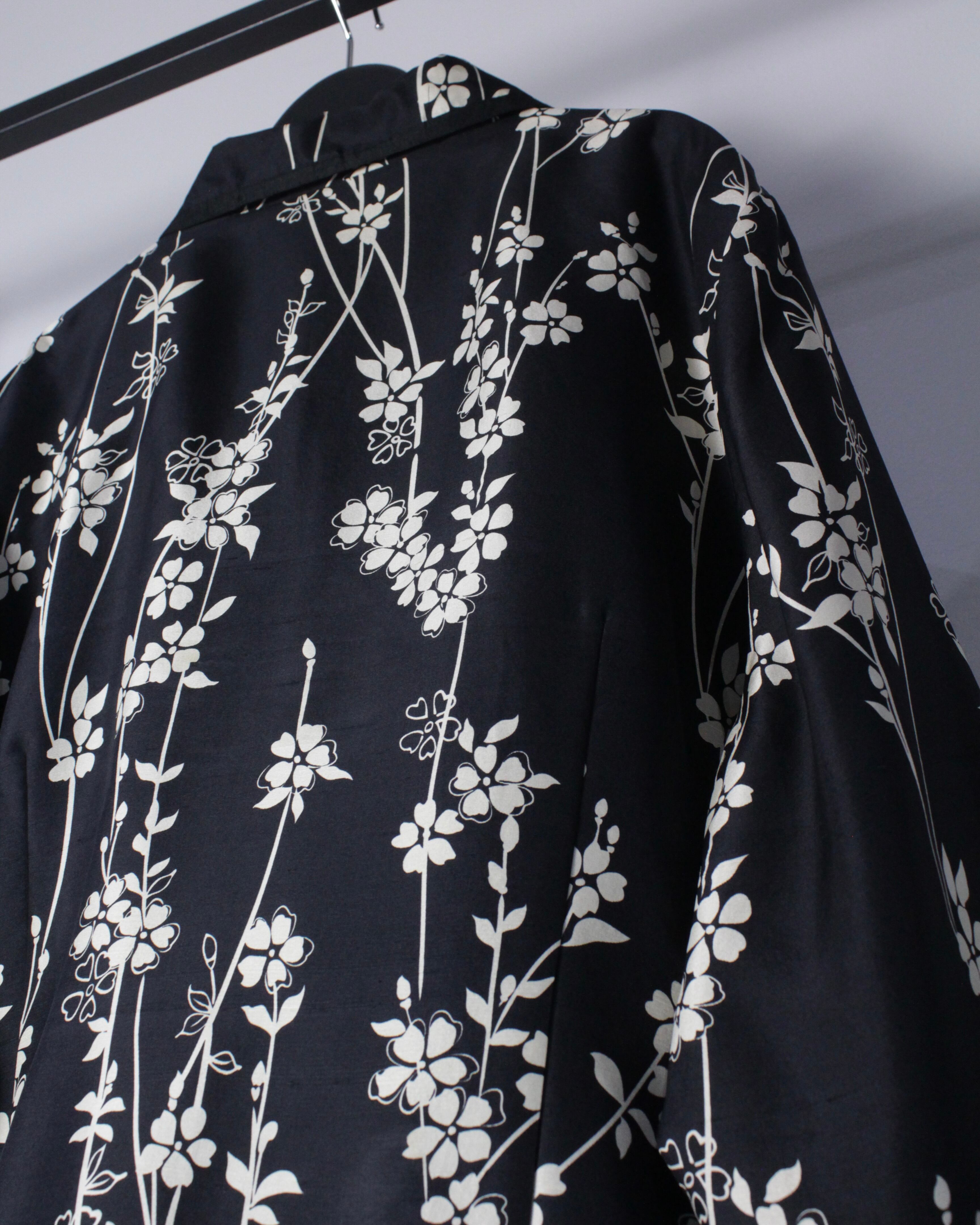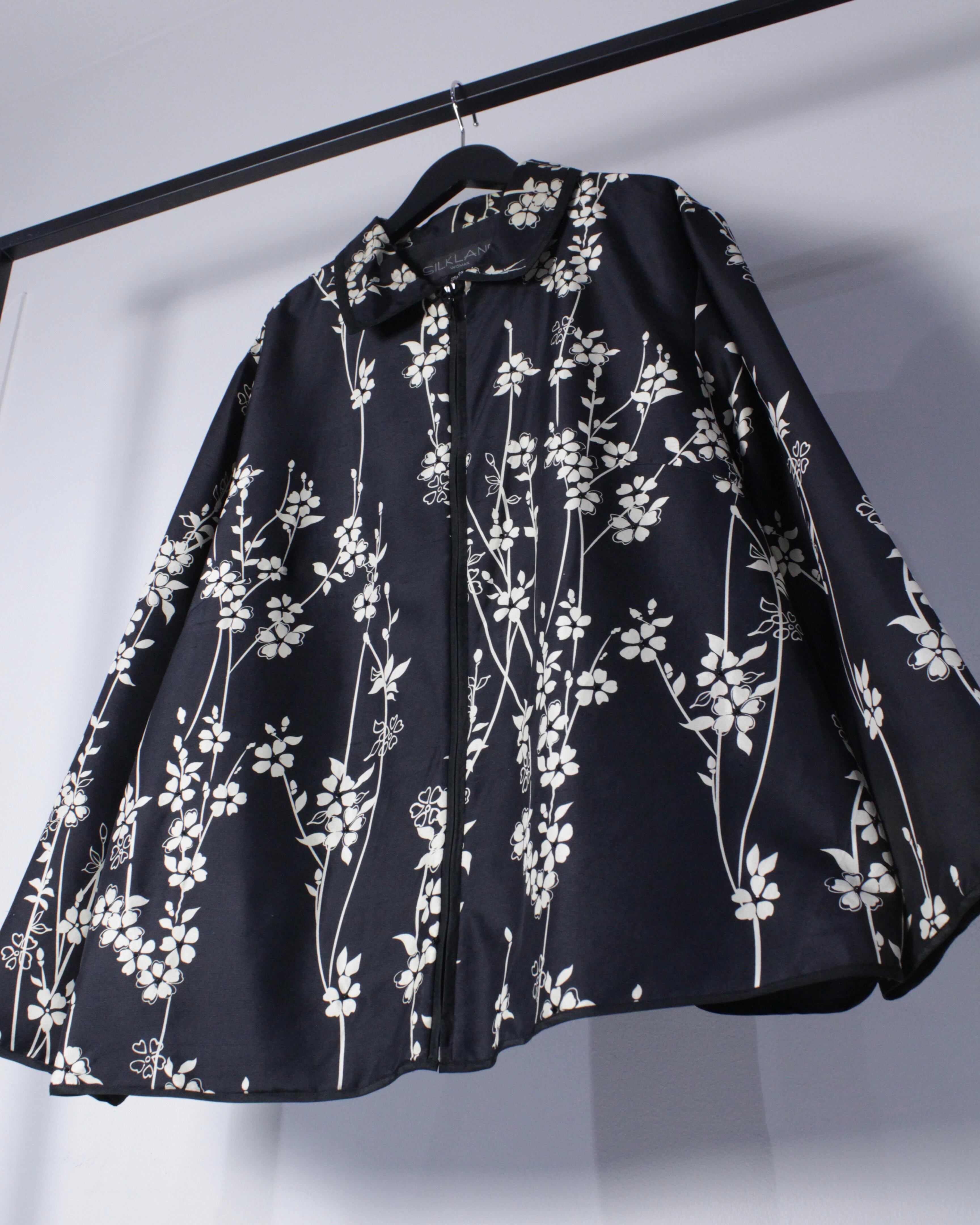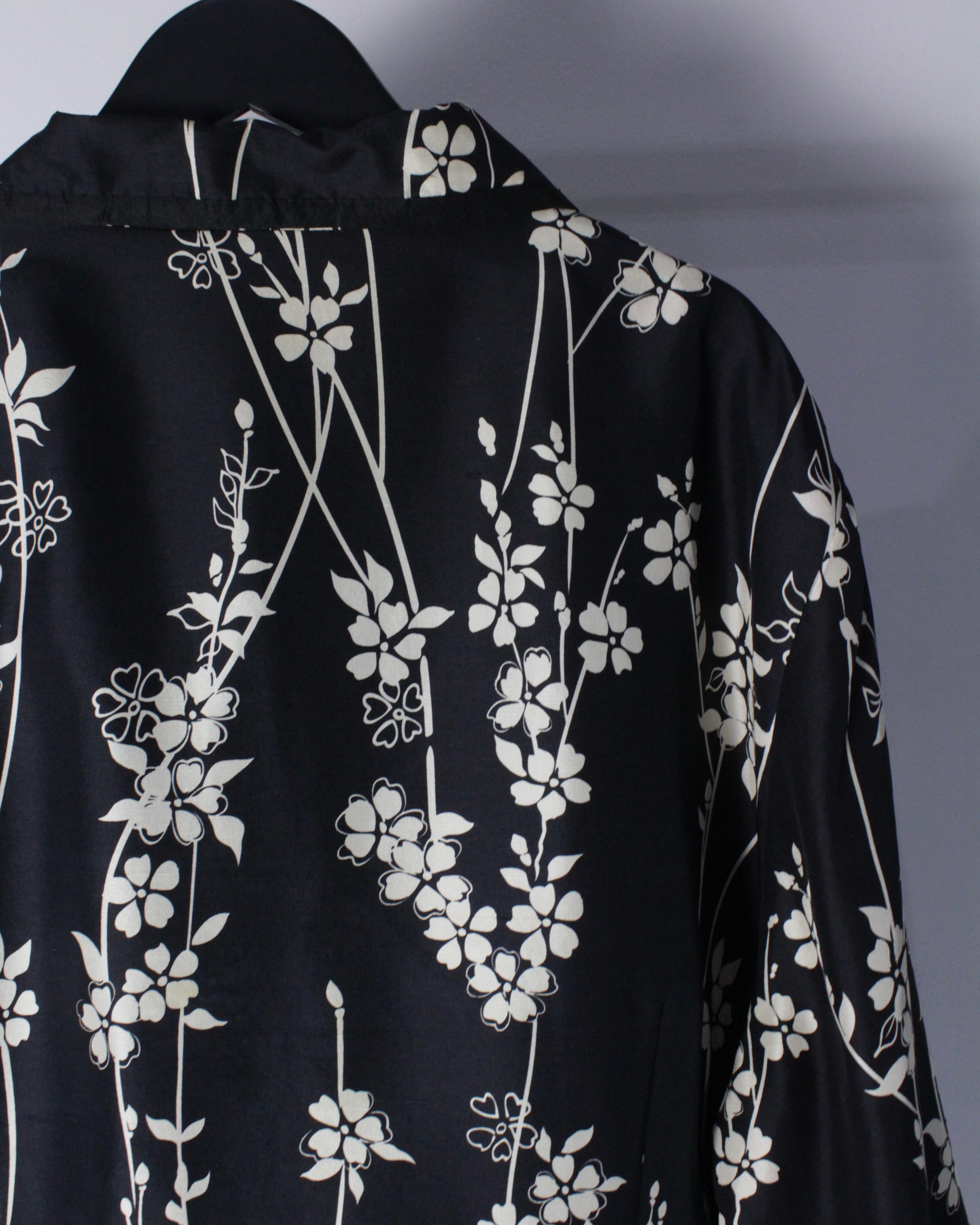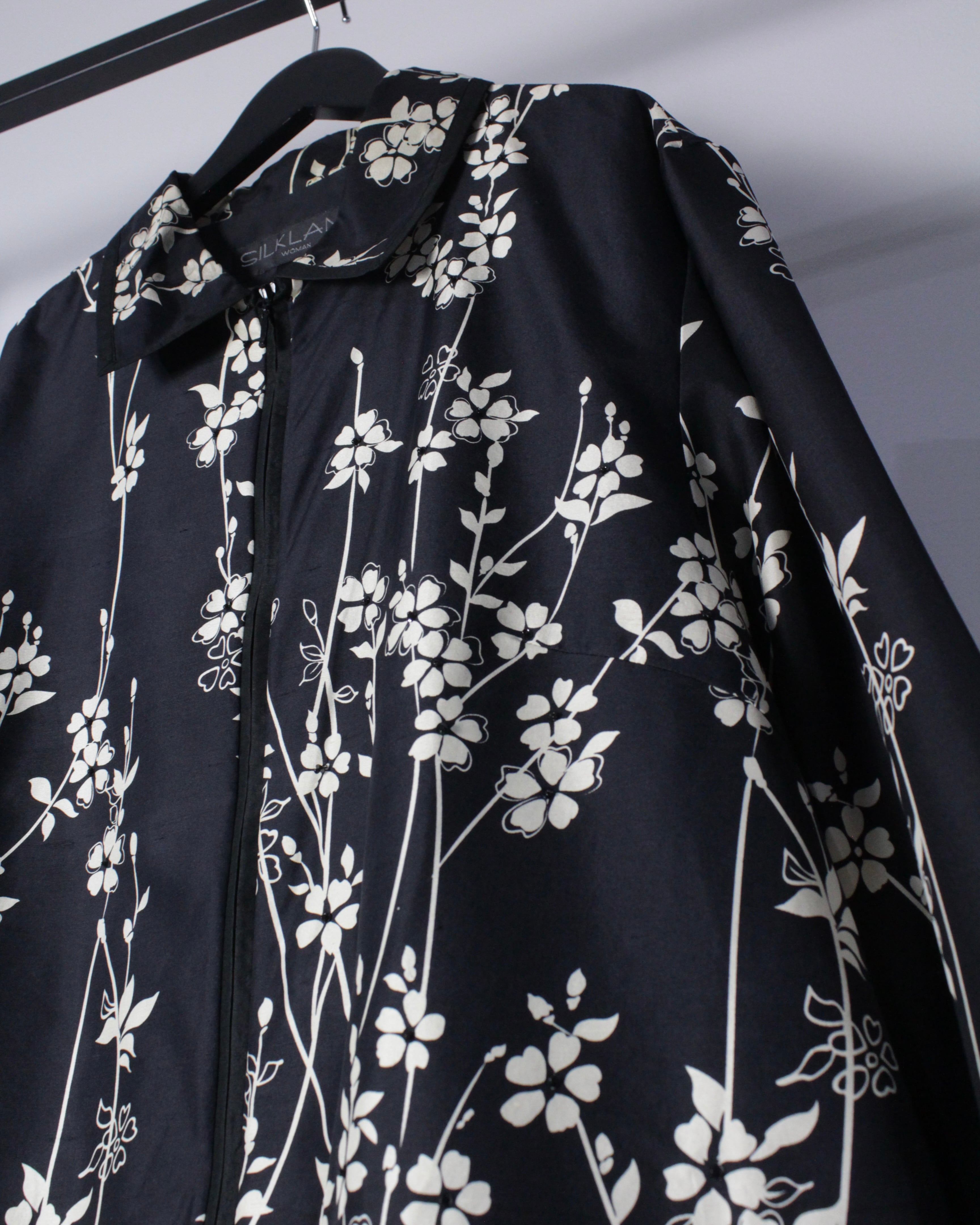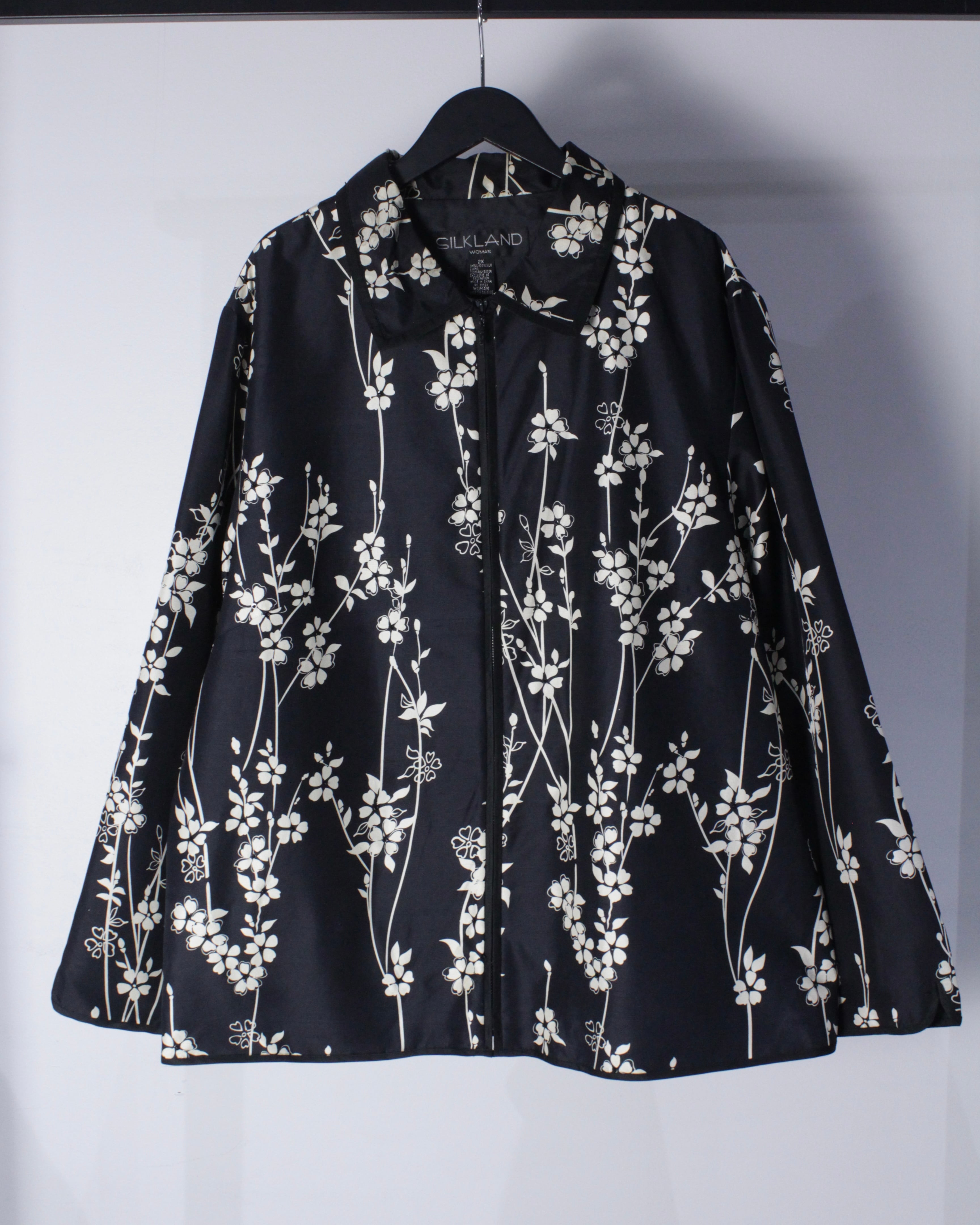 ブラックのボディをベースに、美しい花柄を載せたシルクジャケット。
