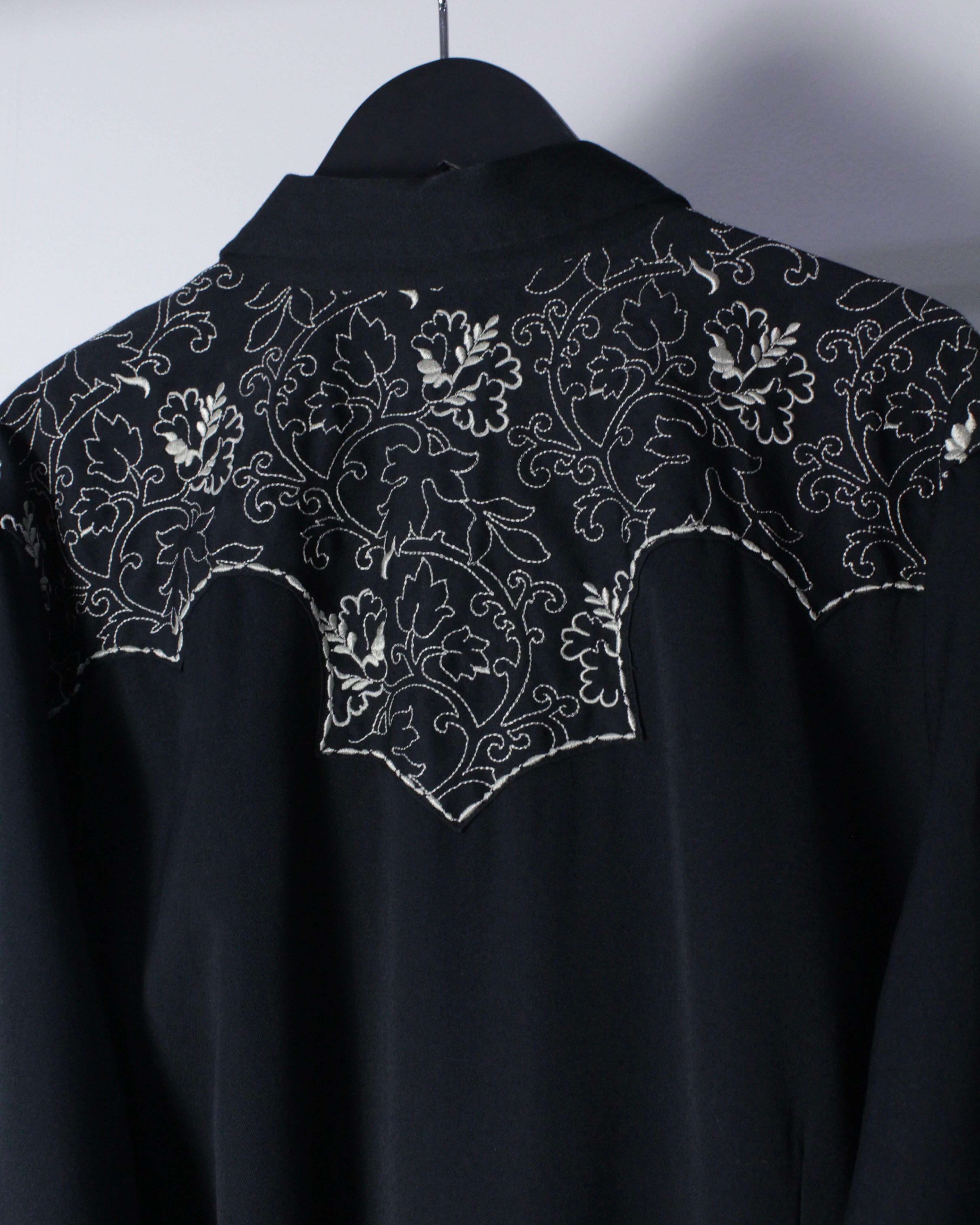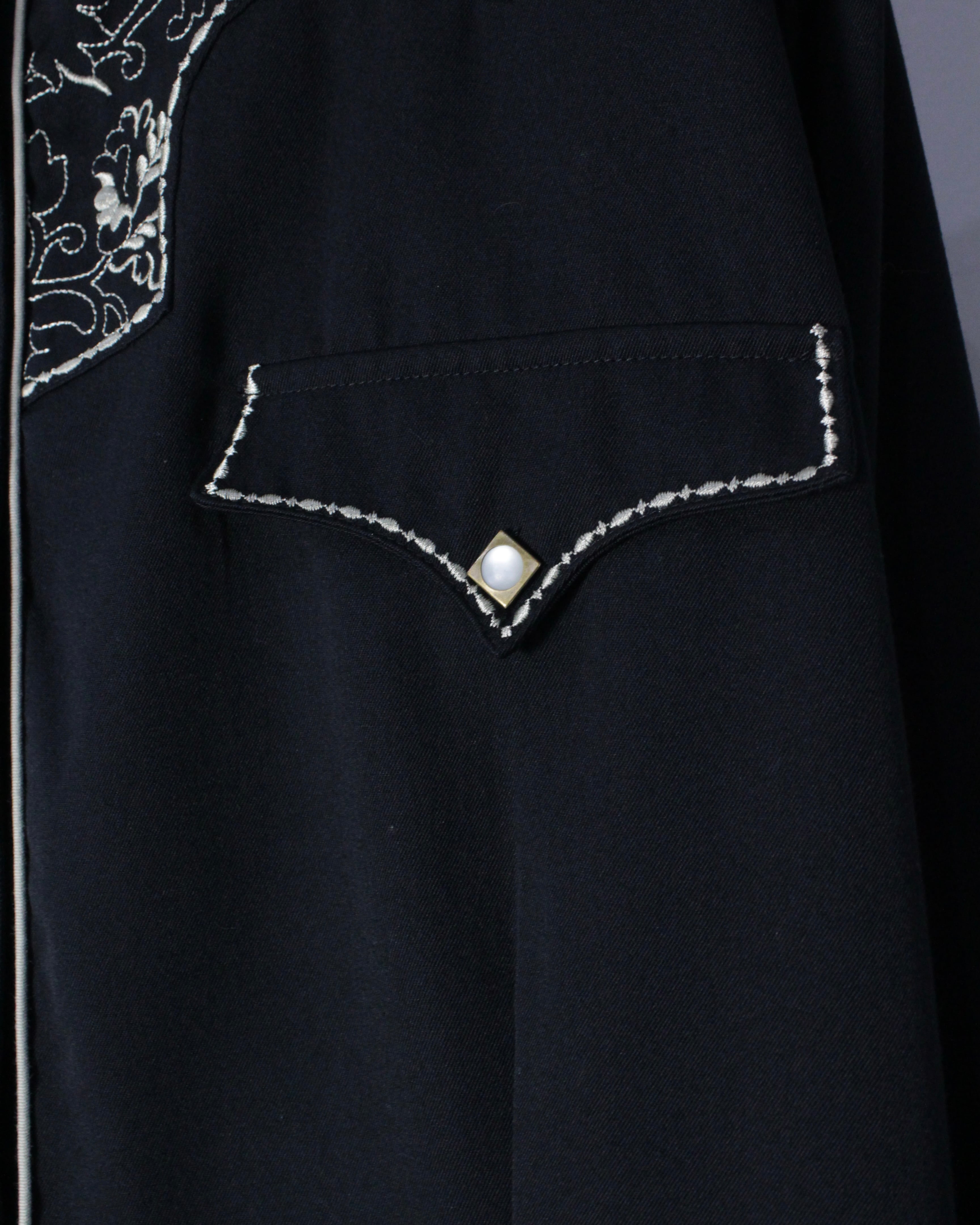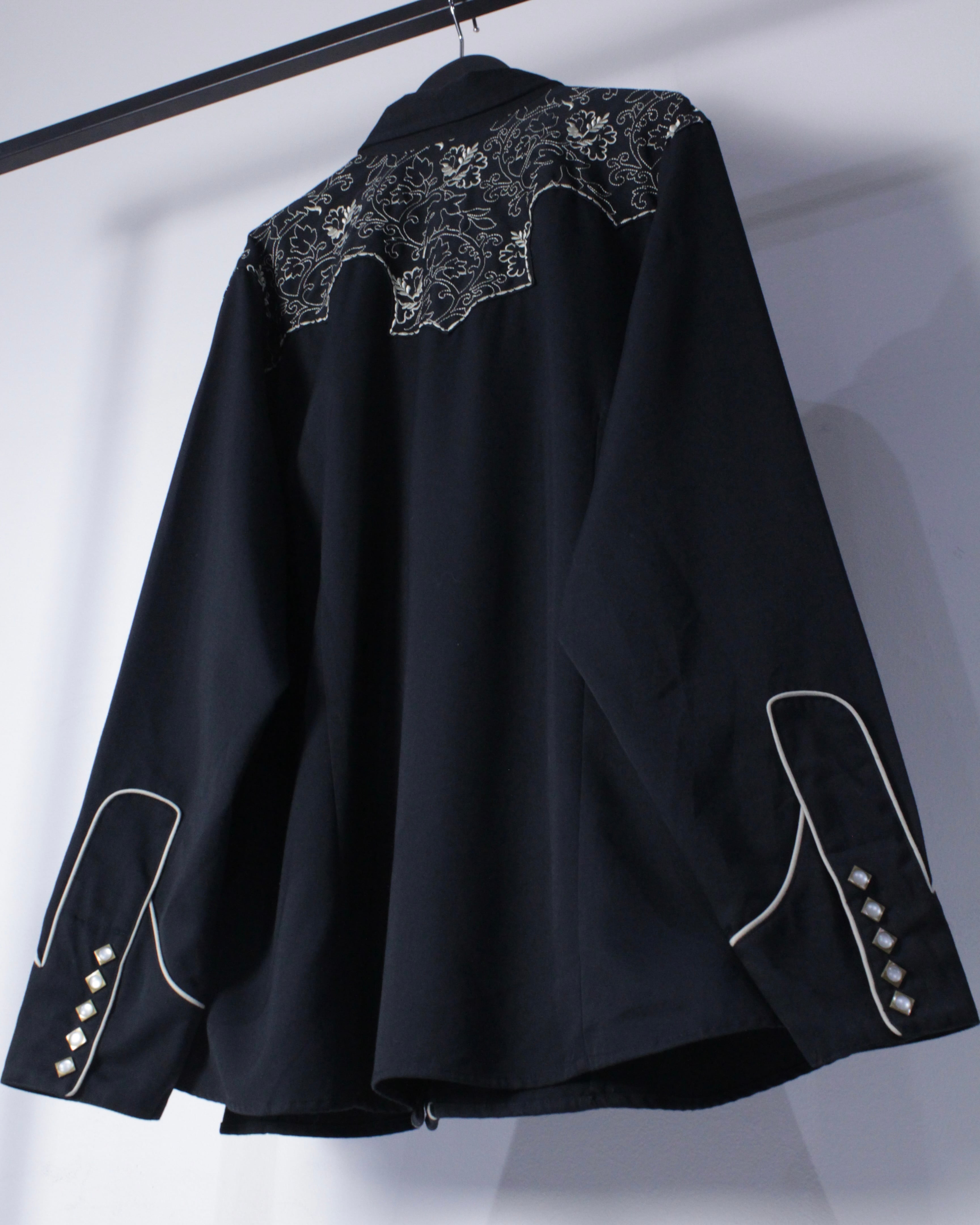 ウエスタンヨークにパールスナップボタン、アーチ型のフラップ、パイピングとウエスタン特有のディテールに、刺繍のデザインやモノトーンのカラーリングが相まって、モードな雰囲気を漂わせる仕上がりに。