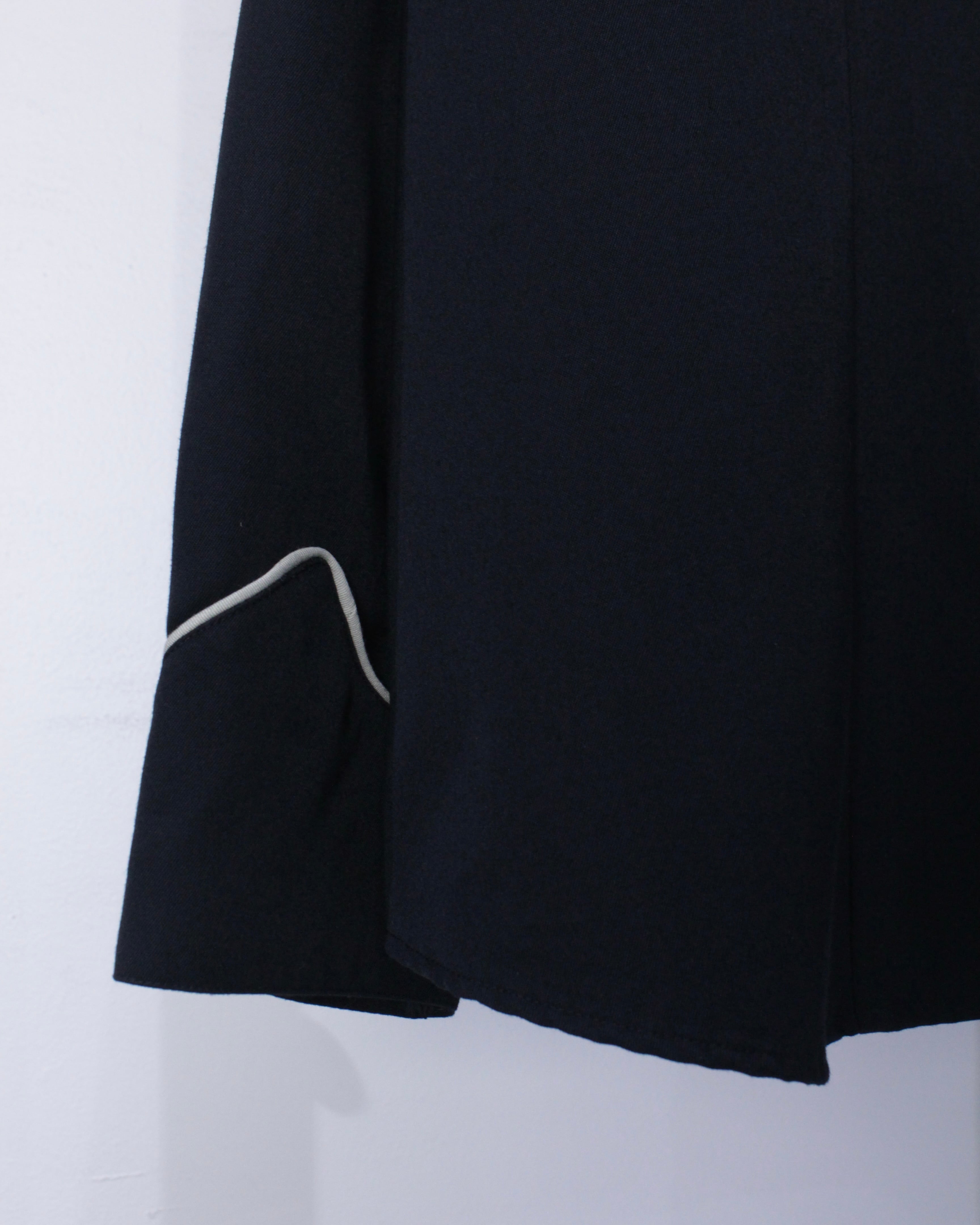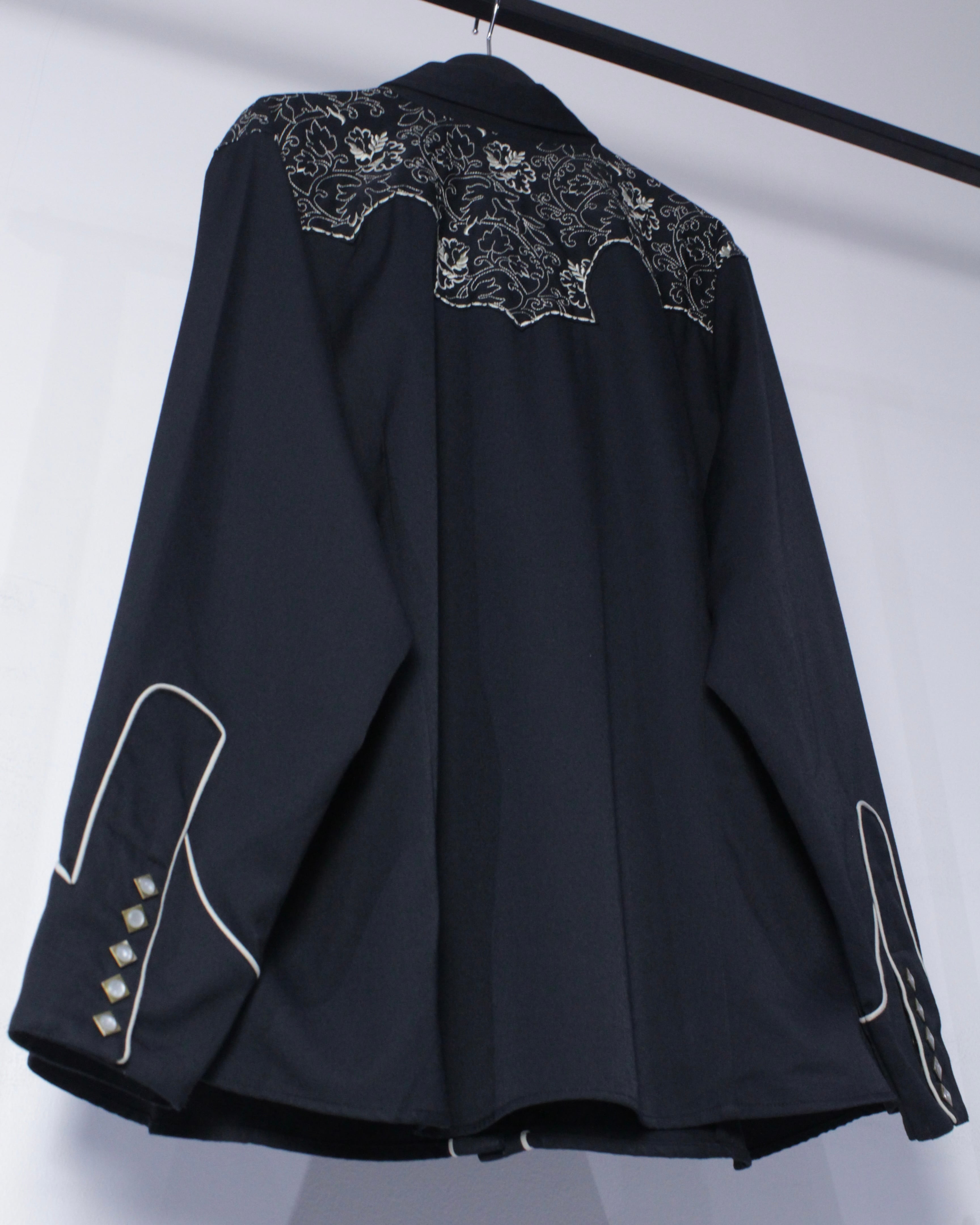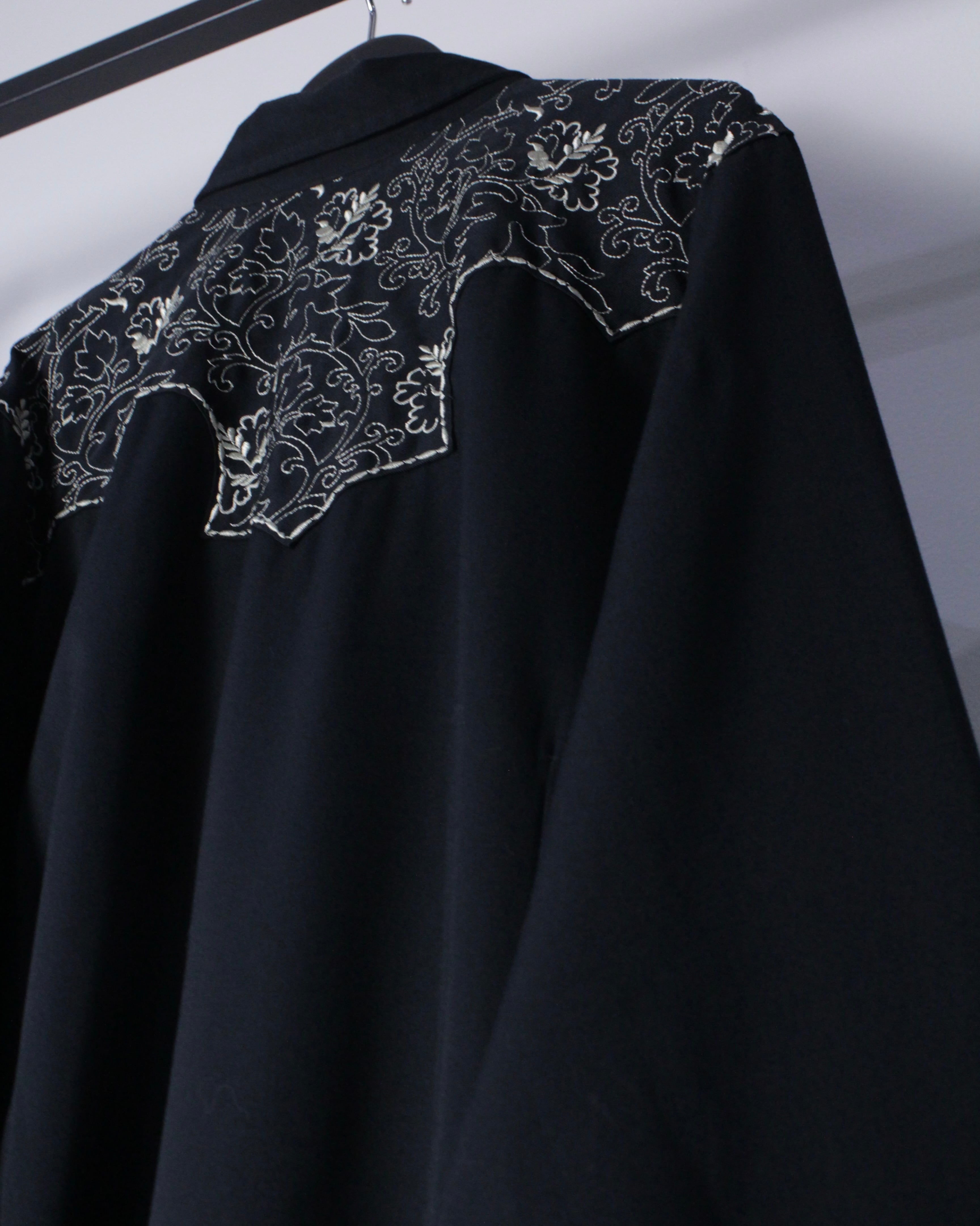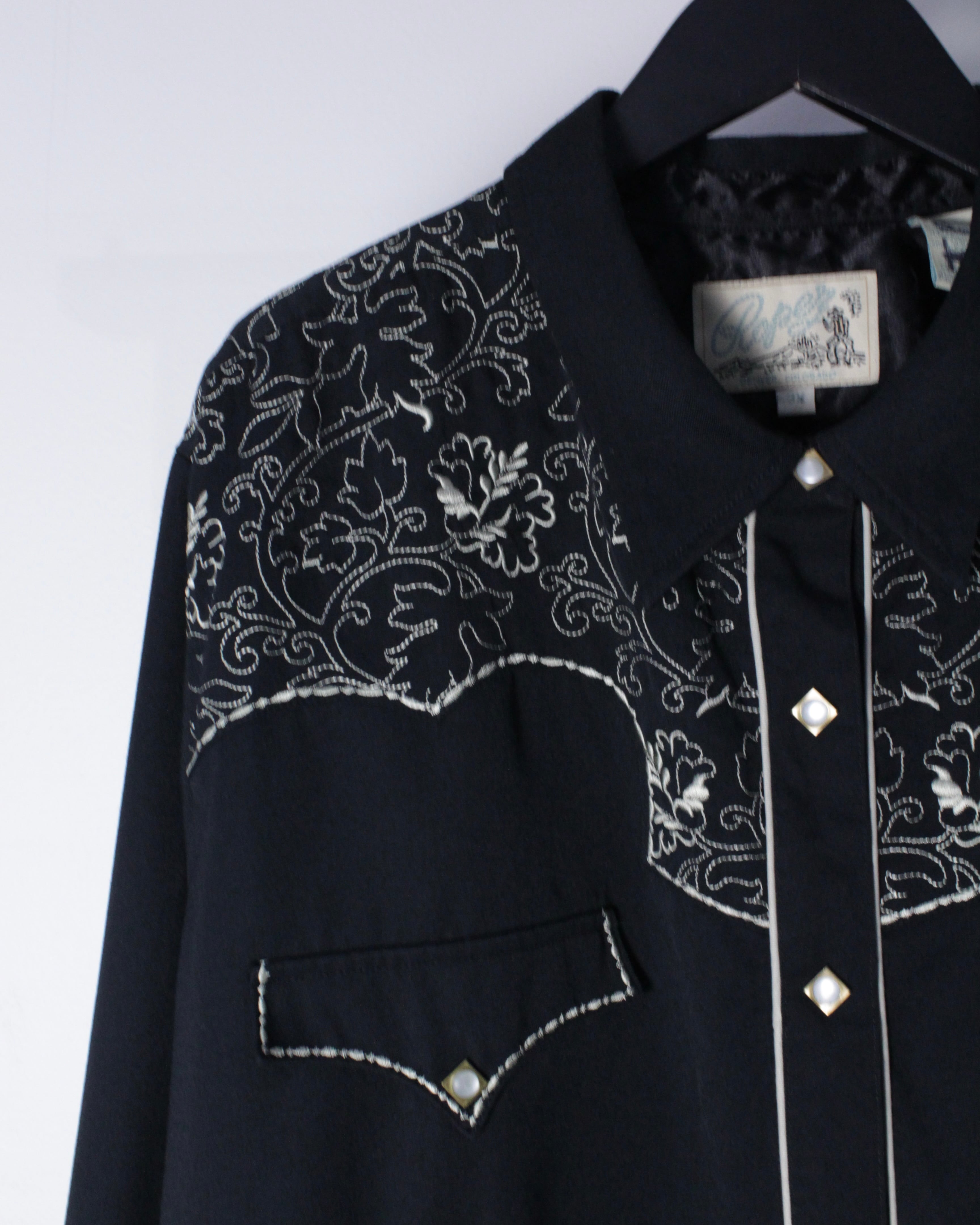 ウエスタンヨークにパールスナップボタン、アーチ型のフラップ、パイピングとウエスタン特有のディテールに、刺繍のデザインやモノトーンのカラーリングが相まって、モードな雰囲気を漂わせる仕上がりに。