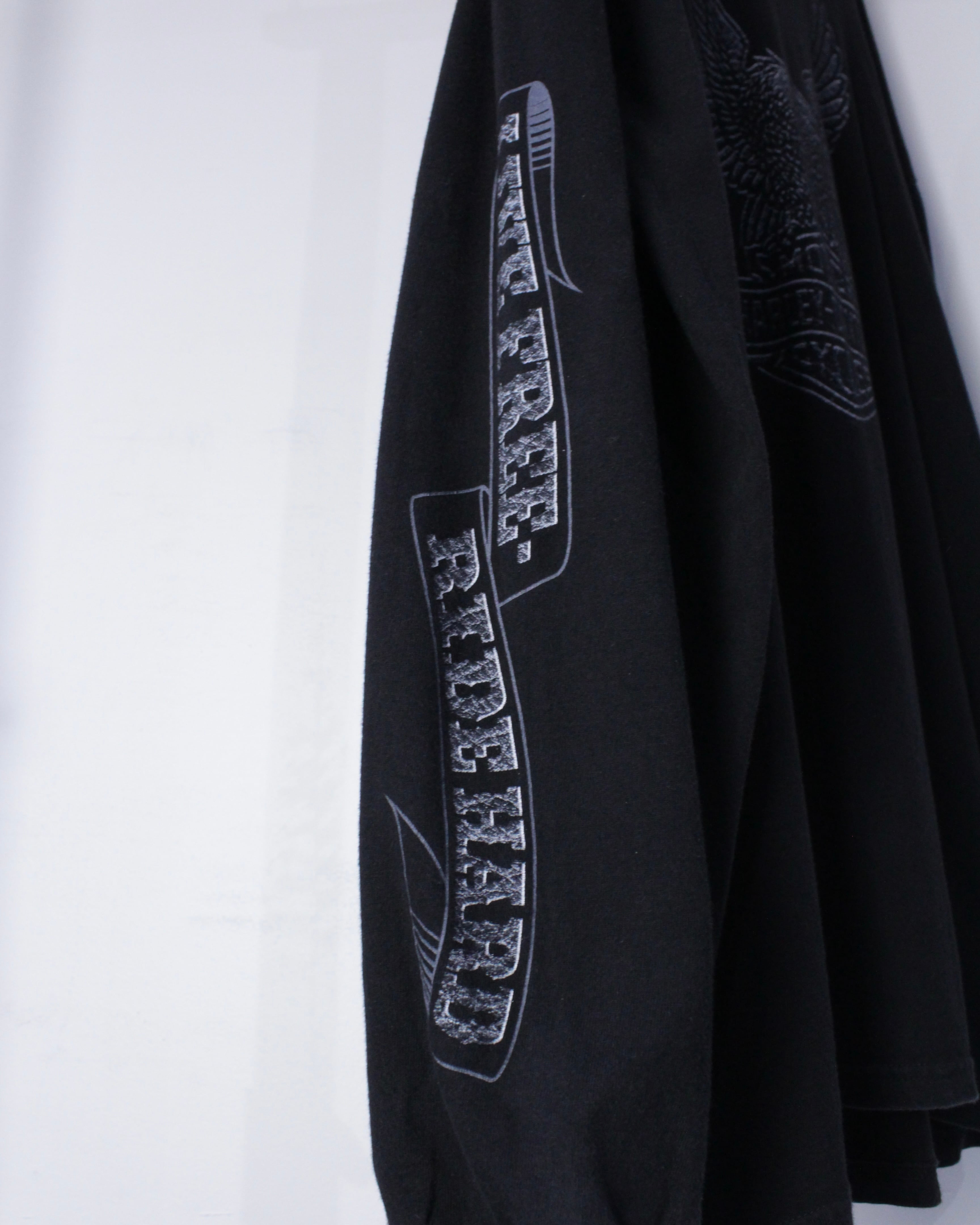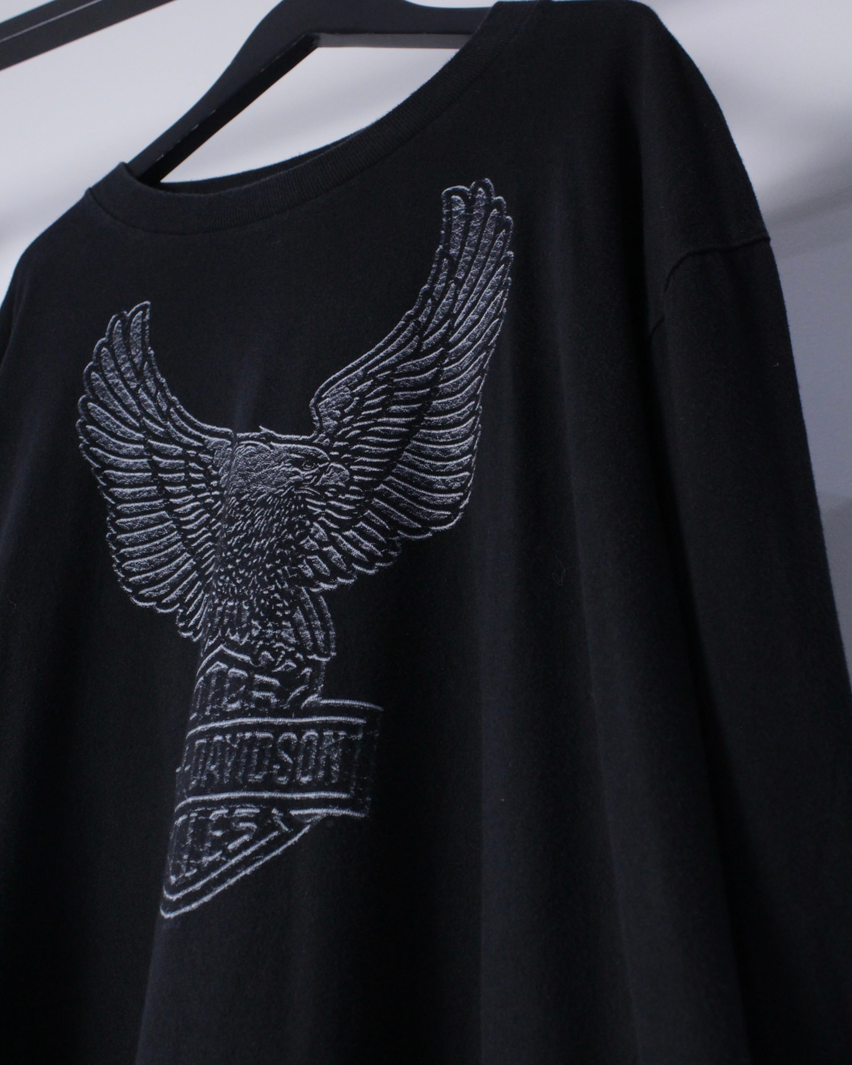 ブラックのボディをベースに、フロントにアイコニックな白頭鷲、アーム、背面にはブランドロゴを載せた全方位死角なしのロンT。