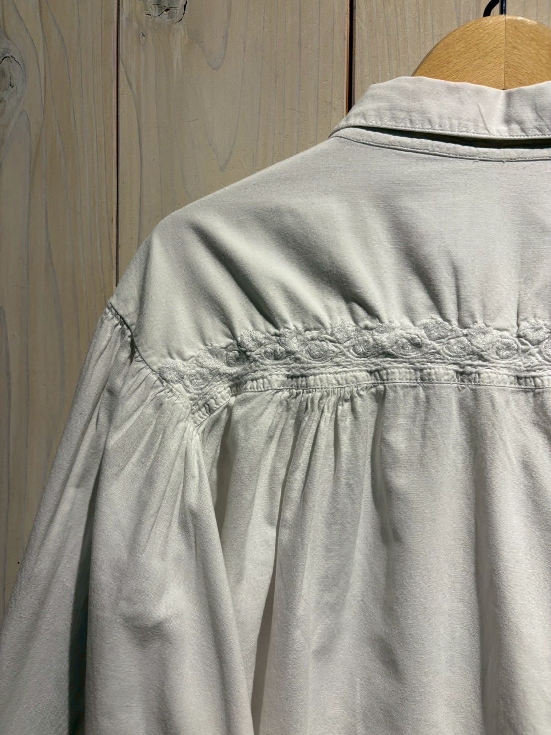 薄手のコットンを用いたホワイトのボディに、首元、袖付近にニットで作られた花の装飾を施した長袖シャツ。