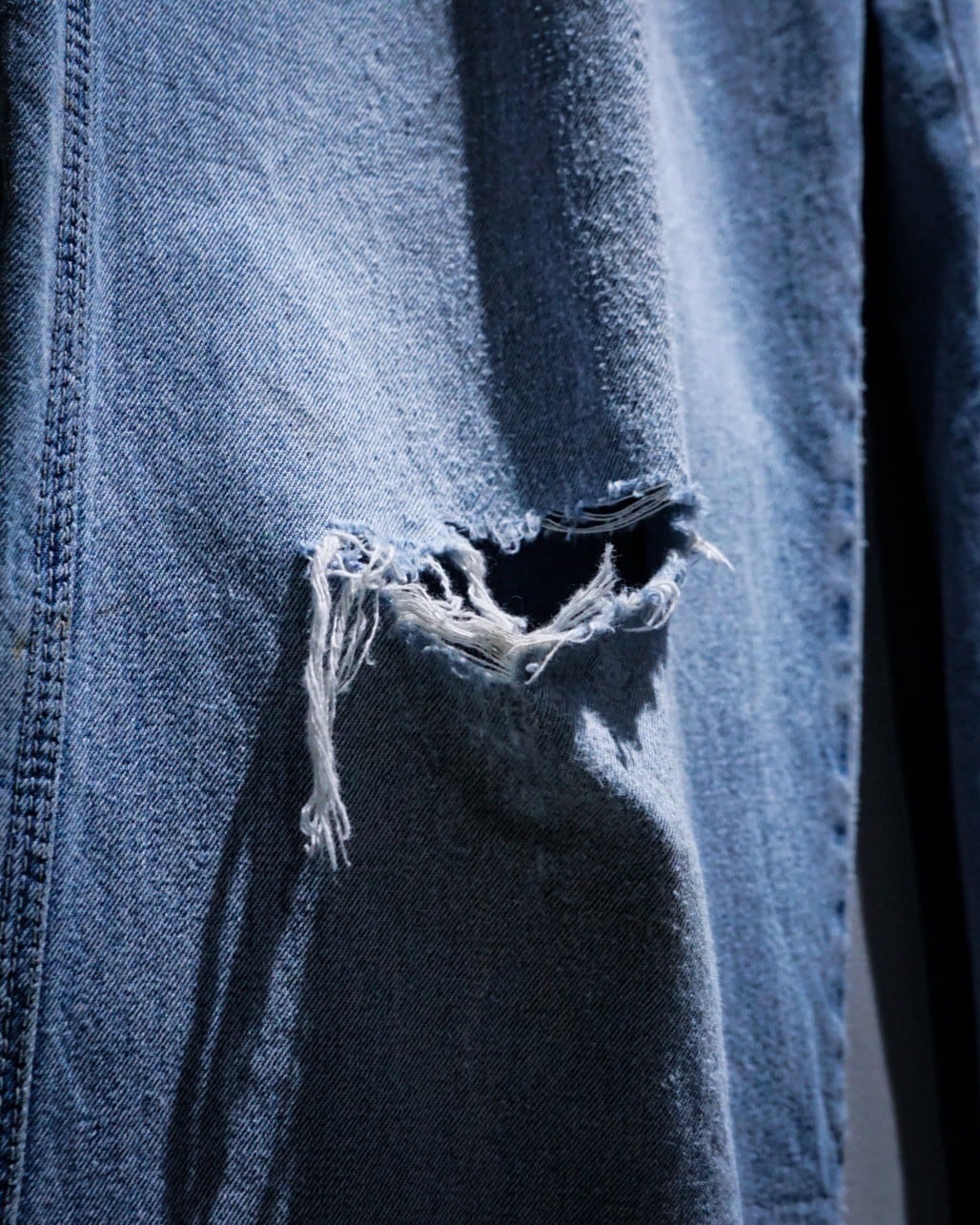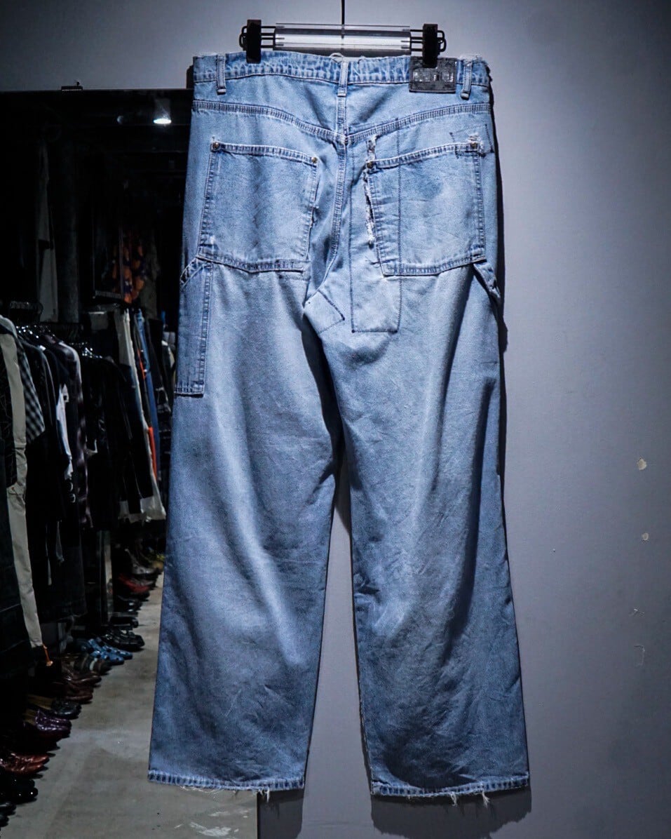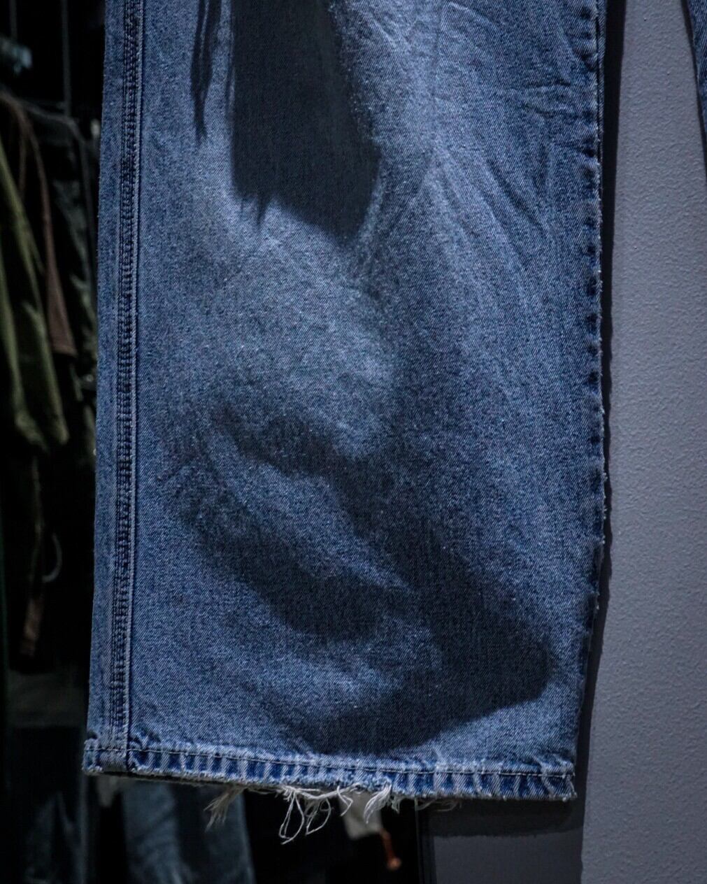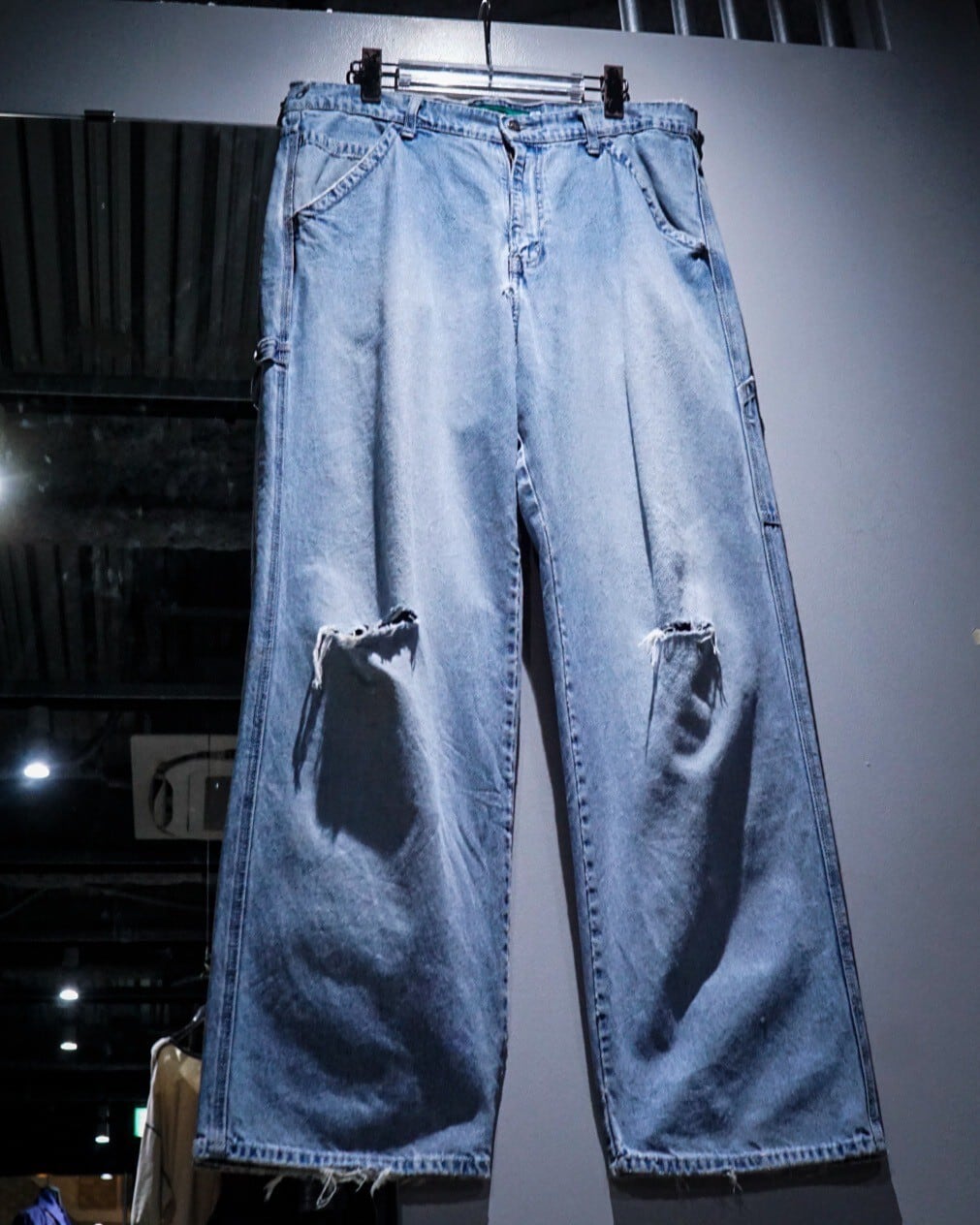 経年によりフェードしたボディに、膝部分にダメージ加工が施されたペインターデニムパンツ。