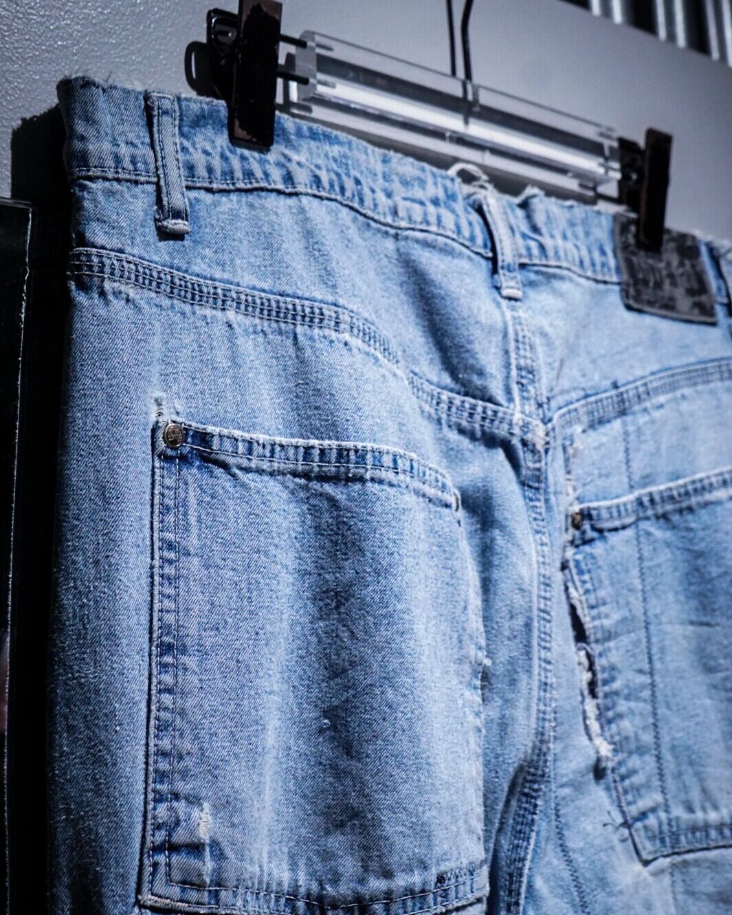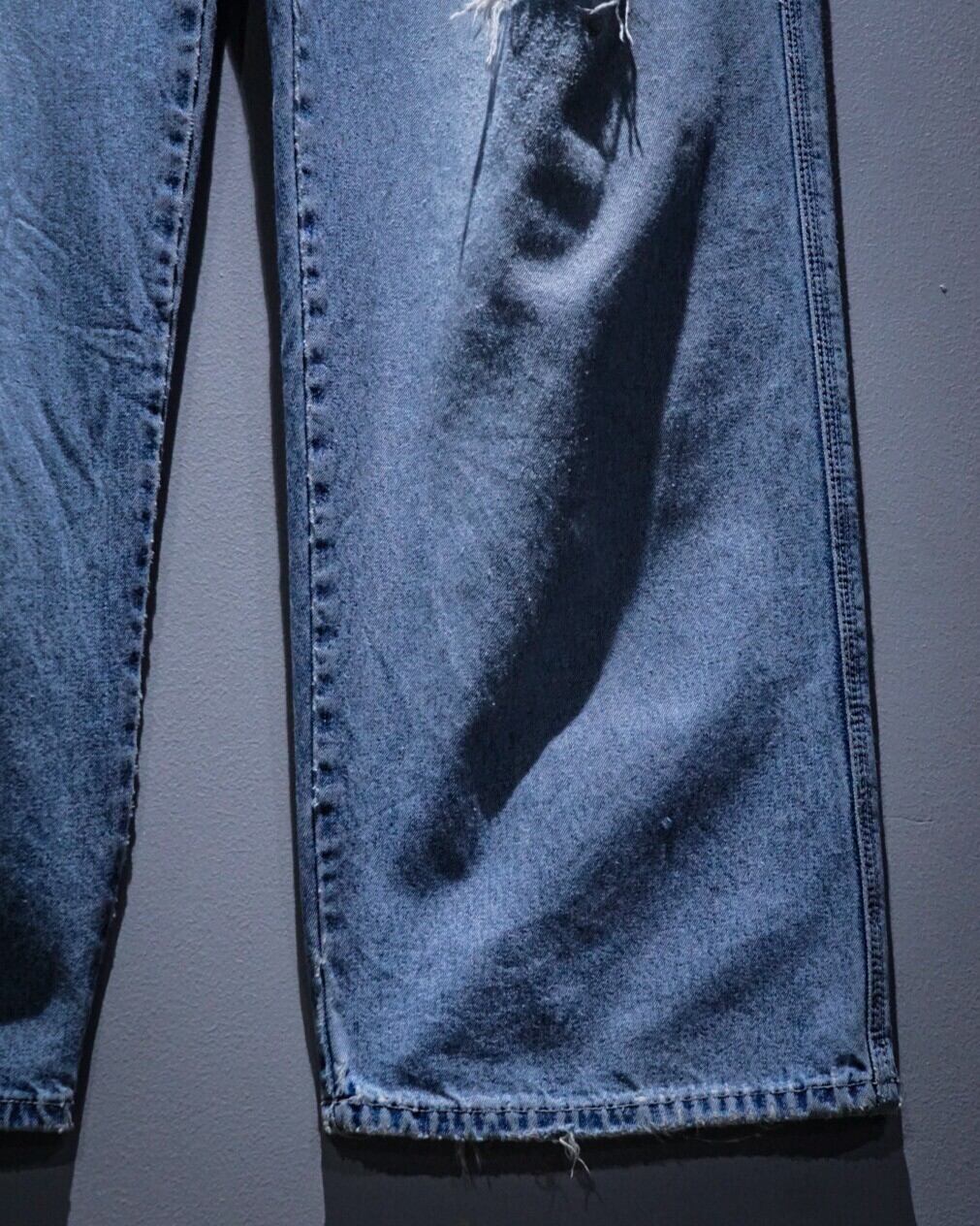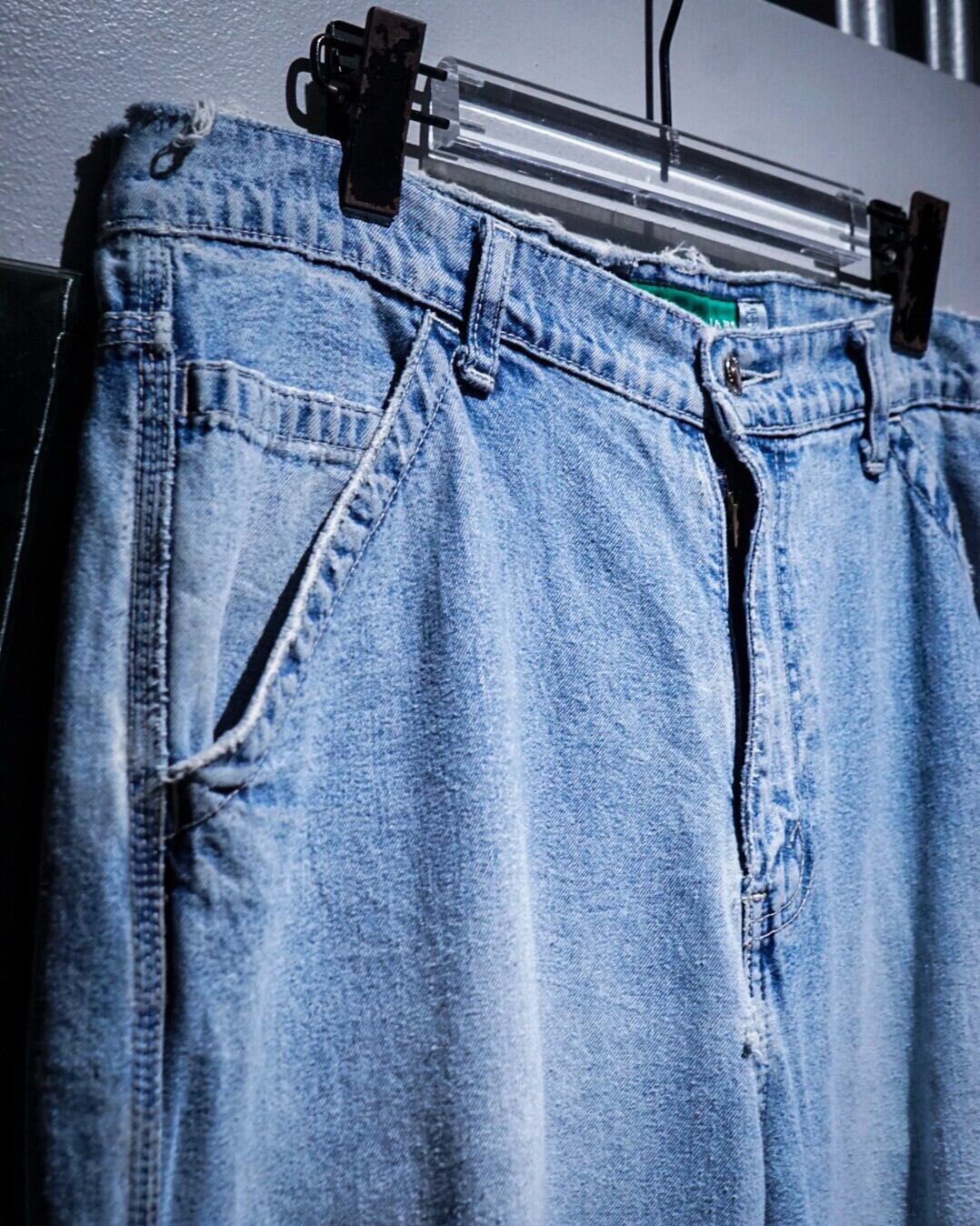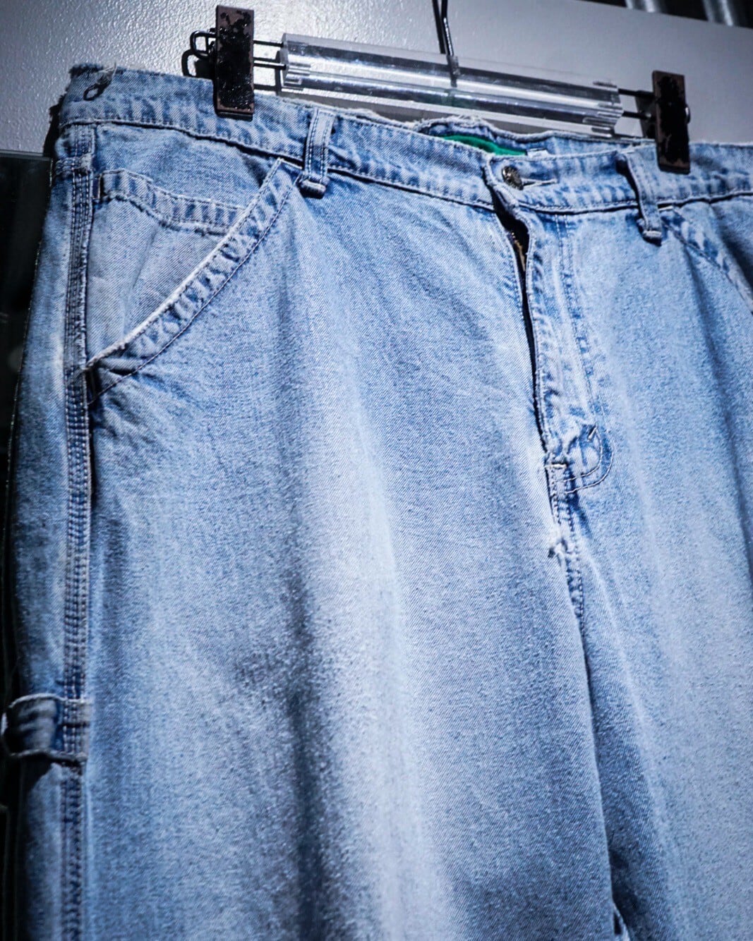 経年によりフェードしたボディに、膝部分にダメージ加工が施されたペインターデニムパンツ。