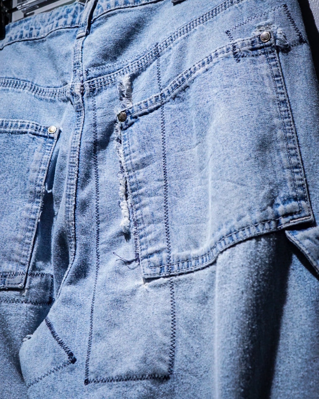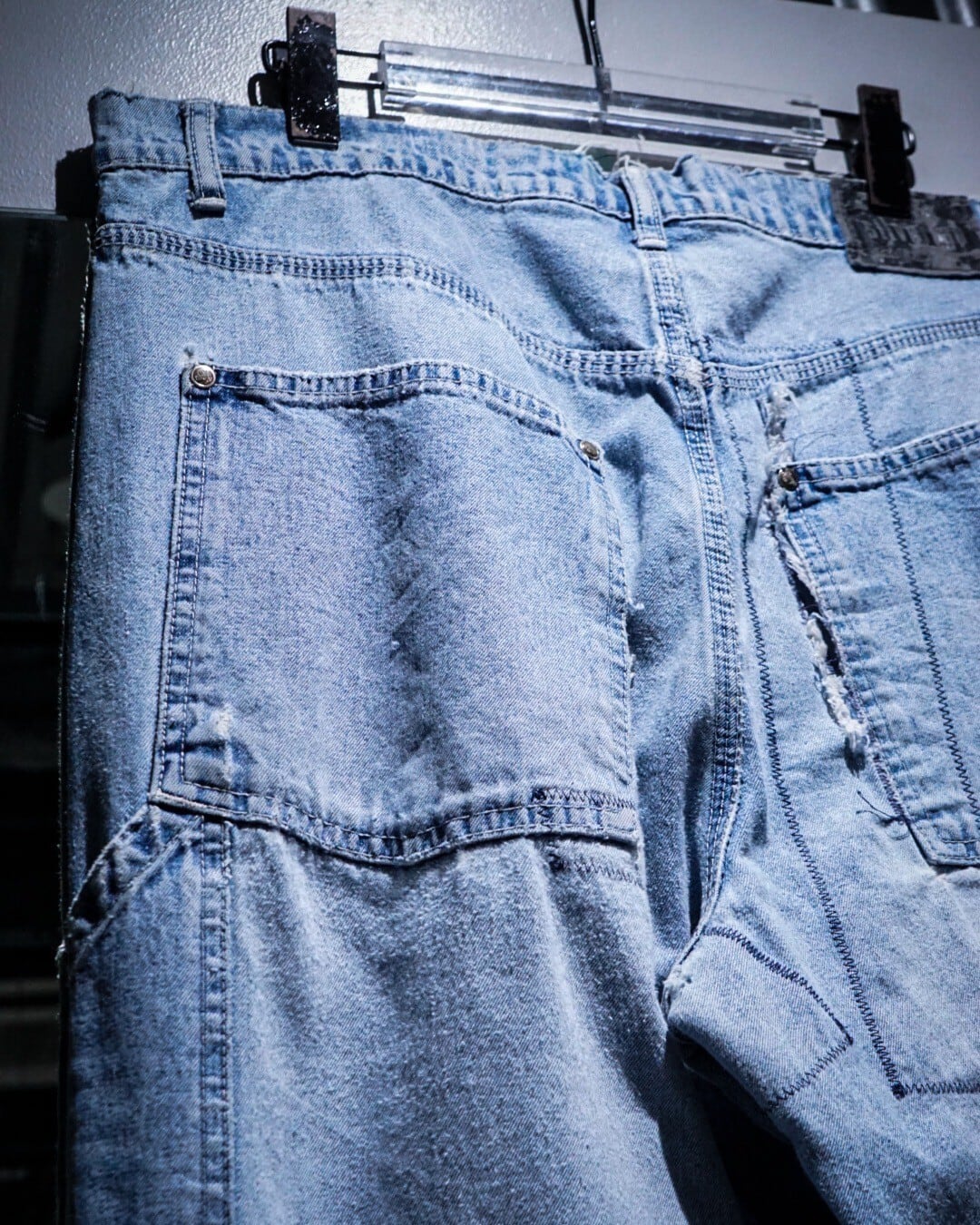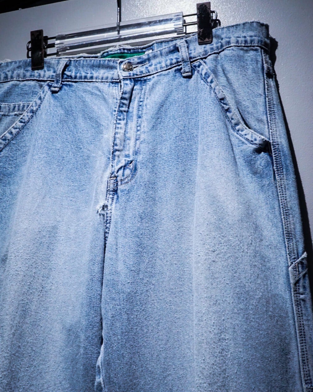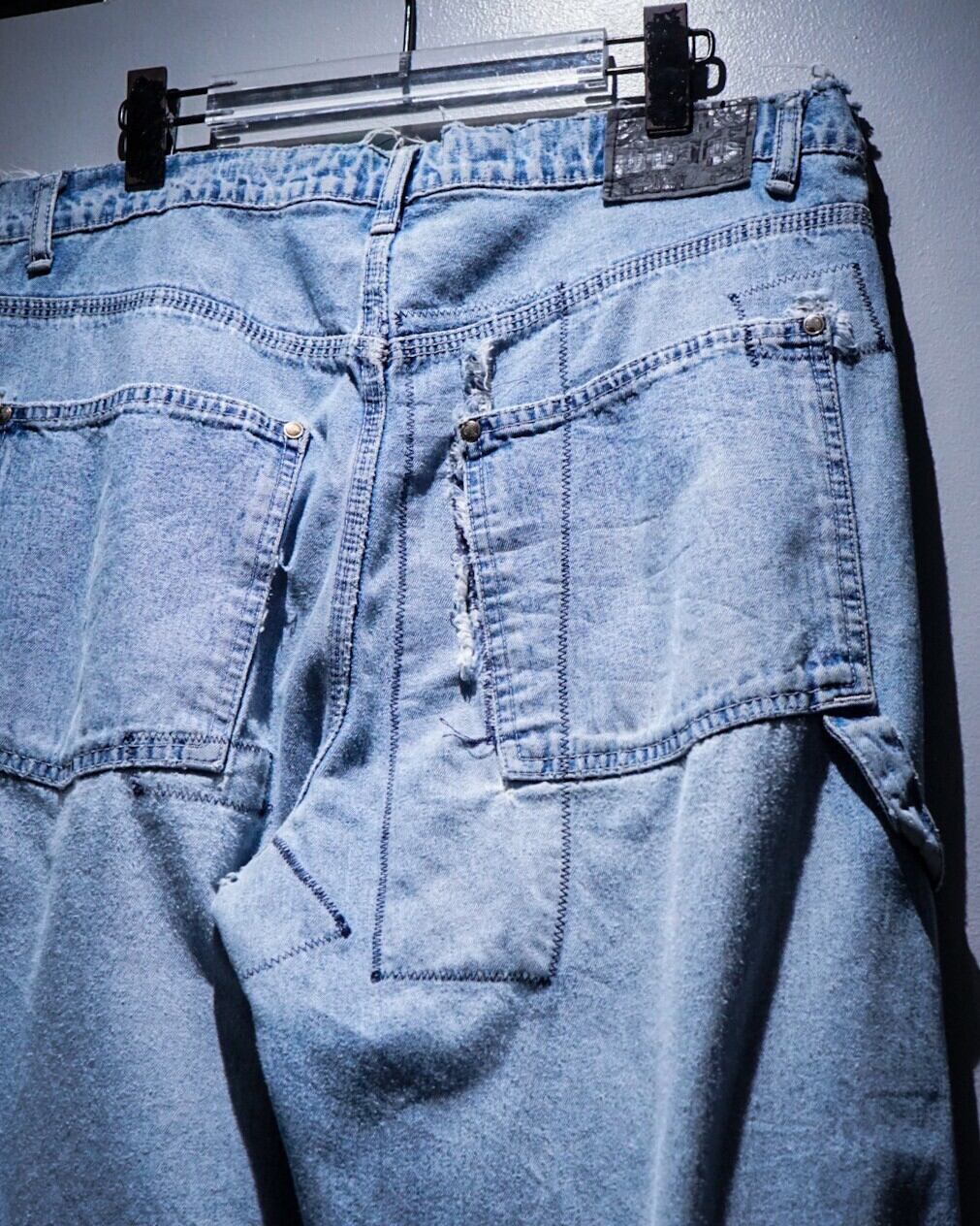 経年によりフェードしたボディに、膝部分にダメージ加工が施されたペインターデニムパンツ。