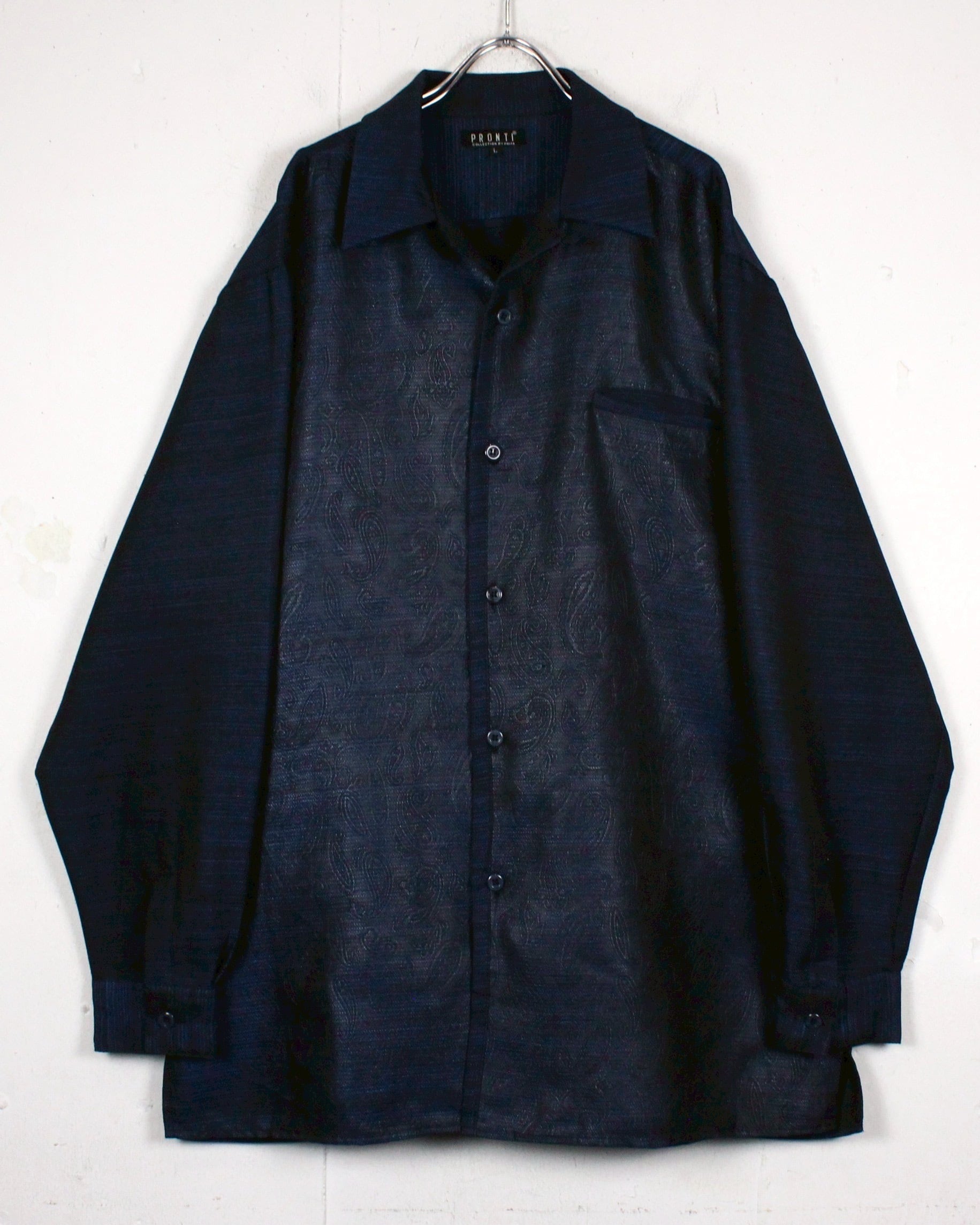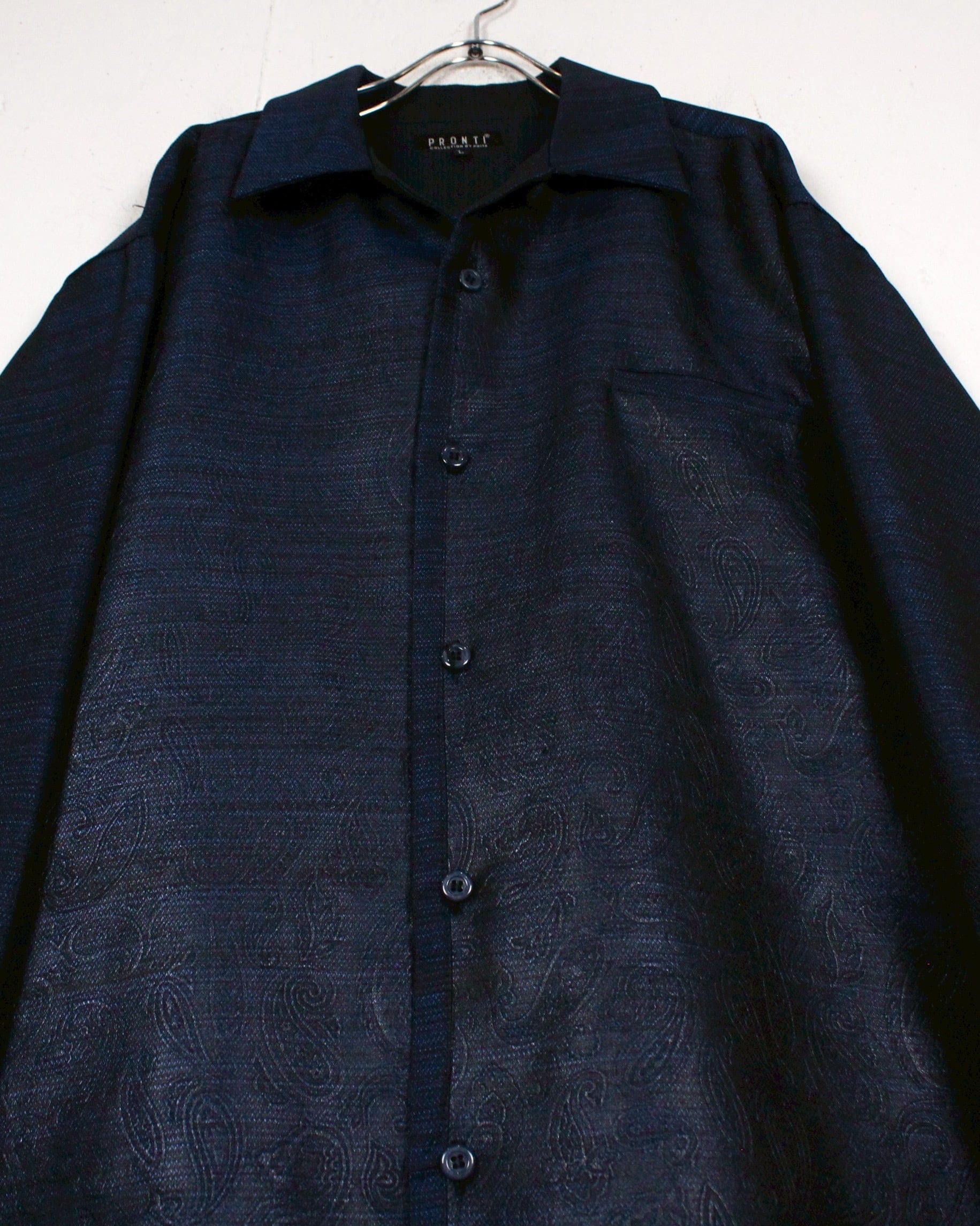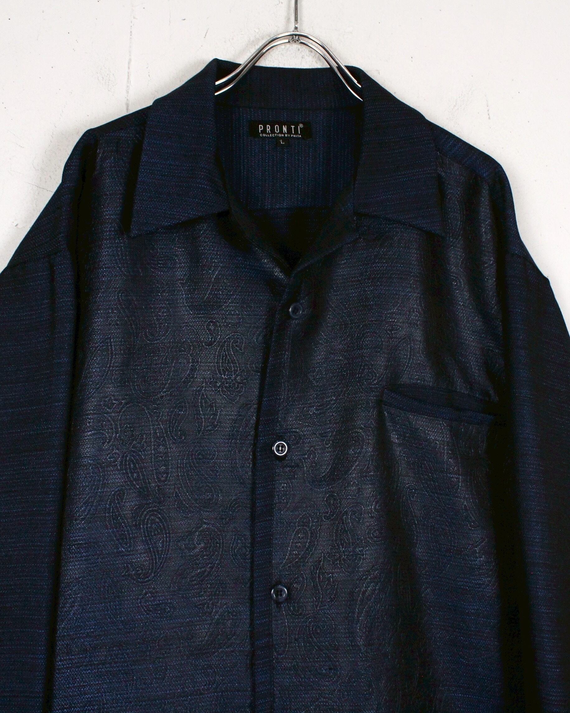 光の当たりや角度によって見え方の変わる、美しい光沢を帯びたボディに、エンボス加工によってフロントにペイズリー柄を配した"PRONTI"のオープンカラーシャツ。