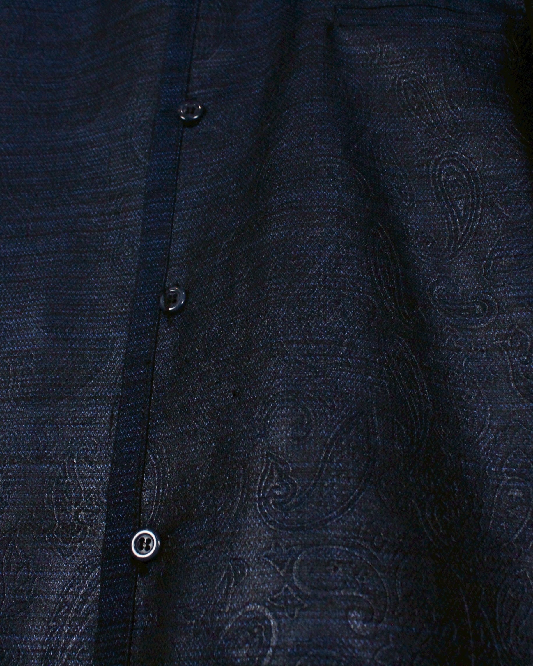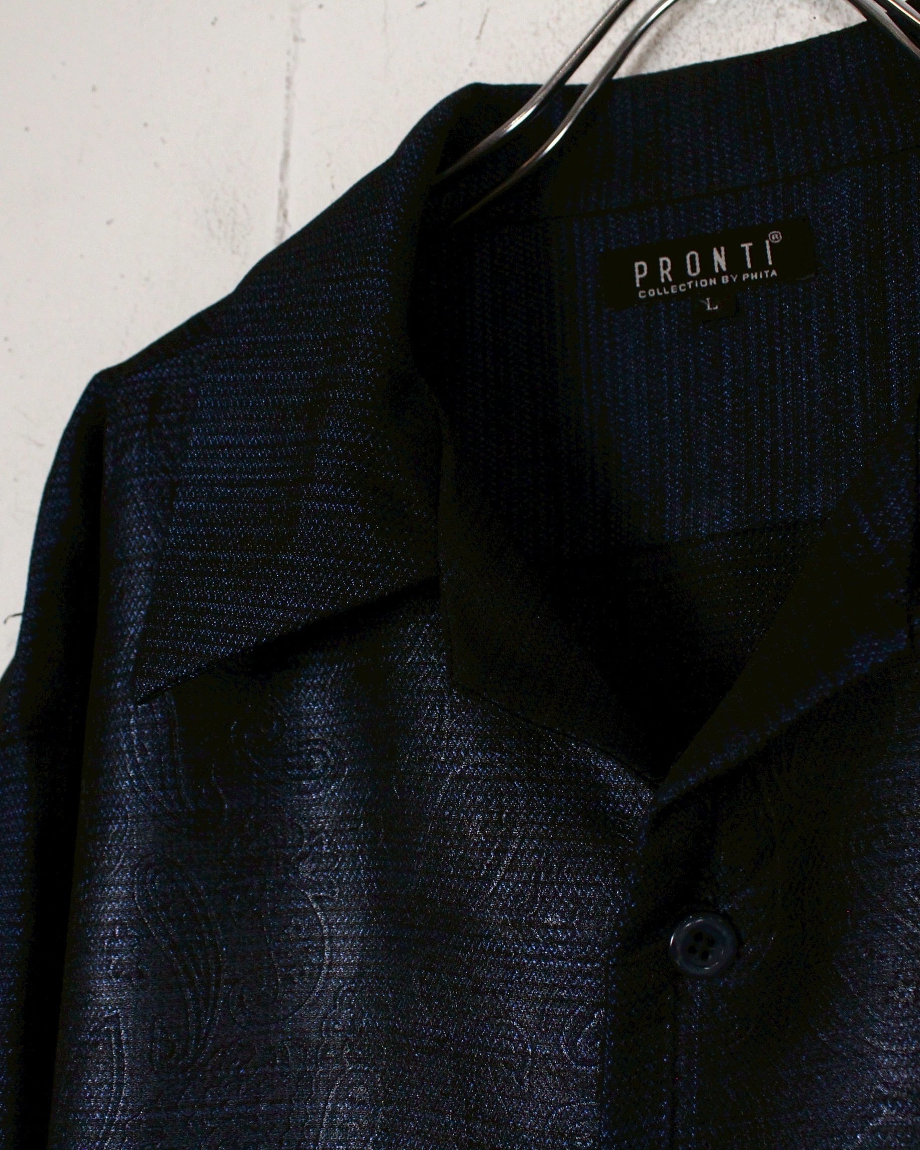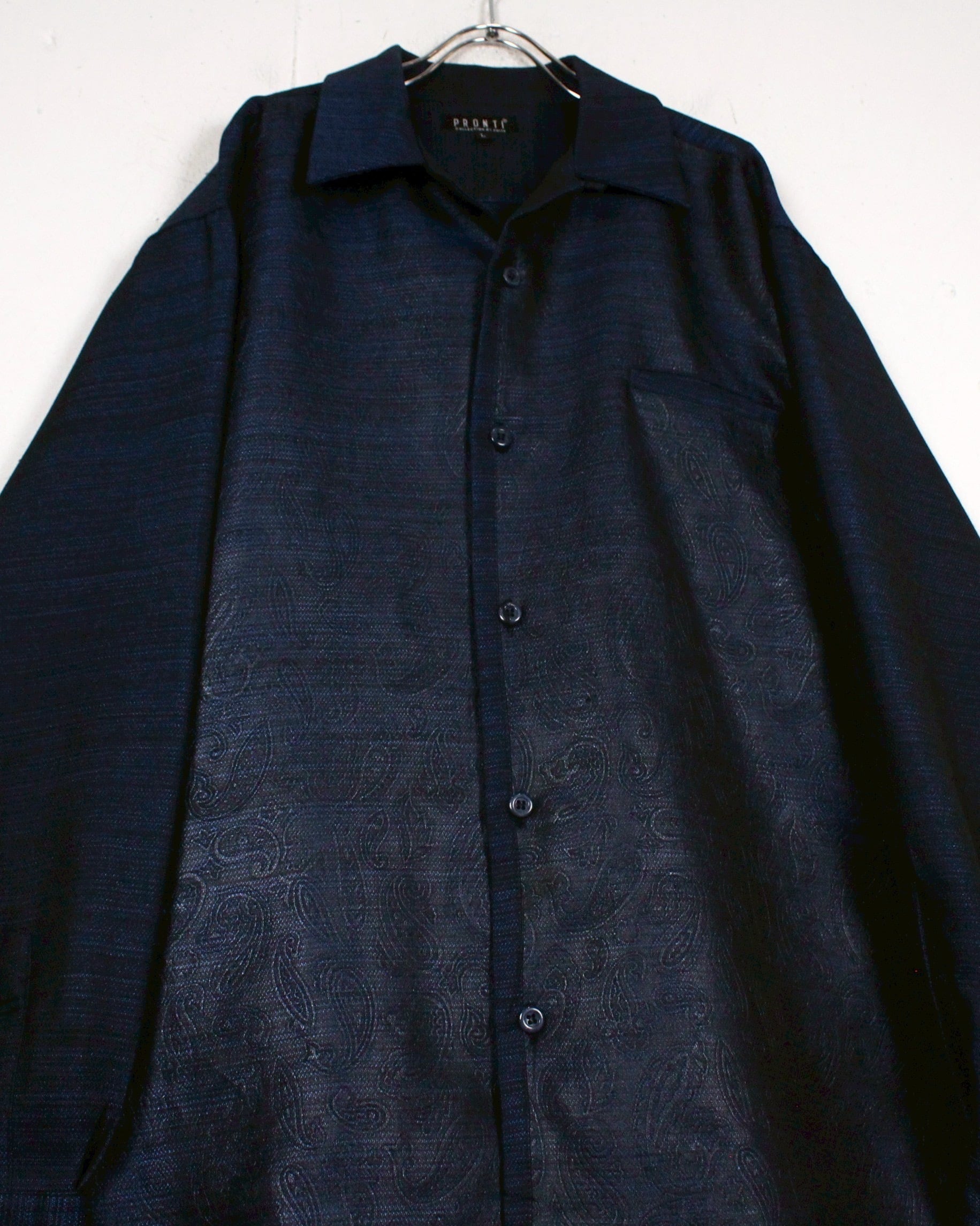 光の当たりや角度によって見え方の変わる、美しい光沢を帯びたボディに、エンボス加工によってフロントにペイズリー柄を配した"PRONTI"のオープンカラーシャツ。