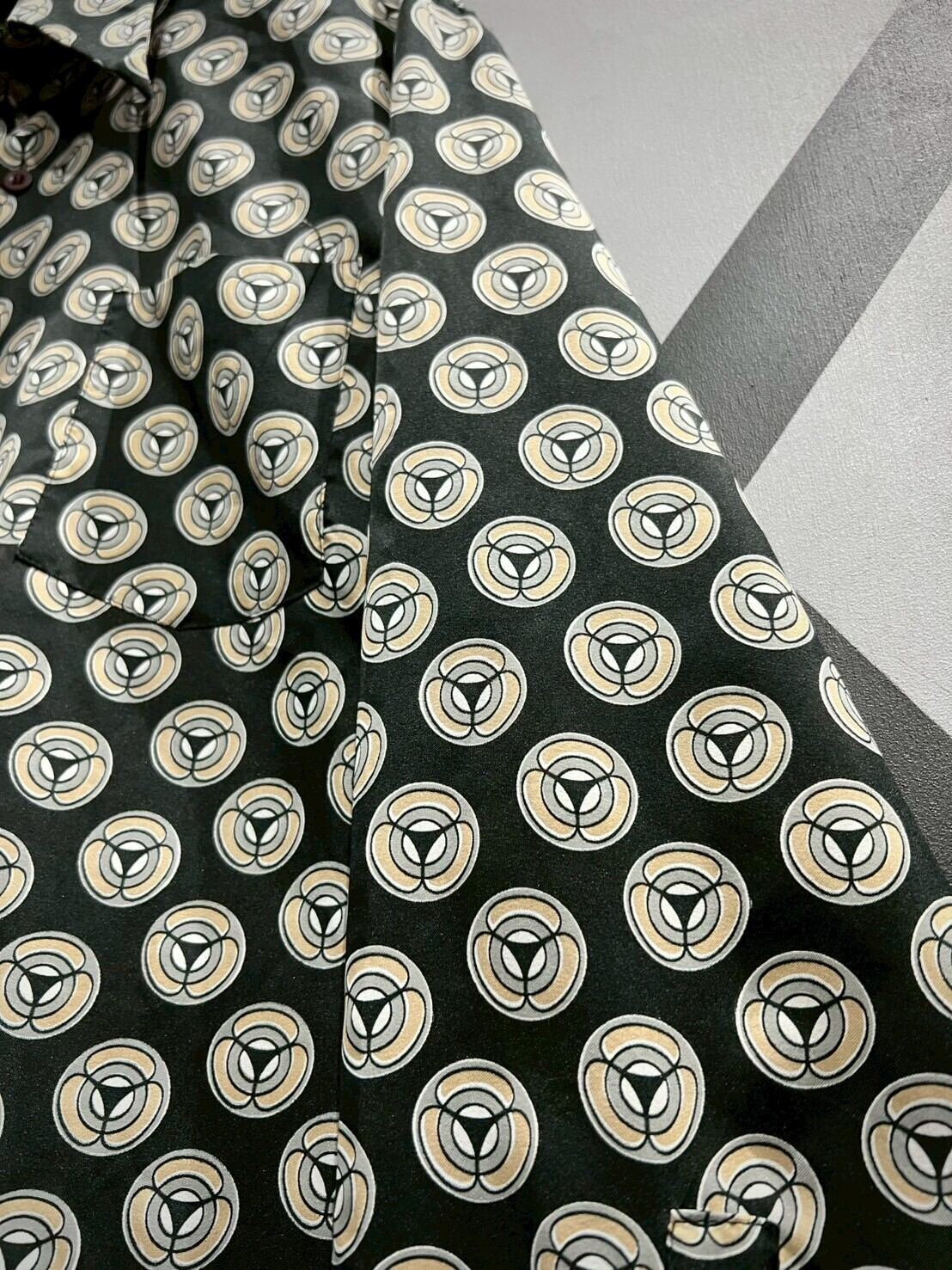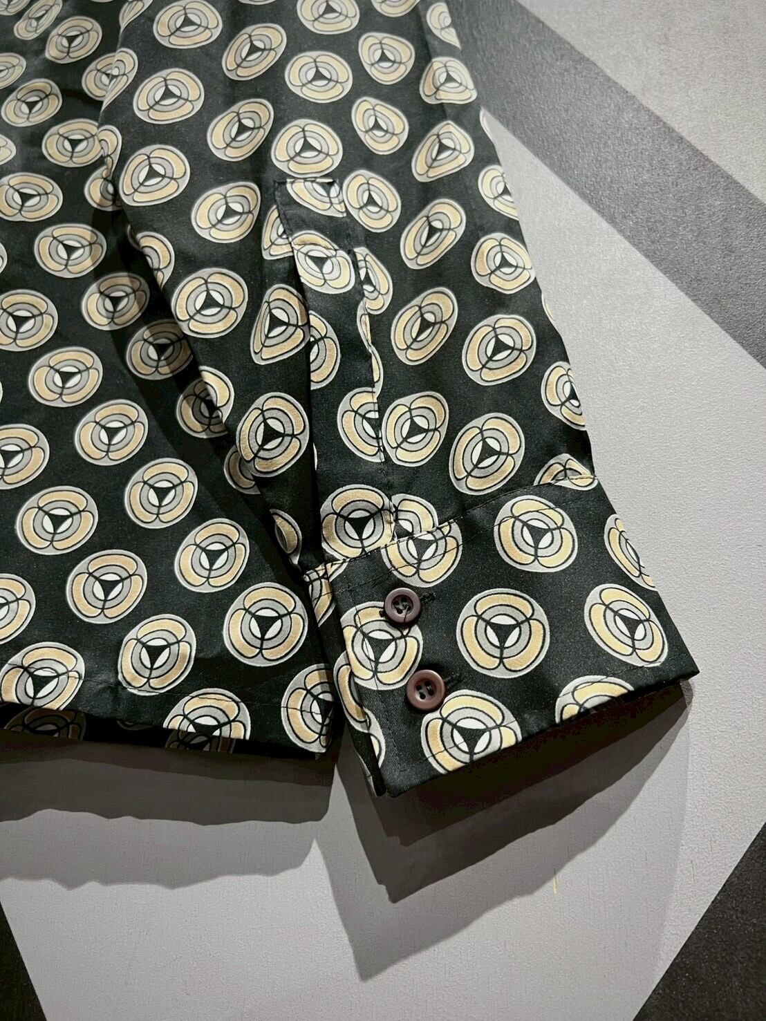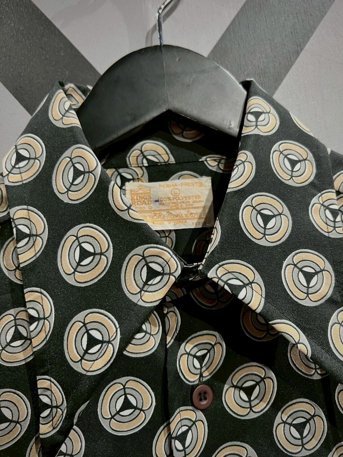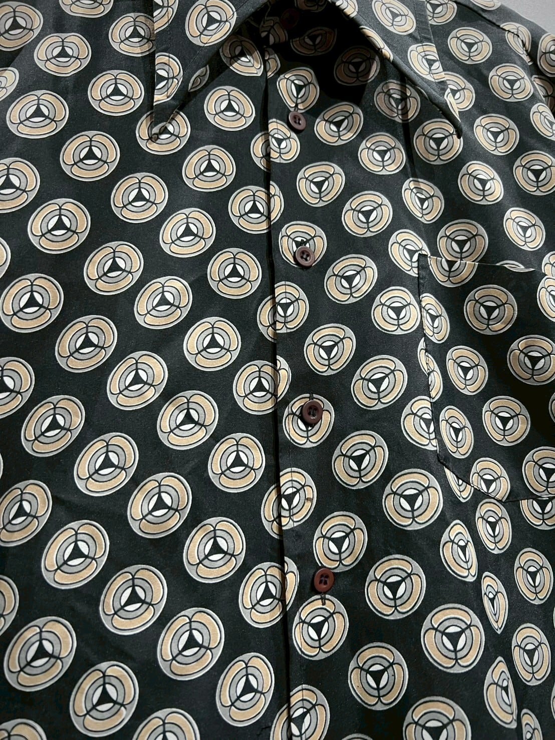 軽やかなポリエステルのボディに、円状のグラフィックを載せた70's ヴィンテージの長袖シャツ。