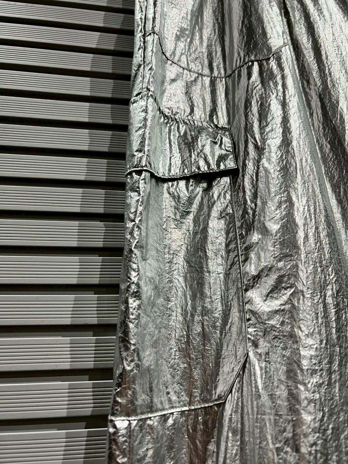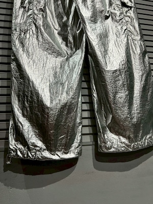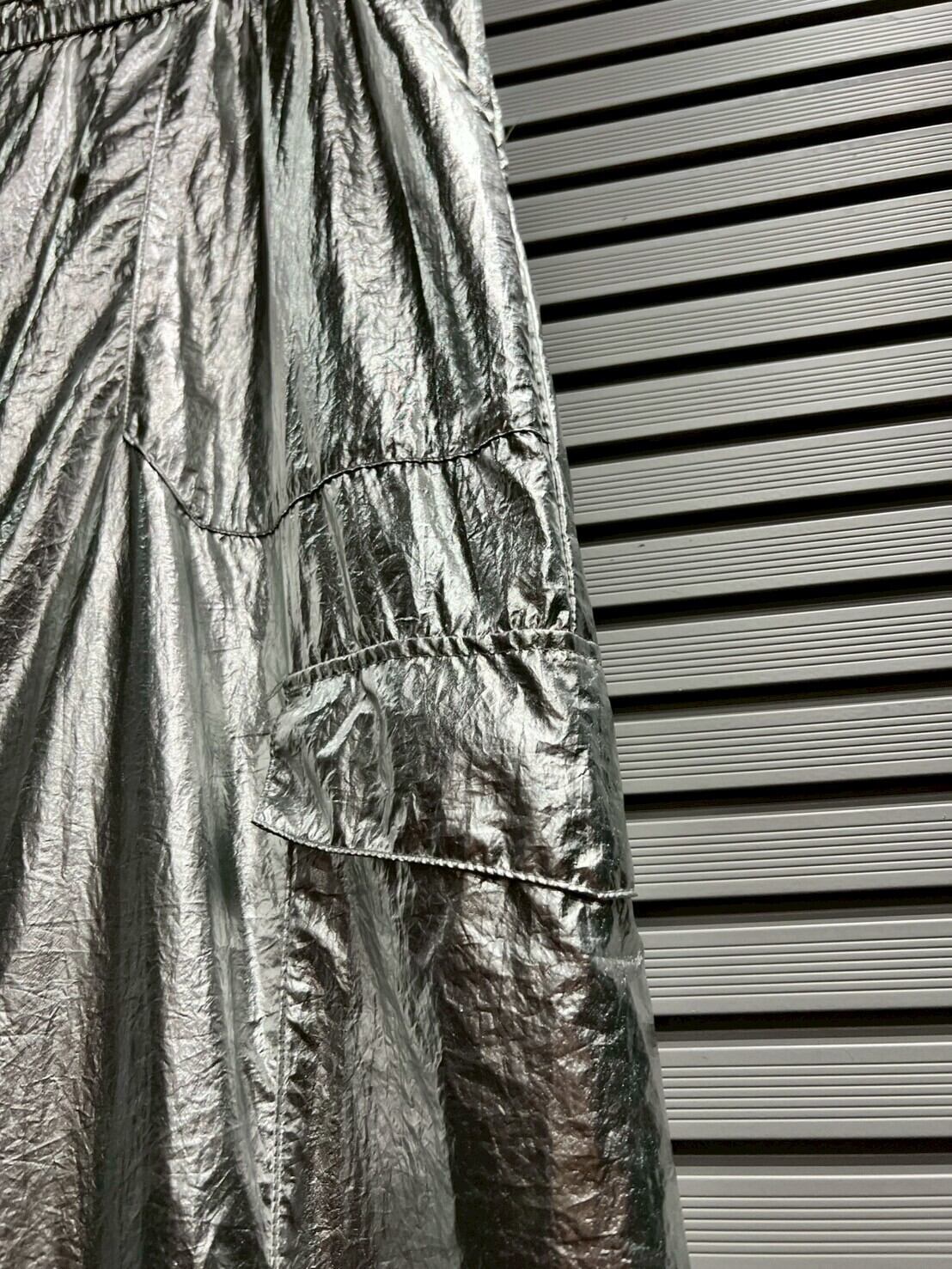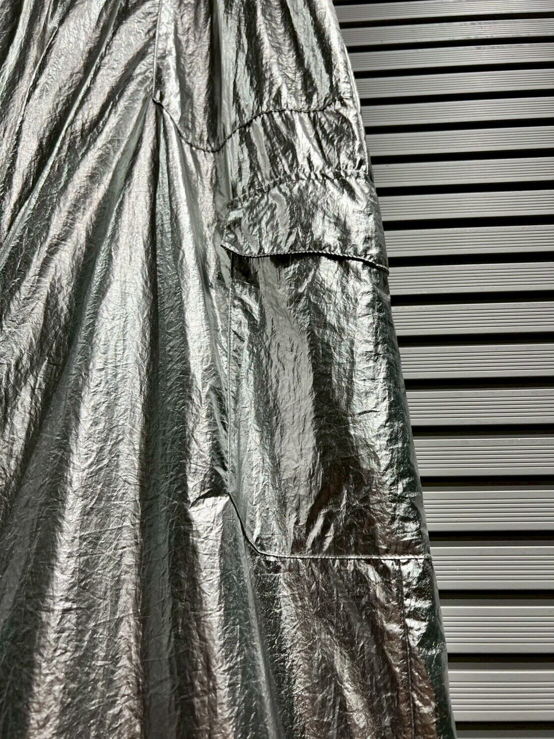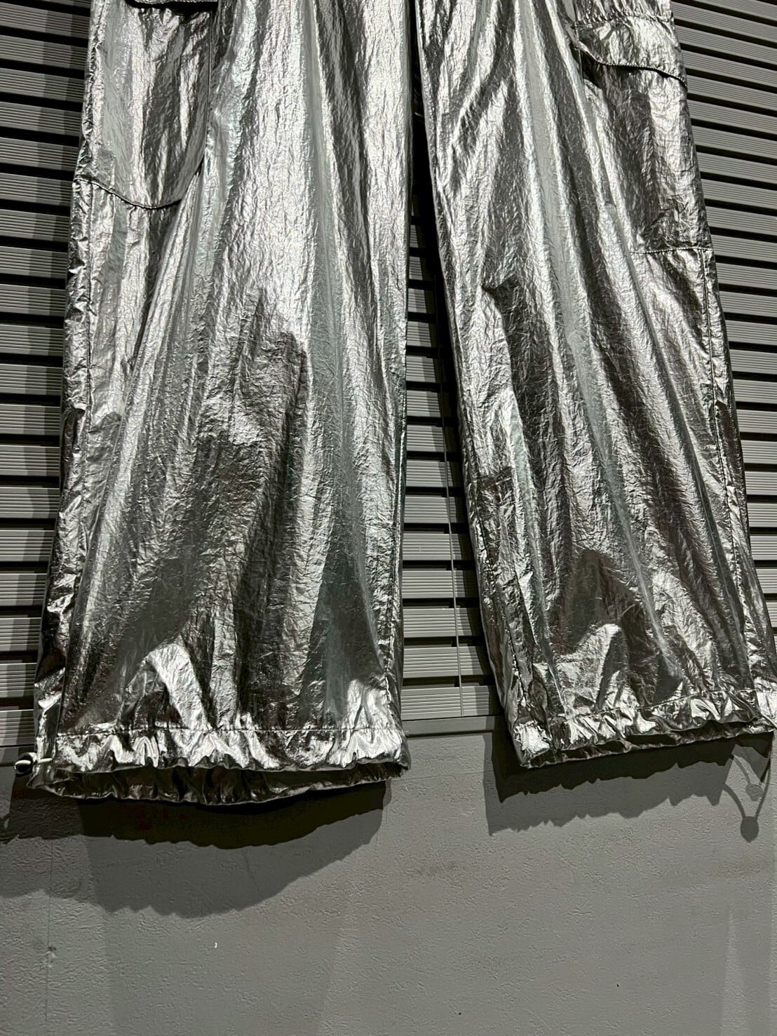 眩い光沢を放つシルバーのナイロンを用いたカーゴパンツ。