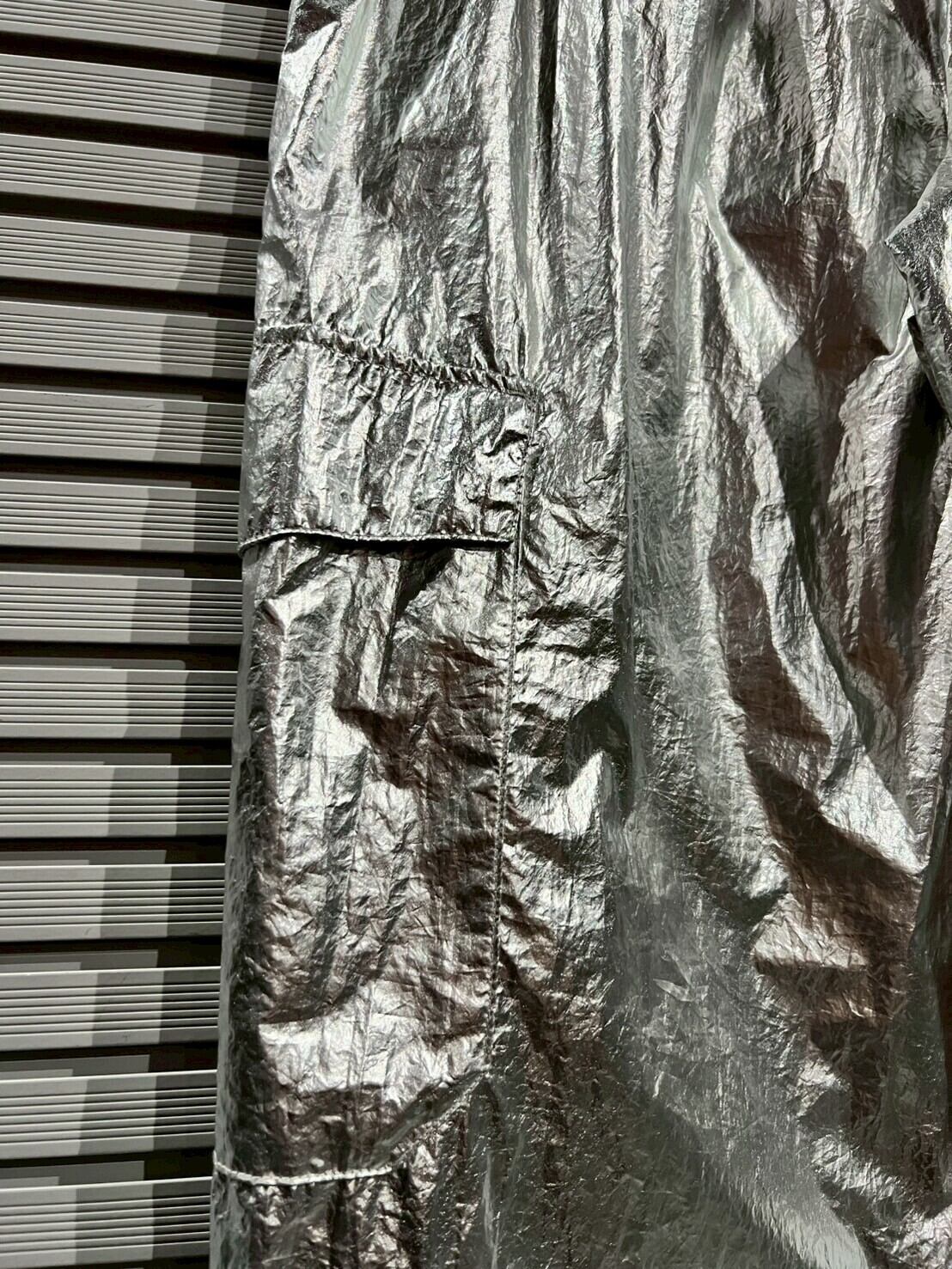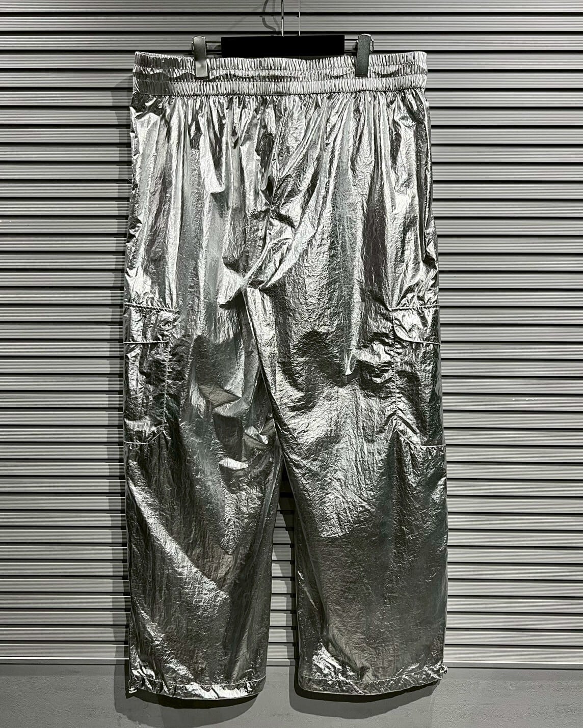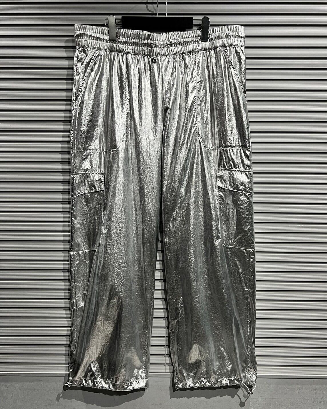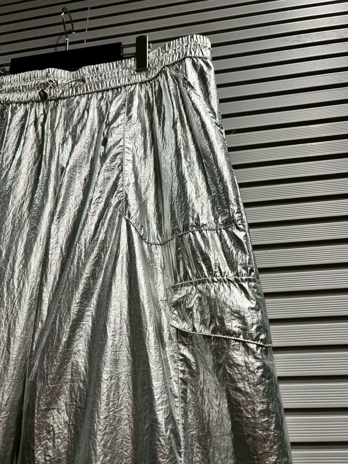 眩い光沢を放つシルバーのナイロンを用いたカーゴパンツ。