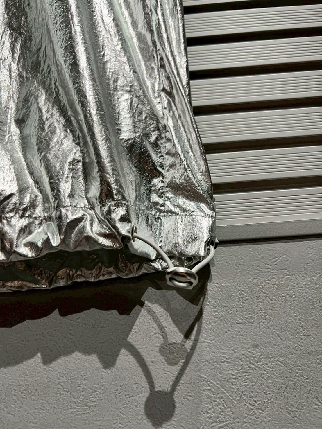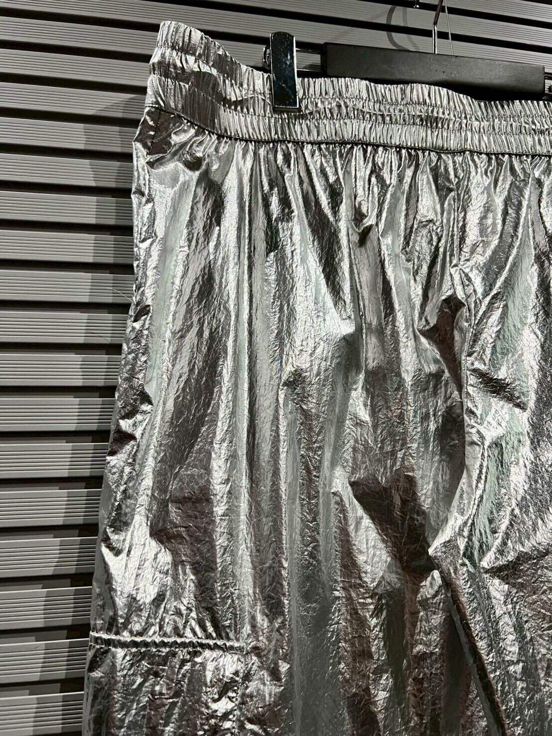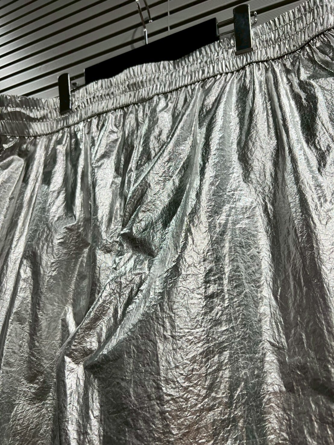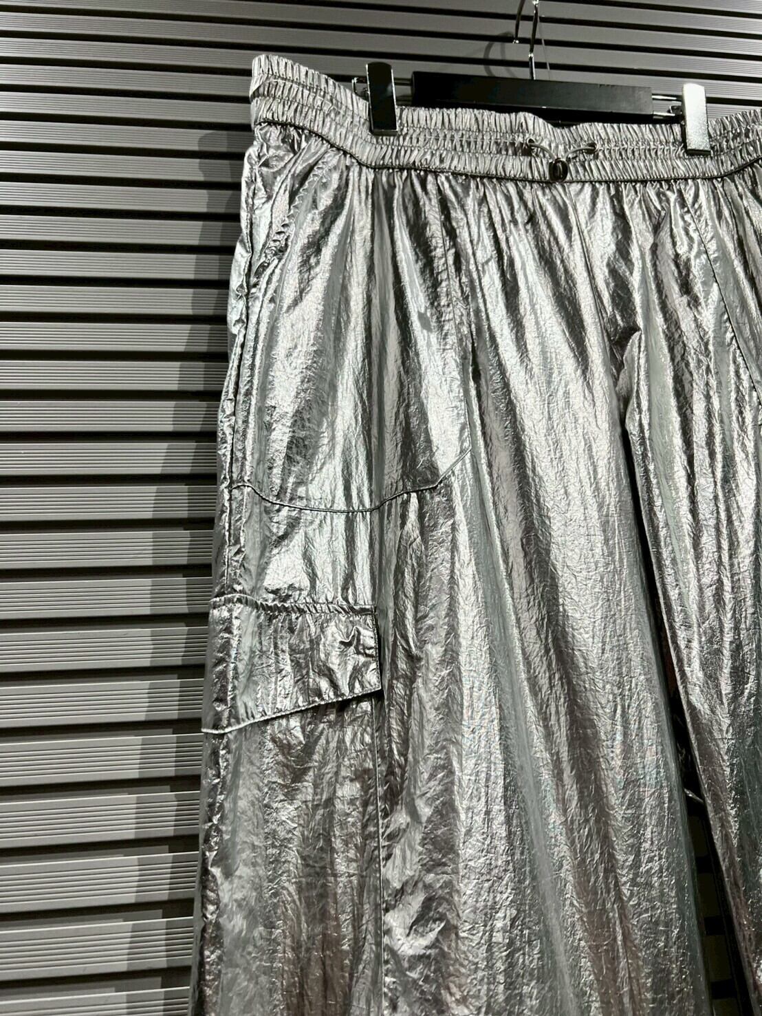 眩い光沢を放つシルバーのナイロンを用いたカーゴパンツ。