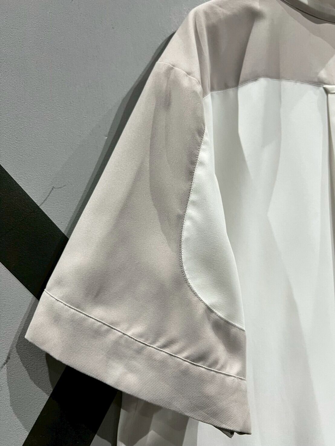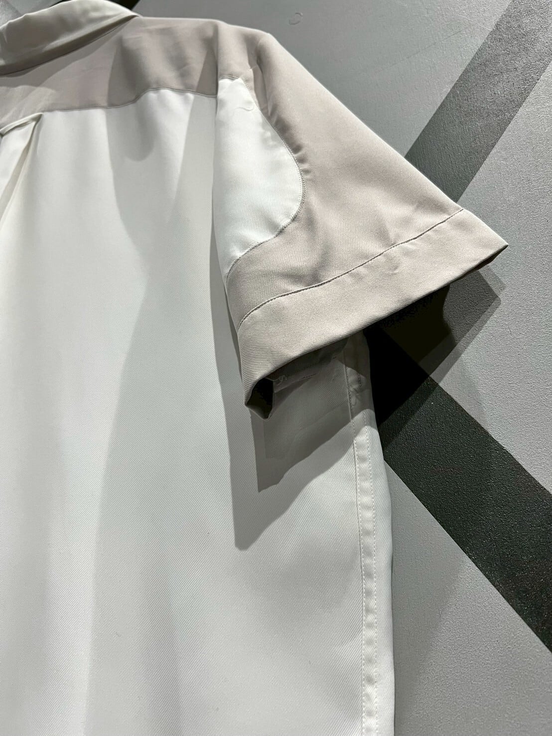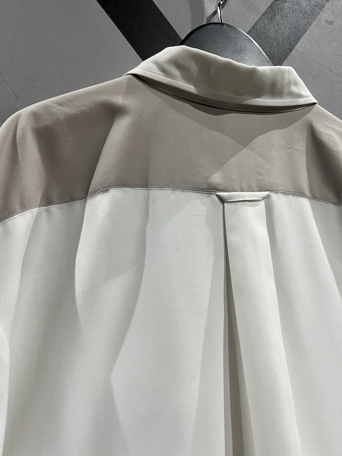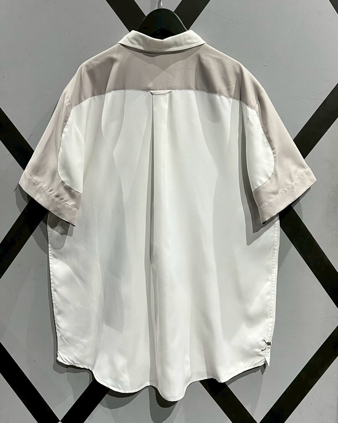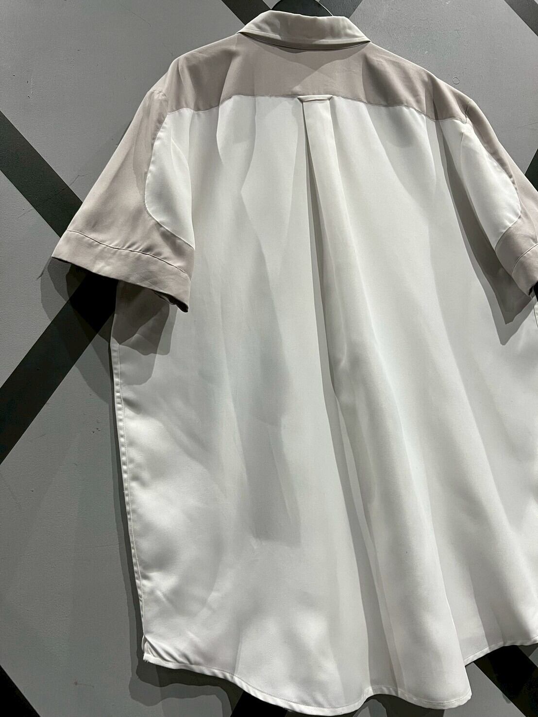 ツルッと滑らかなポリを用いて、白×ベージュでボディを切り替えた半袖シャツ。