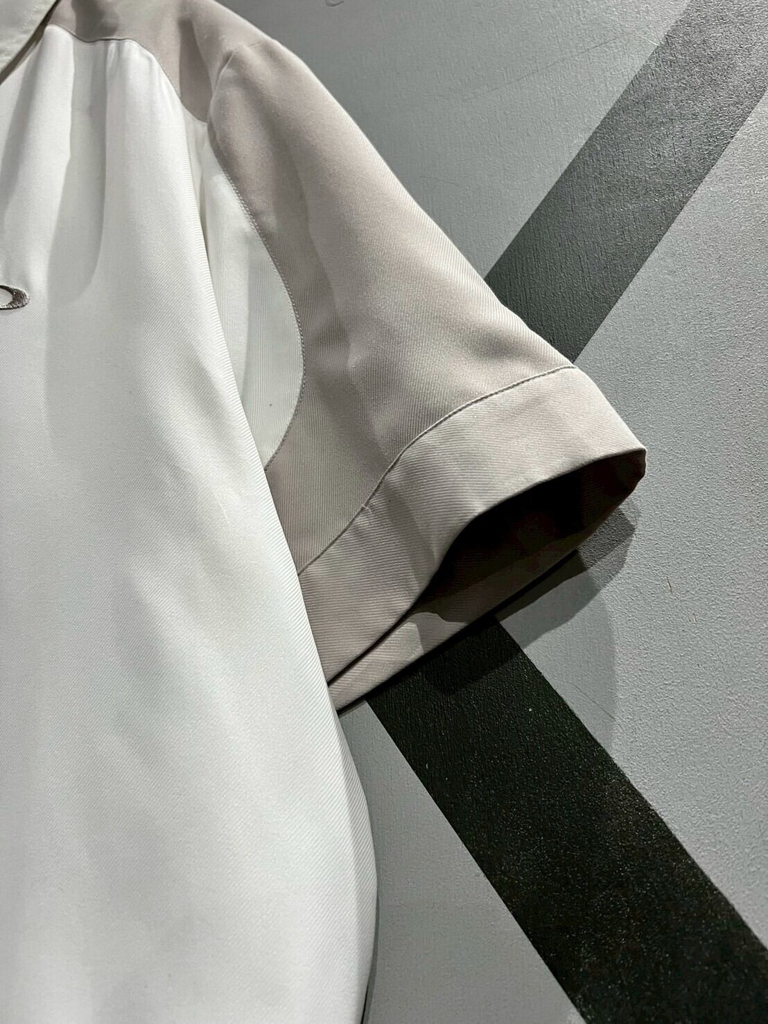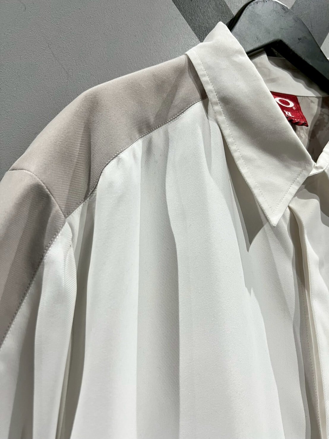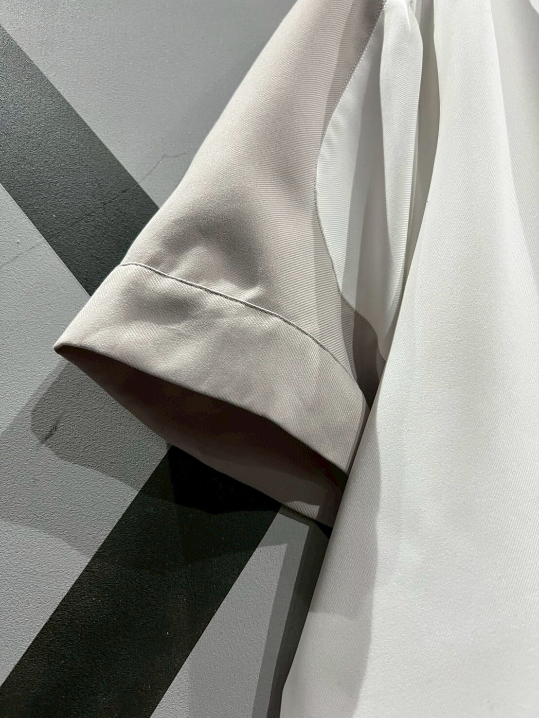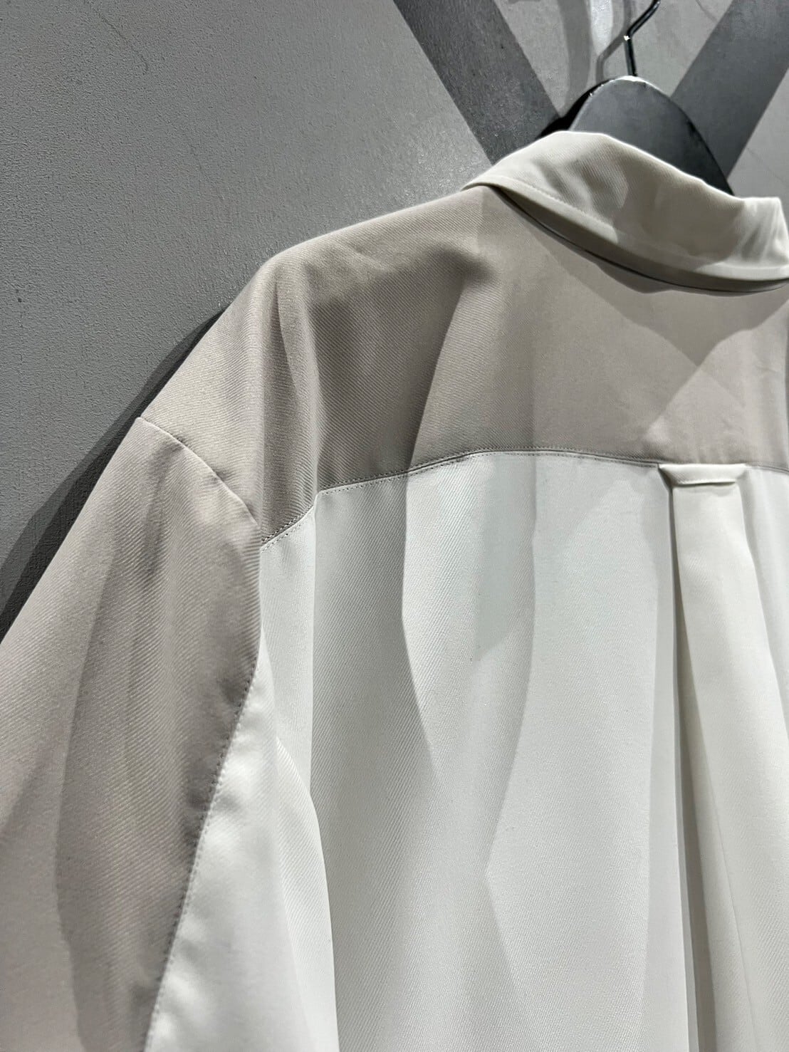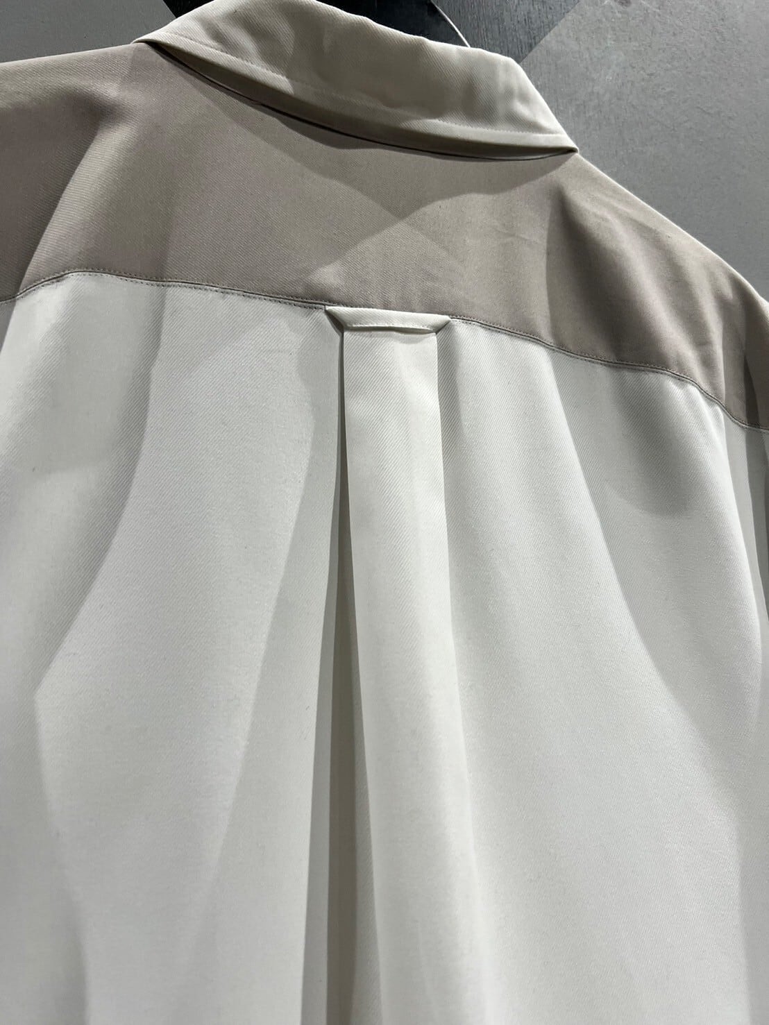 ツルッと滑らかなポリを用いて、白×ベージュでボディを切り替えた半袖シャツ。