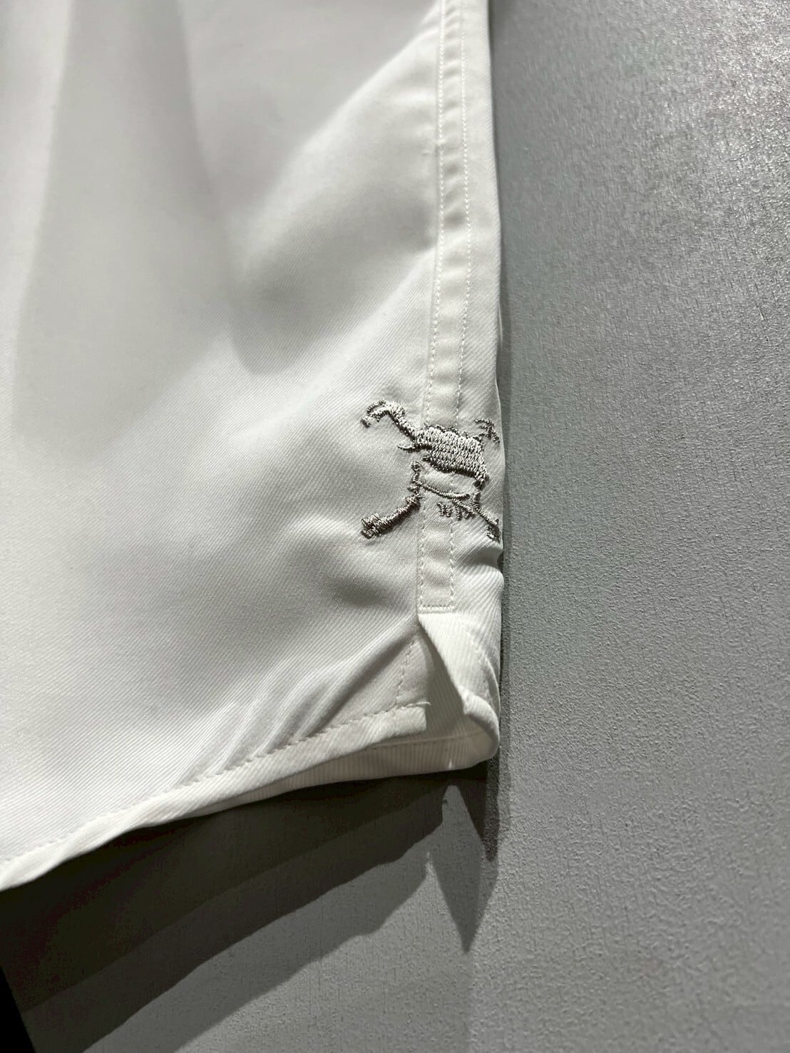 左胸には立体的なロゴ刺繍、フロントは比翼仕立てで、ミニマルで洗練されたデザインに仕上げられています。