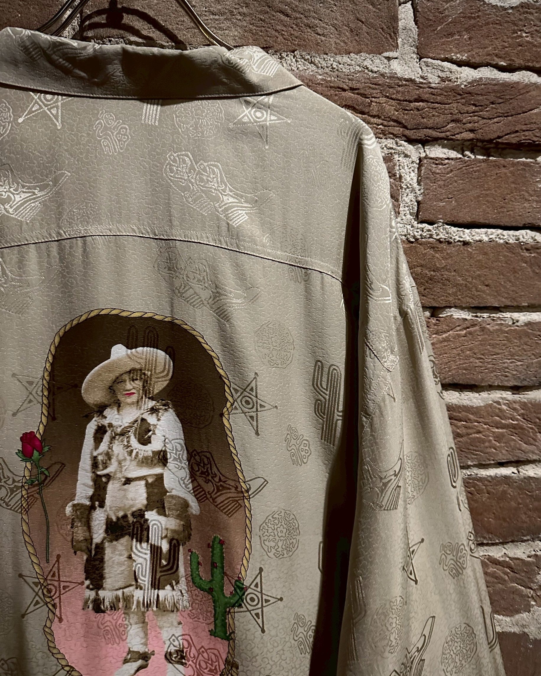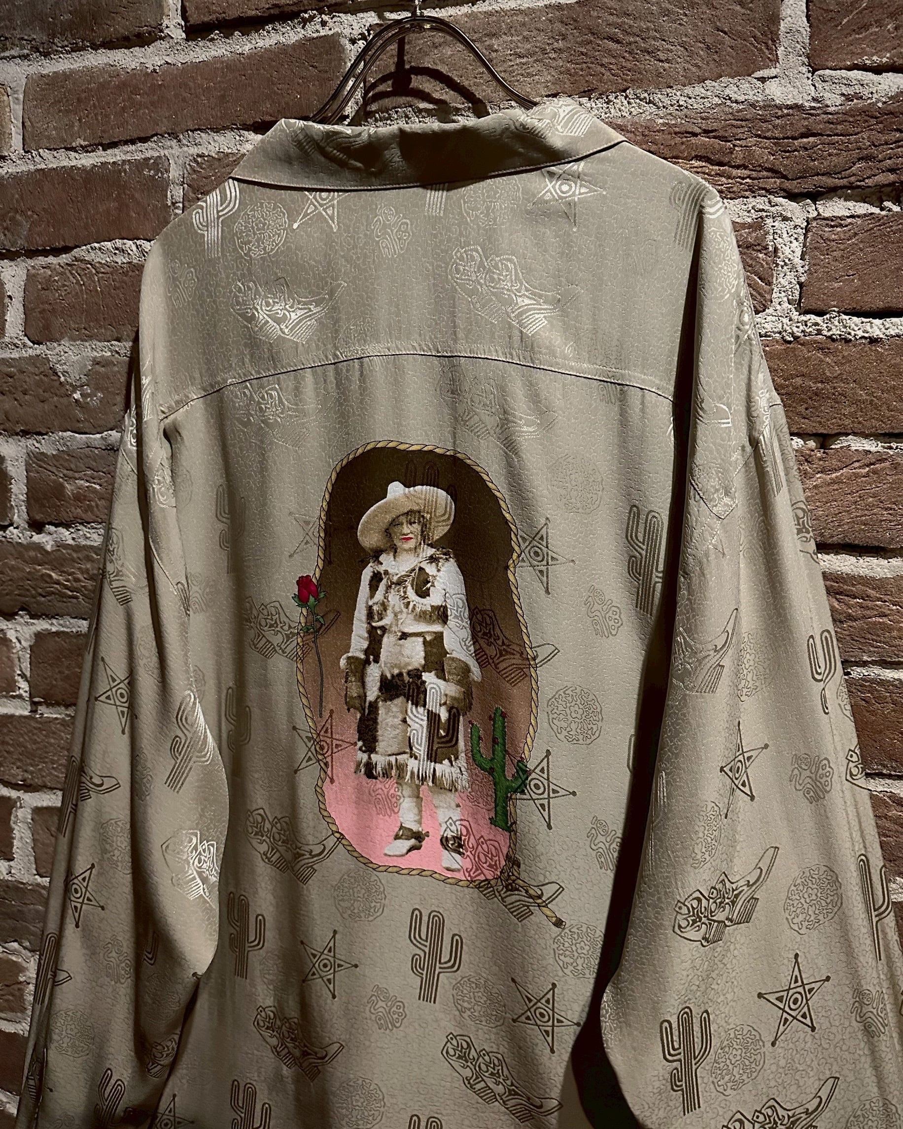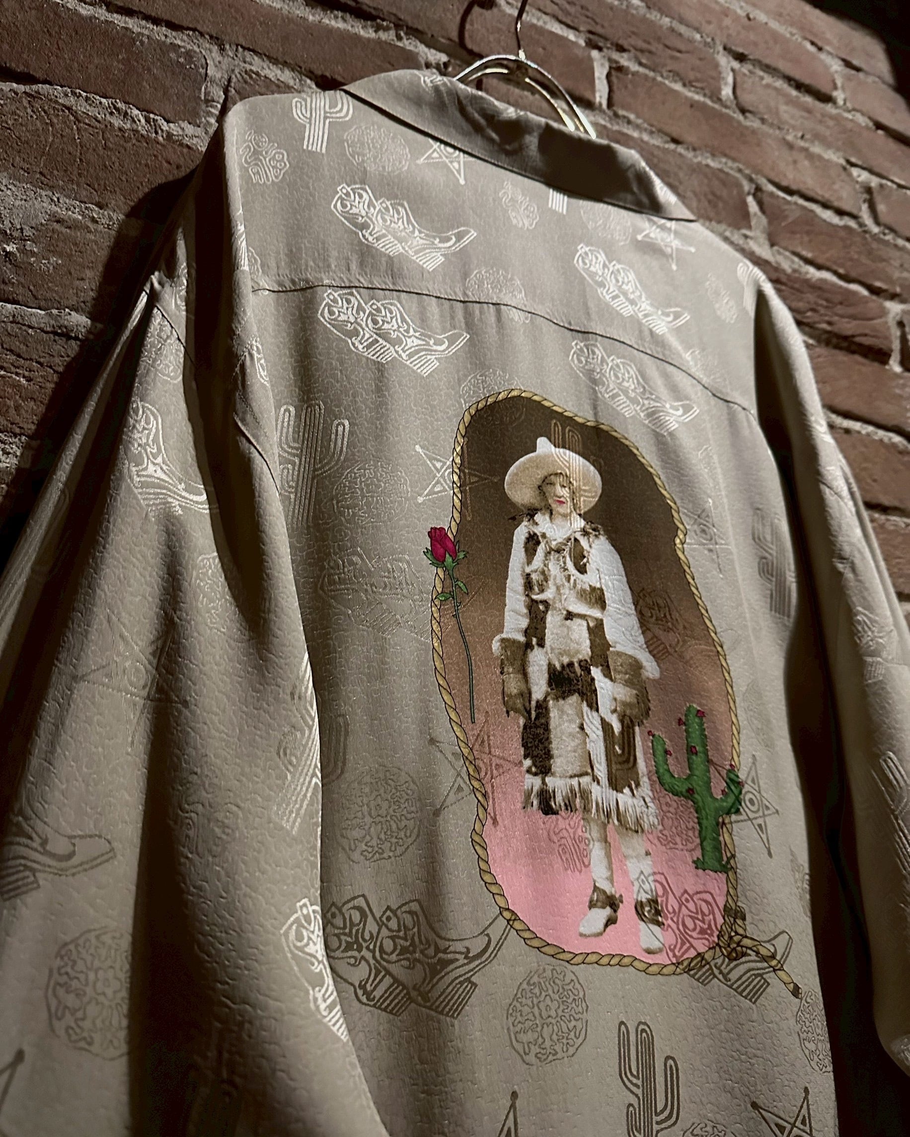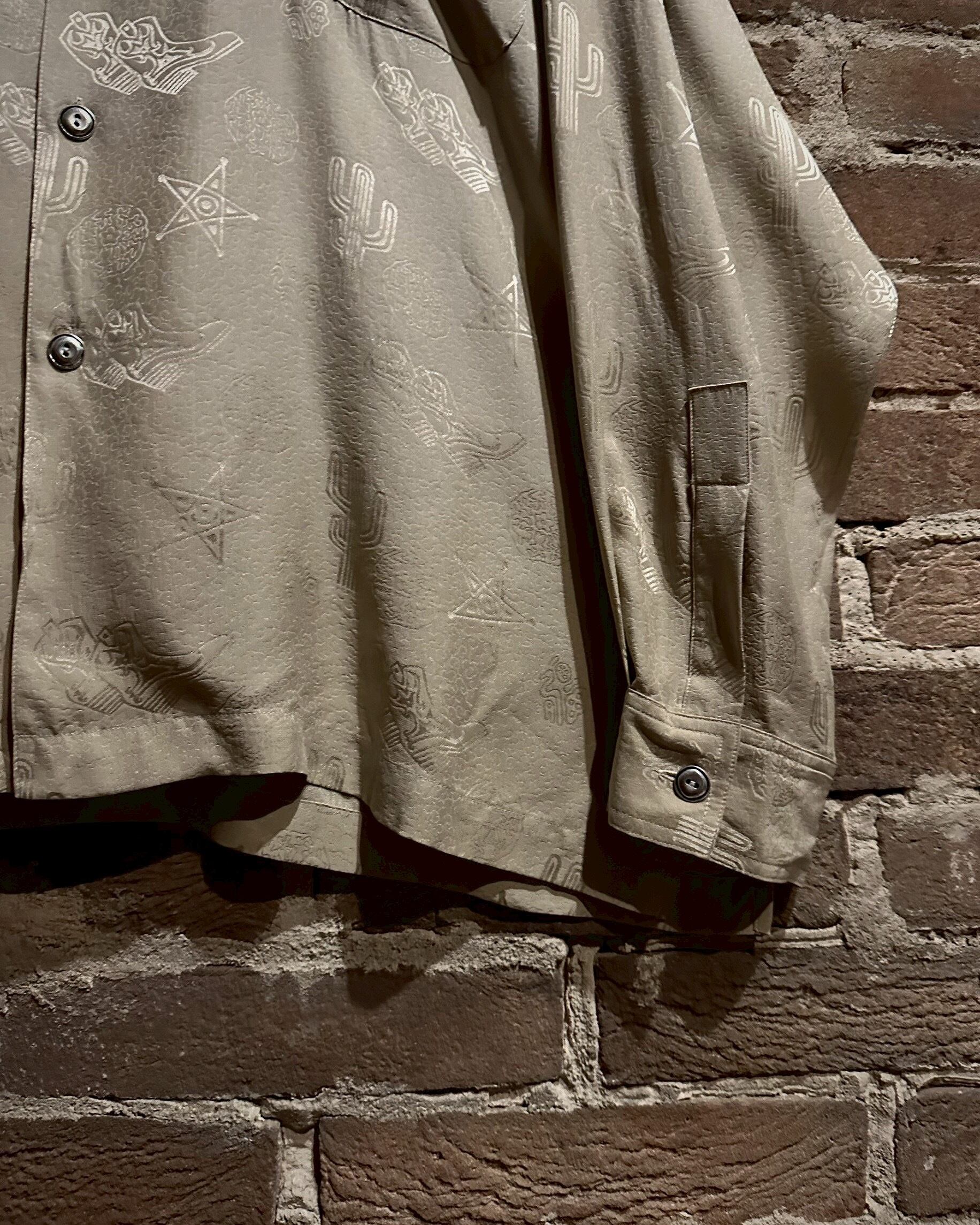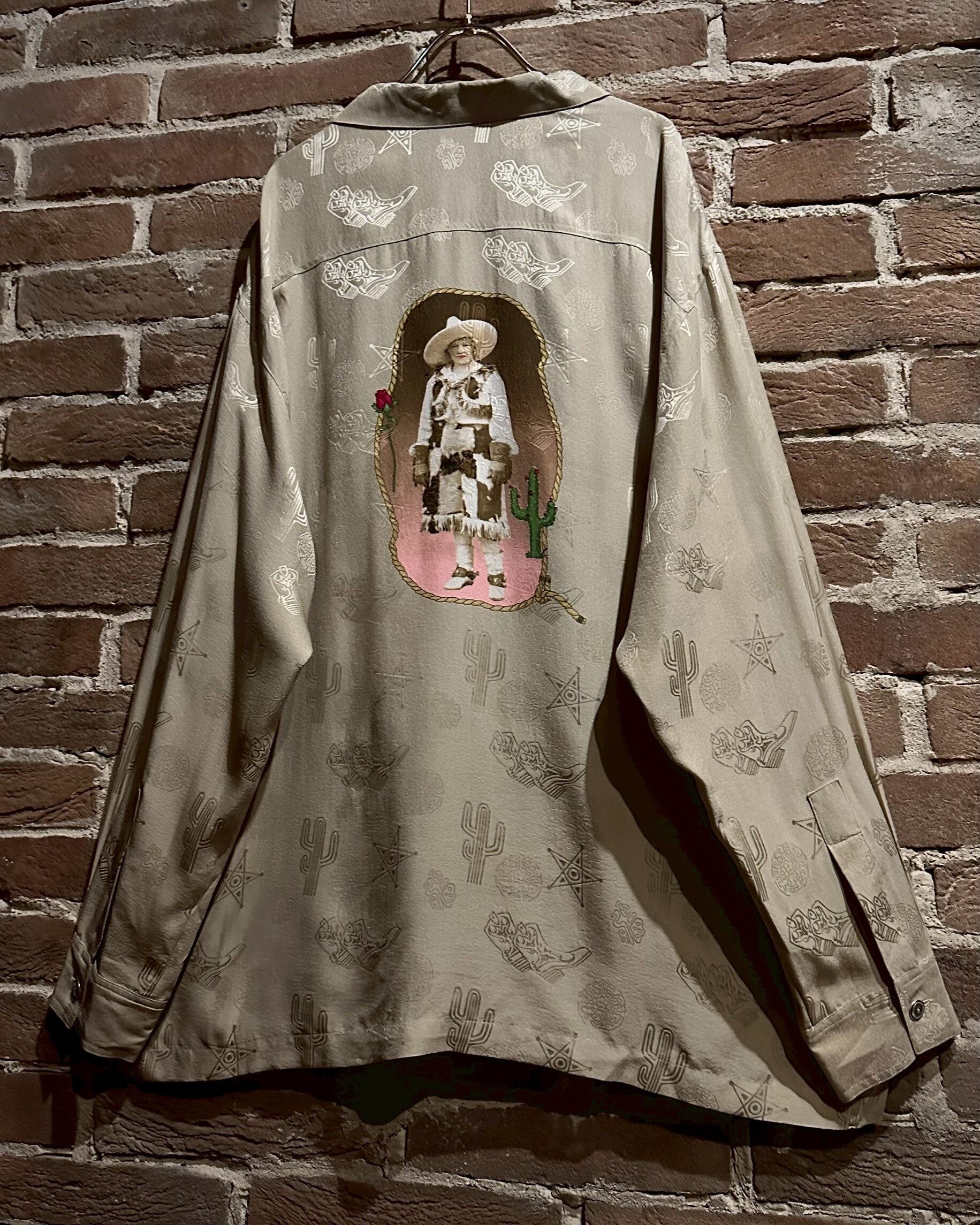 ウエスタンブーツやサボテン、星などウエスタンのモチーフをジャガード織りによって全面に配し、カウガールのプリントを背面に載せたオープンカラーシルクシャツ。