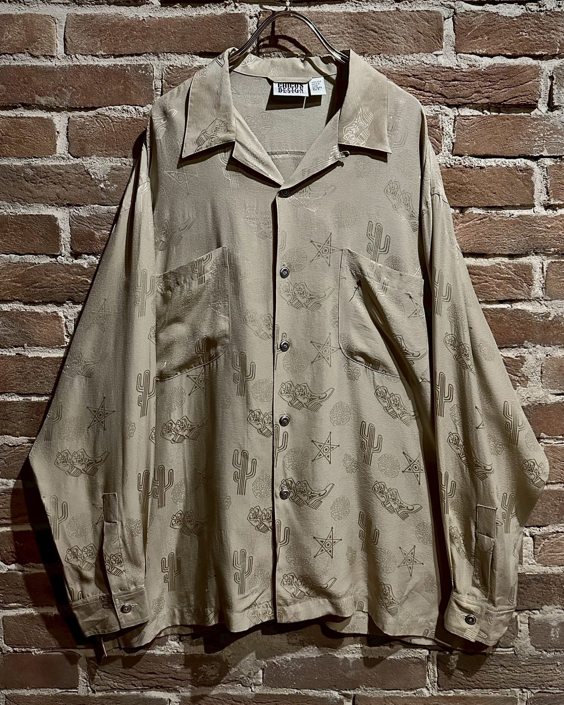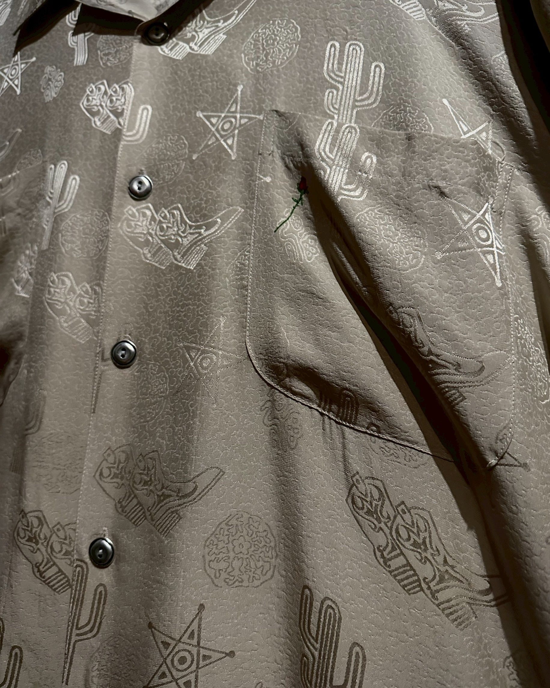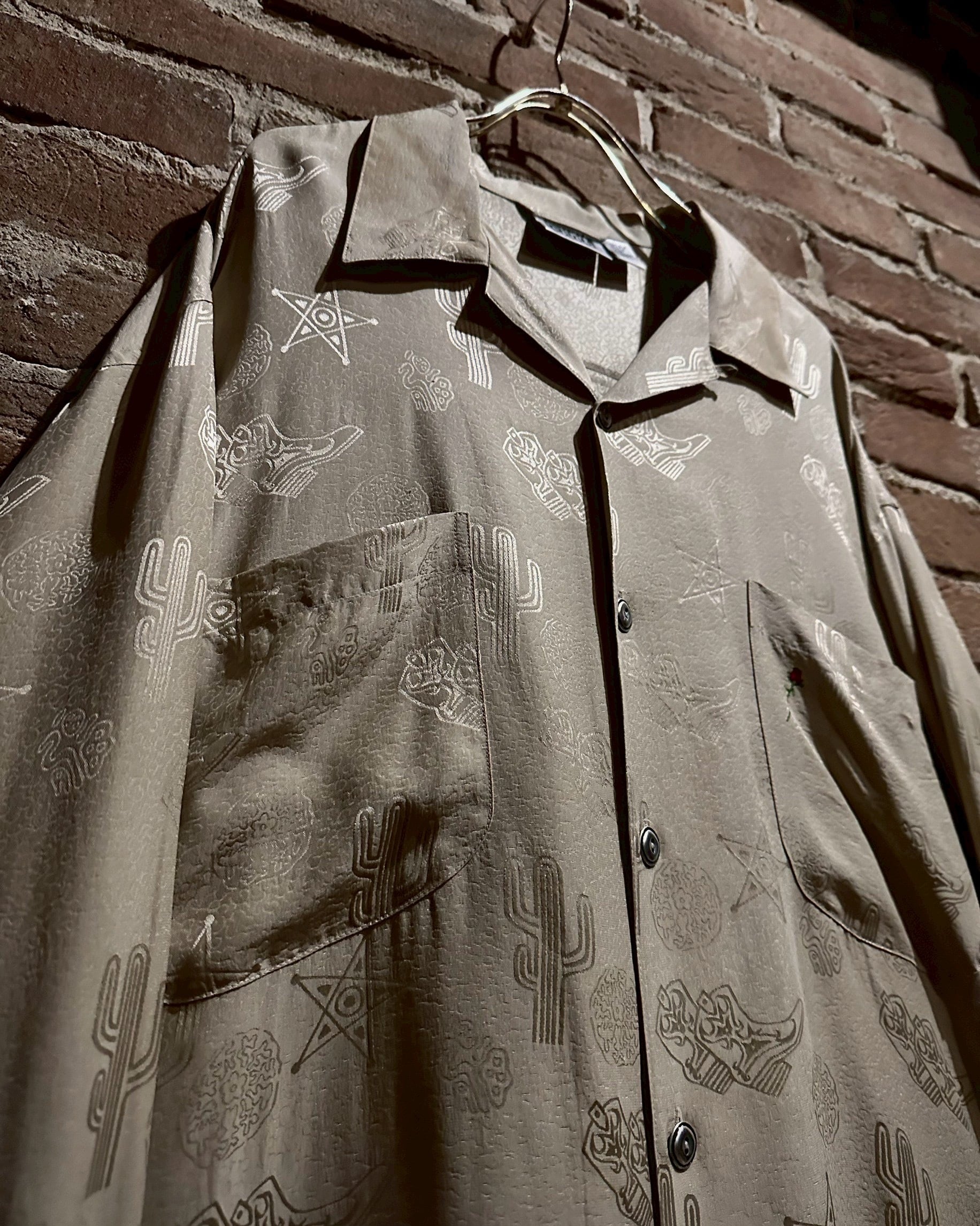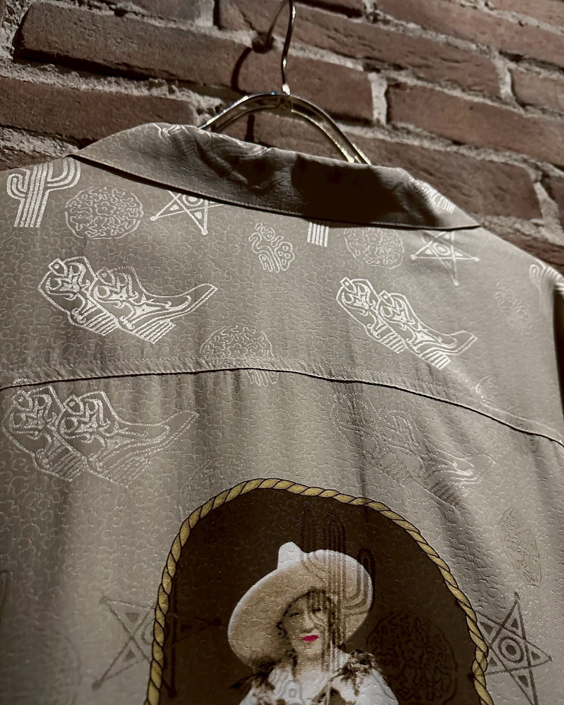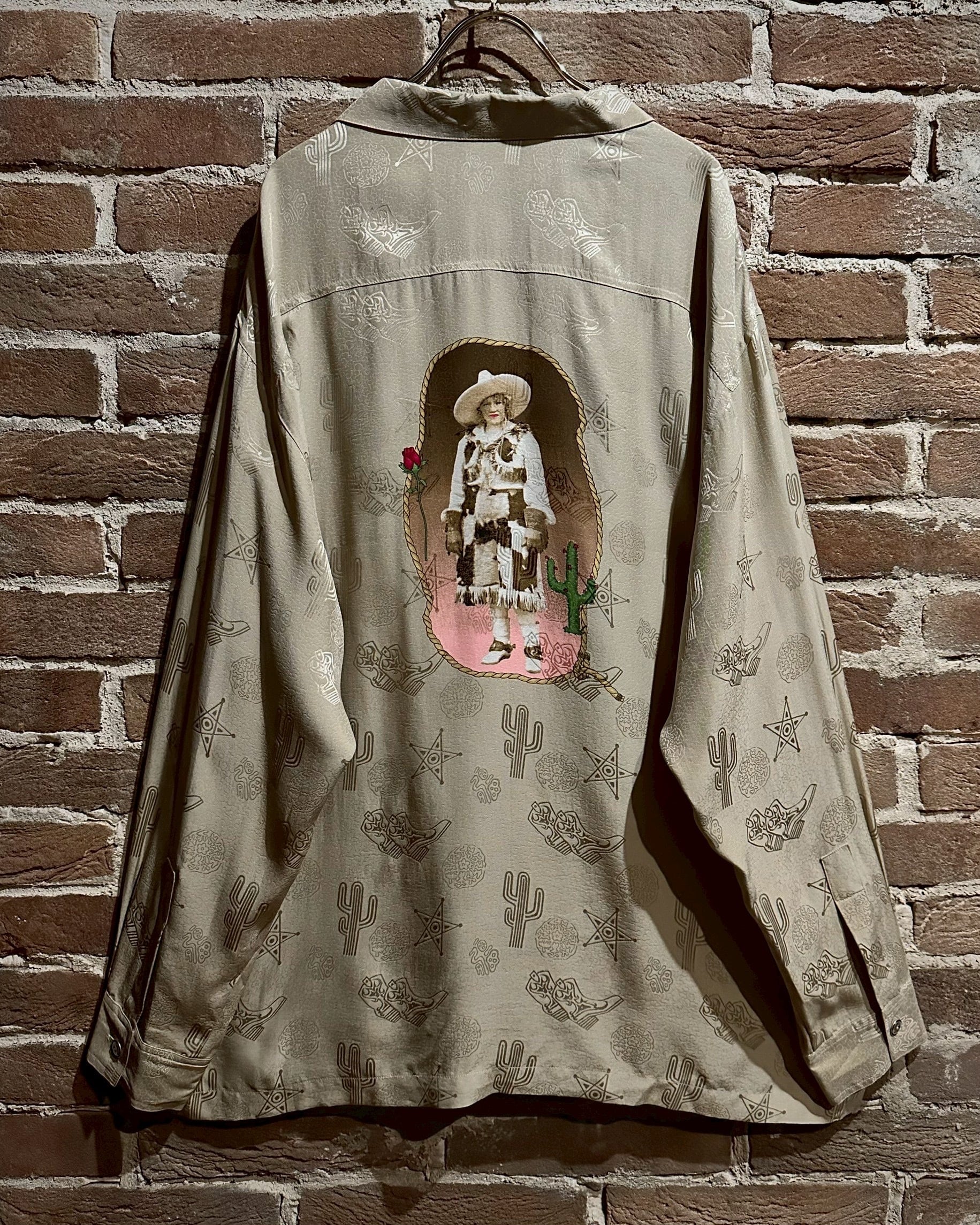 ウエスタンブーツやサボテン、星などウエスタンのモチーフをジャガード織りによって全面に配し、カウガールのプリントを背面に載せたオープンカラーシルクシャツ。