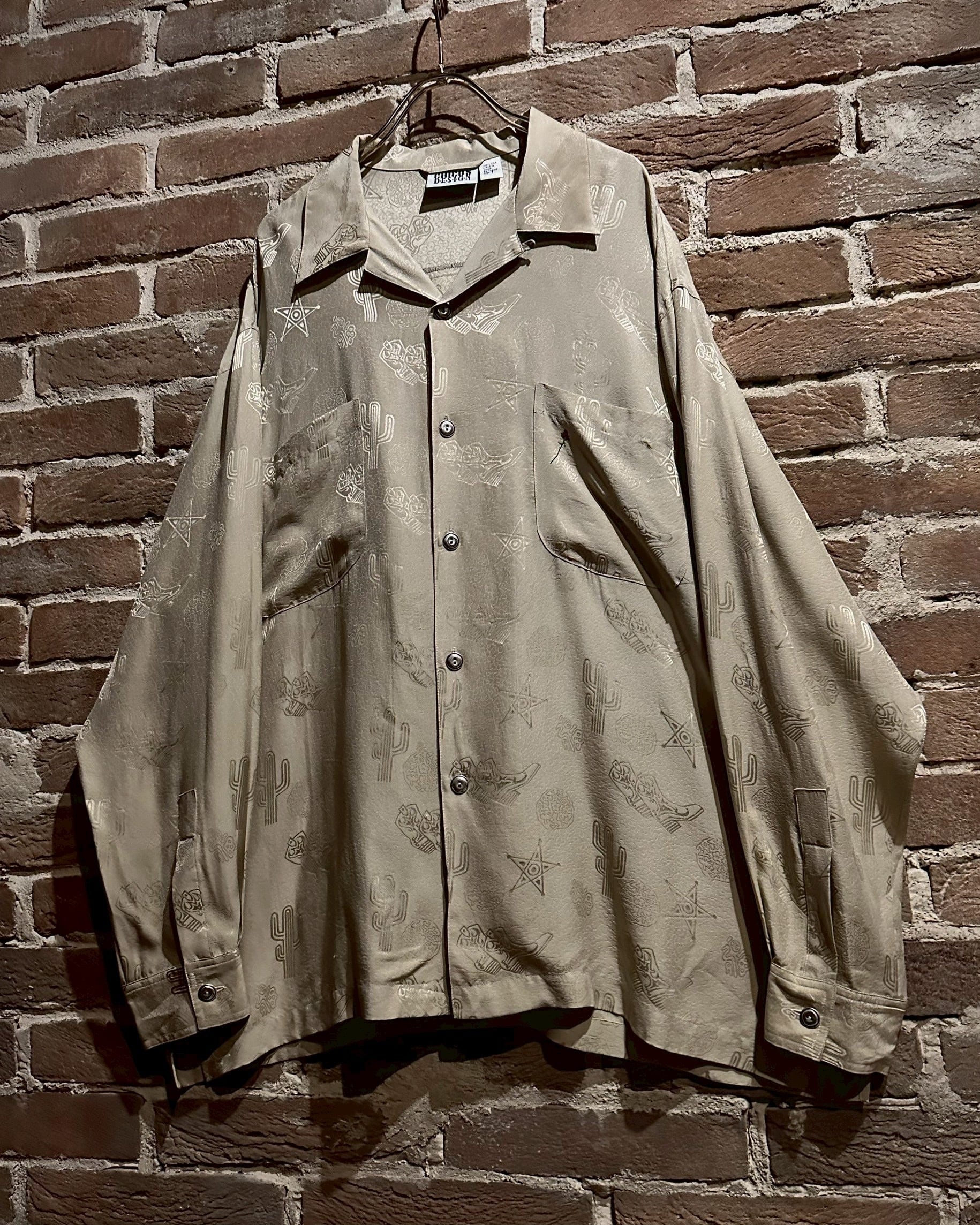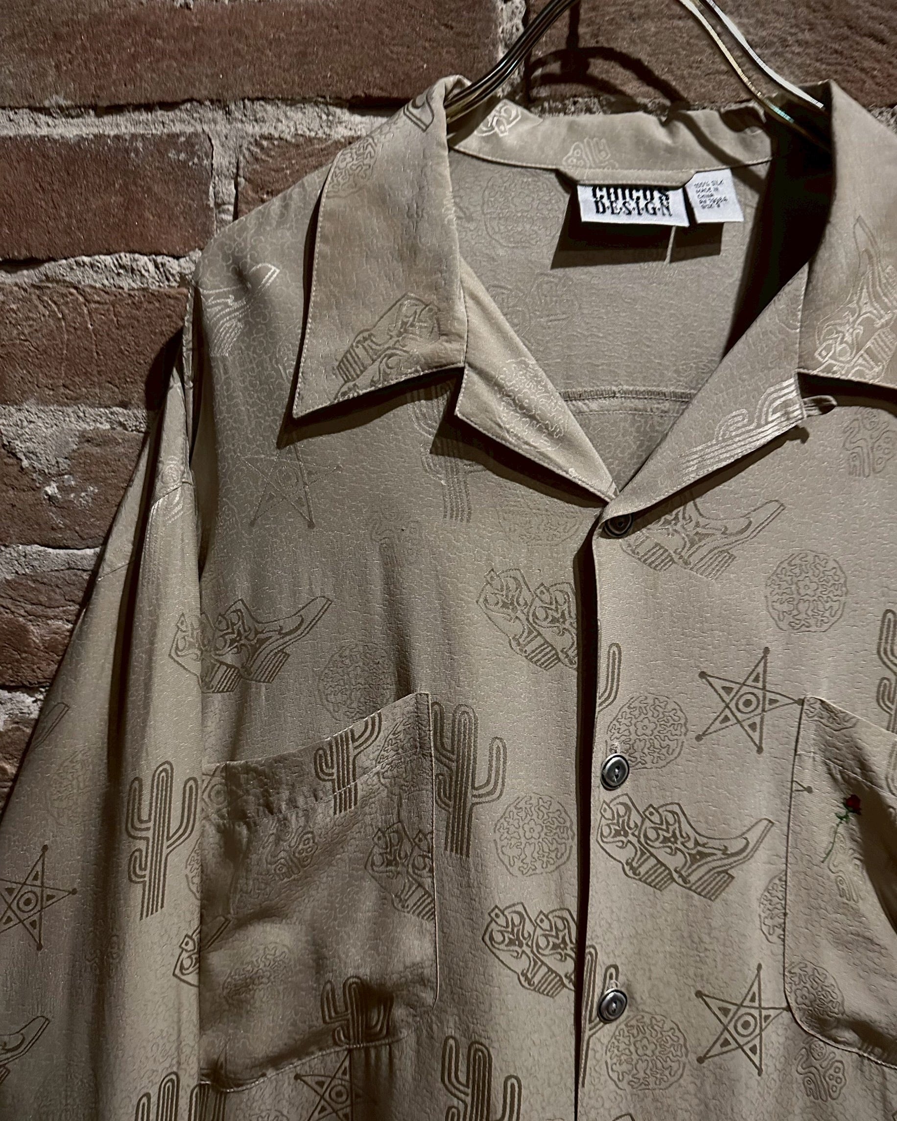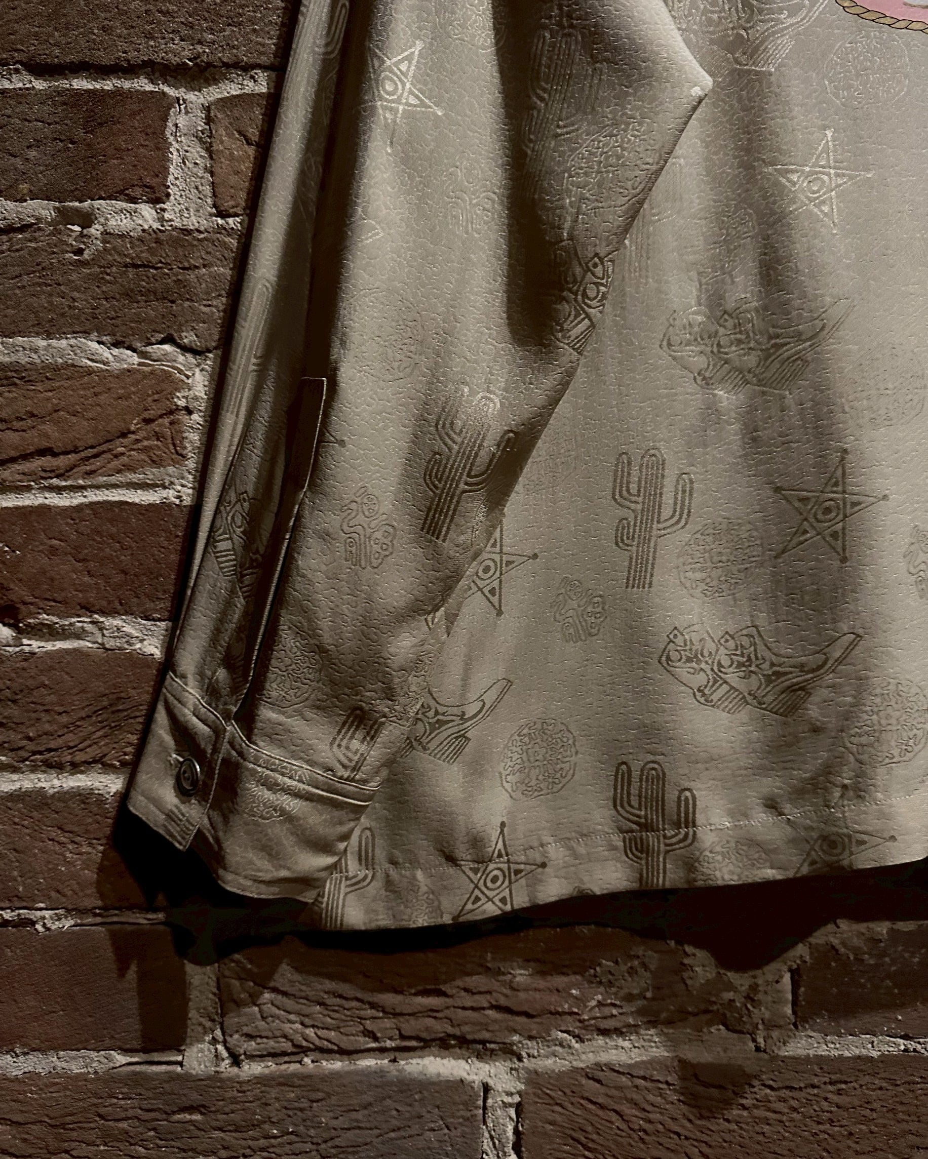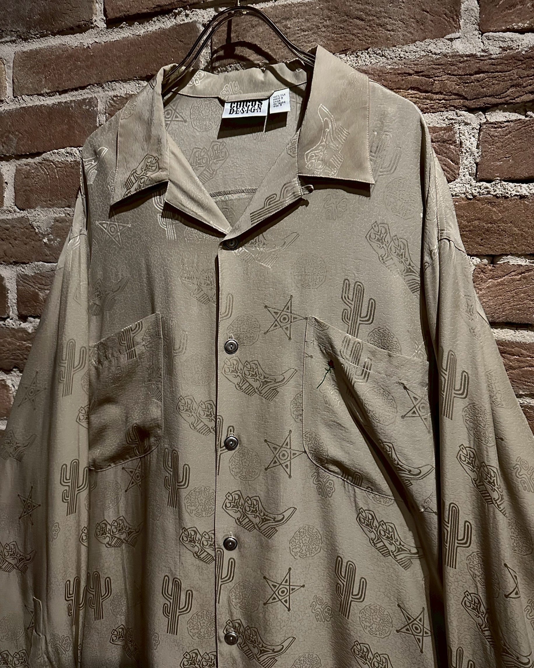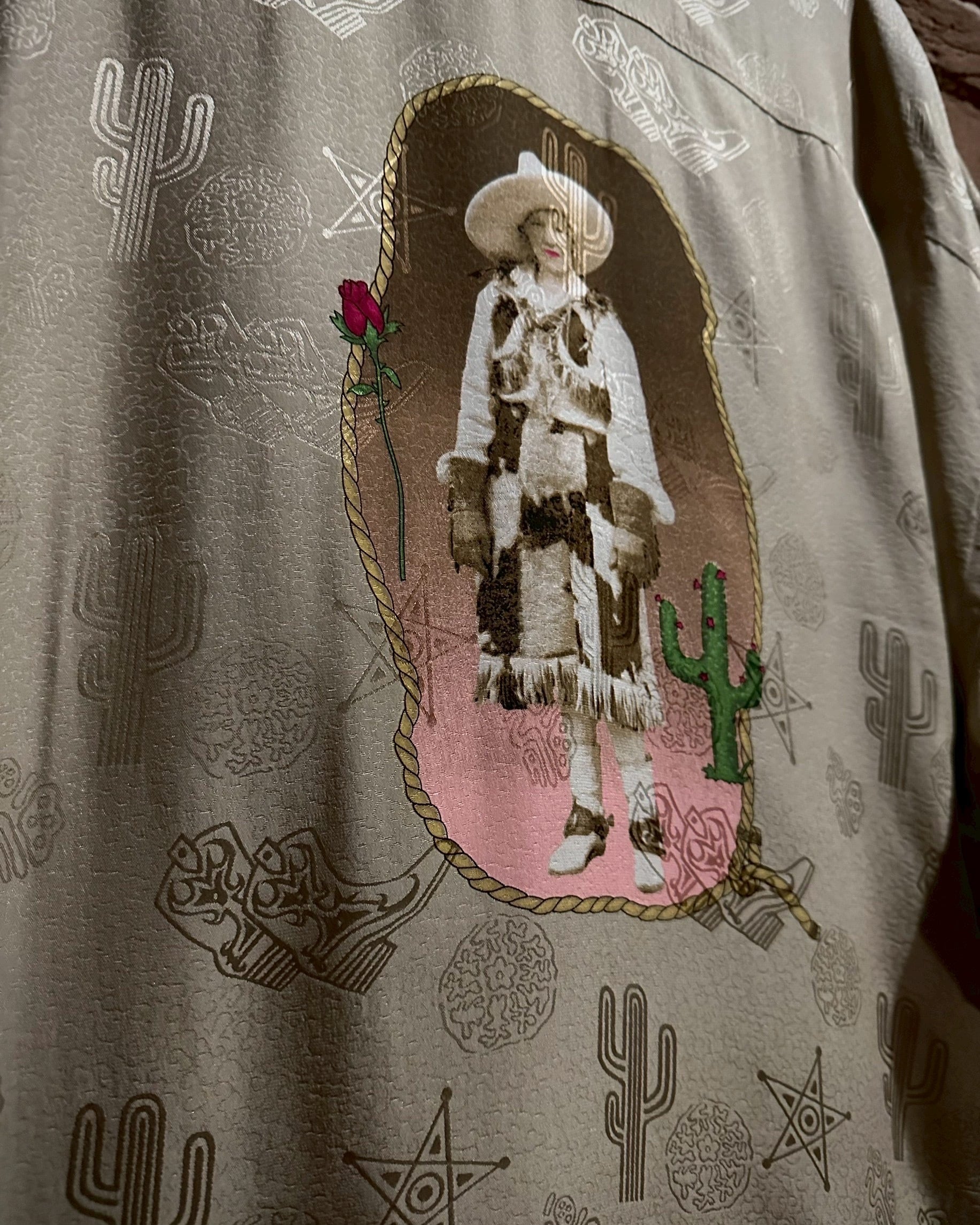 ウエスタンブーツやサボテン、星などウエスタンのモチーフをジャガード織りによって全面に配し、カウガールのプリントを背面に載せたオープンカラーシルクシャツ。