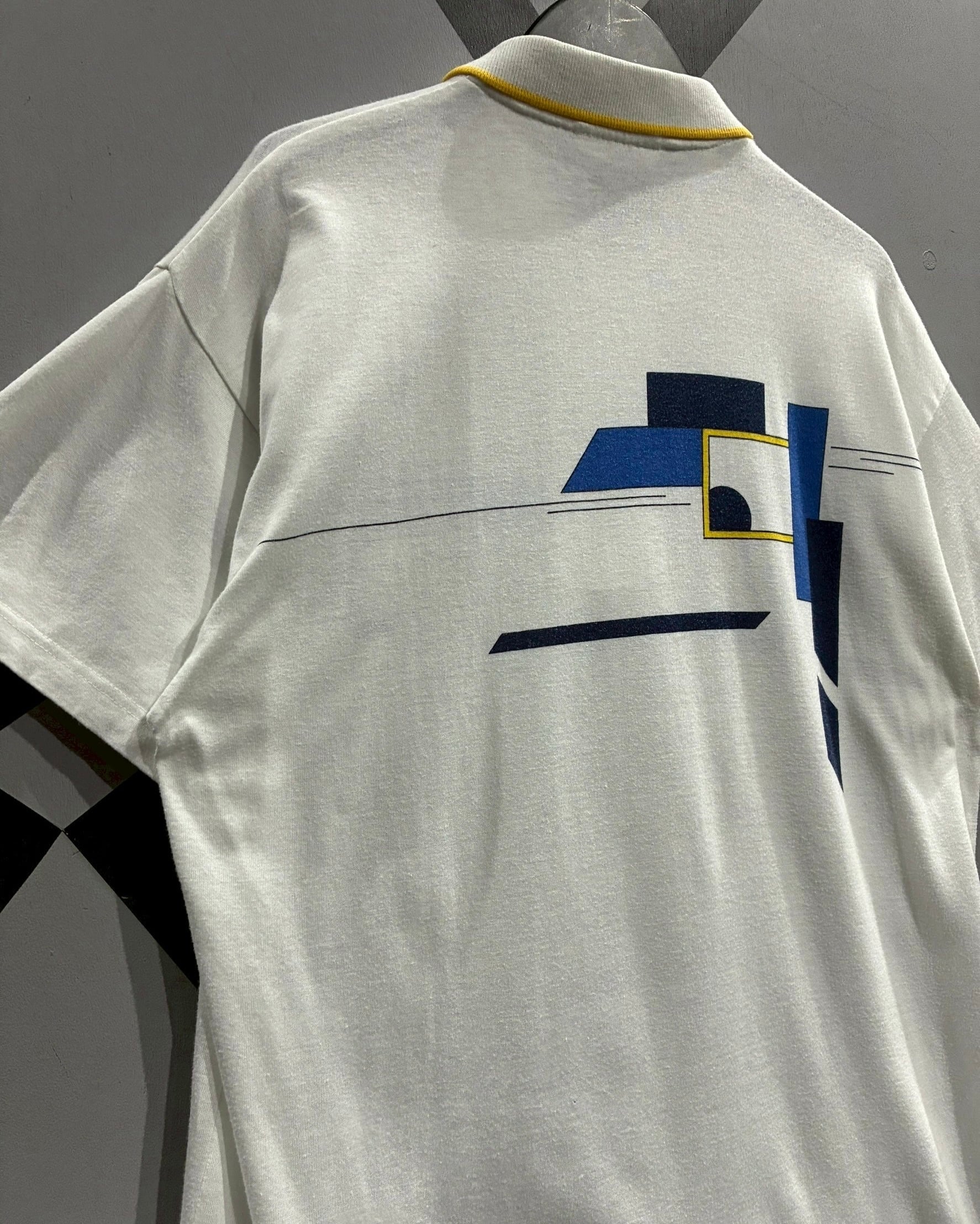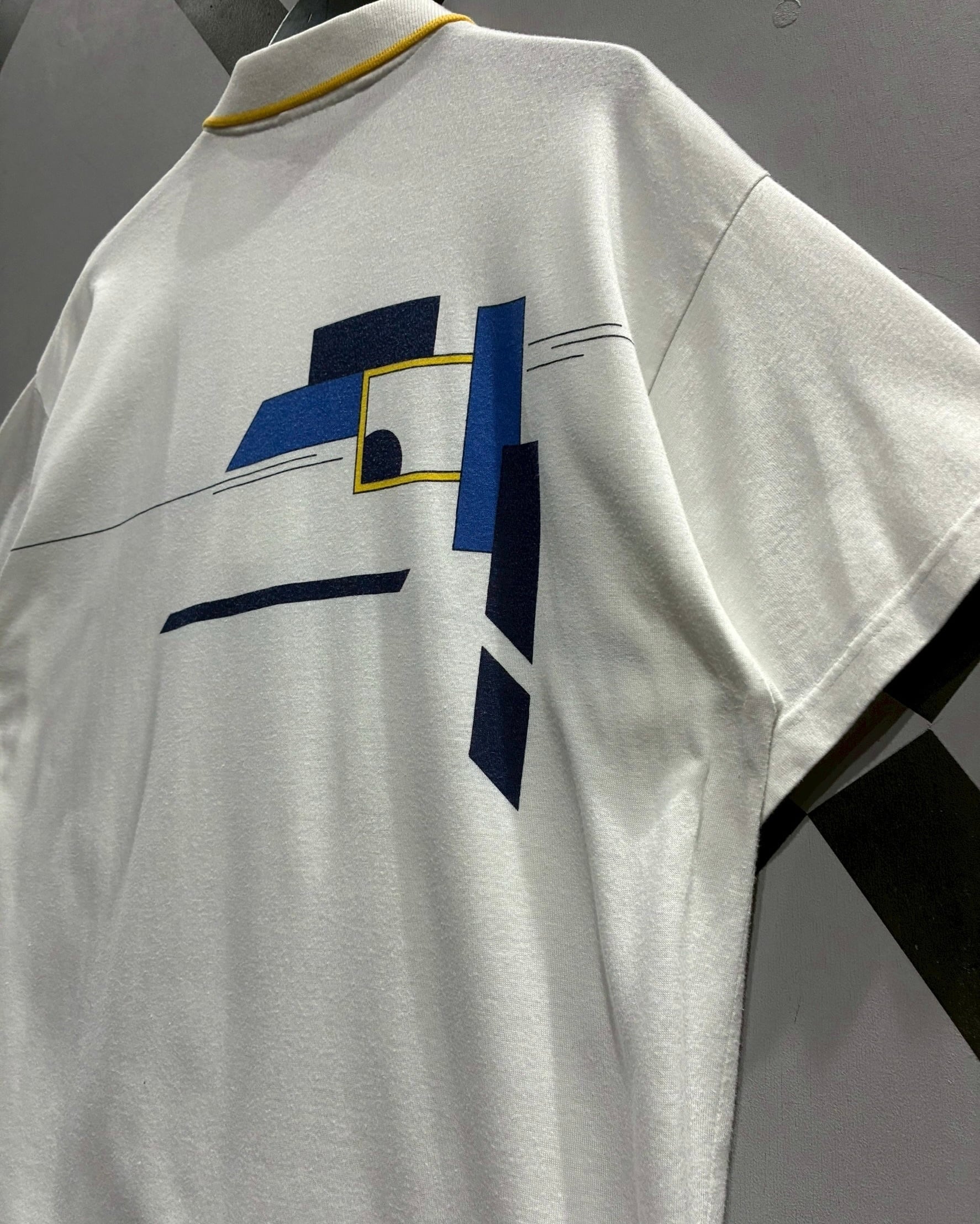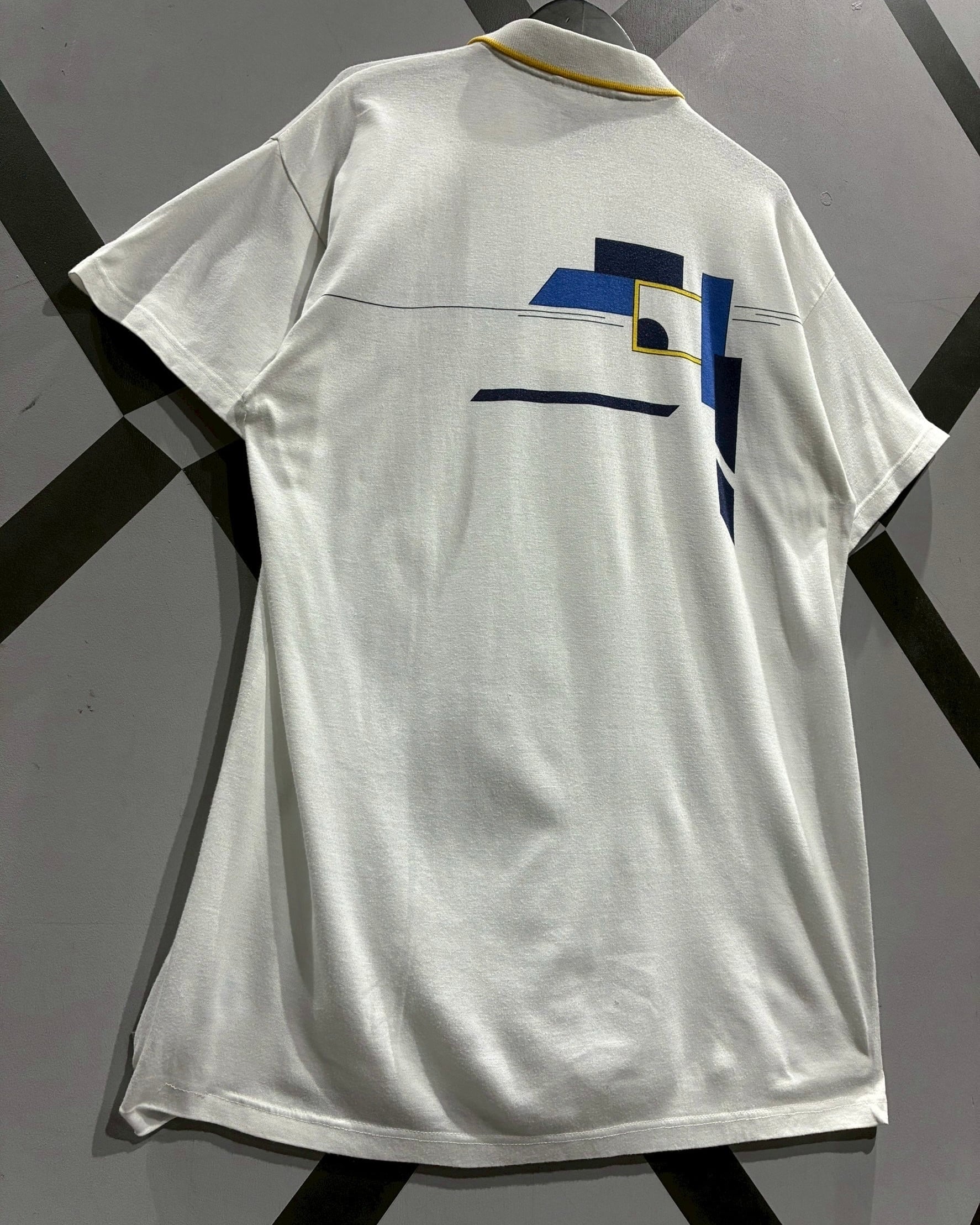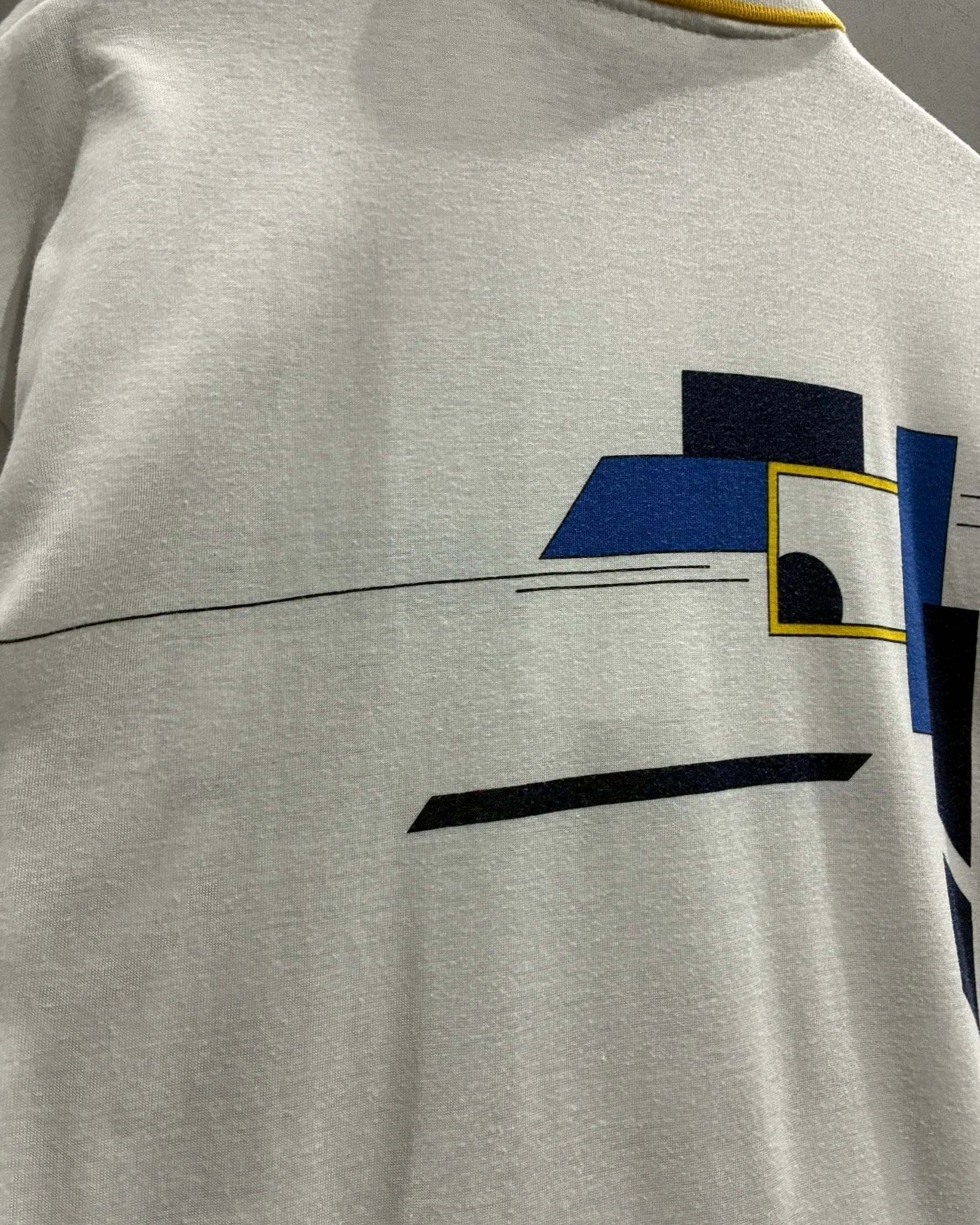 白のボディをベースに前背面に幾何学的な図柄を載せた80年代の1枚。