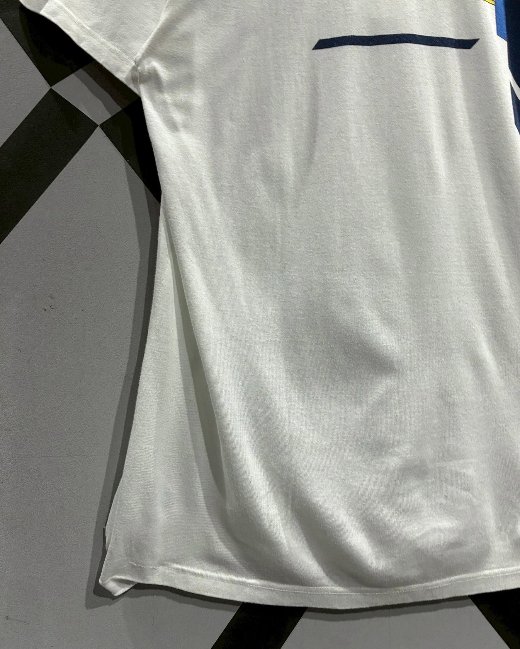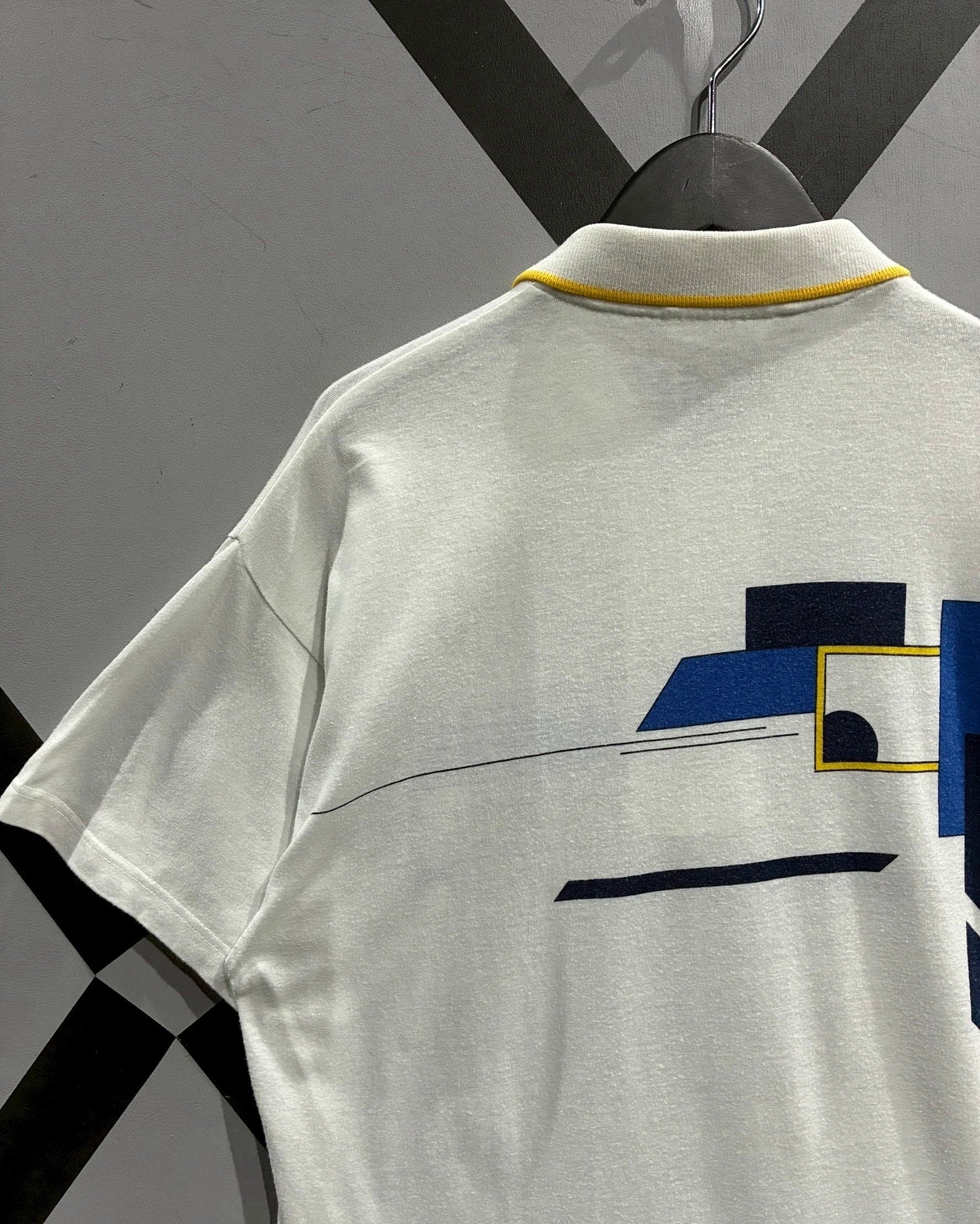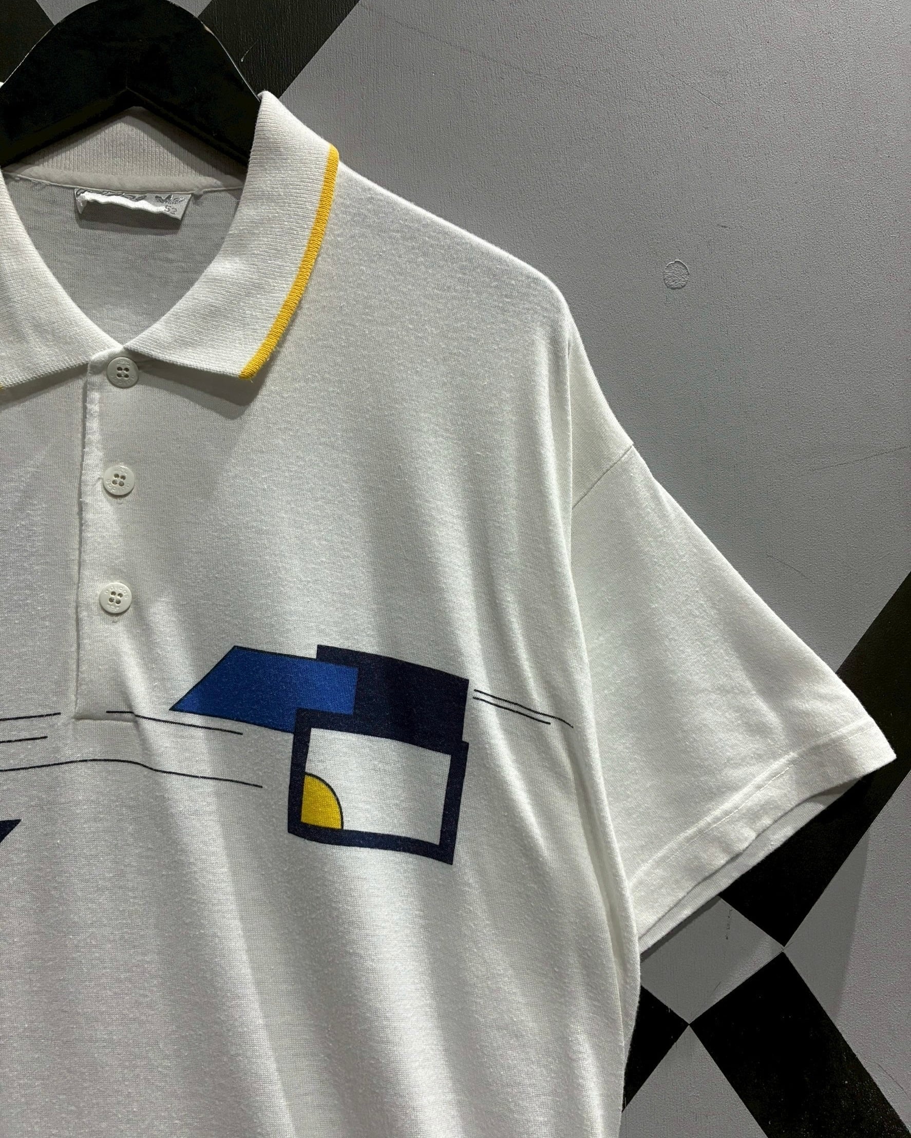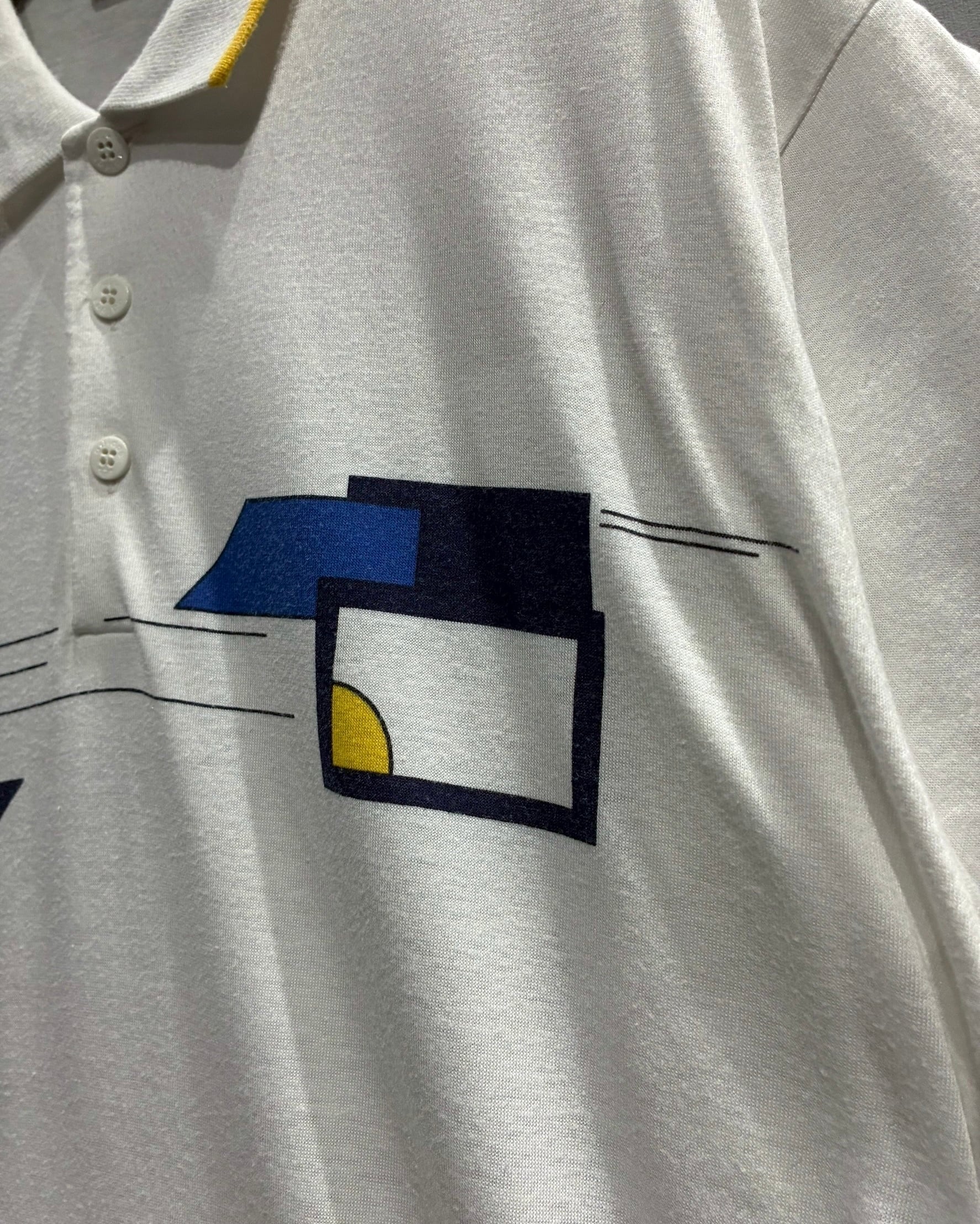 白のボディをベースに前背面に幾何学的な図柄を載せた80年代の1枚。