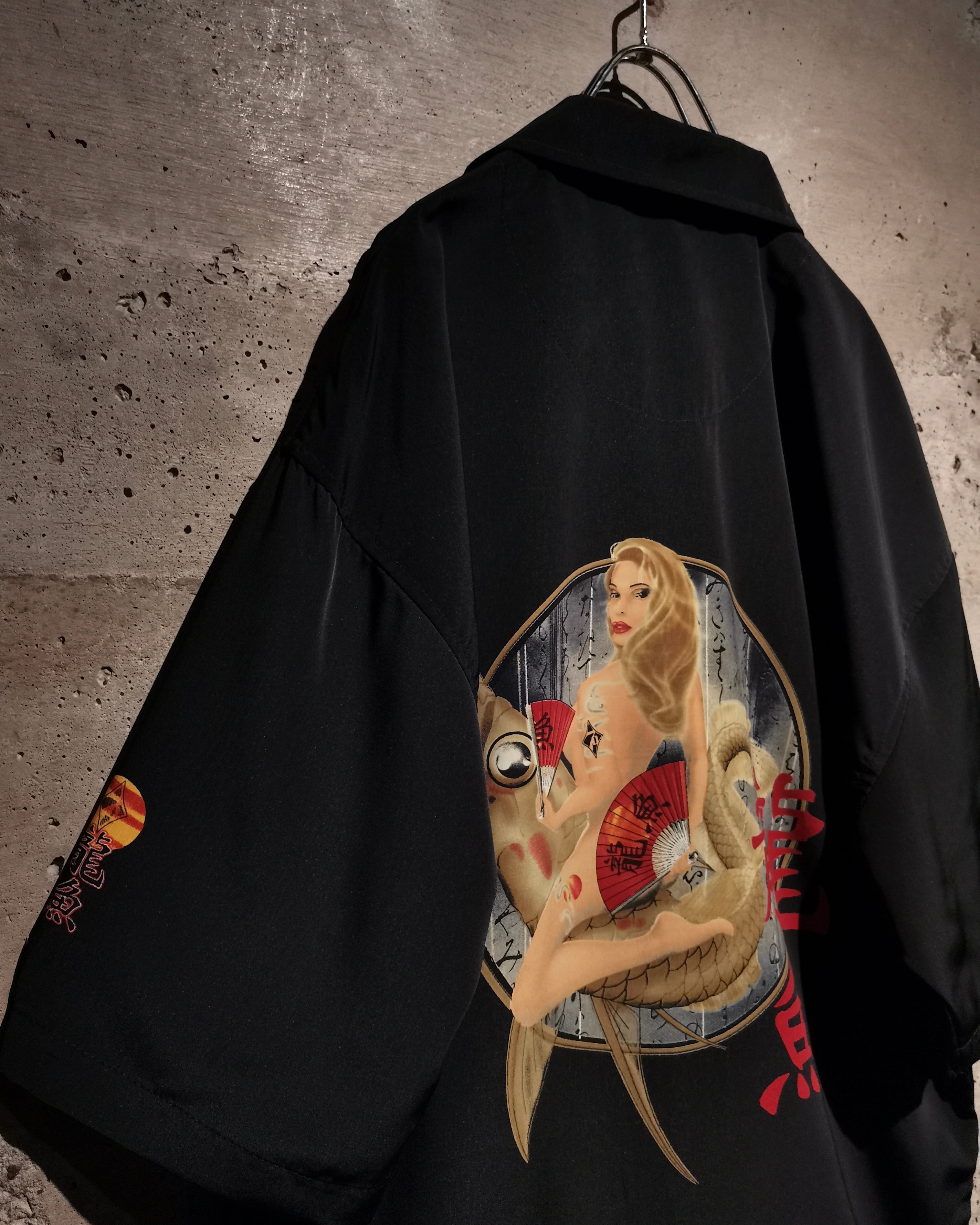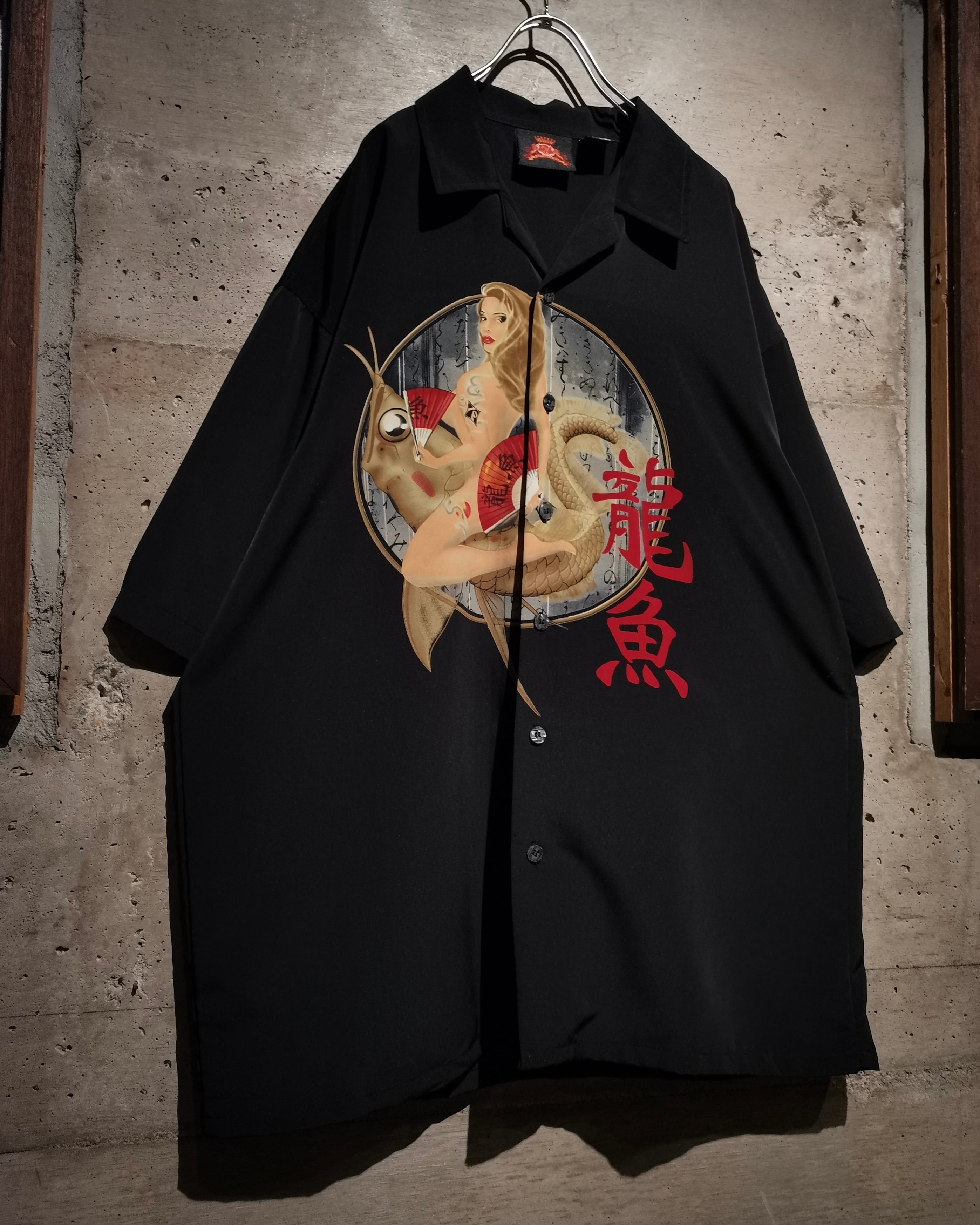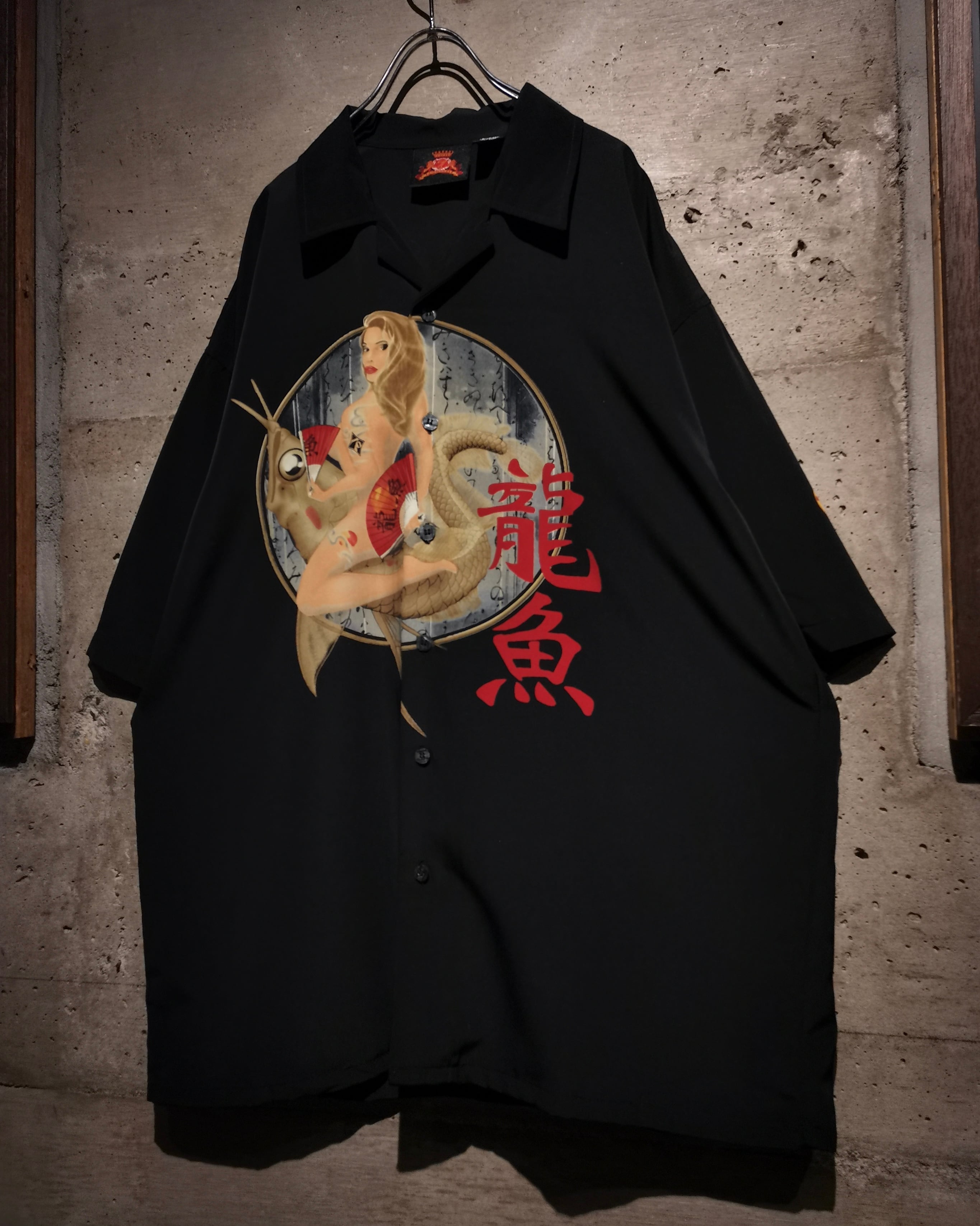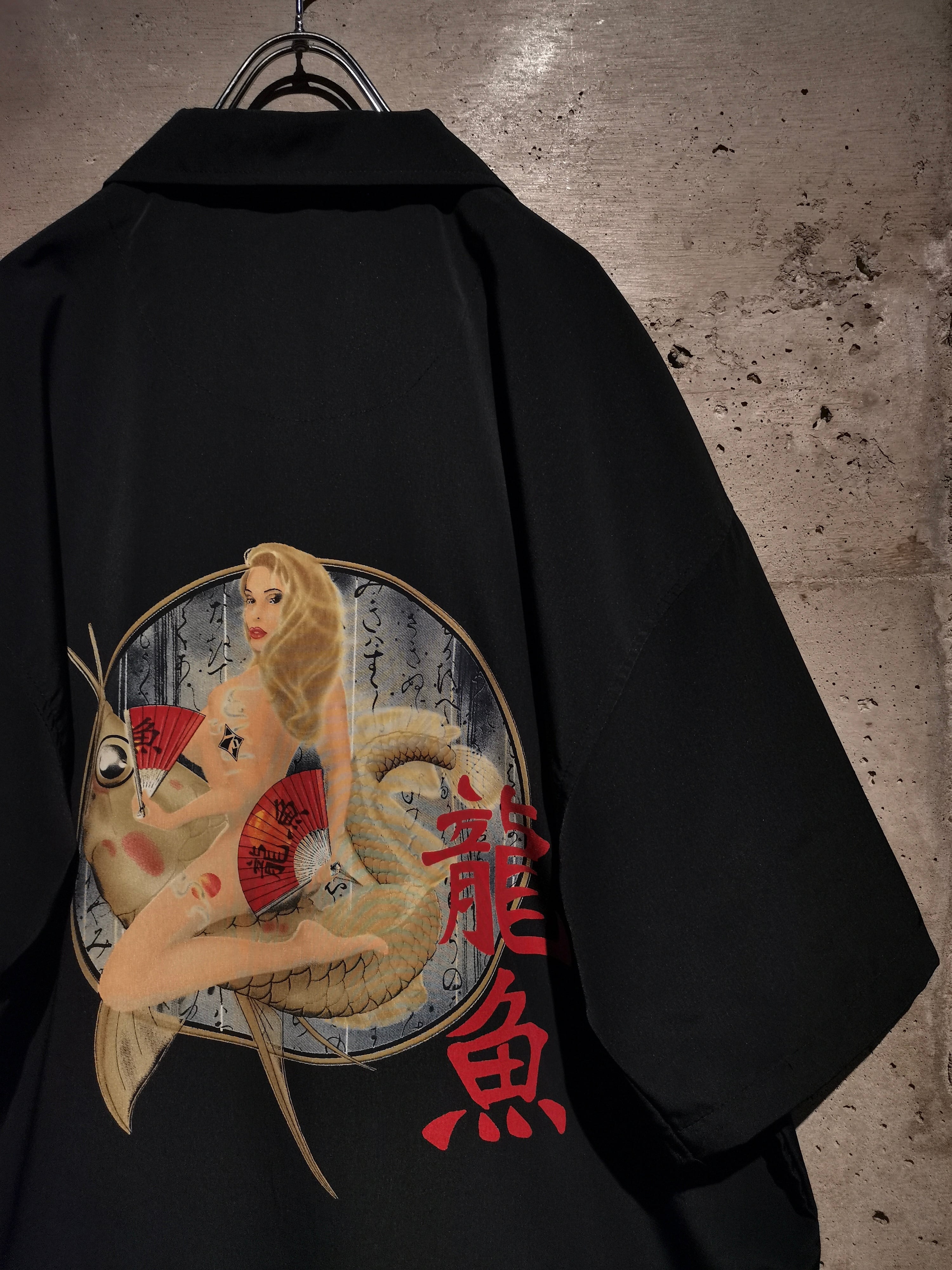 ブラックのボディをベースに、龍魚に跨るセクシーなブロンドヘアの女性描いたデザインを載せた半袖オープンカラーシャツ。