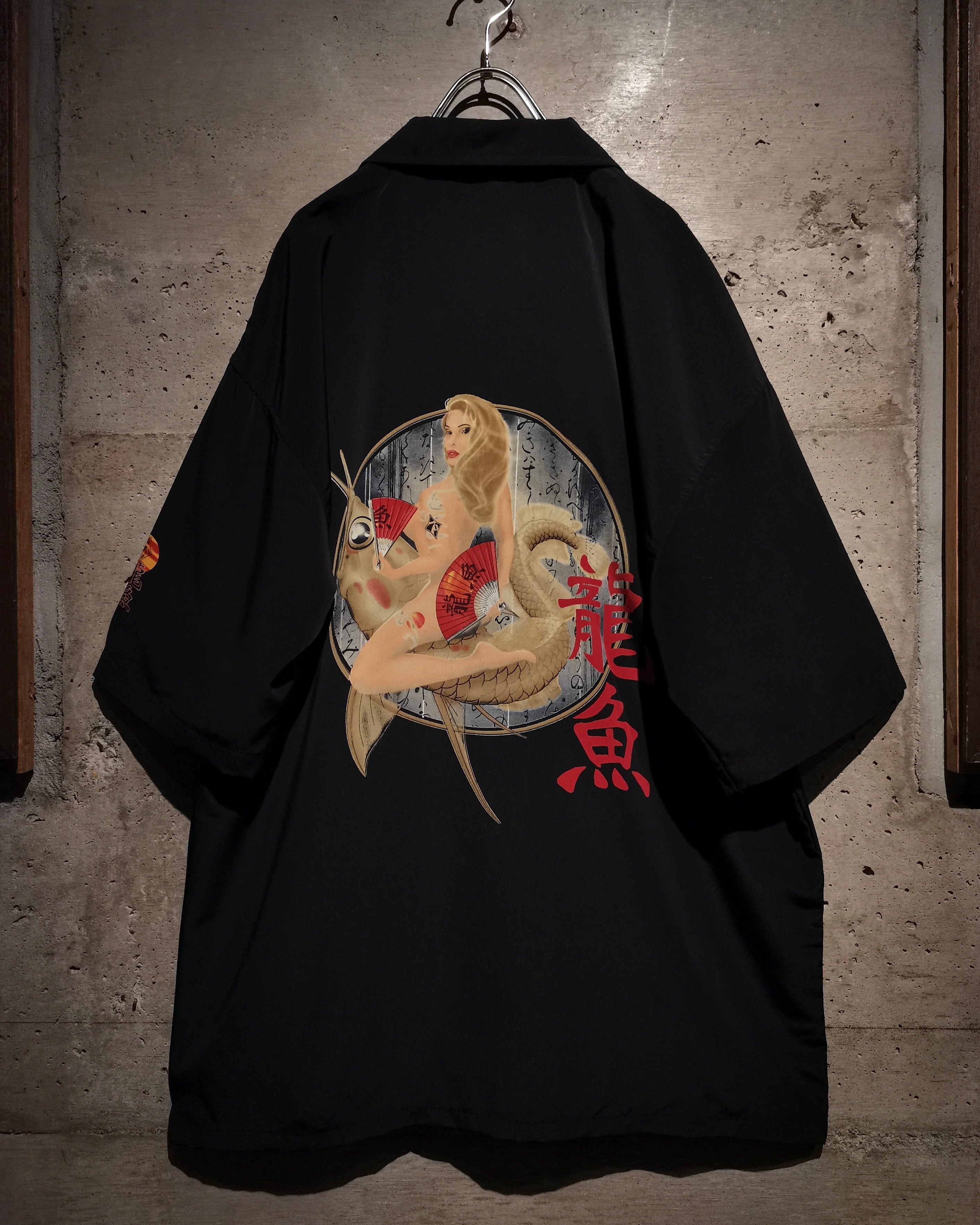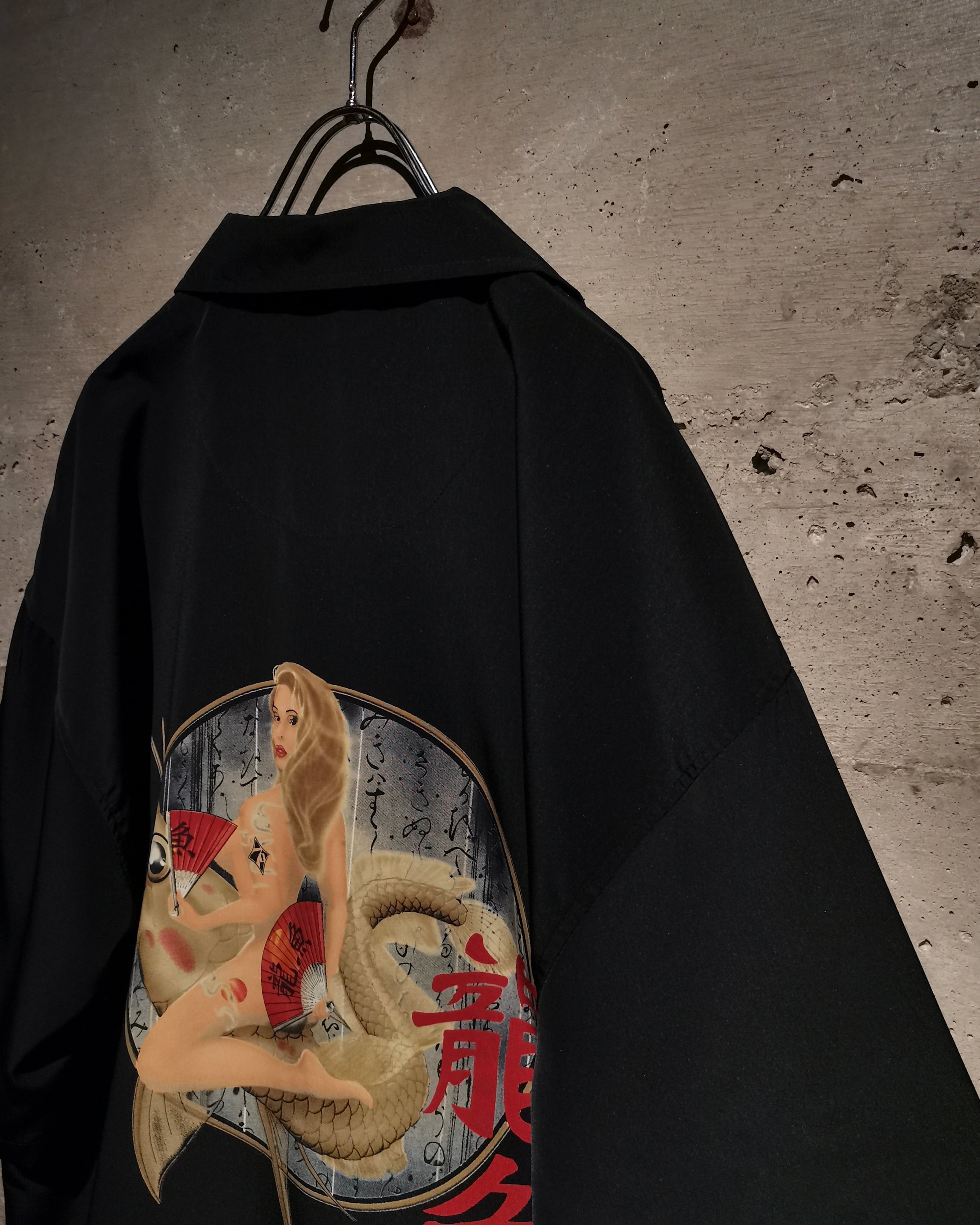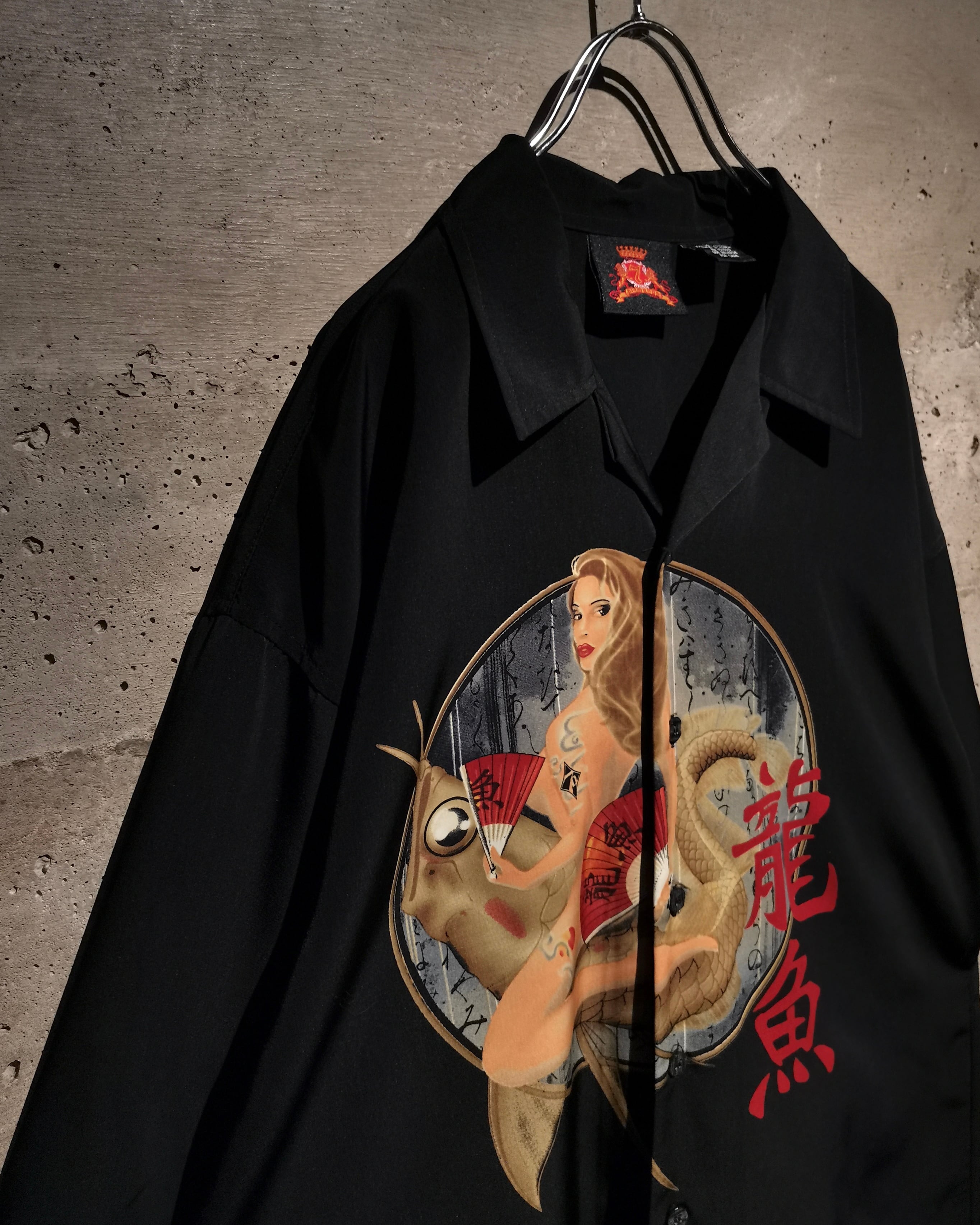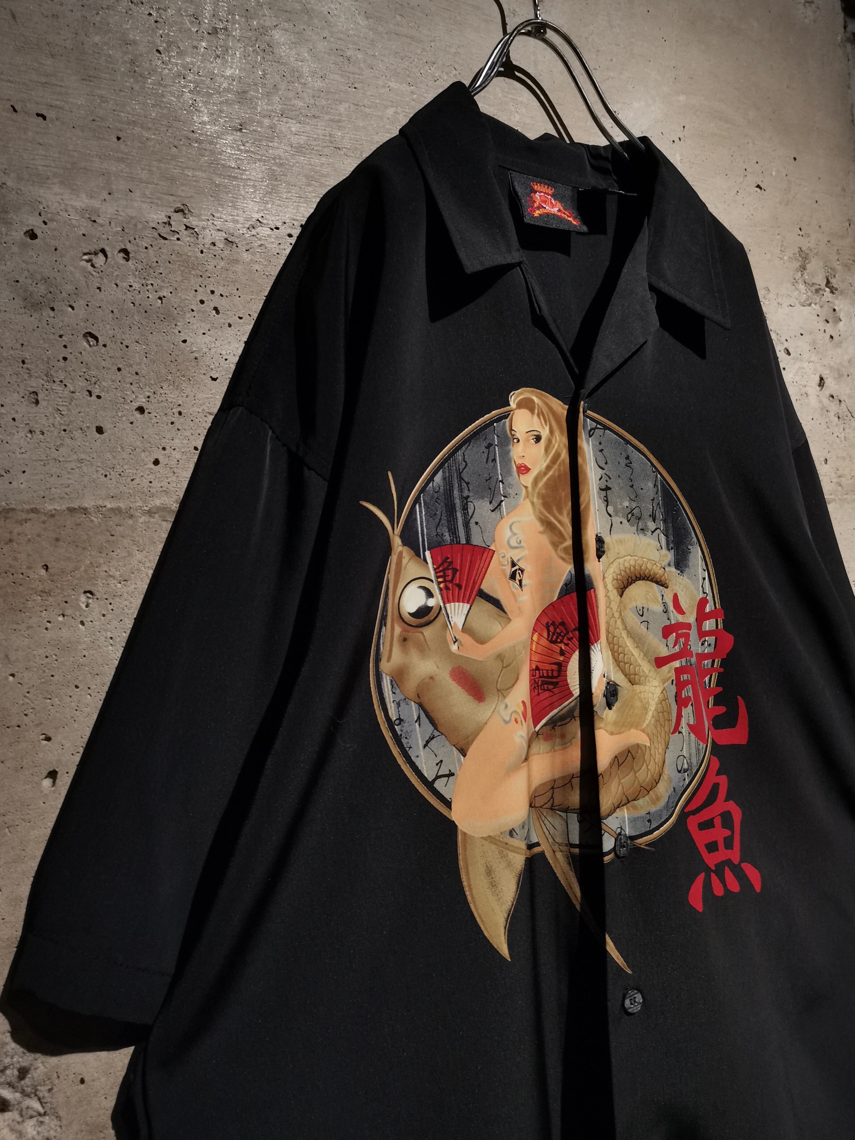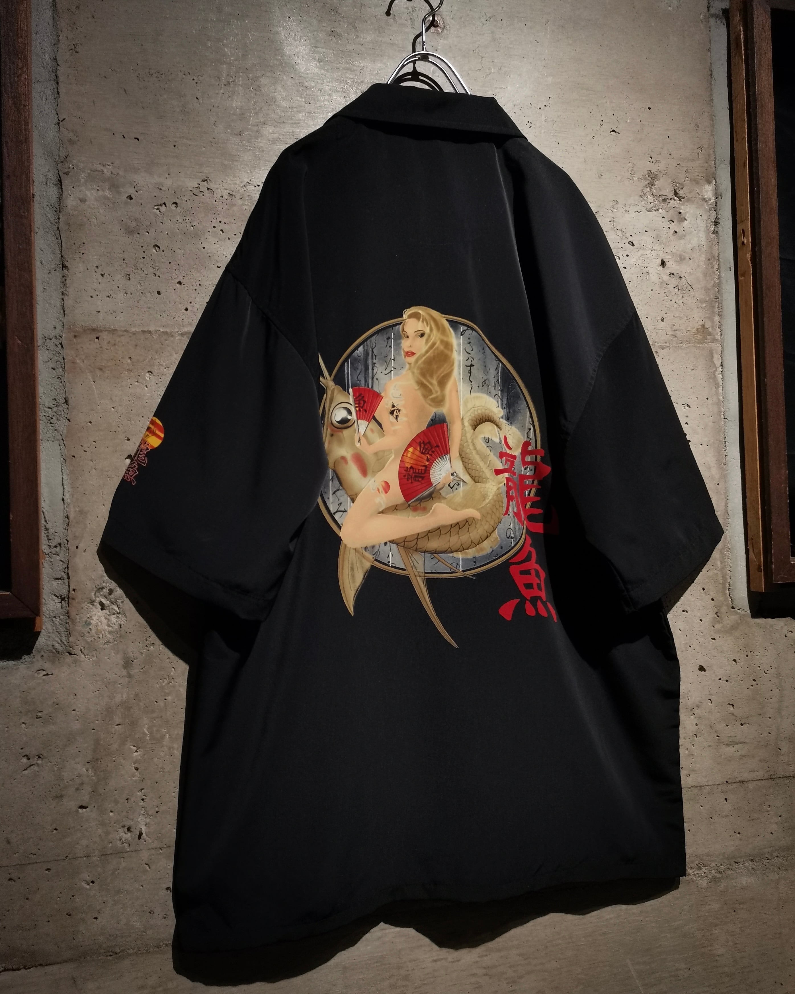 ブラックのボディをベースに、龍魚に跨るセクシーなブロンドヘアの女性描いたデザインを載せた半袖オープンカラーシャツ。
