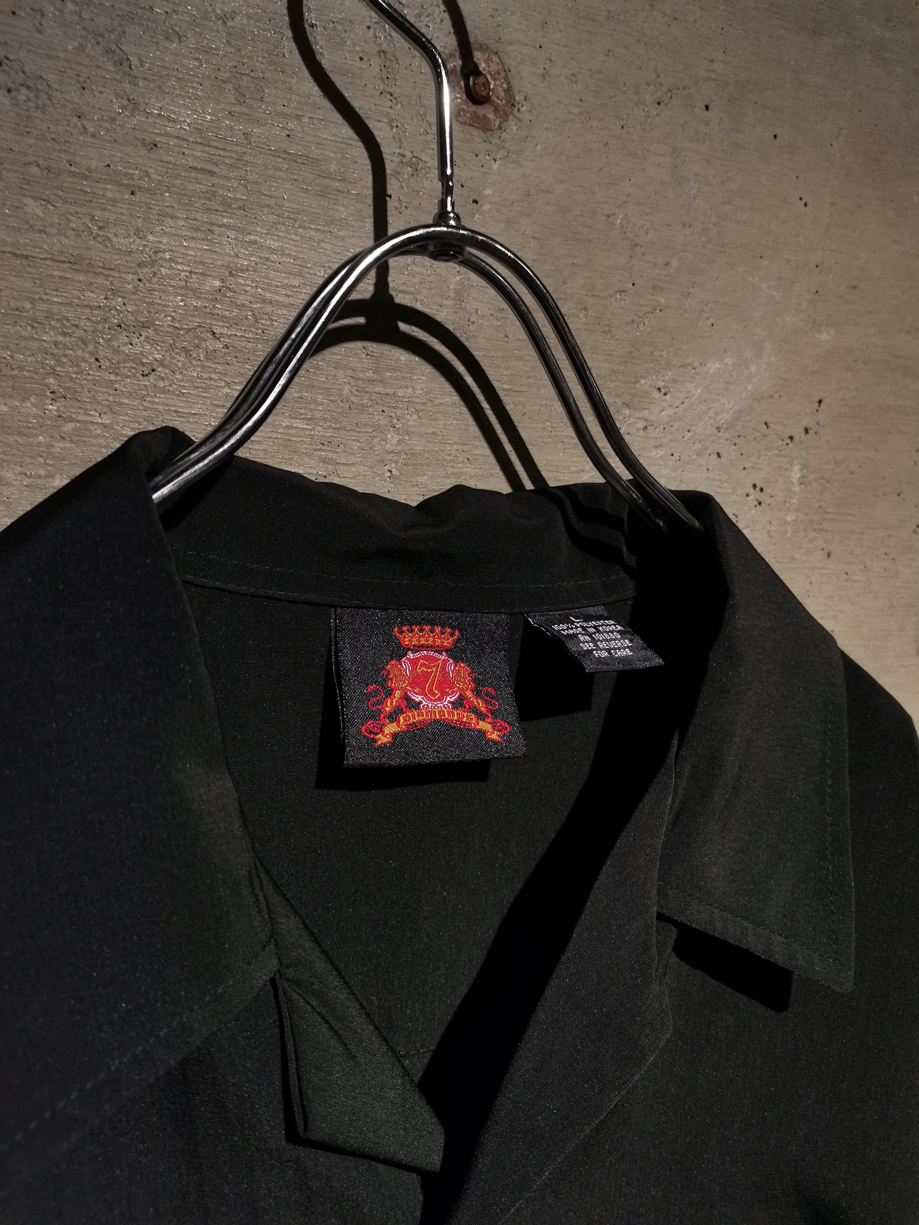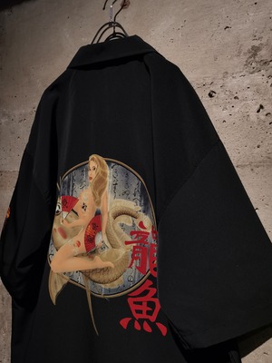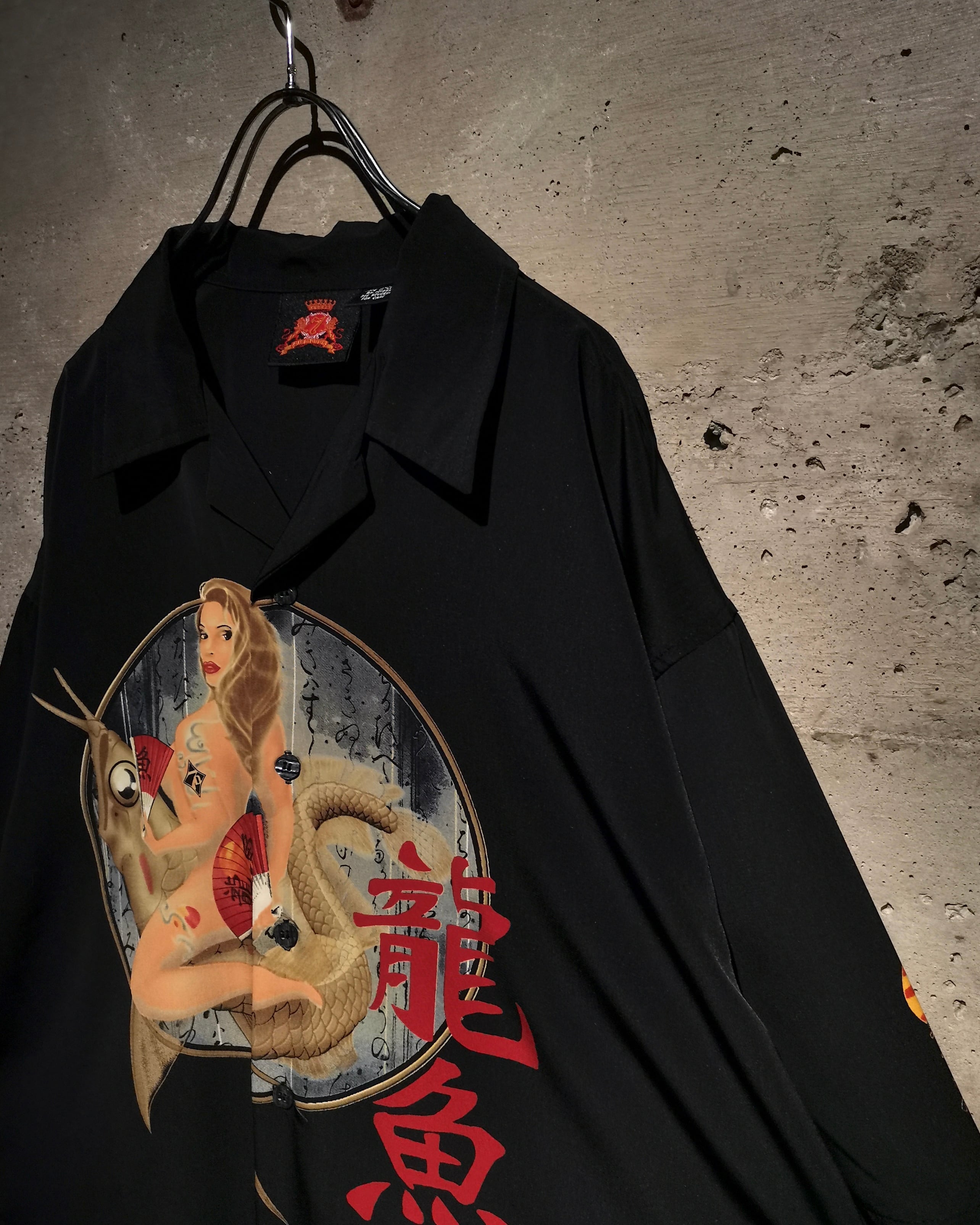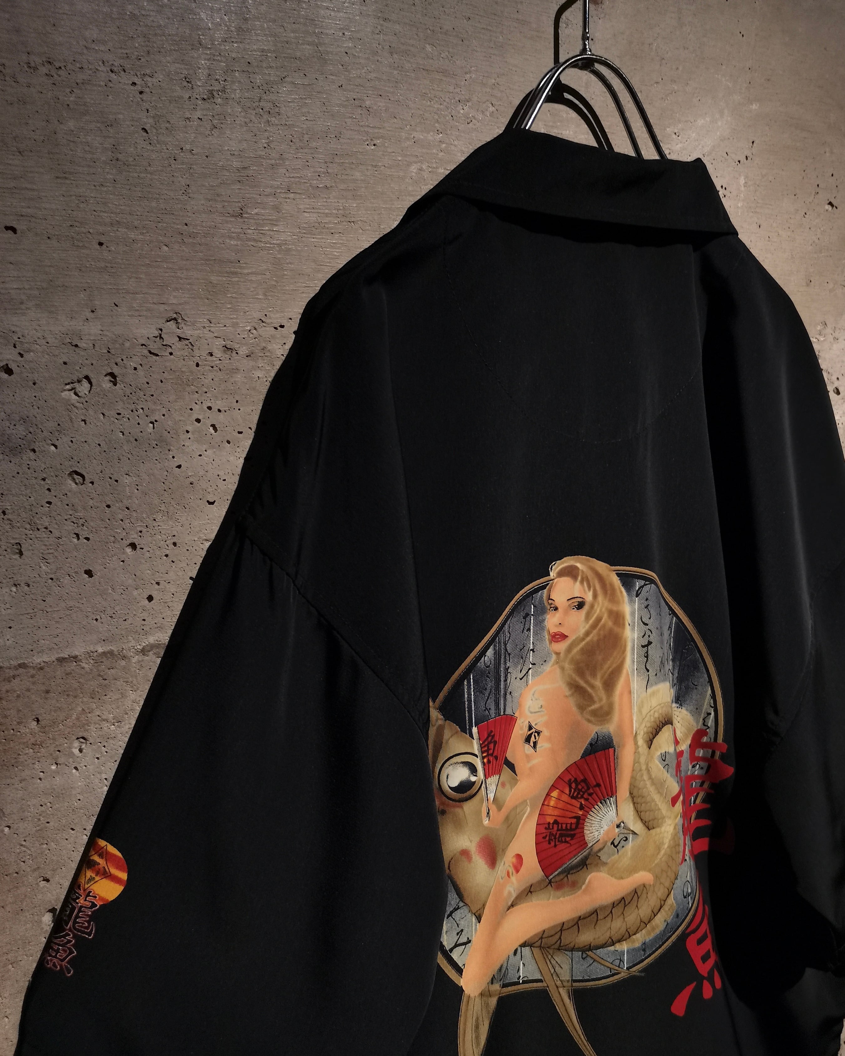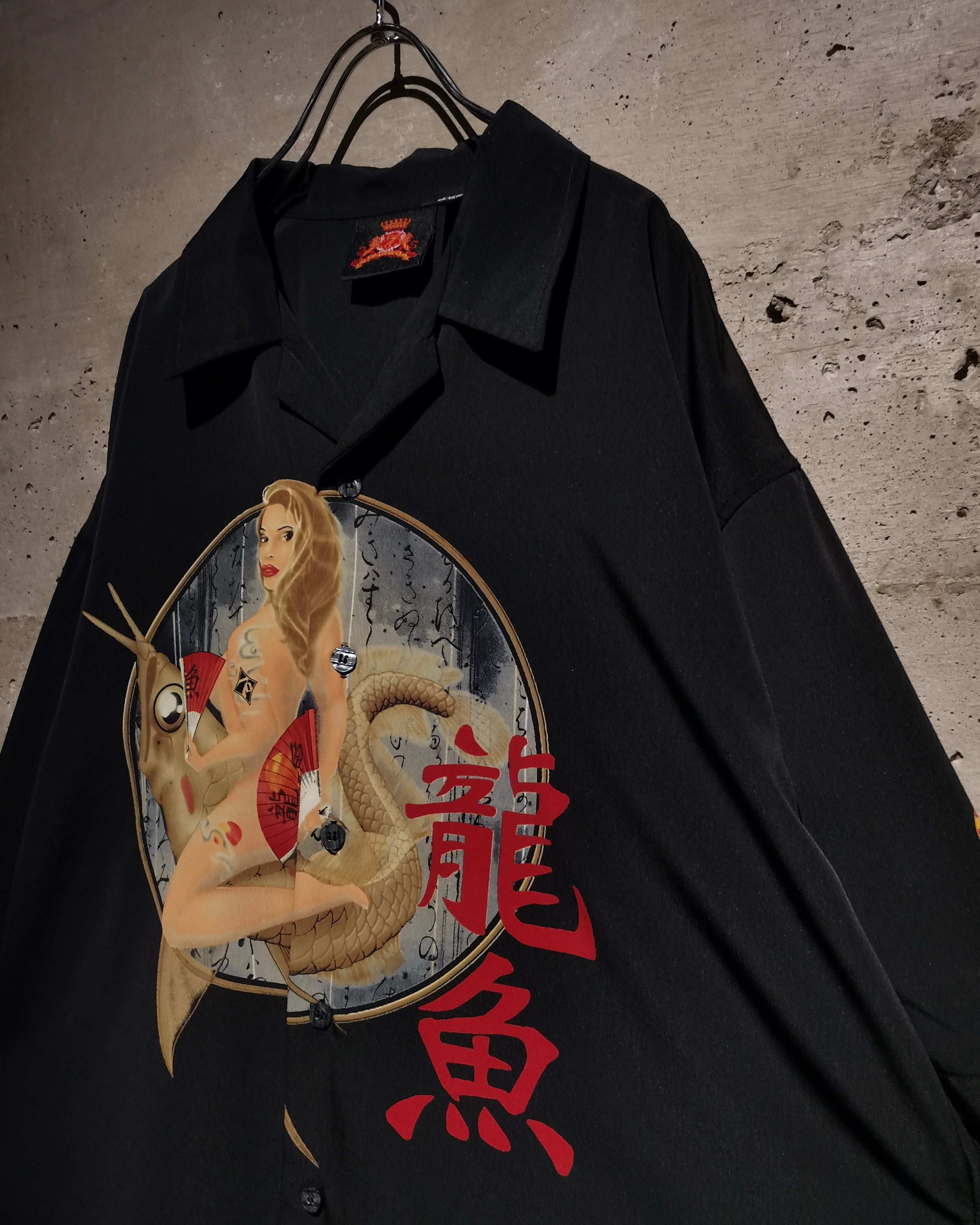 ブラックのボディをベースに、龍魚に跨るセクシーなブロンドヘアの女性描いたデザインを載せた半袖オープンカラーシャツ。