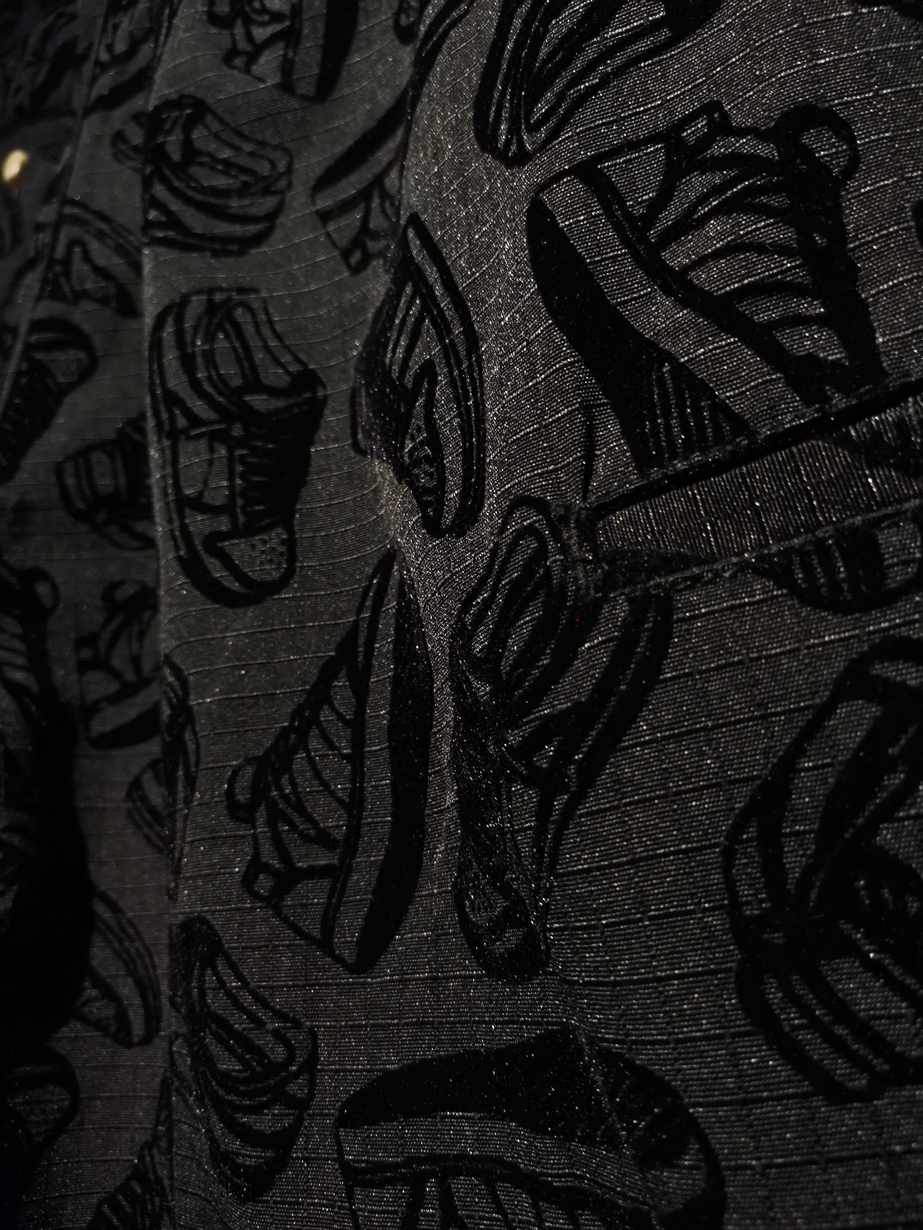 オールブラックのカラーリングですが、ボディの生地感とフロッキープリントの立体感で良いコントラストが生まれています。金のボタンと背面のクラウンの刺繍もアクセントに。