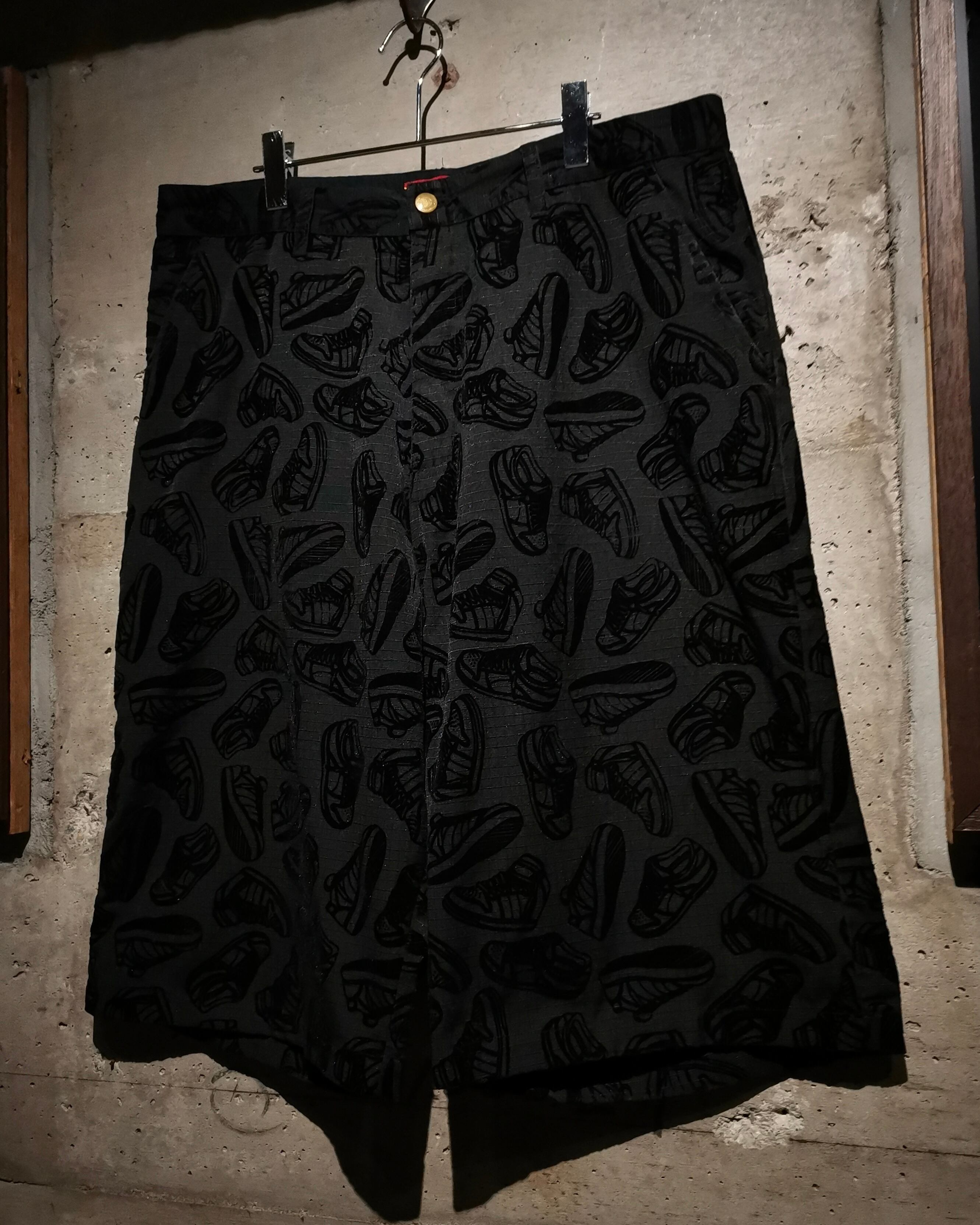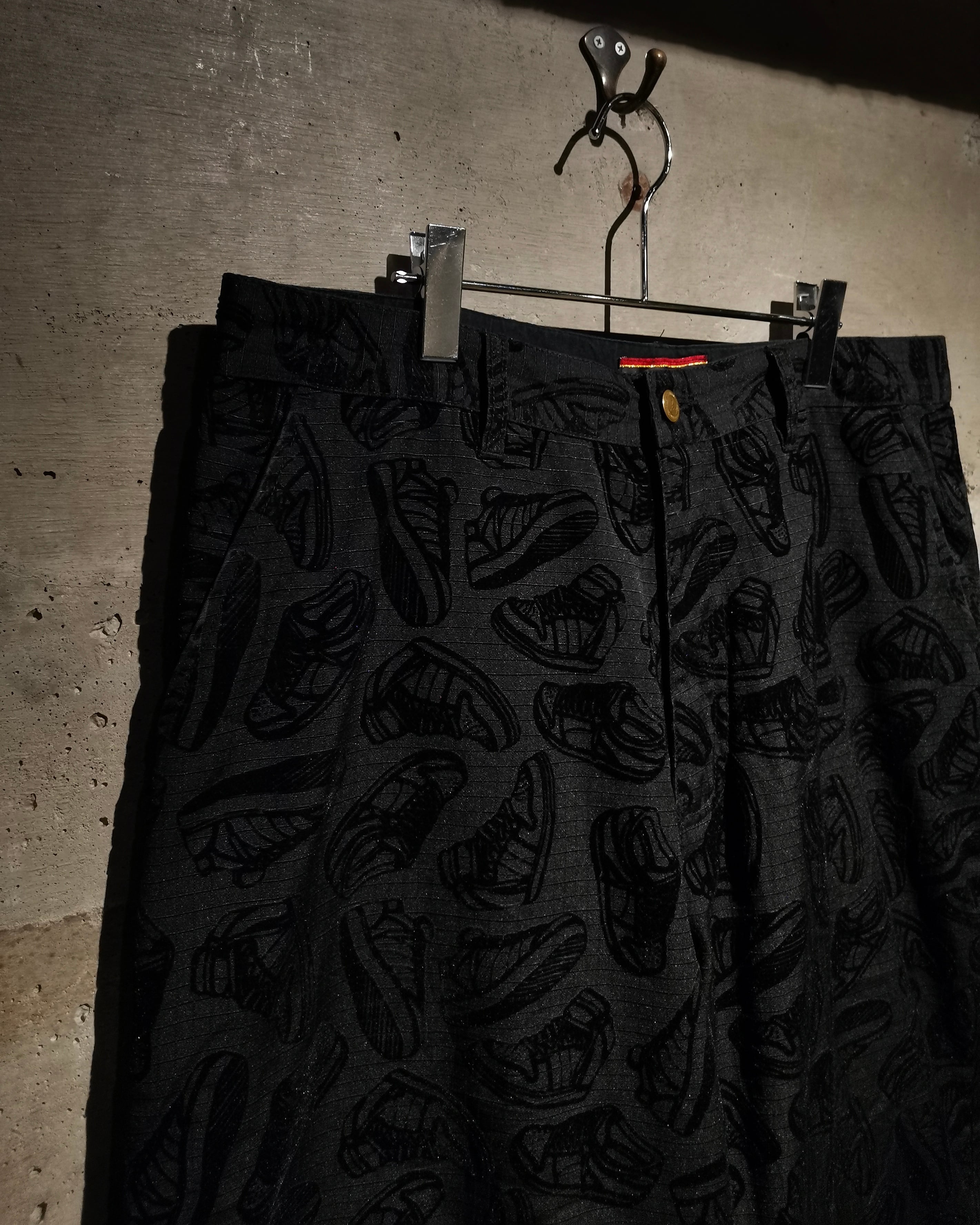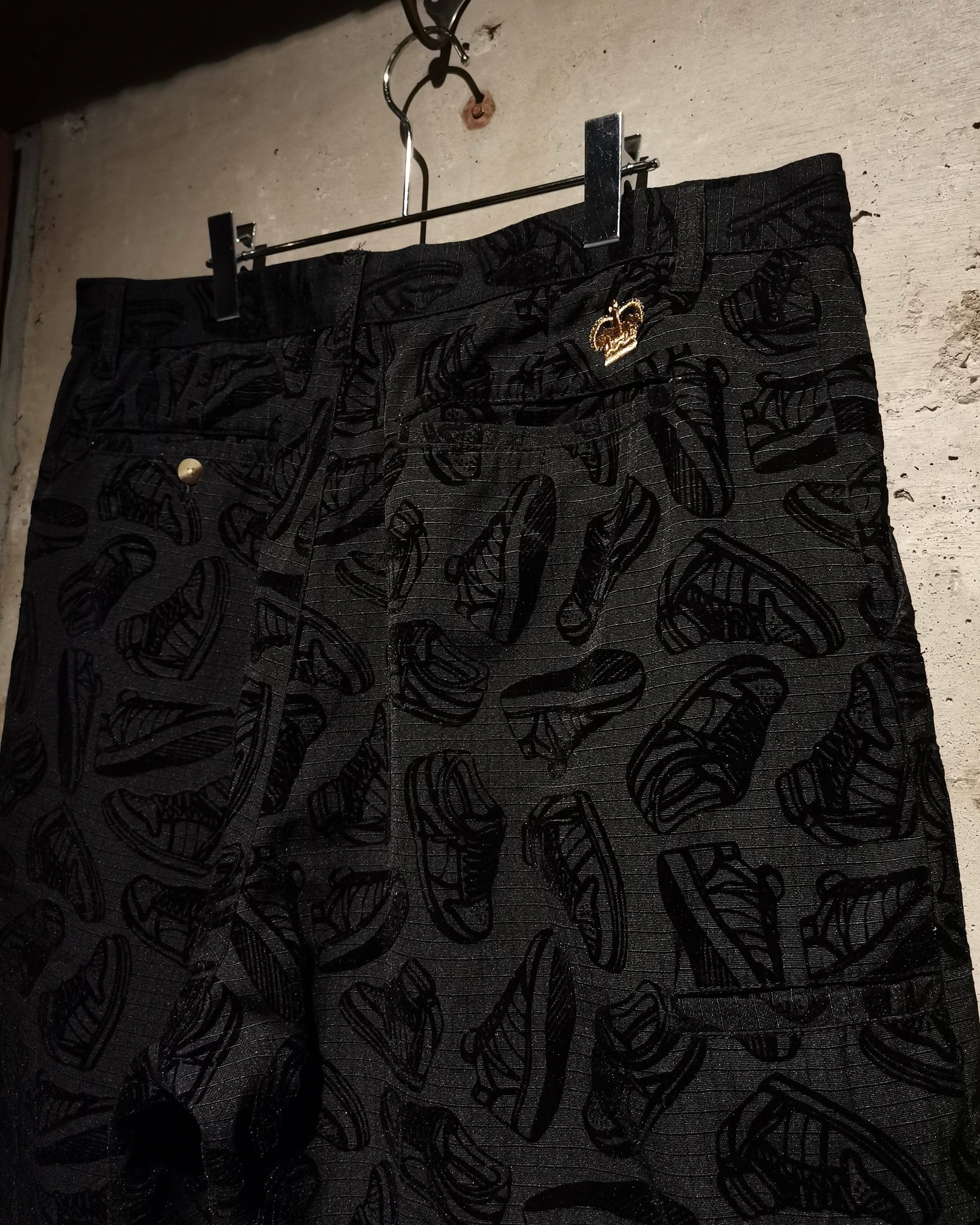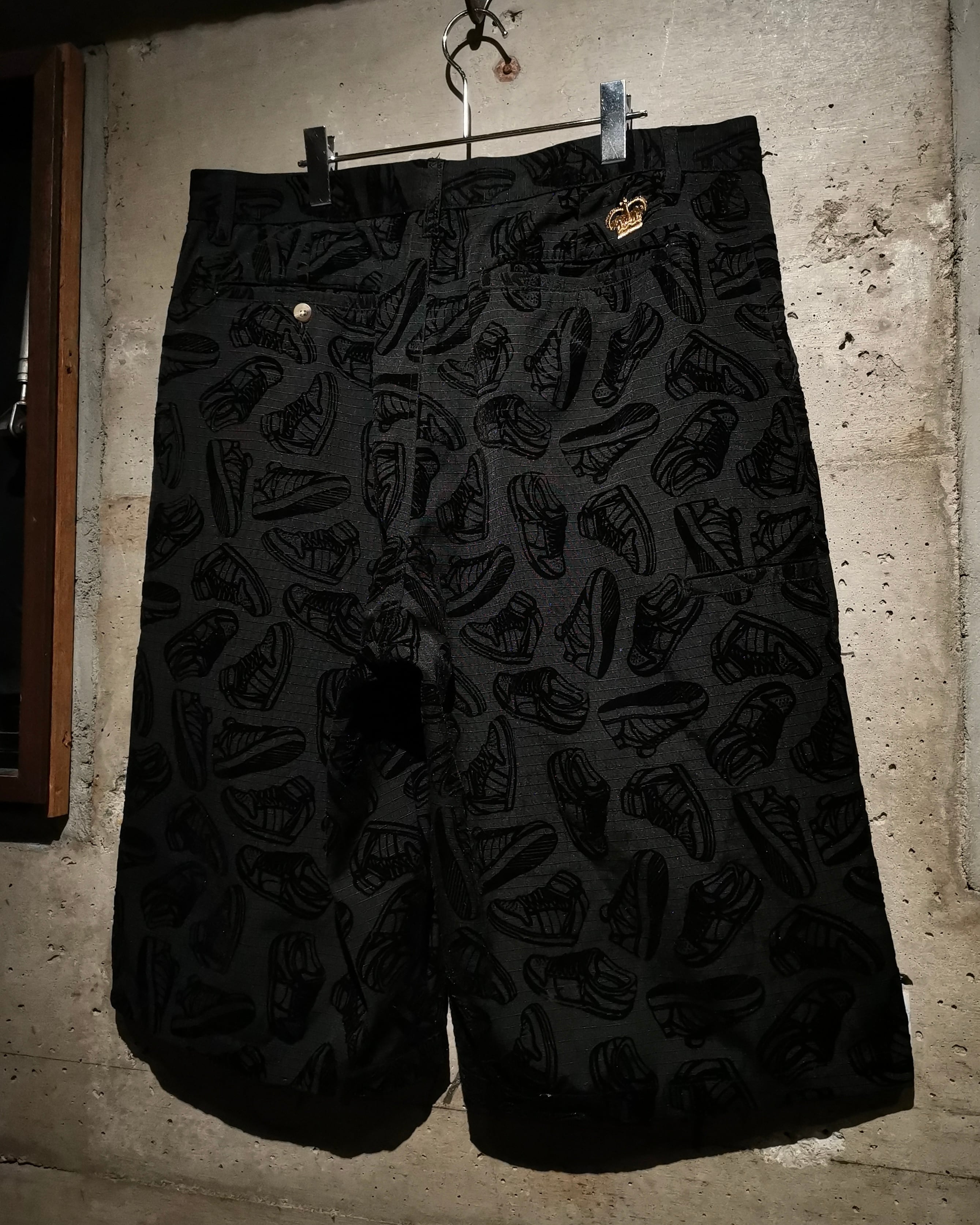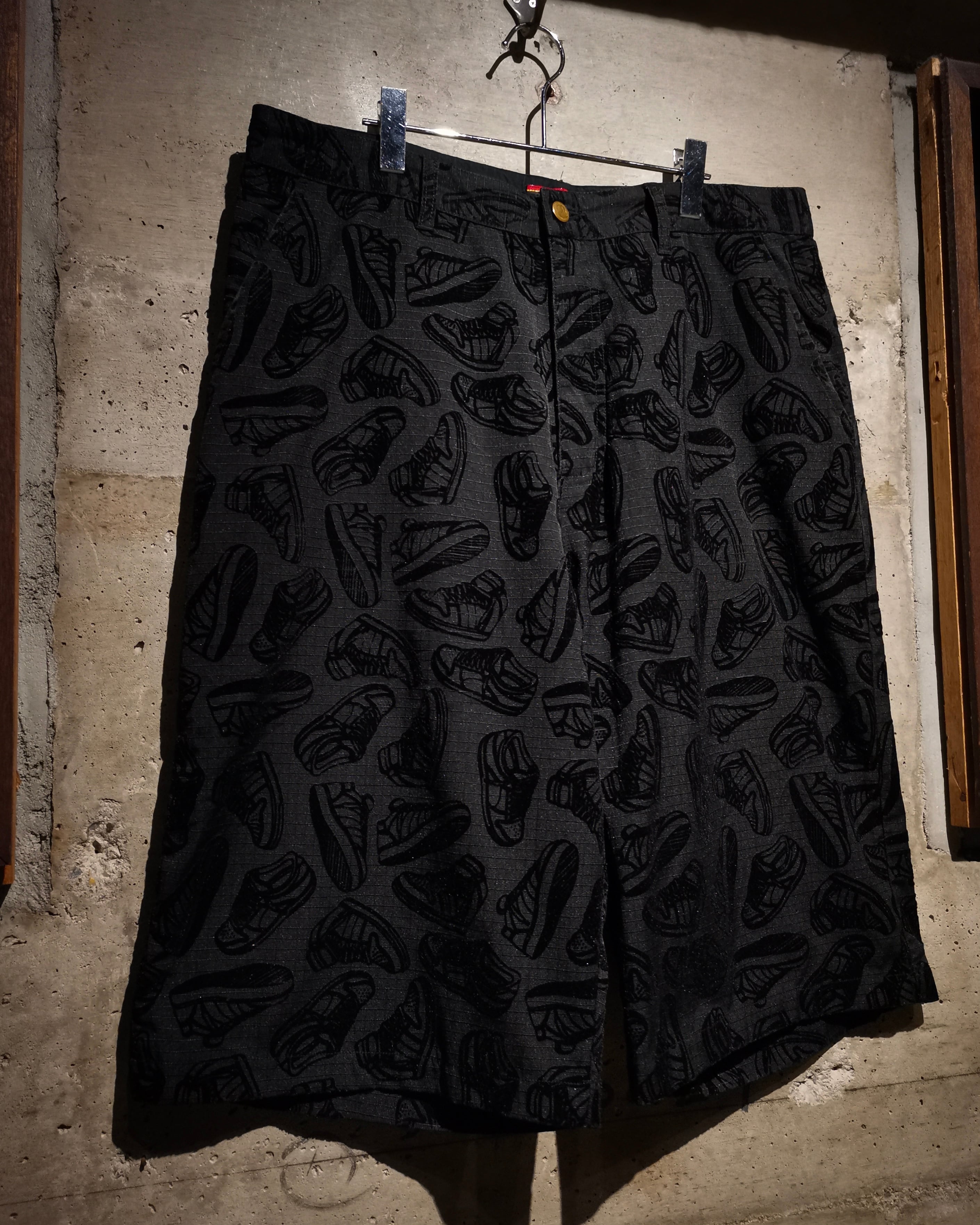 タフかつ強度の高いリップストップ生地のボディに、フロッキープリントでスニーカーを全面に載せたバギーショーツ。